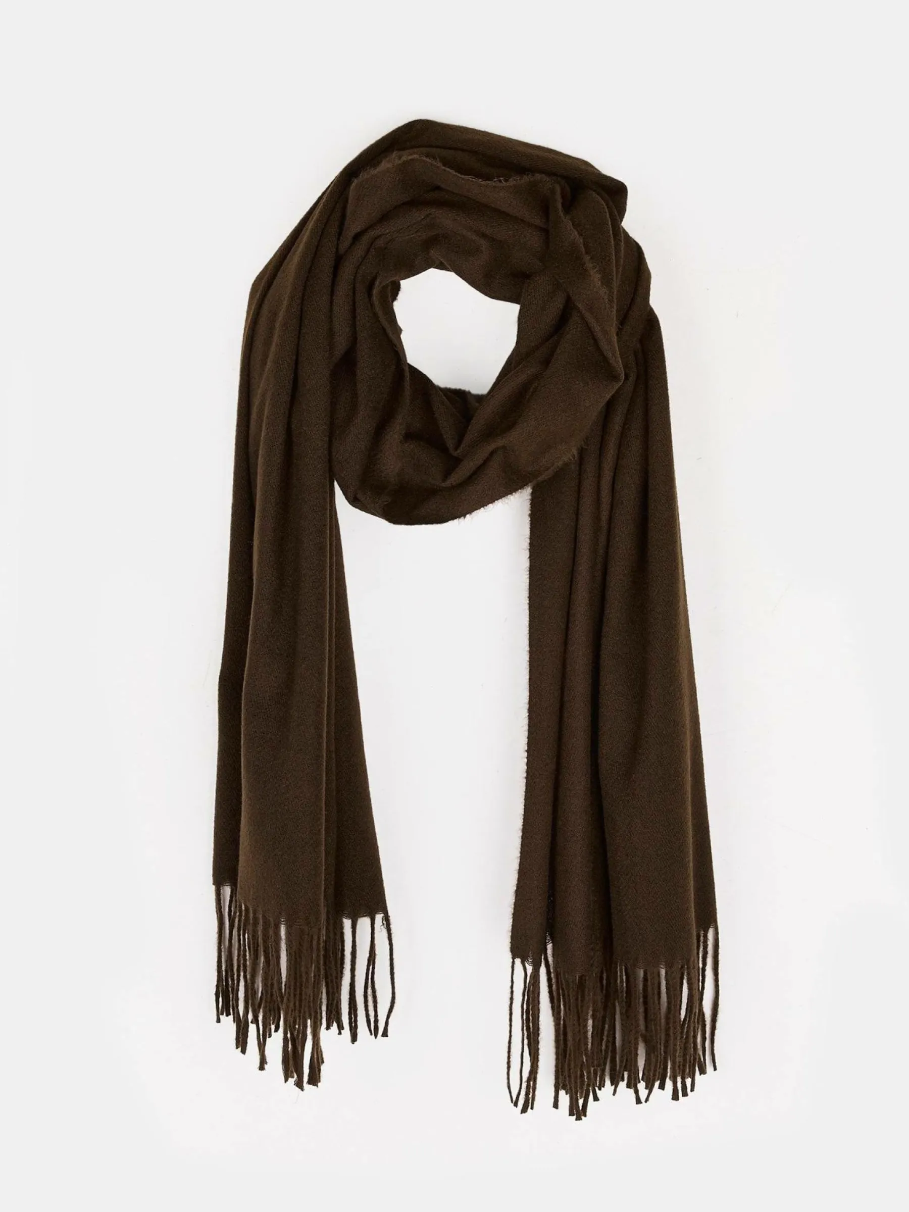 Kolor: brązowyKrój: podstawowyTyp: szalPattern style: pojedynczy kolorDetal: z frędzlamiMateriał: syntetycznePłeć:…