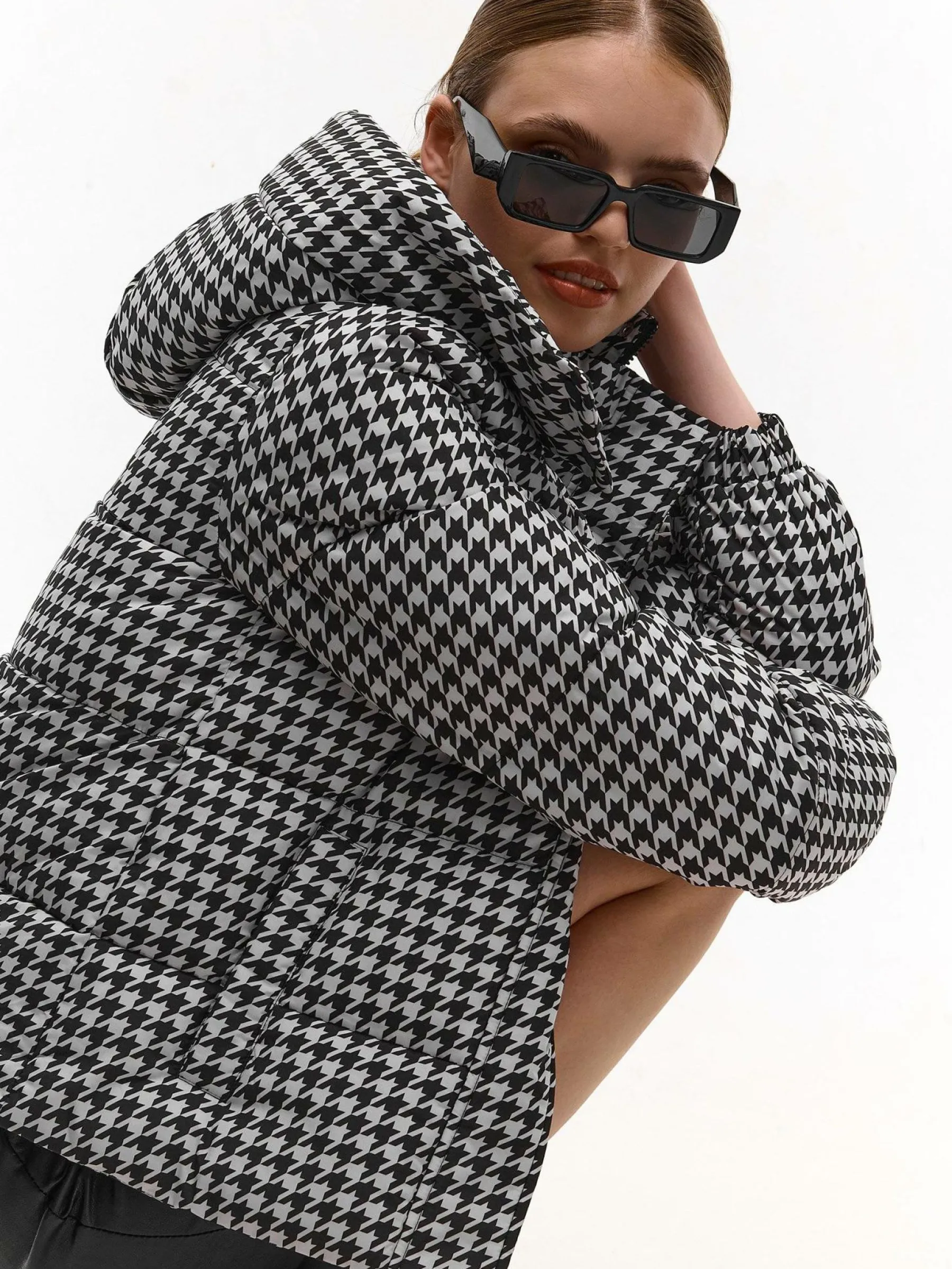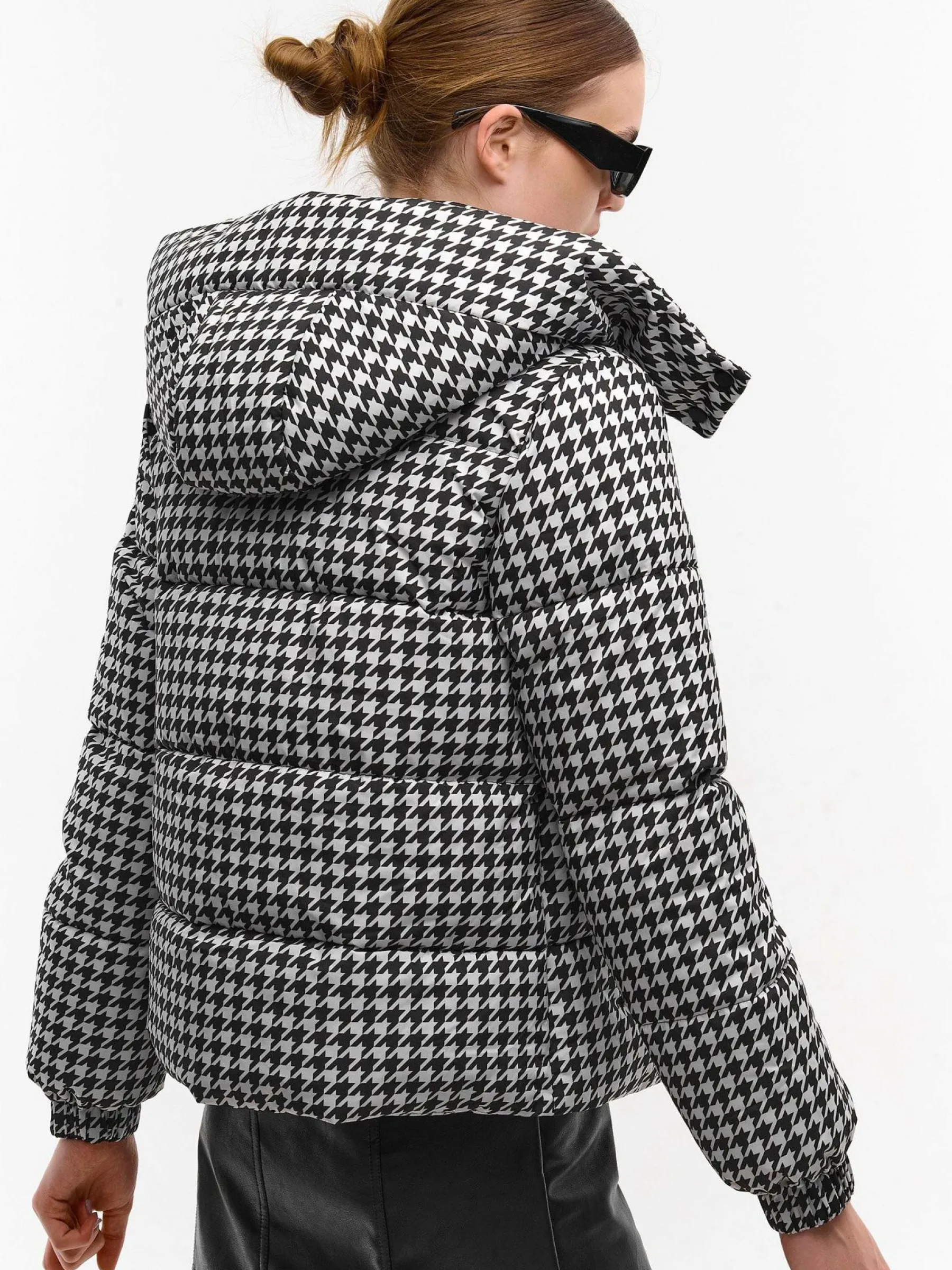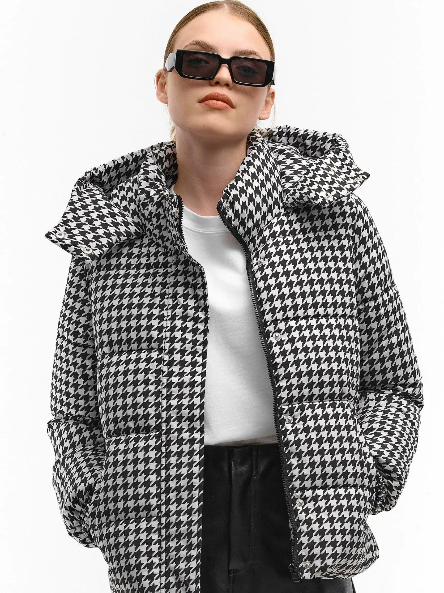 Kolor: czarnyKrój: pikowaneTyp: kurtka zimowaRekaw: długi rękawDługość: krótkiPattern style: z wzorem pepita, z n…