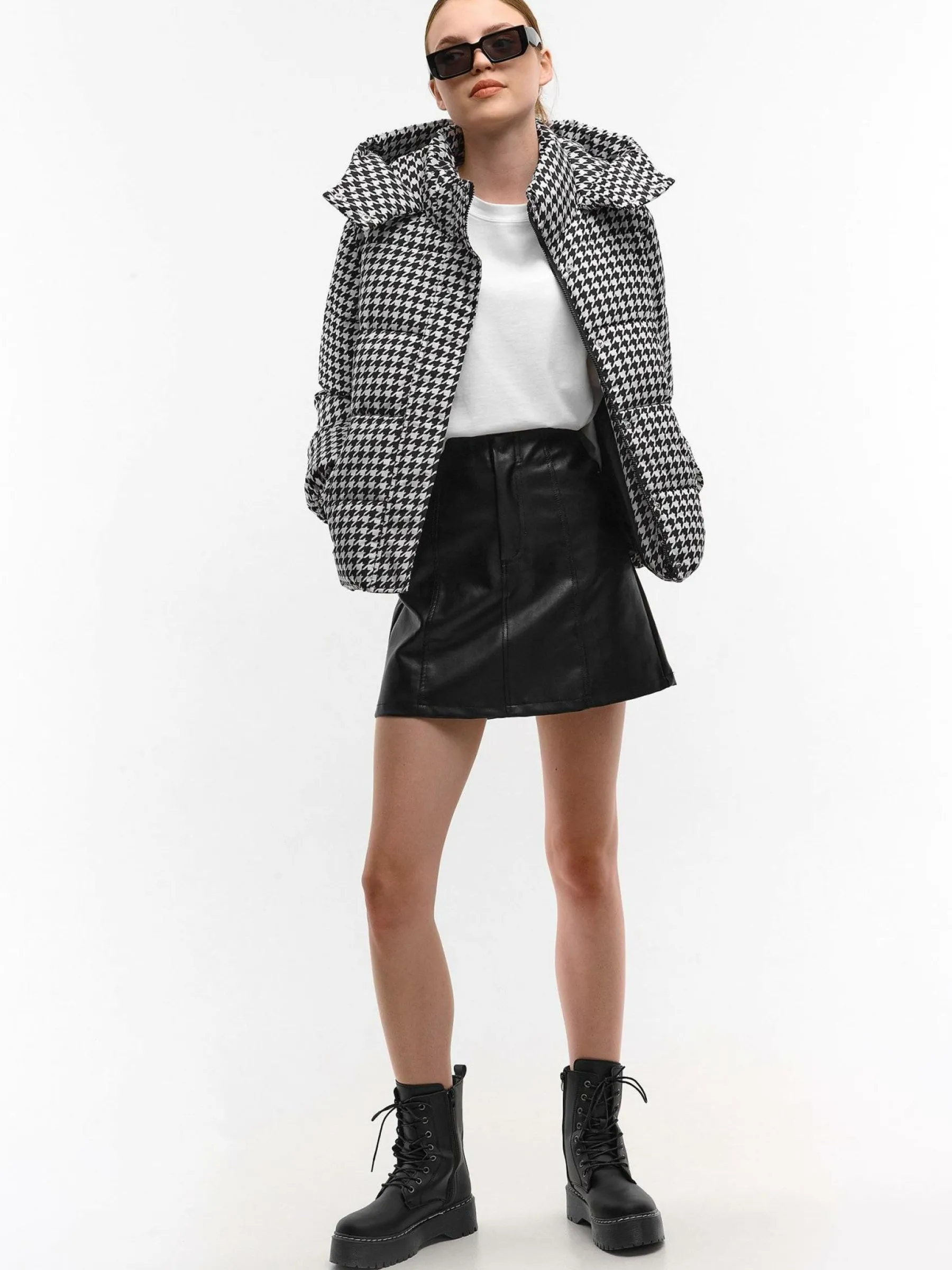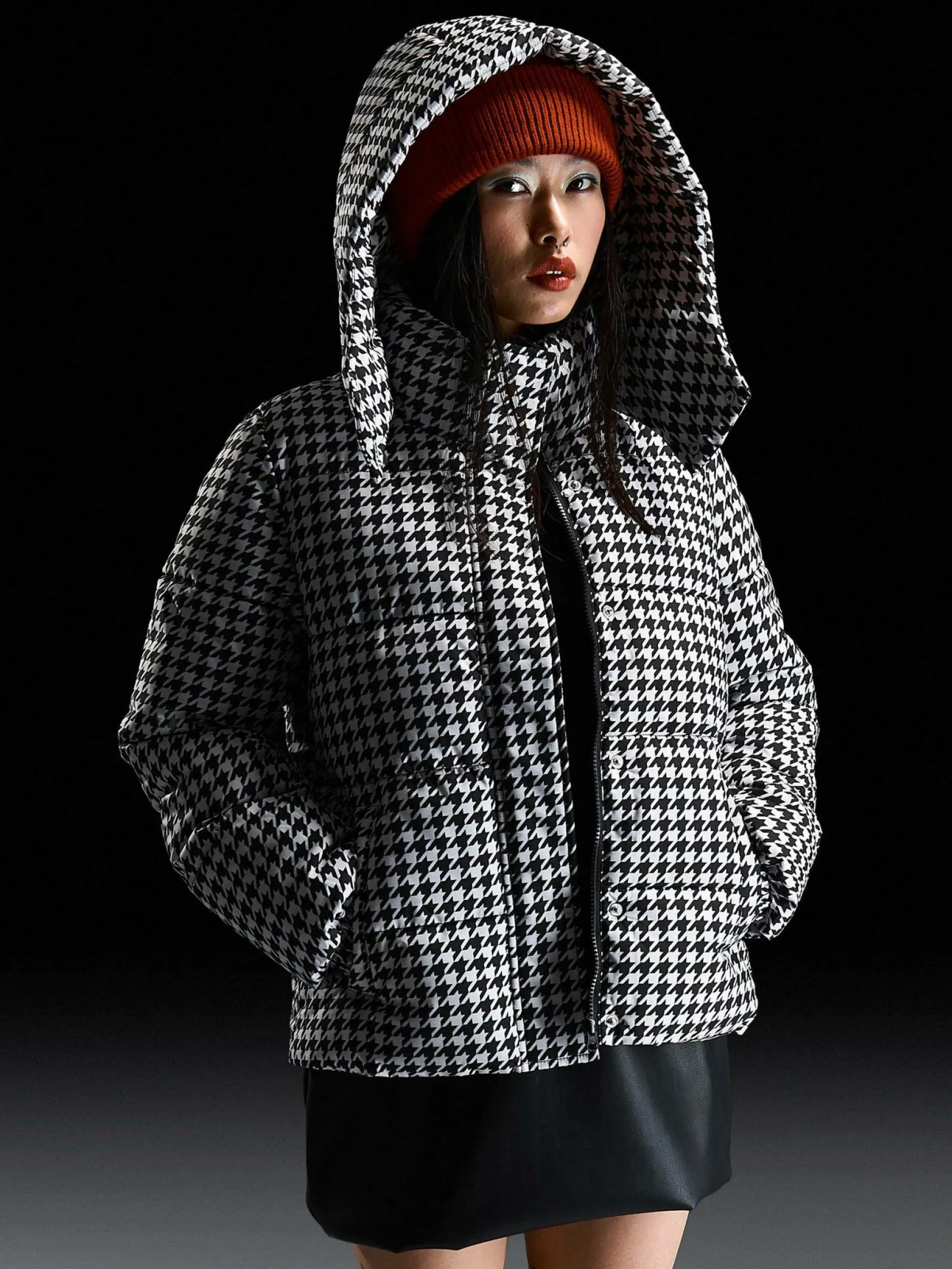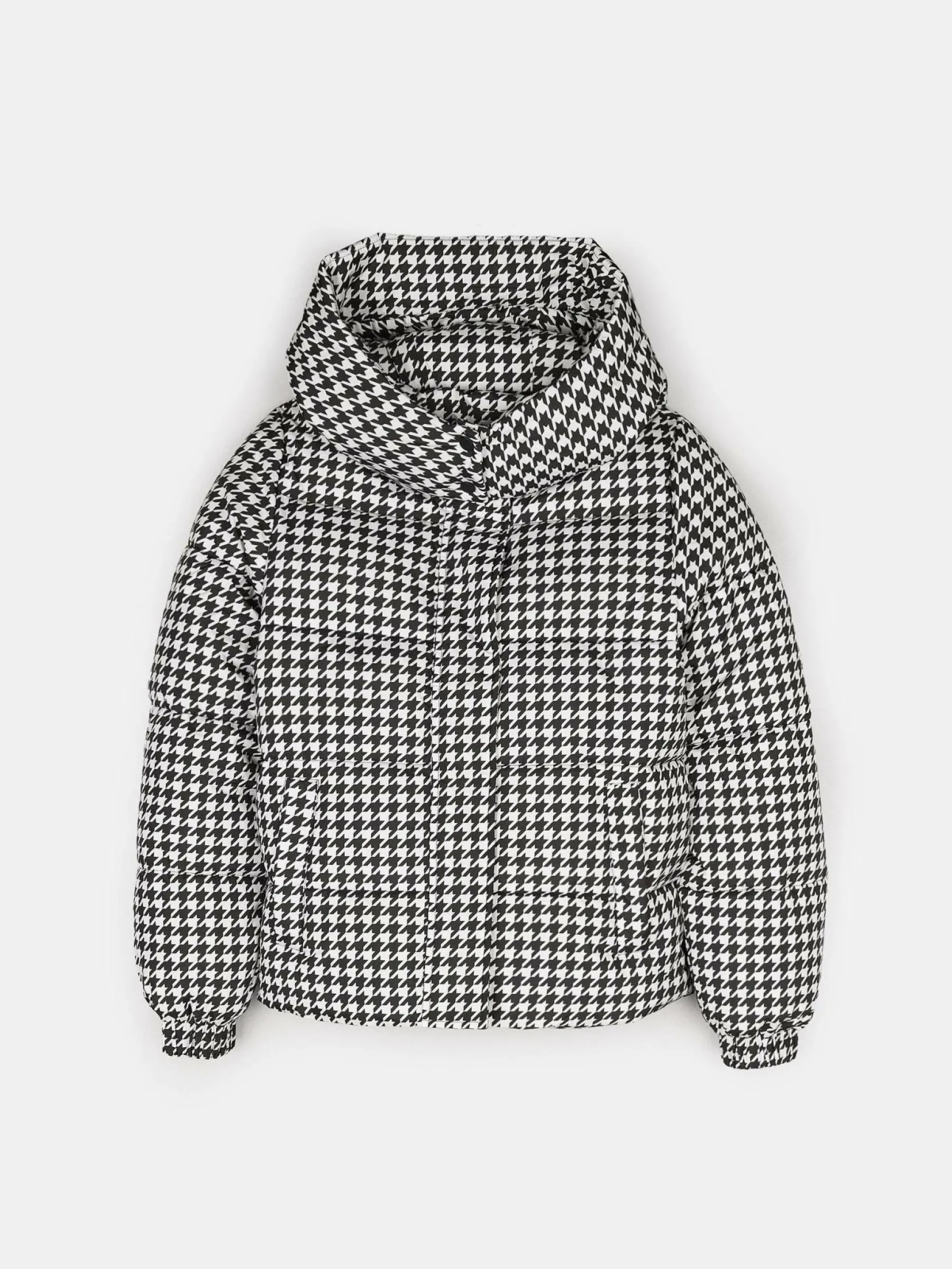 Kolor: czarnyKrój: pikowaneTyp: kurtka zimowaRekaw: długi rękawDługość: krótkiPattern style: z wzorem pepita, z n…