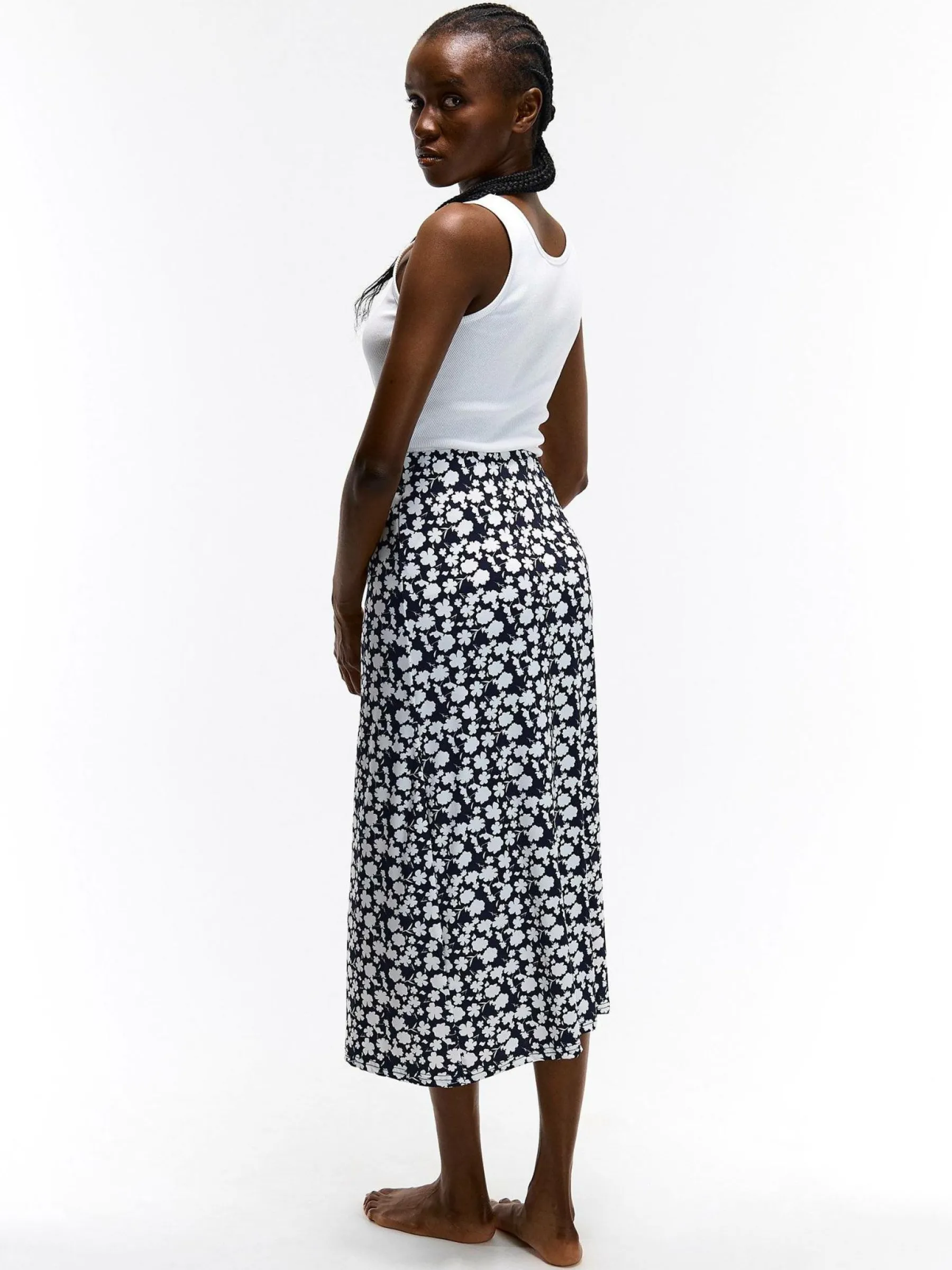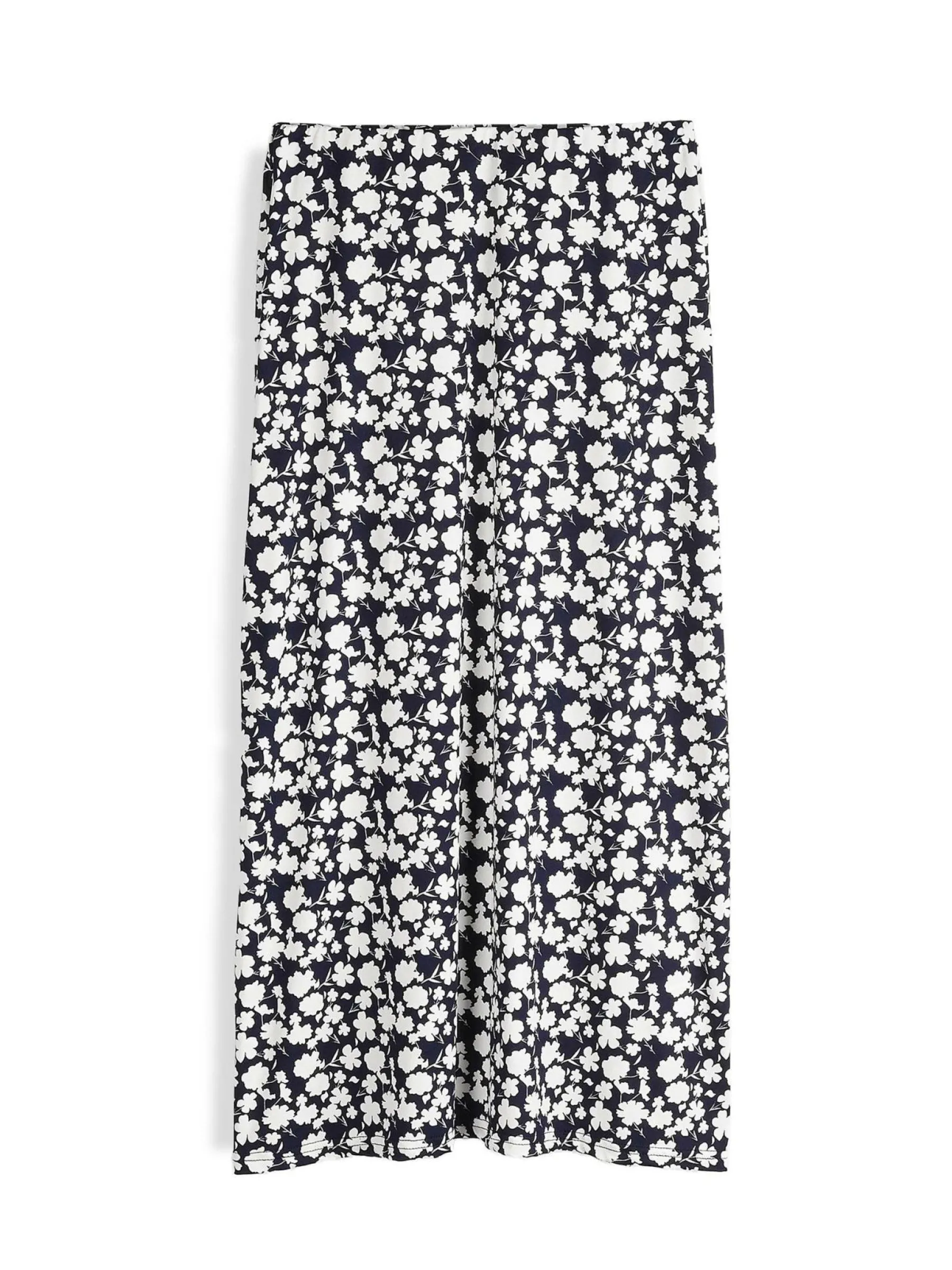 Kolor: granatowyKrój: podstawowyTyp: spódnicaDługość: maxiPattern style: kwiatoweDetal: z elastyczną opaskąMateri…