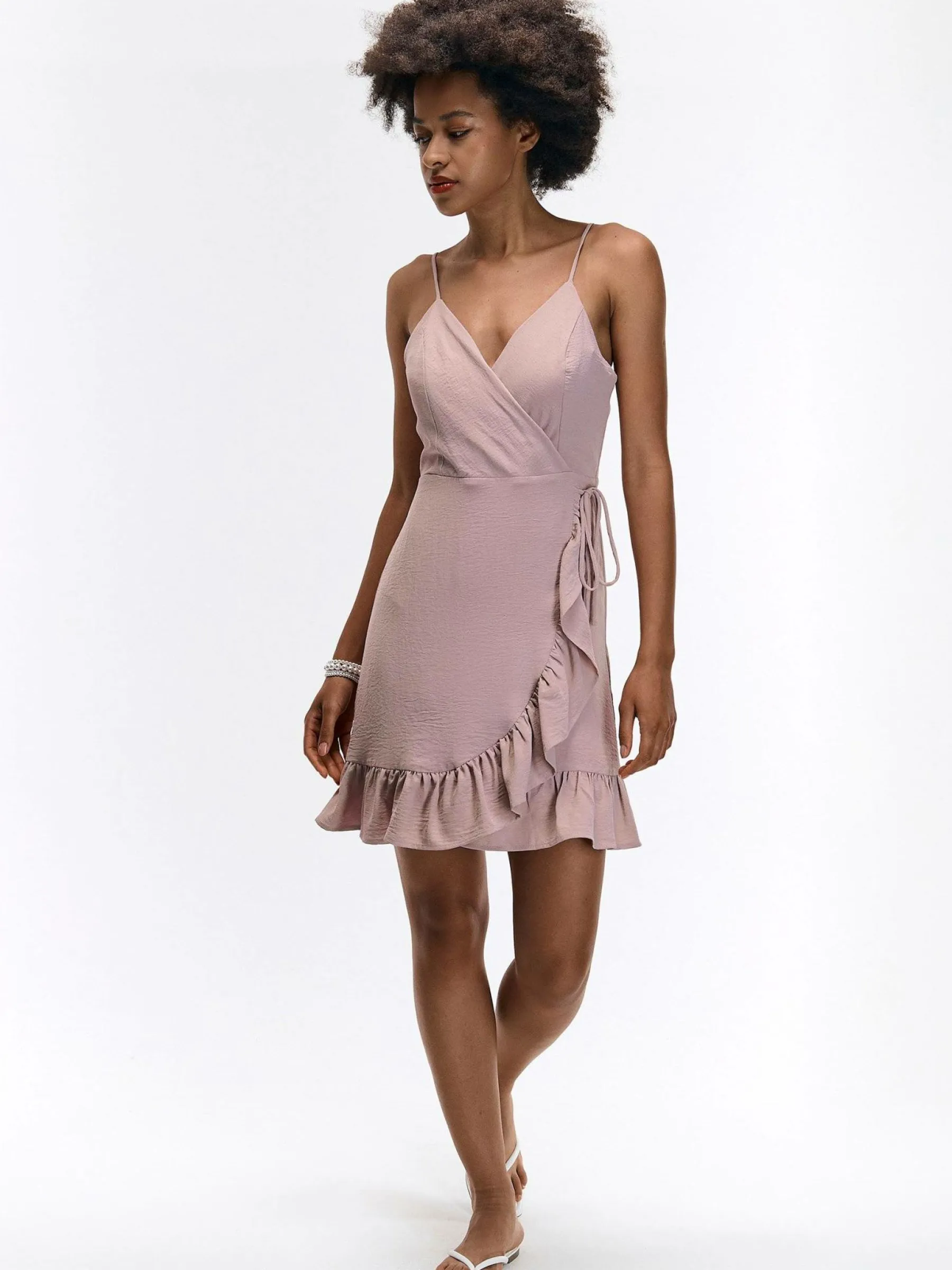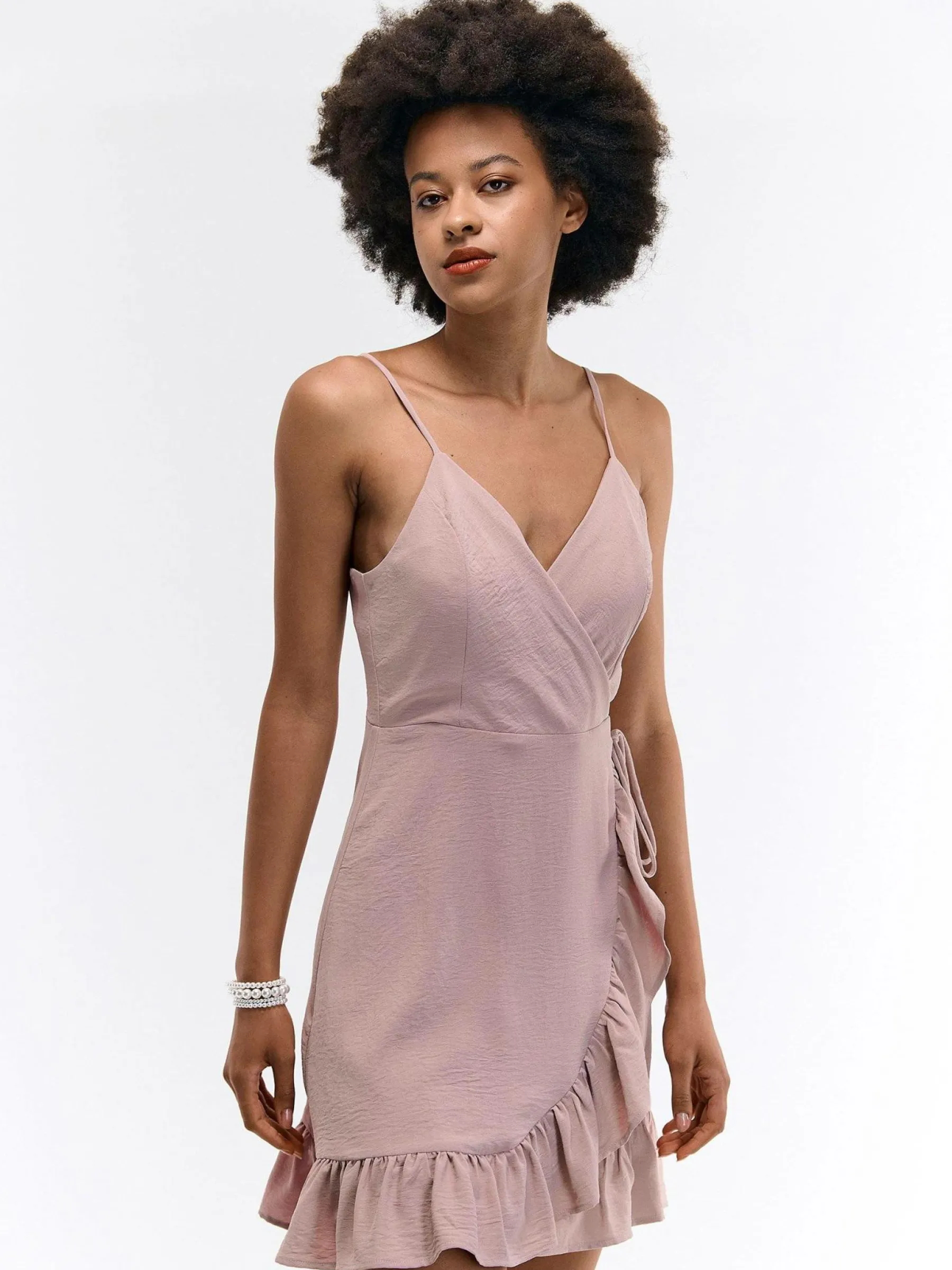 Kolor: różowyKrój: z falbanąTyp: sukienkaRekaw: bez rękawówDługość: miniPattern style: pojedynczy kolorDetal: n…
