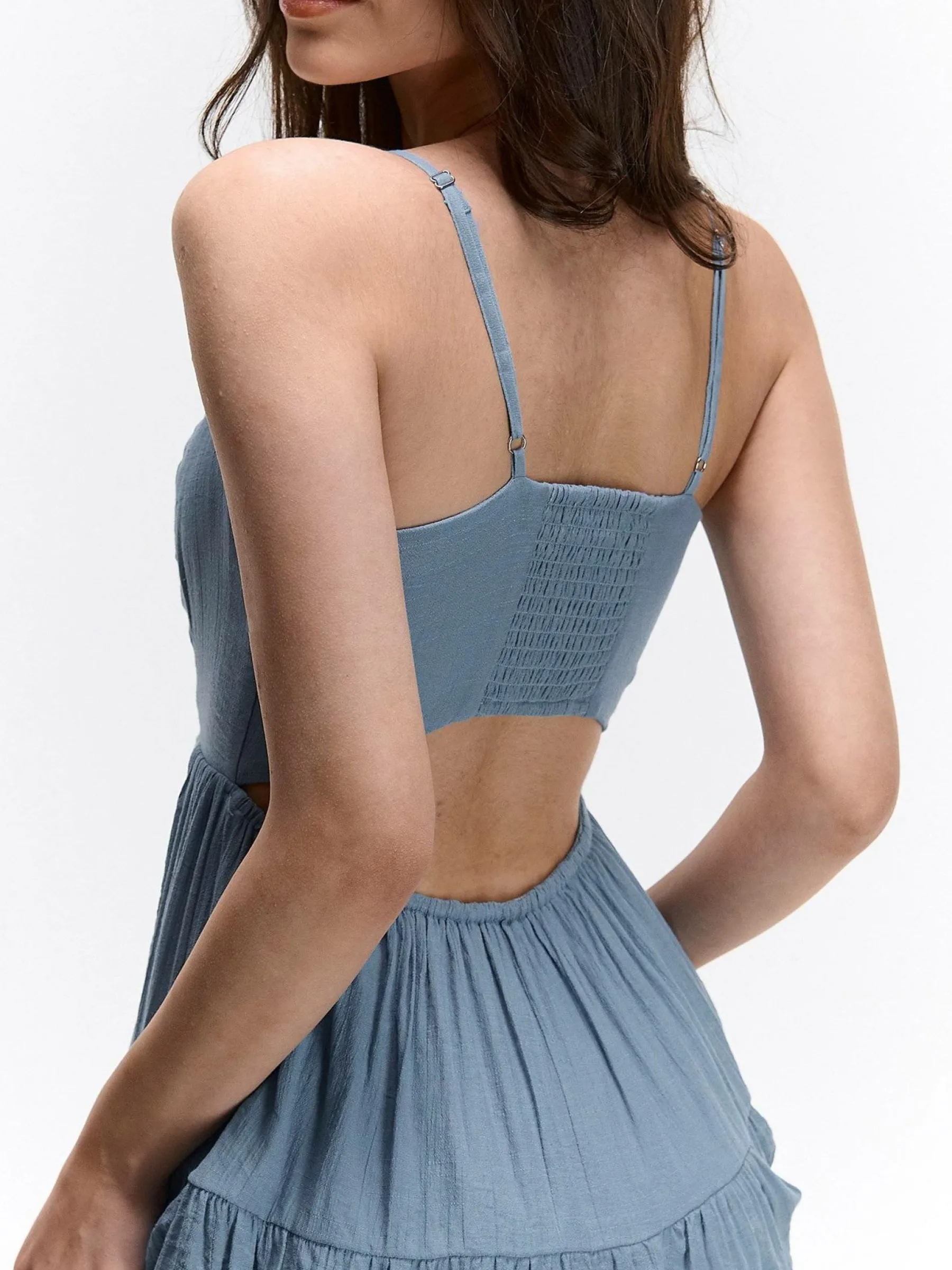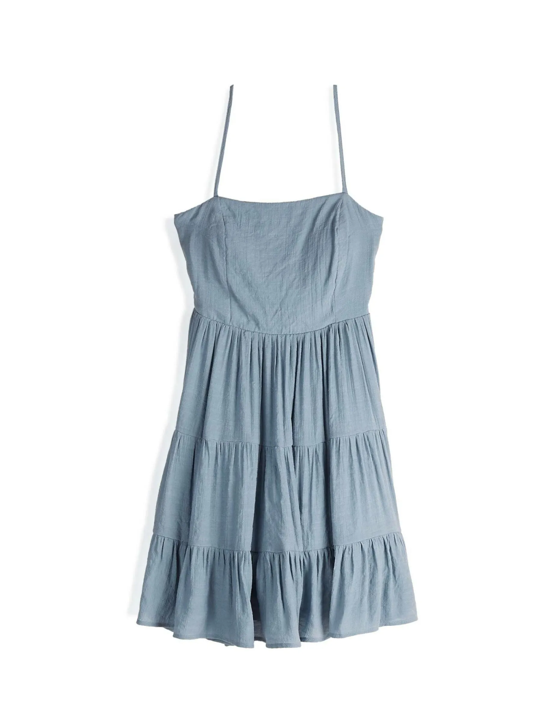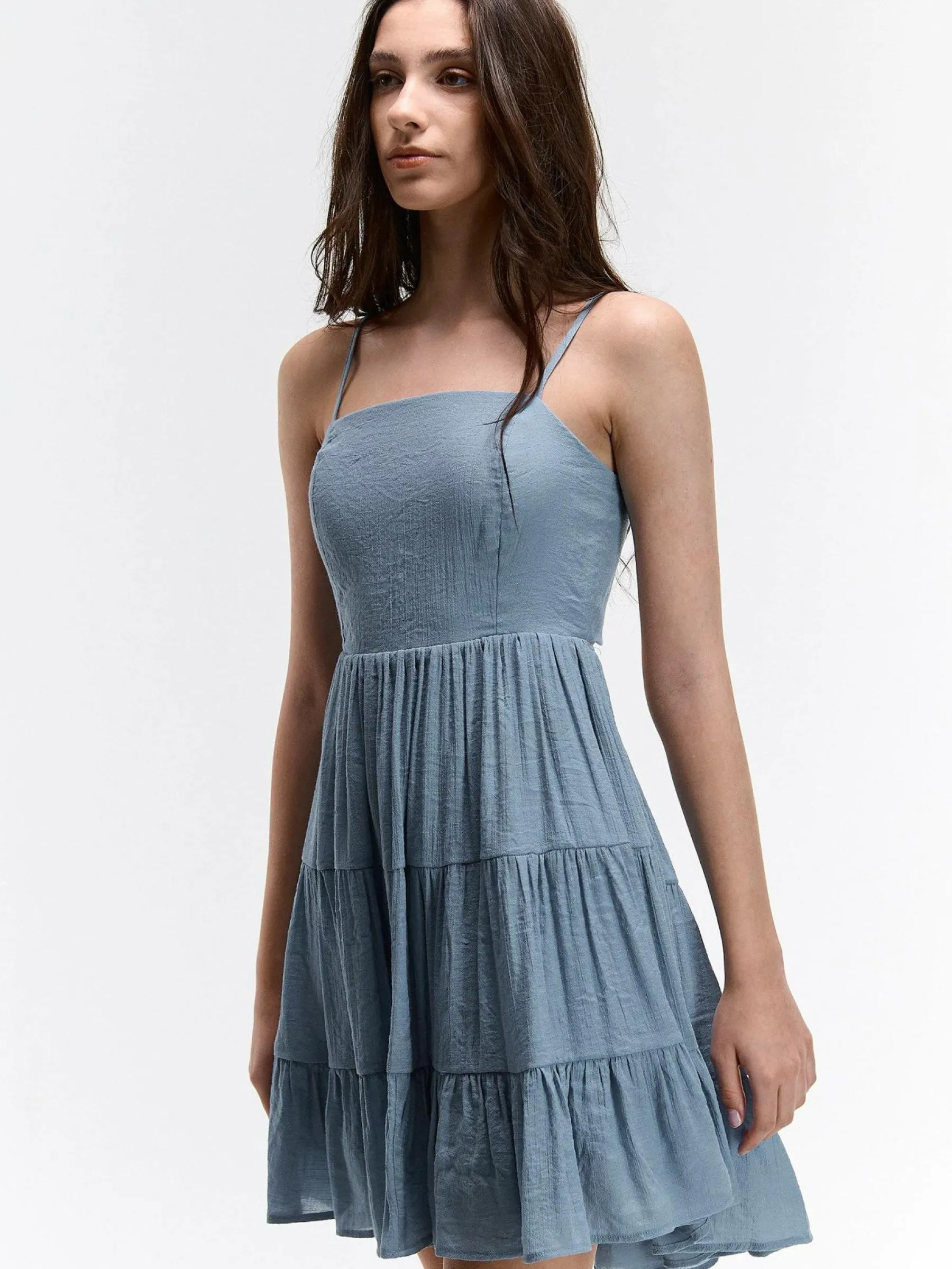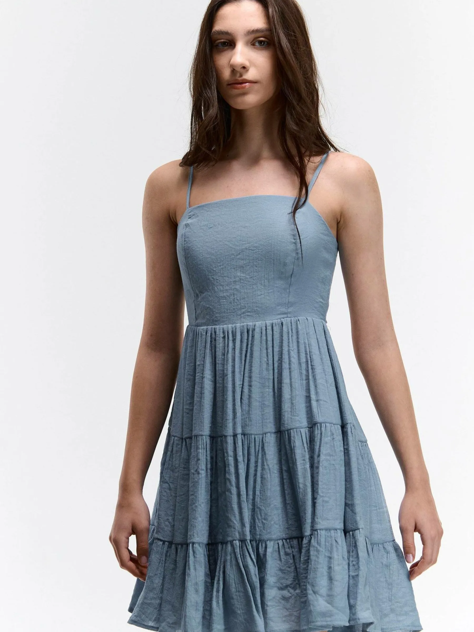 Kolor: niebieskiKrój: z falbanąTyp: sukienkaRekaw: bez rękawówDługość: miniPattern style: pojedynczy kolorDetal: …