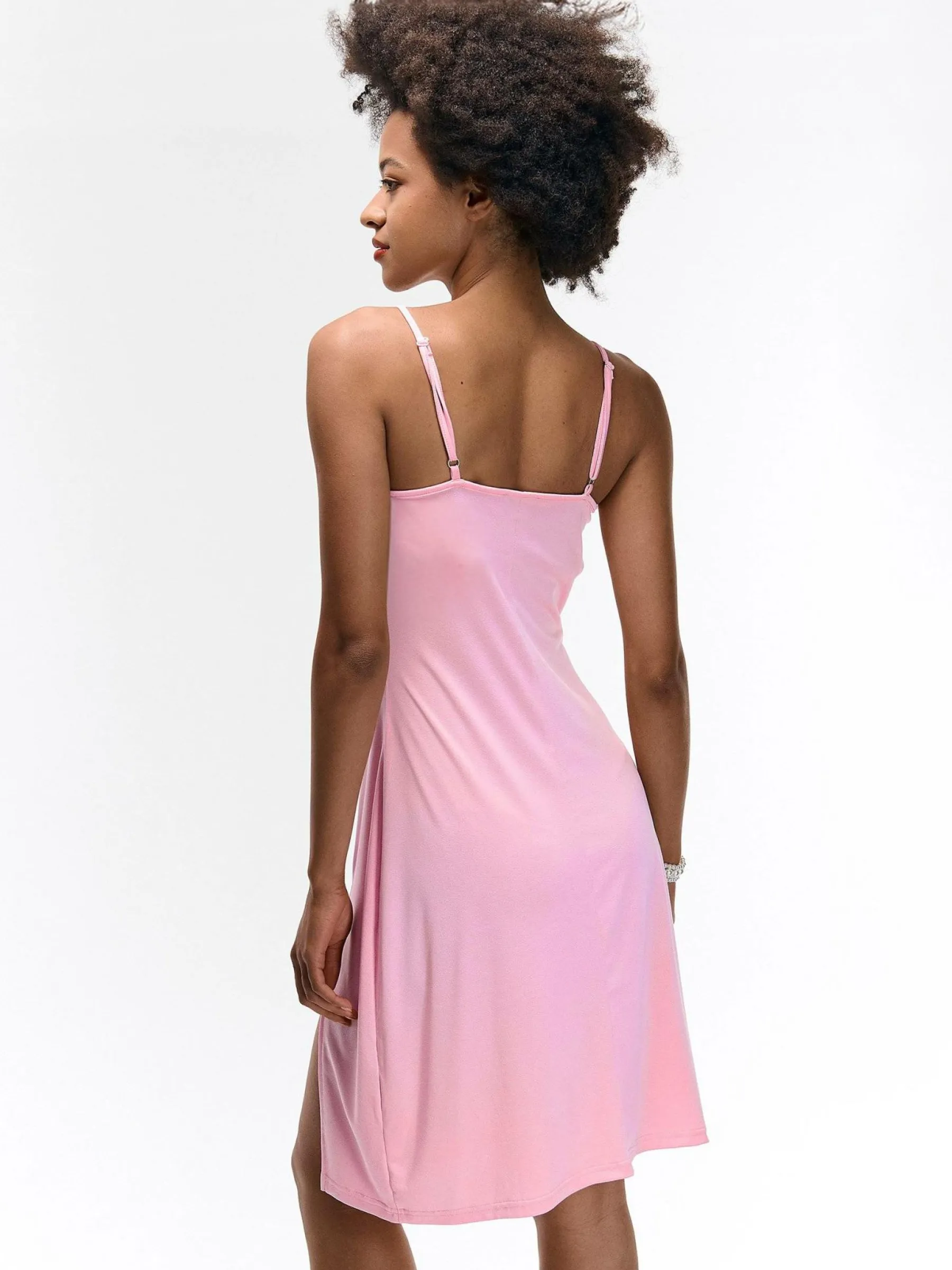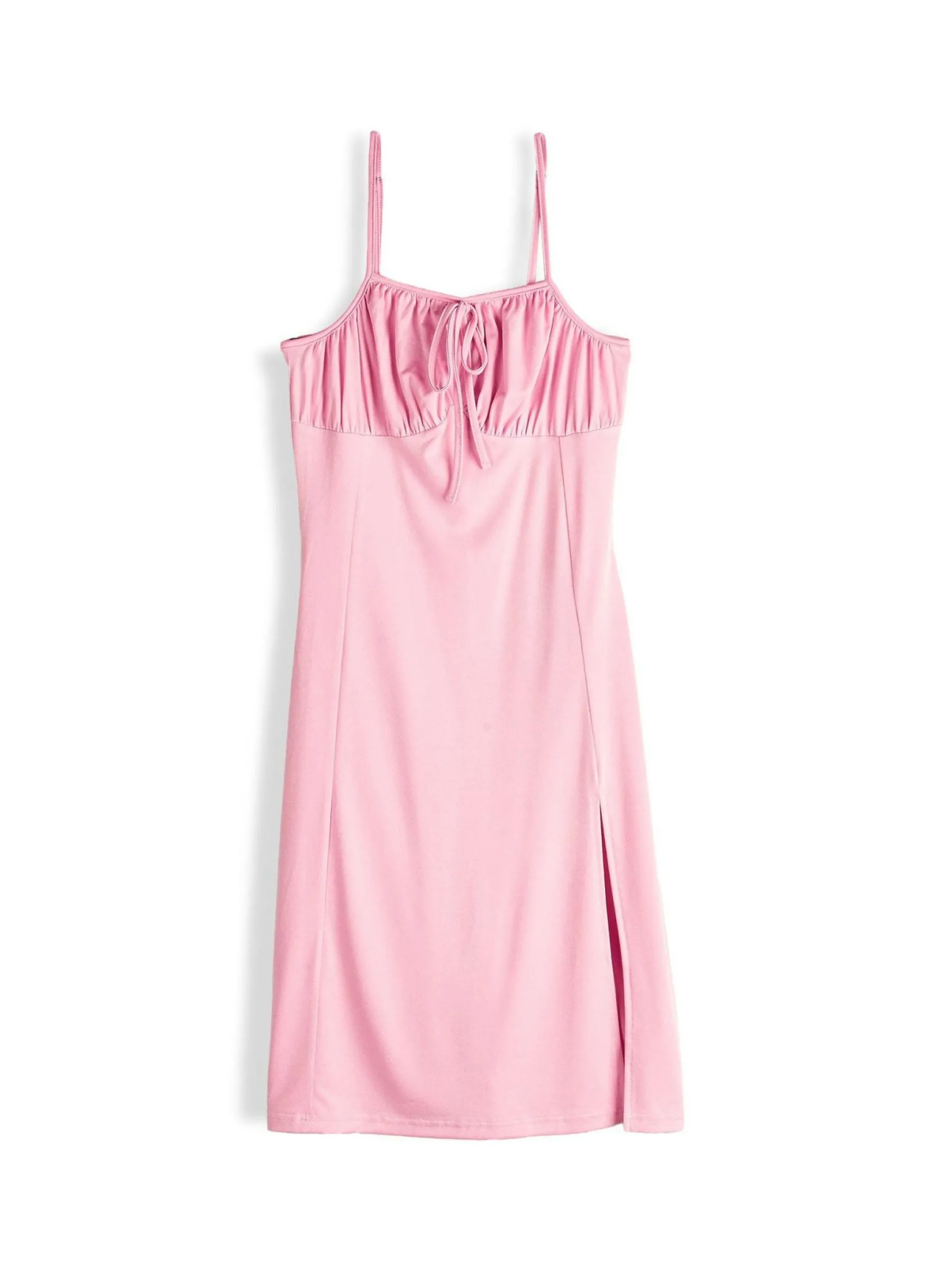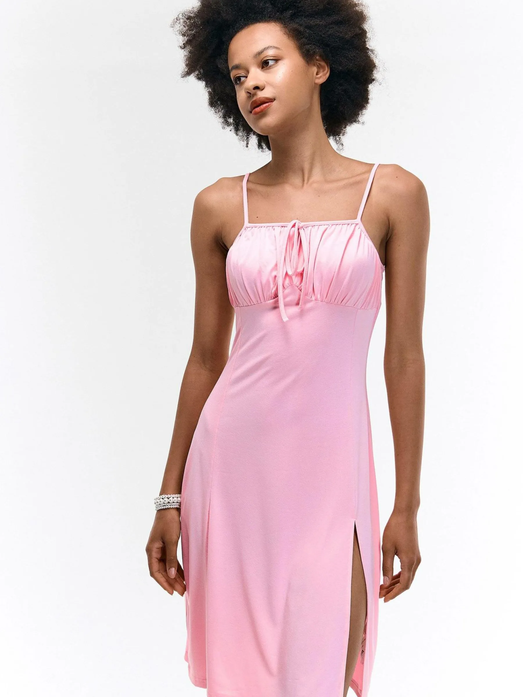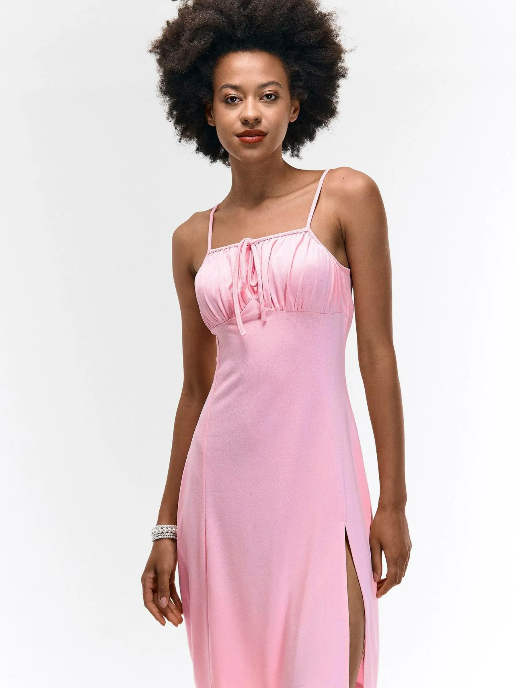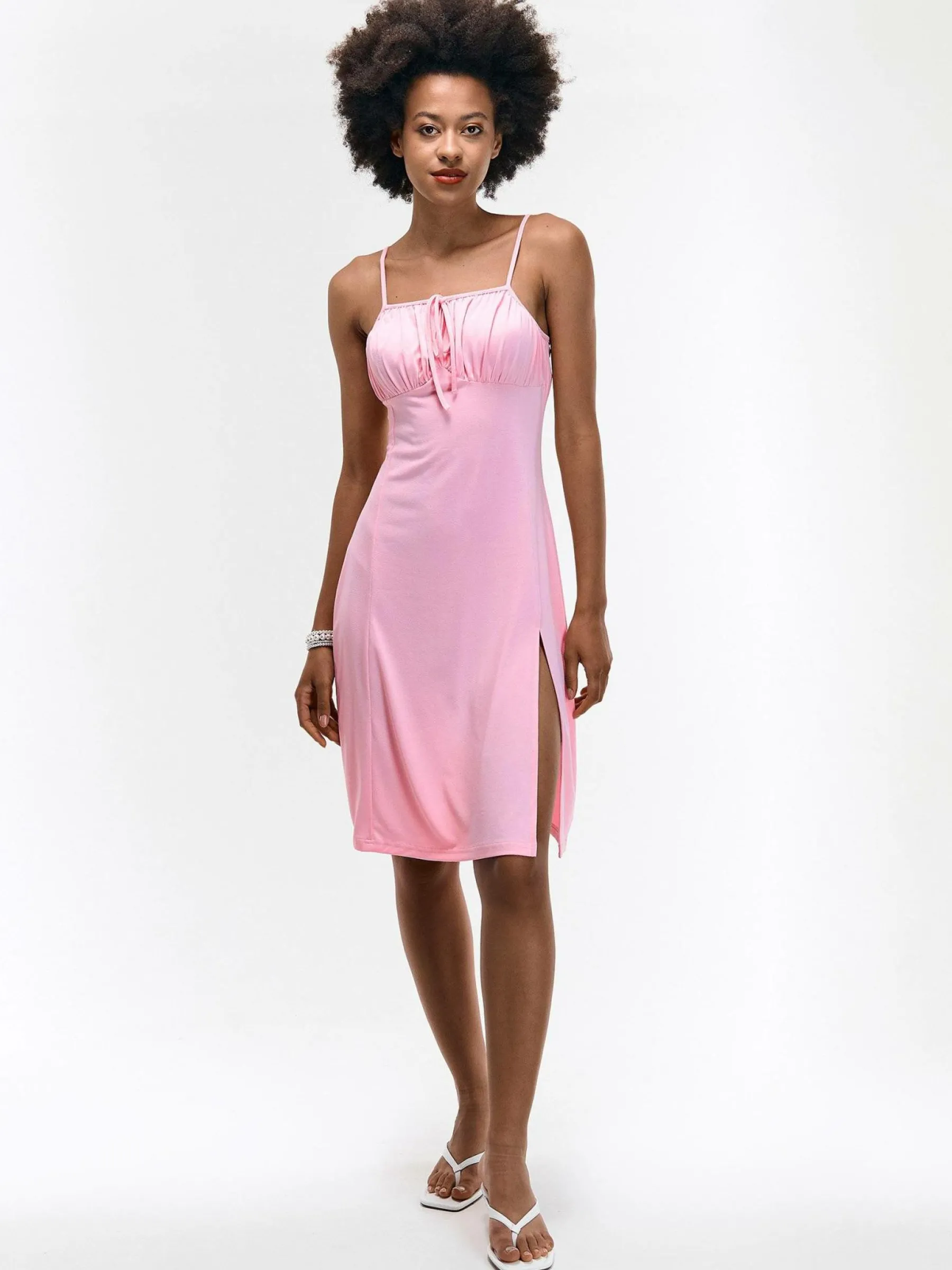 Kolor: różowyKrój: z marszczeniemTyp: sukienkaRekaw: bez rękawówDługość: midiPattern style: pojedynczy kolorDeta…