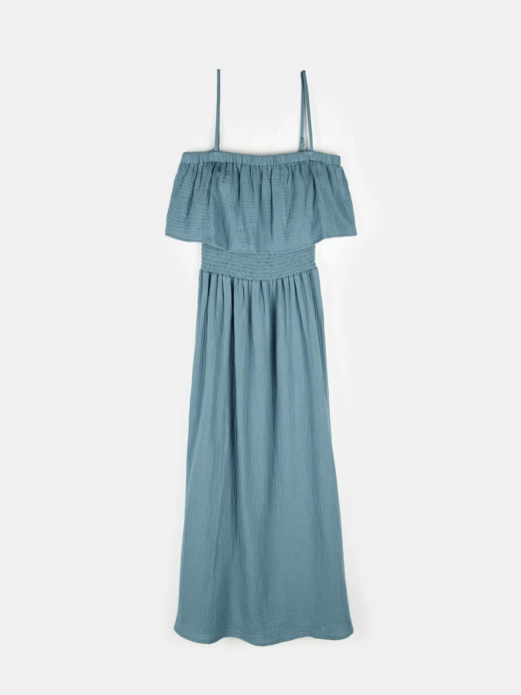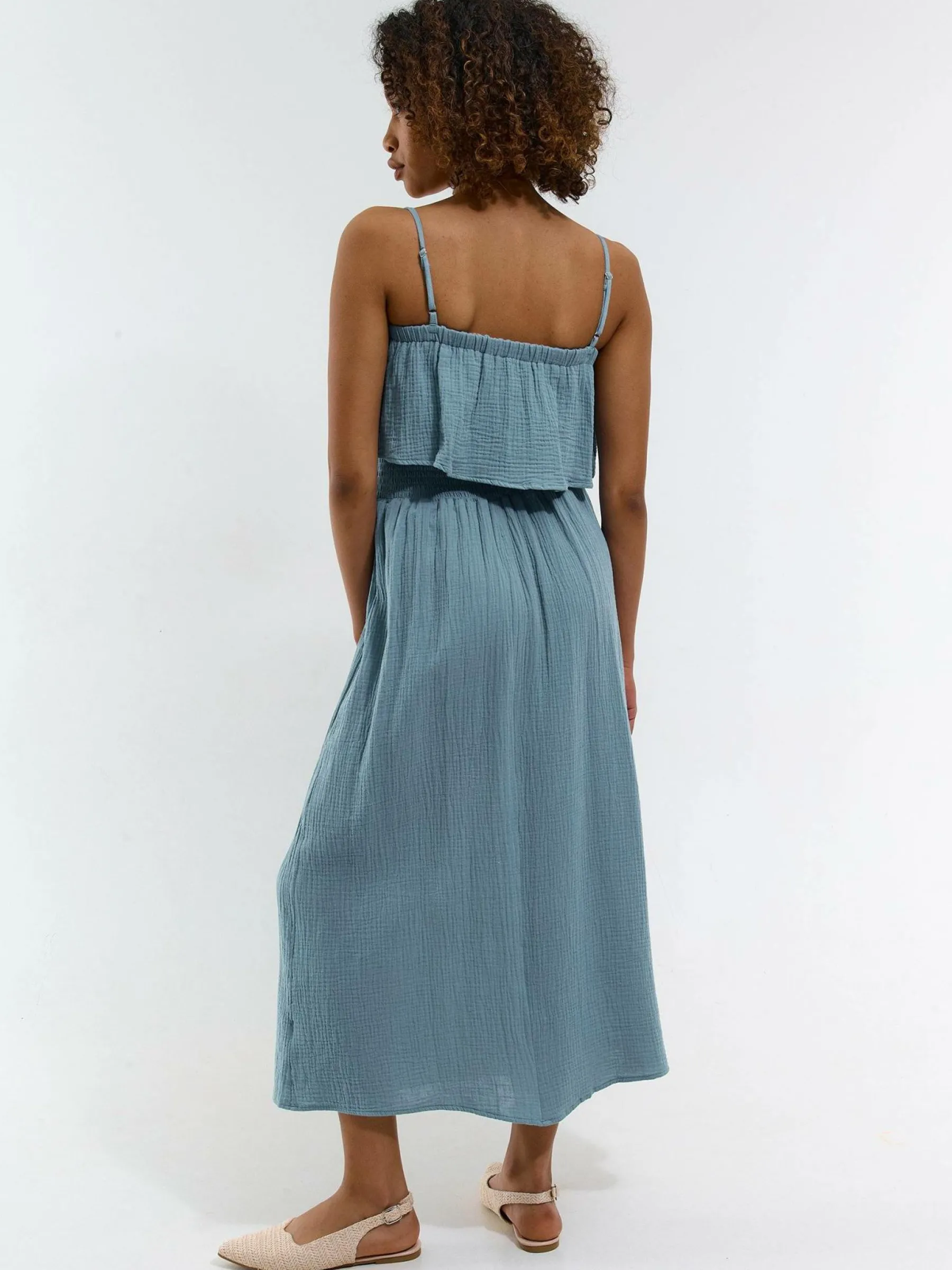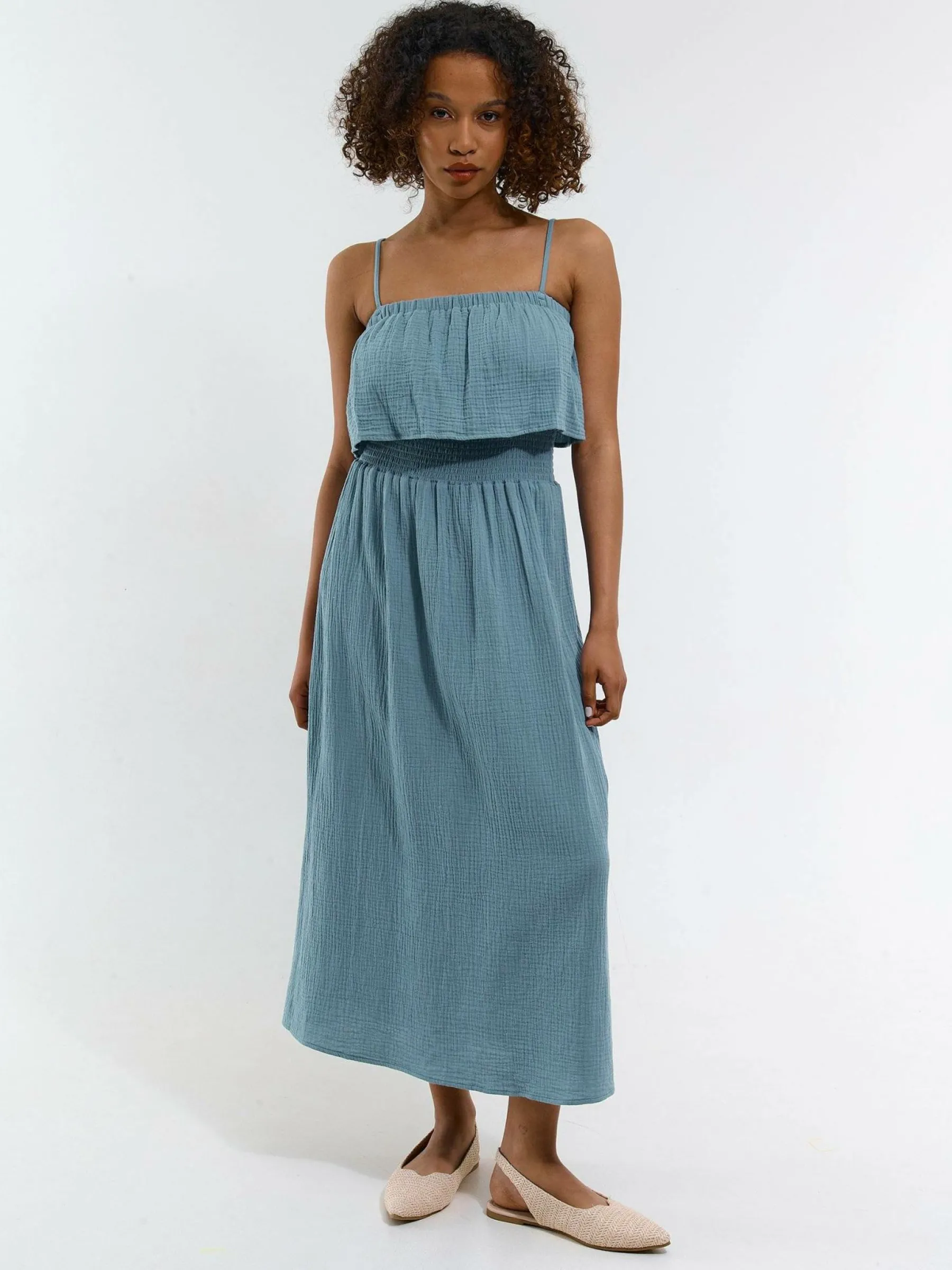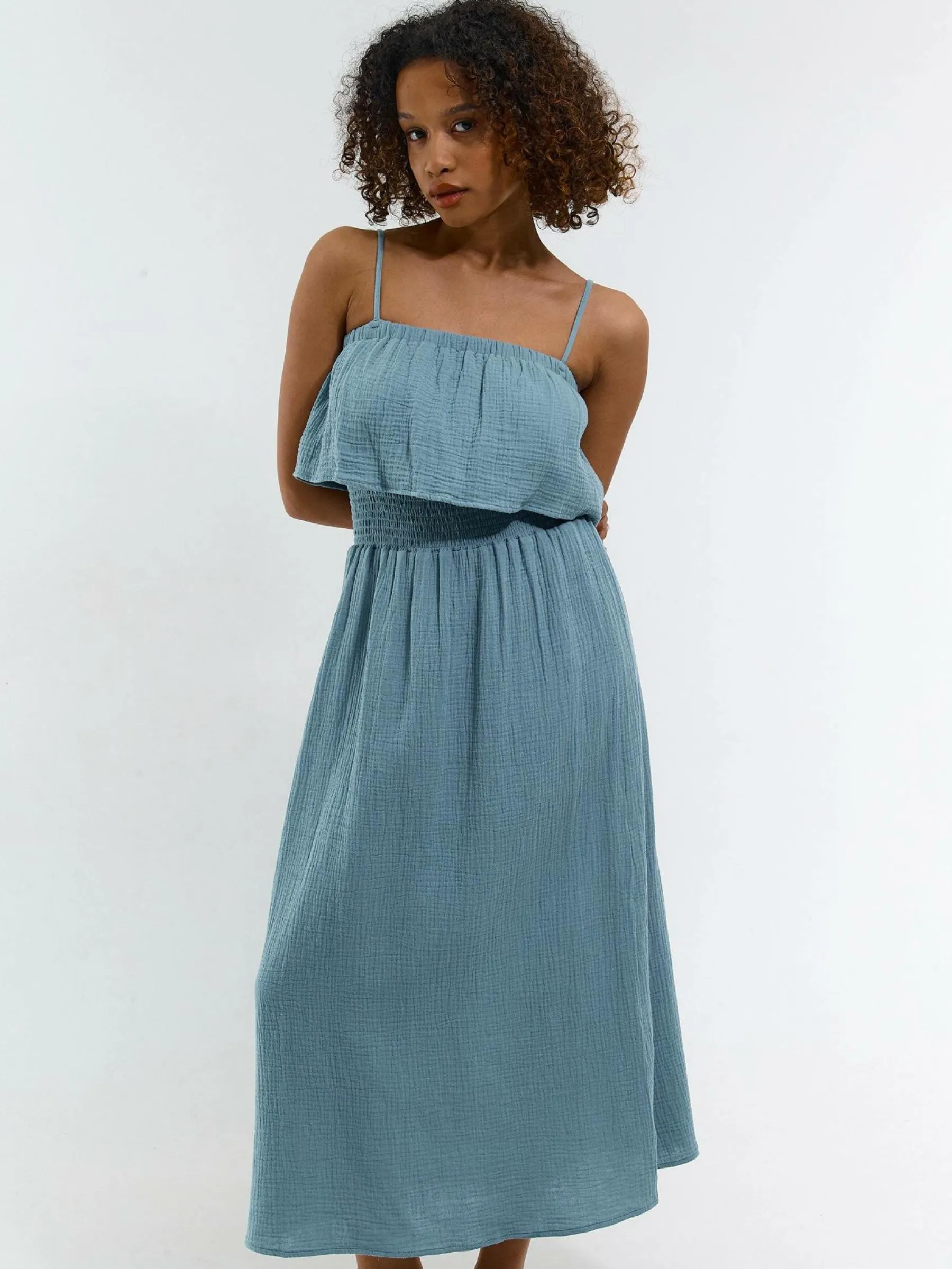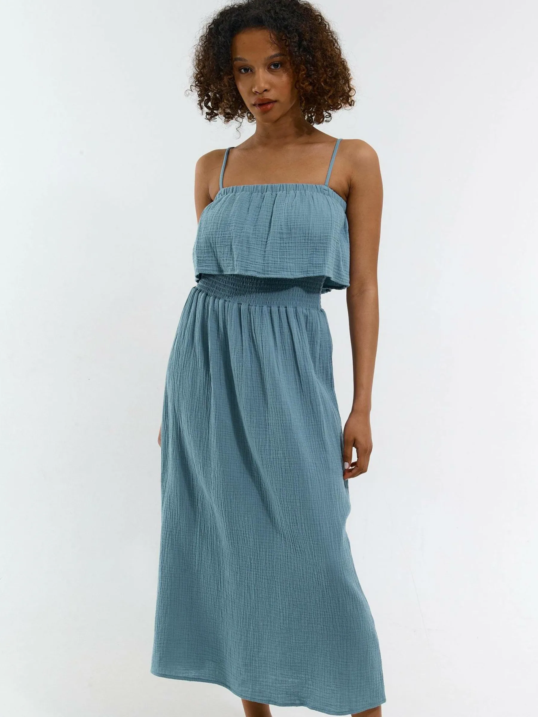 Kolor: niebieskiKrój: z falbanąTyp: sukienkaRekaw: bez rękawówDługość: midiPattern style: pojedynczy kolor, struk…