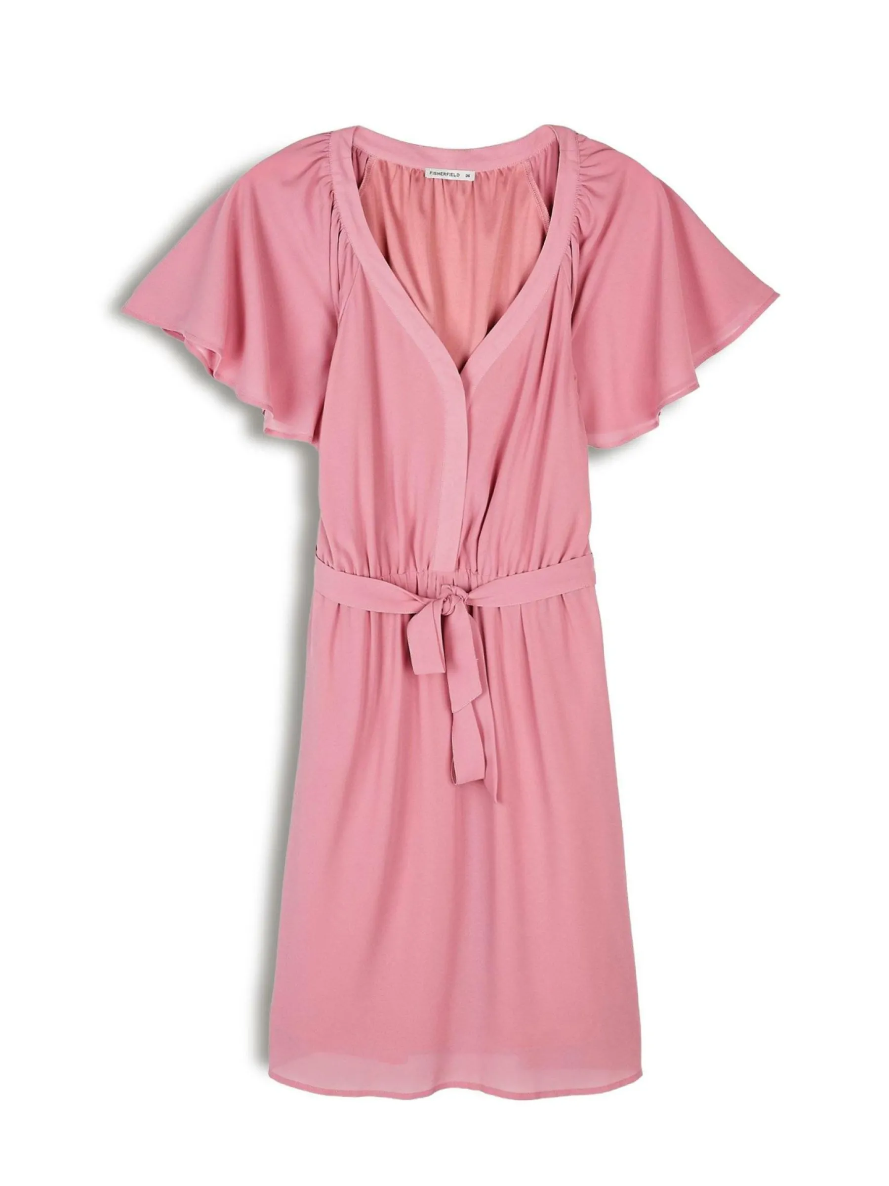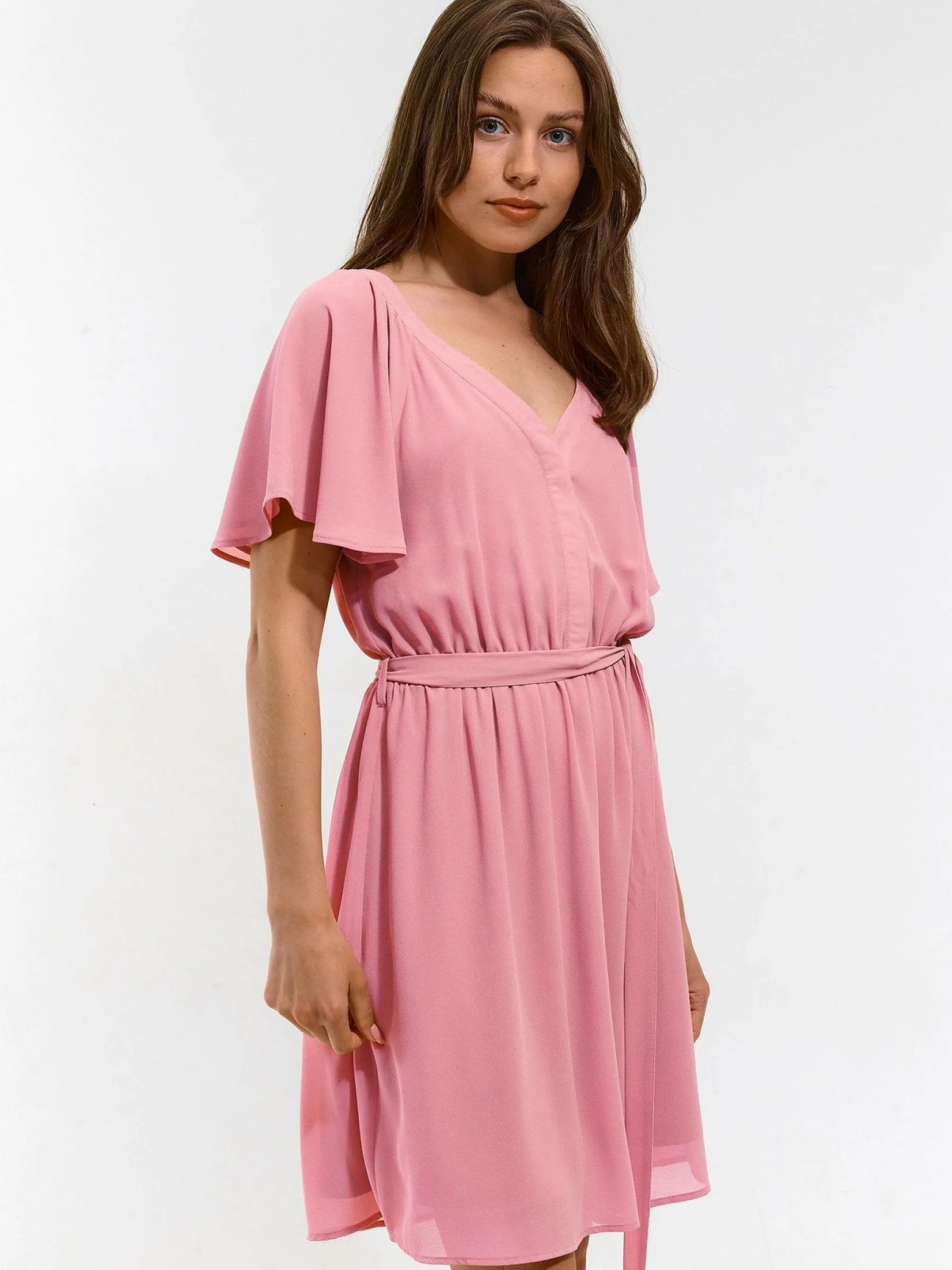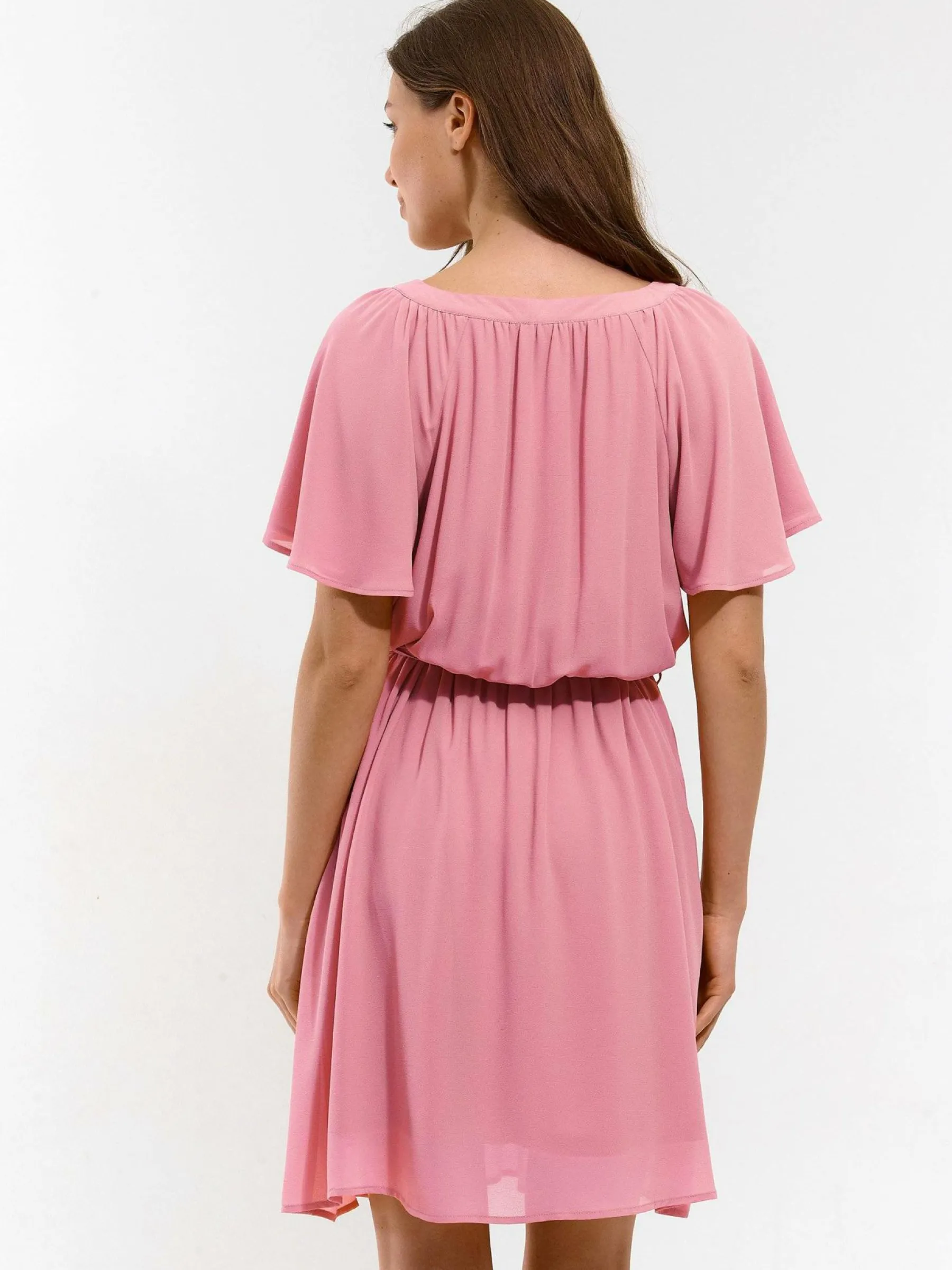 Kolor: różowyKrój: z falbanąTyp: sukienkaRekaw: krótki rękawDługość: miniPattern style: pojedynczy kolorDetal: …