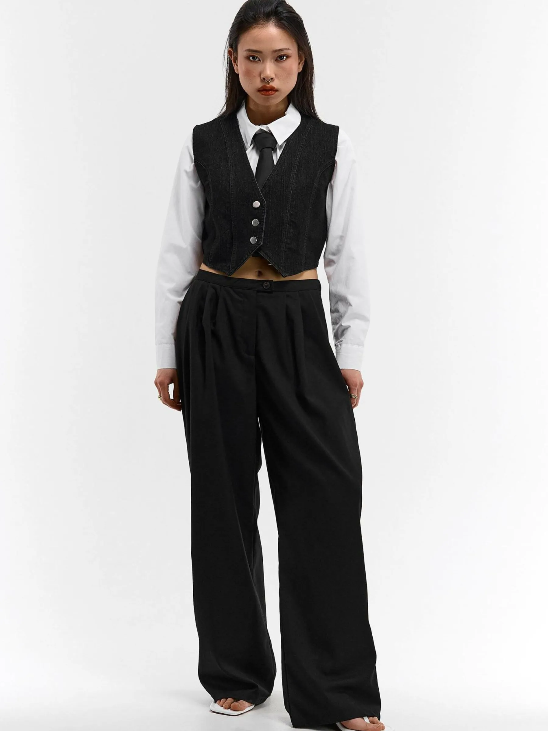 Kolor: czarnyKrój: szerokieTyp: spodnieDługość: dlugiePattern style: pojedynczy kolorDetal: na zamekMateriał: miesz…