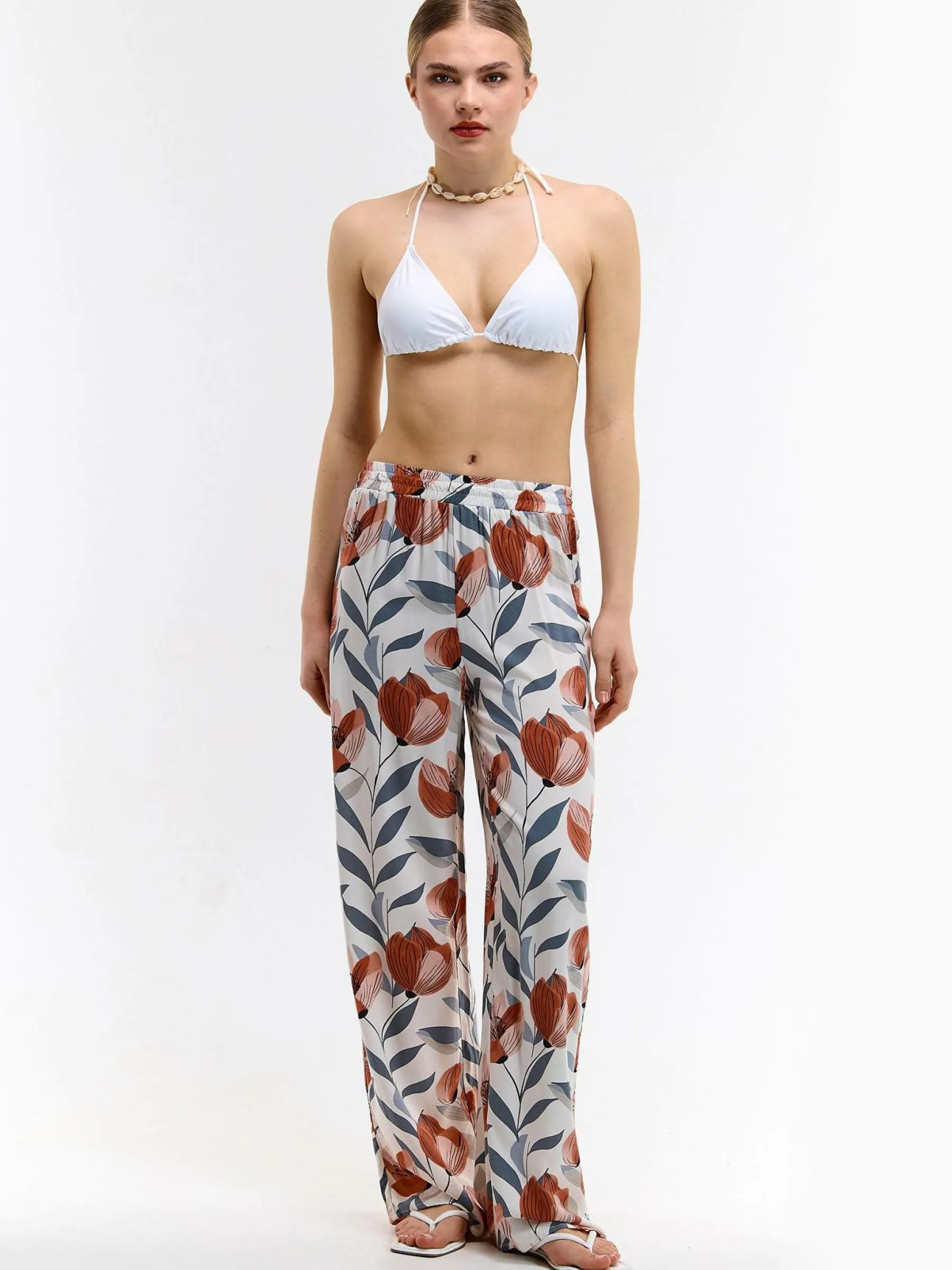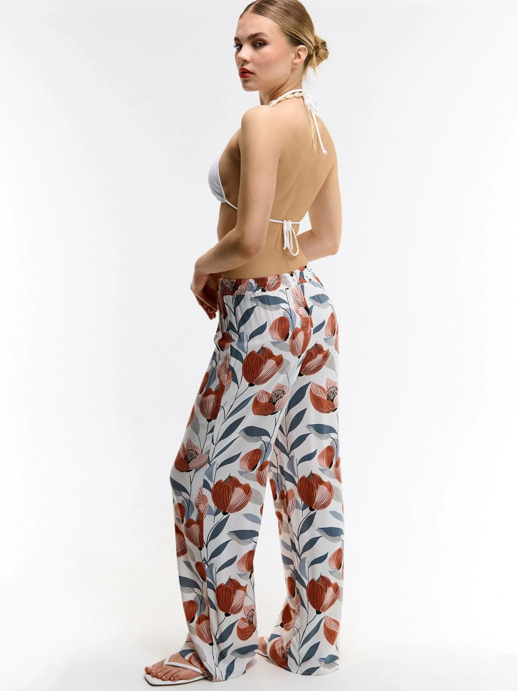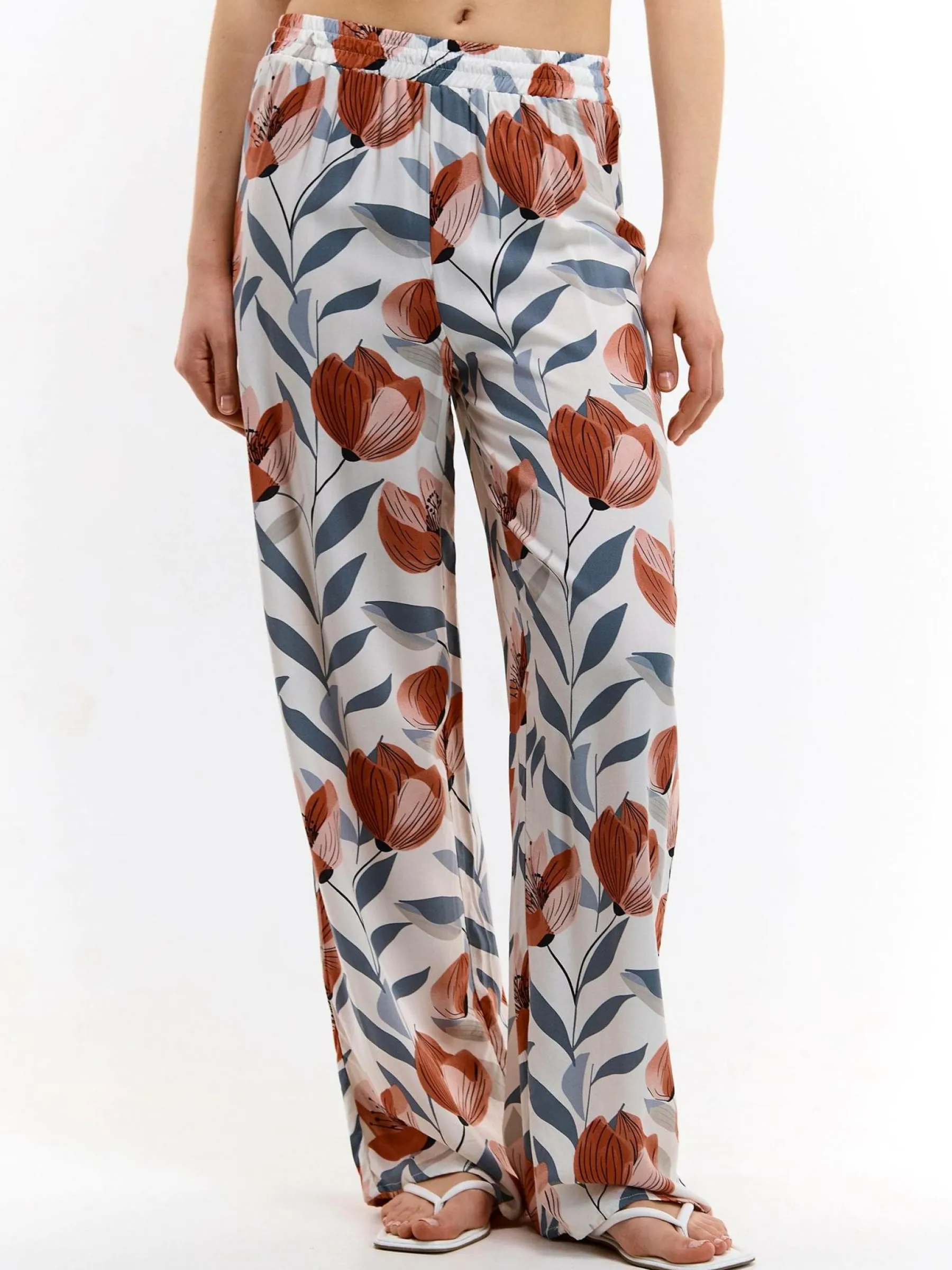 Kolor: beżowyKrój: szerokieTyp: spodnieDługość: dlugiePattern style: kwiatoweDetal: z elastyczną opaskąMateriał:…