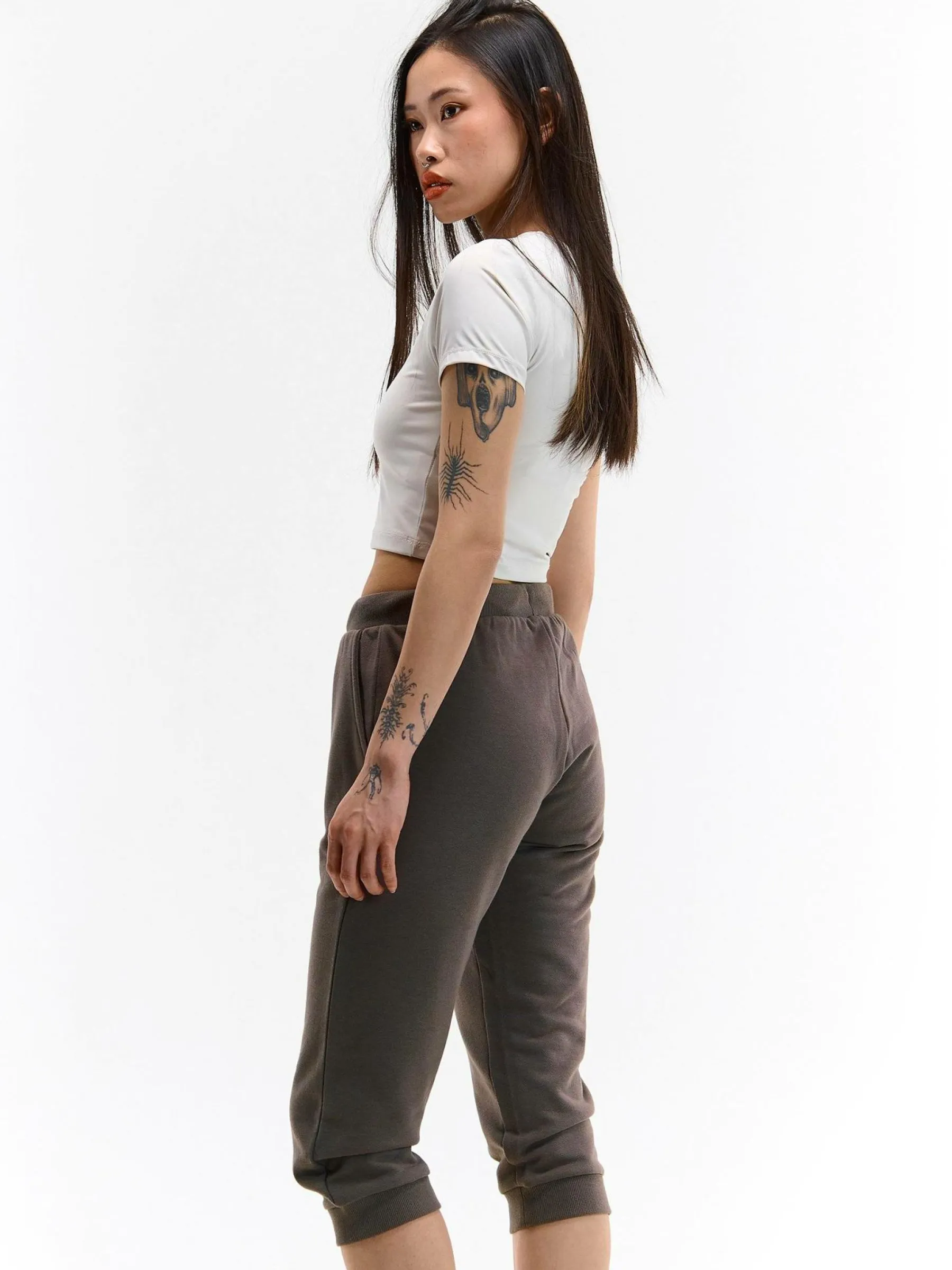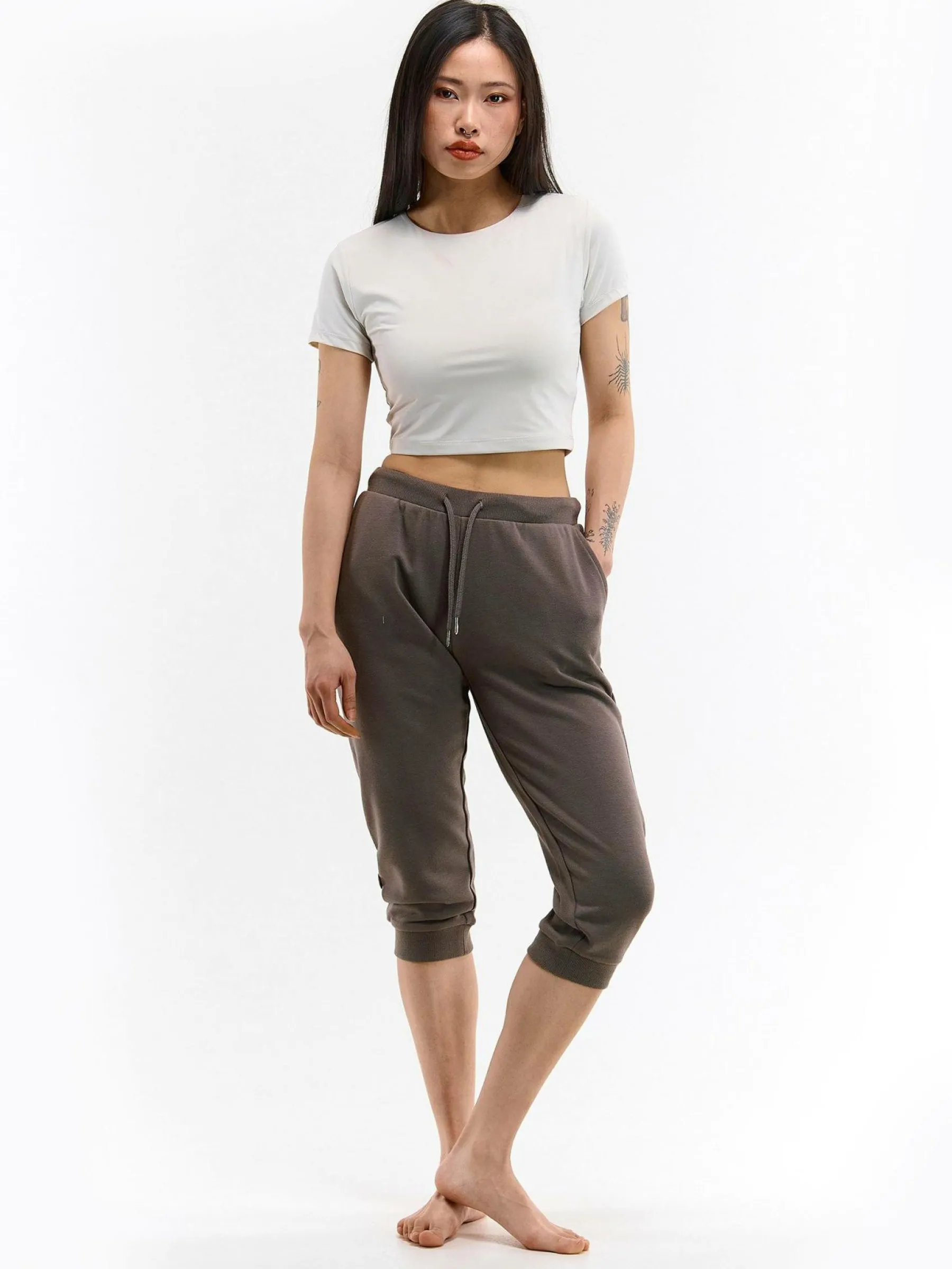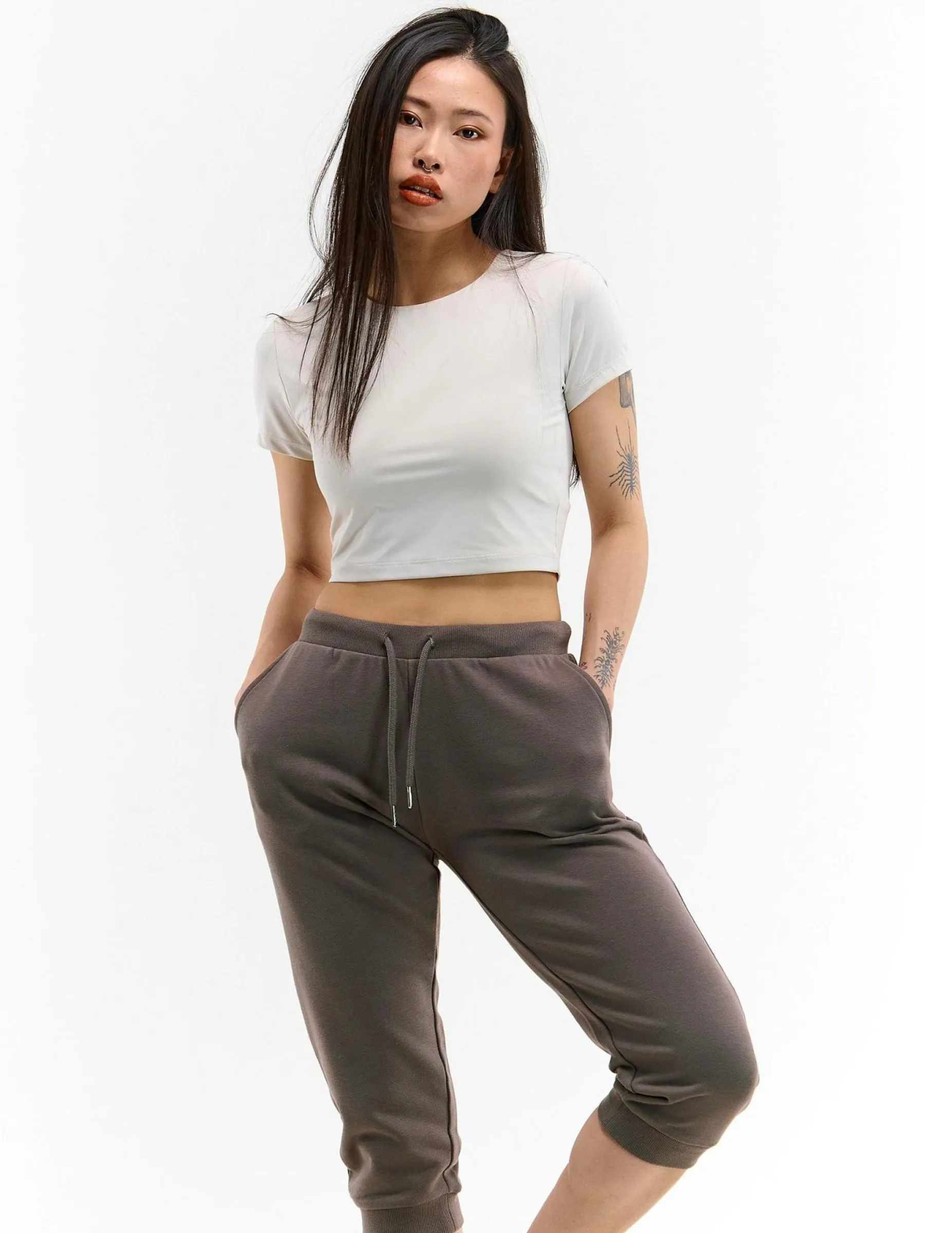 Kolor: brązowyKrój: joggerTyp: spodnie dresoweDługość: trzy czwartePattern style: pojedynczy kolorDetal: ze sznurow…