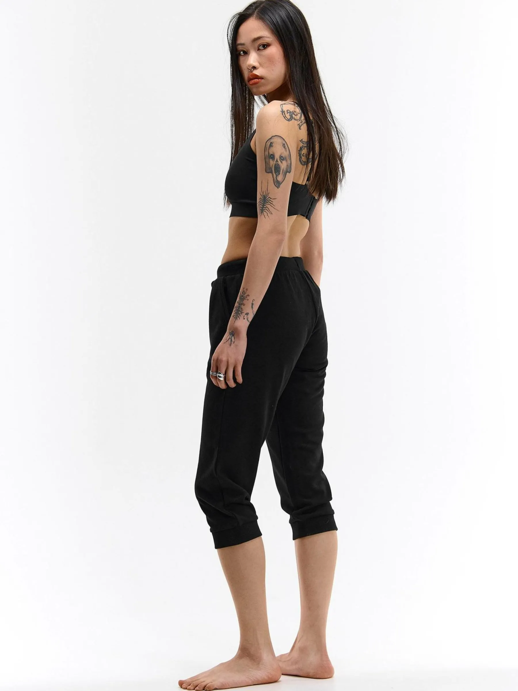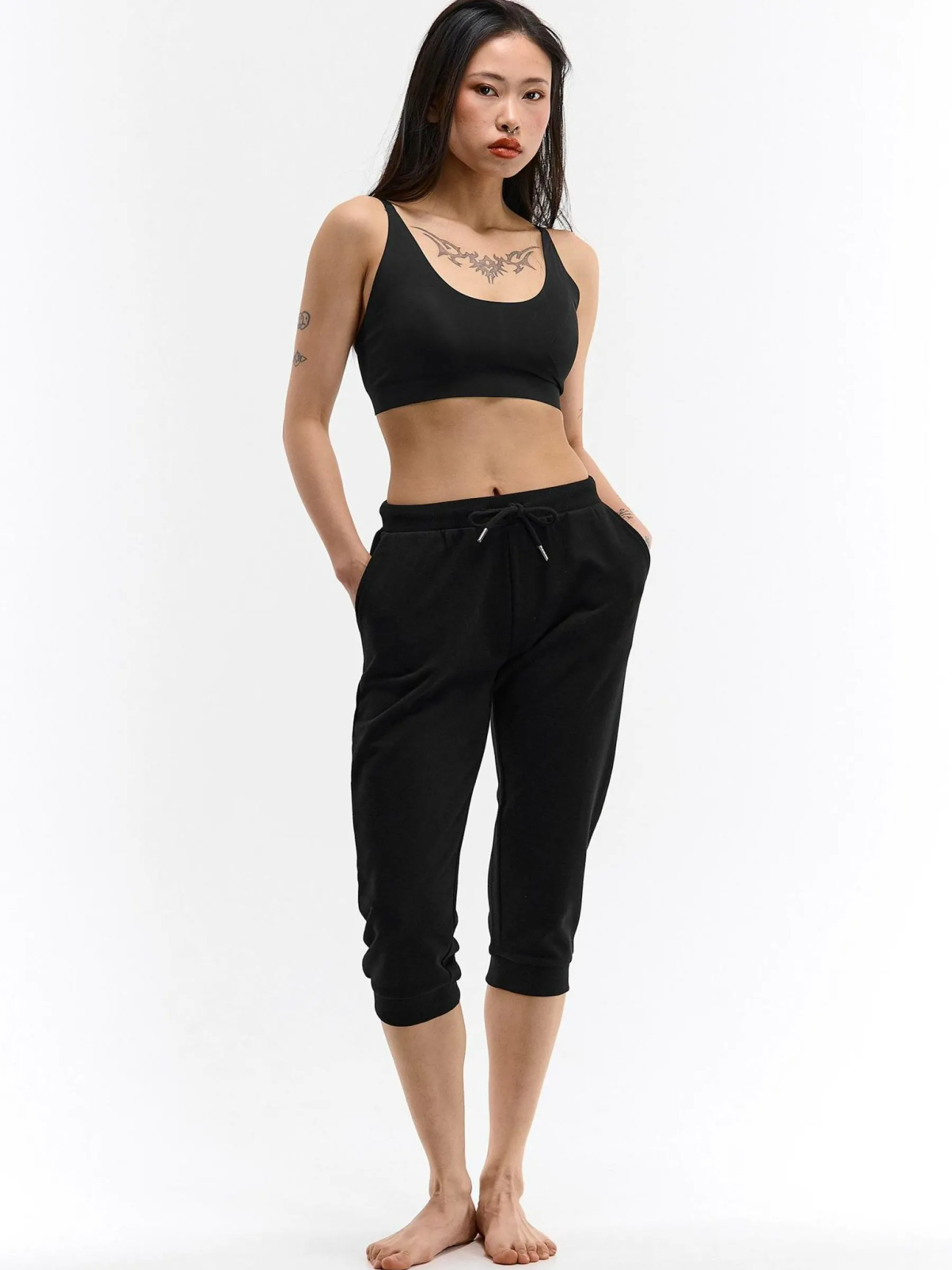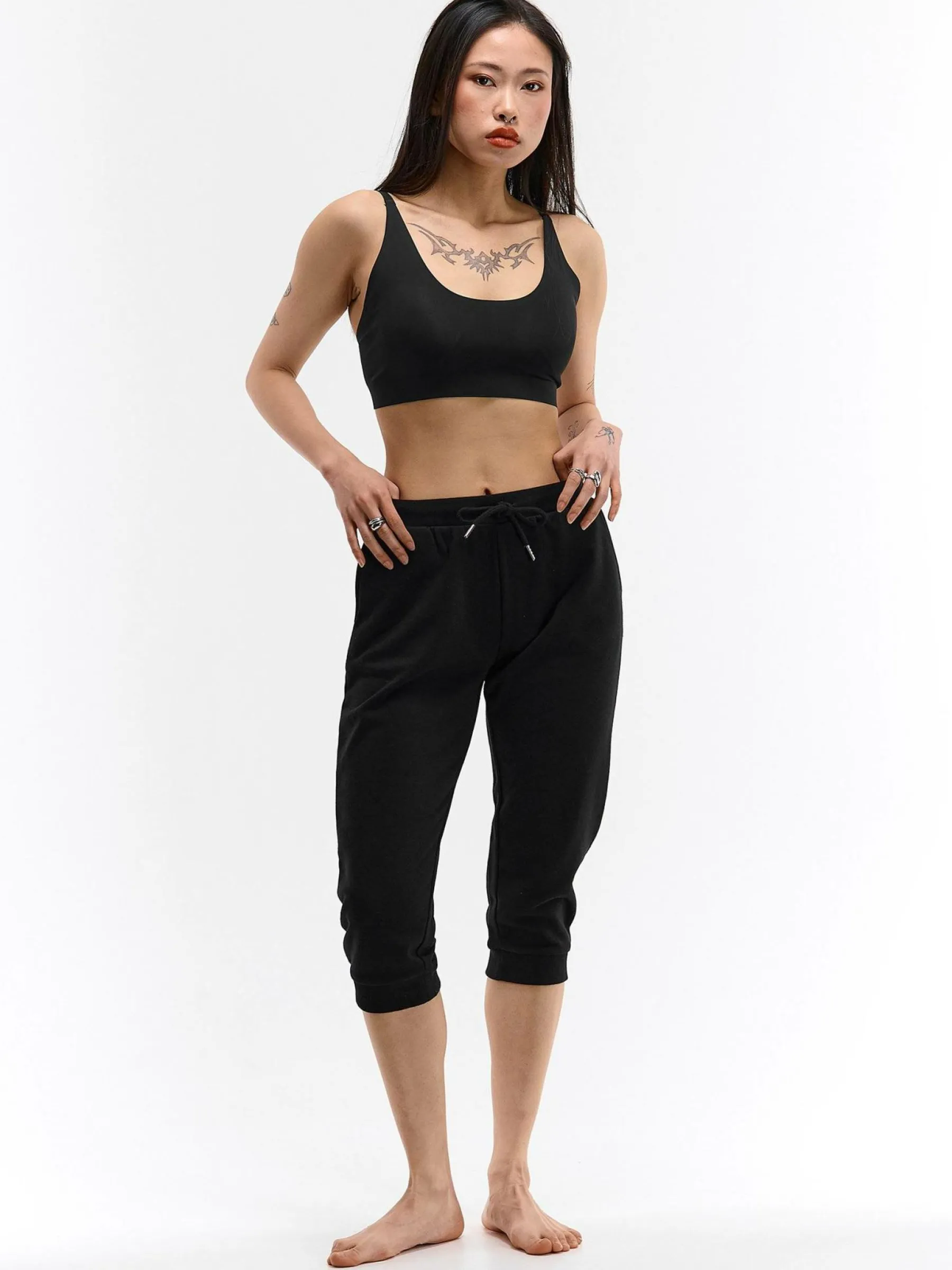 Kolor: czarnyKrój: joggerTyp: spodnie dresoweDługość: trzy czwartePattern style: pojedynczy kolorDetal: ze sznurowan…