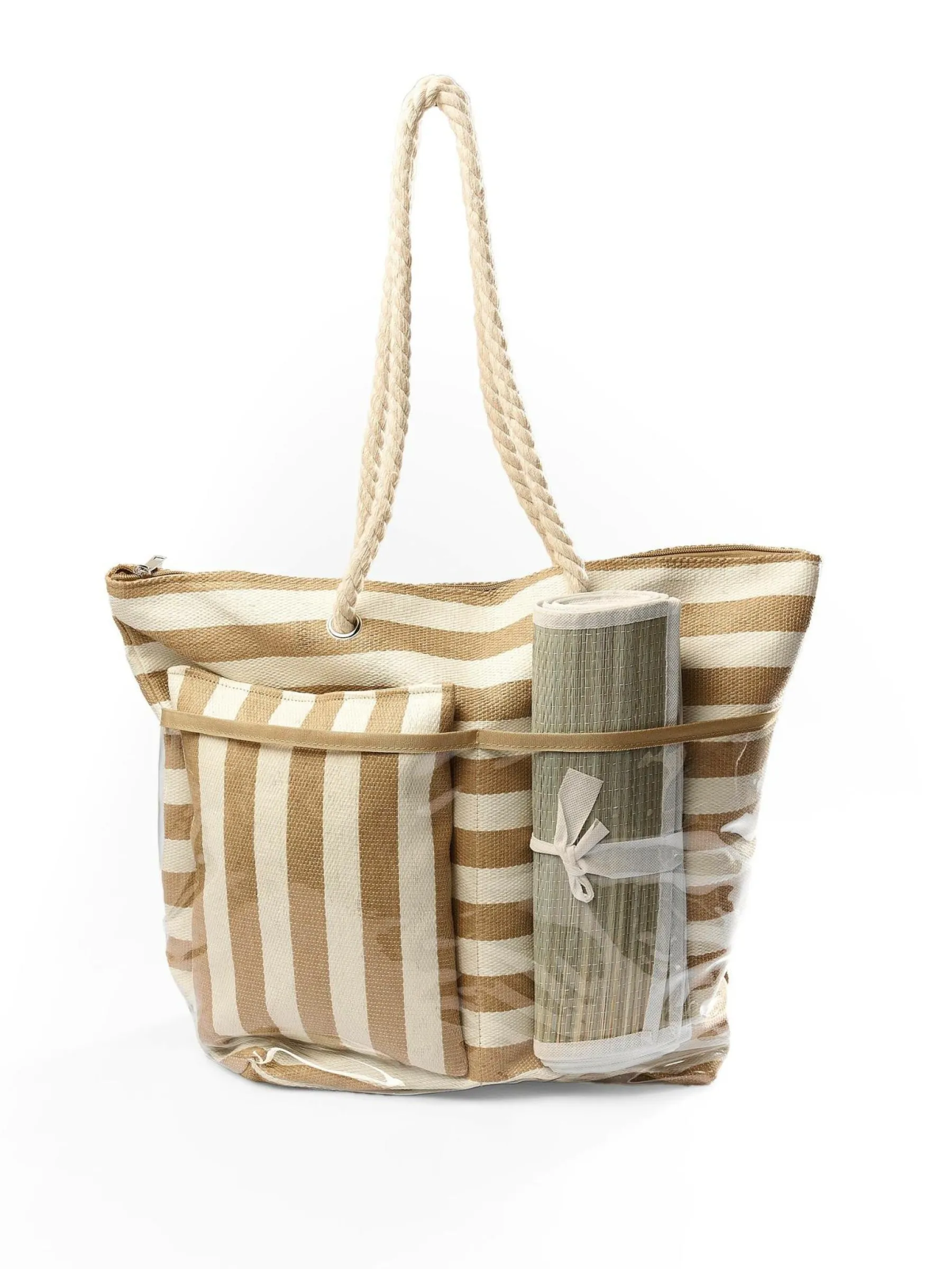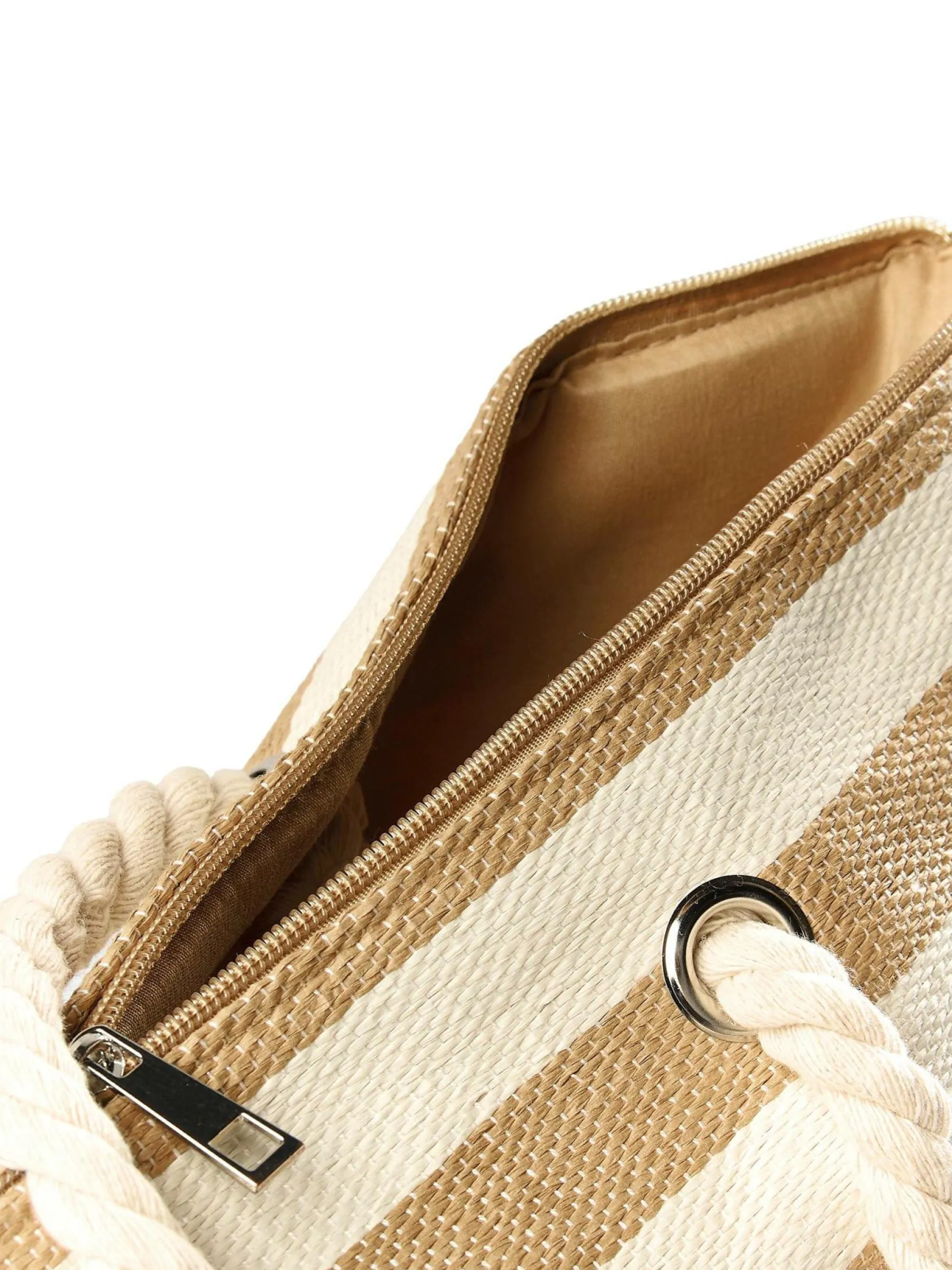 Kolor: beżowy, brązowyKrój: shopperTyp: torebka, poduszka podróżna, łóżko piknikowePattern style: w prążkiDeta…
