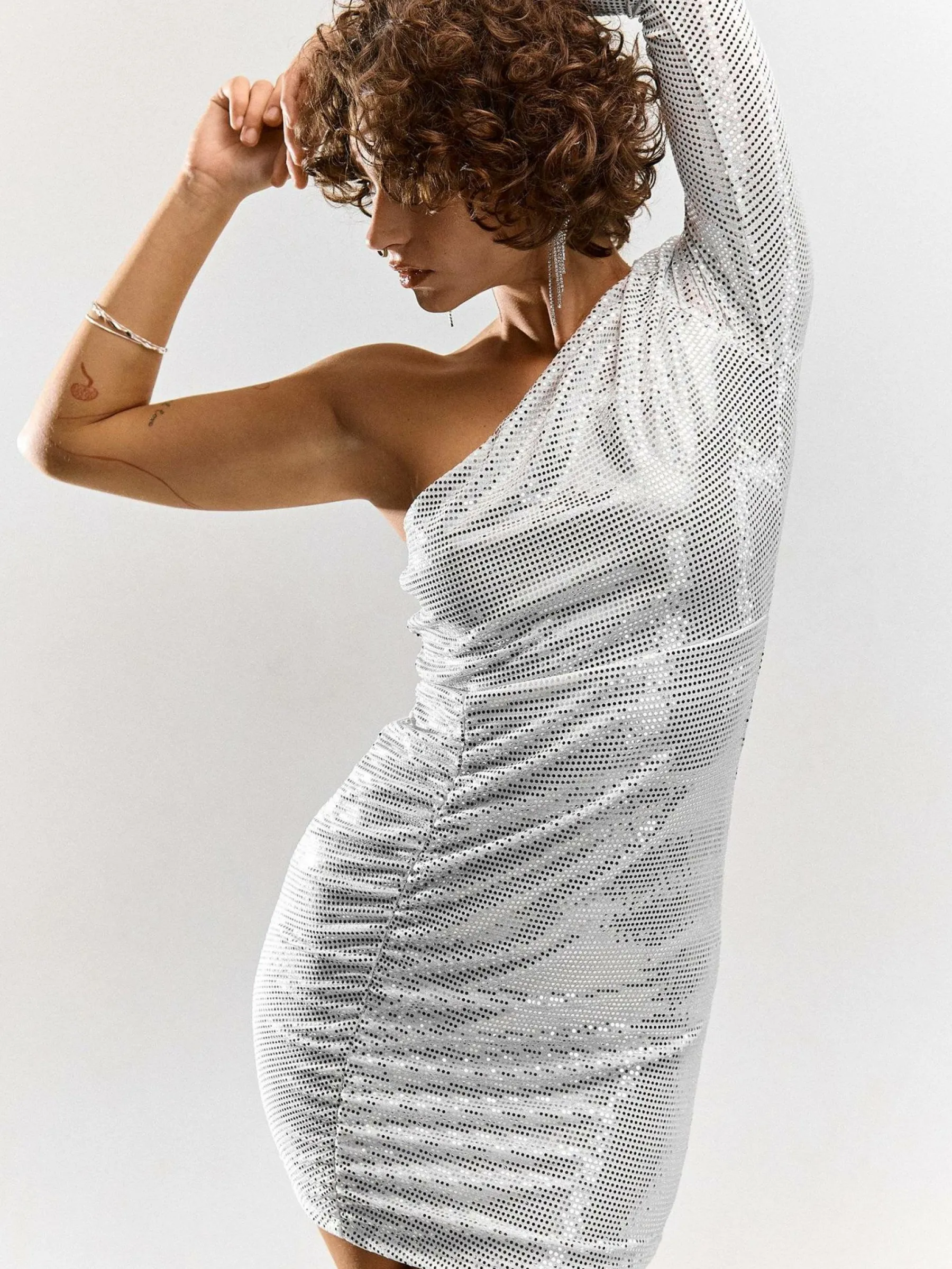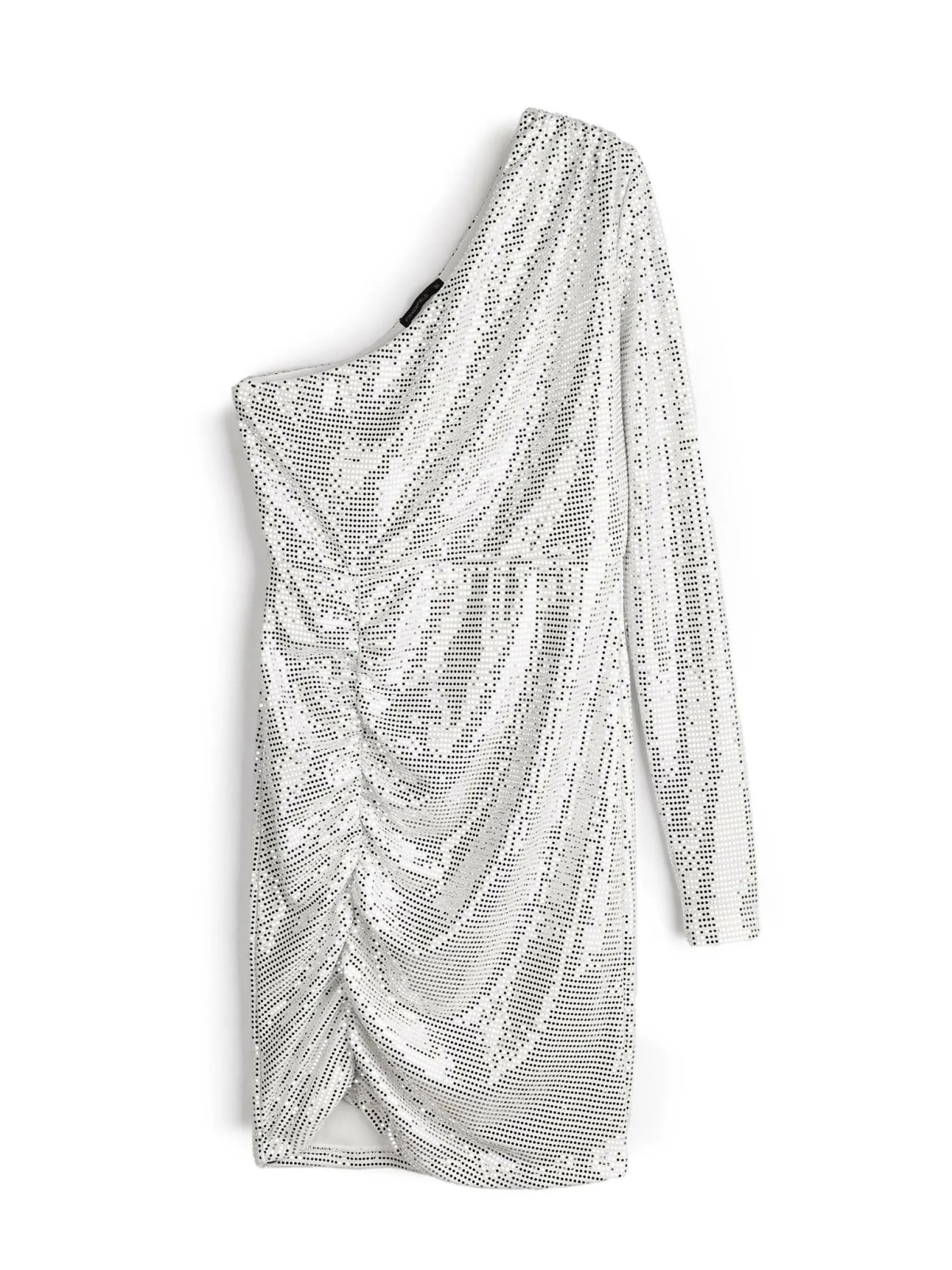 Kolor: białyKrój: asymetryczneTyp: sukienkaRekaw: długi rękaw, bez rękawówDługość: miniPattern style: pojedyncz…