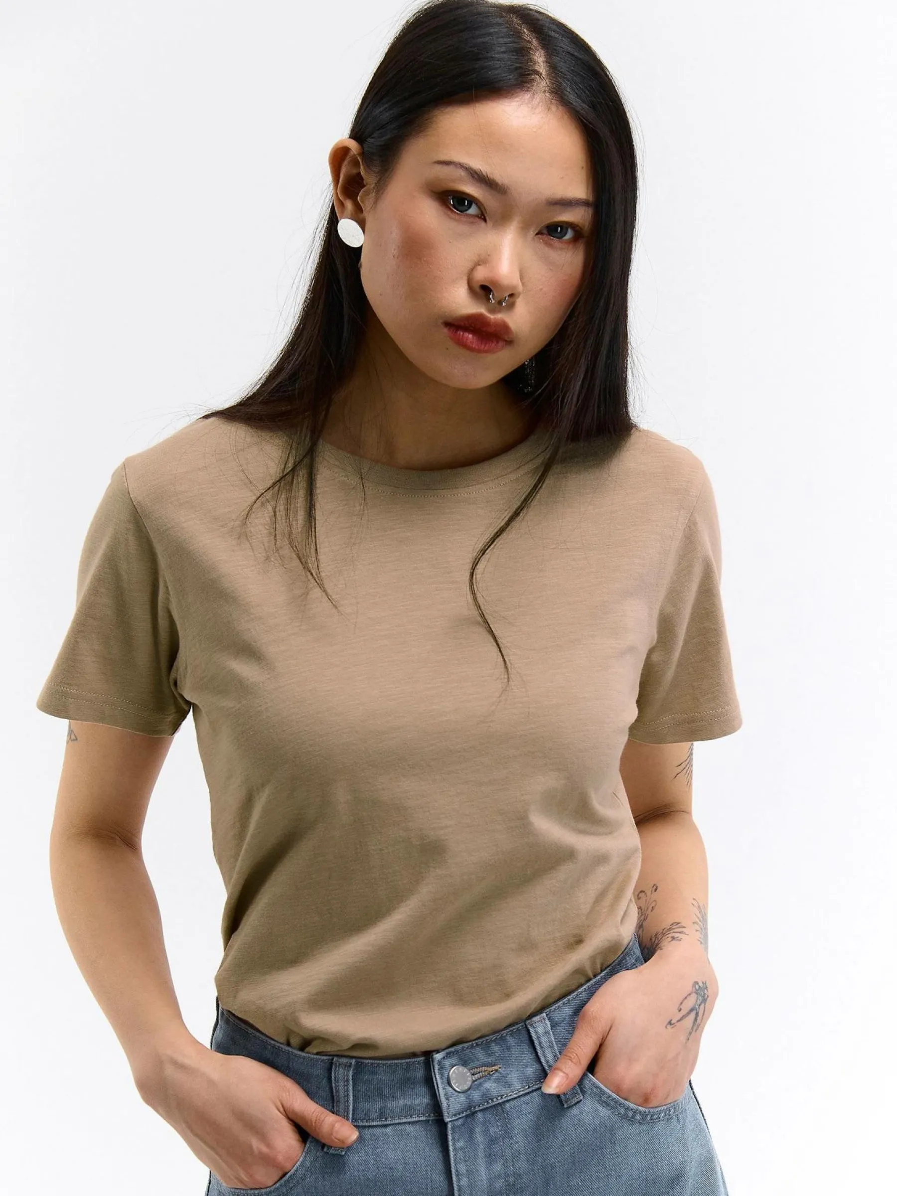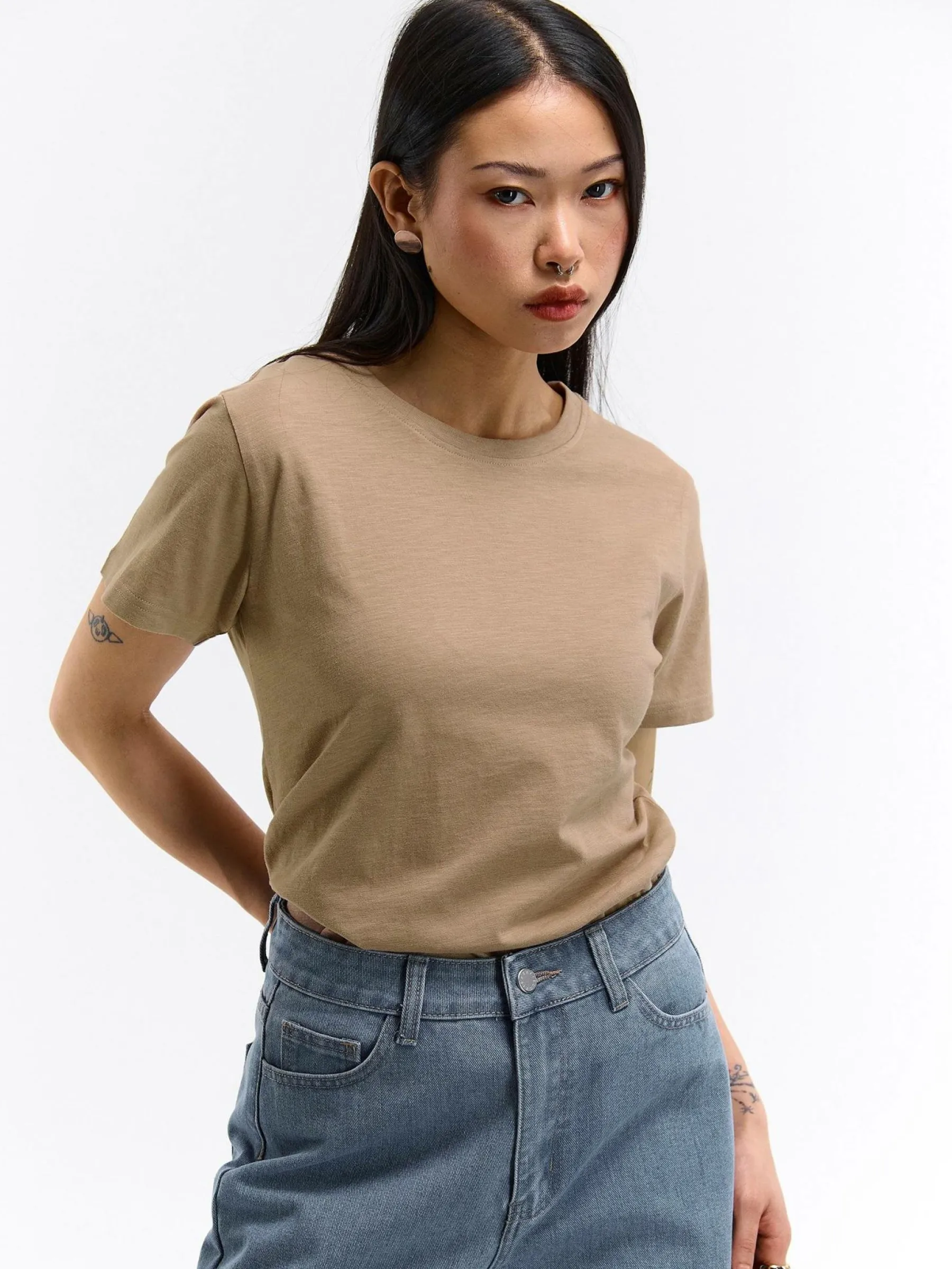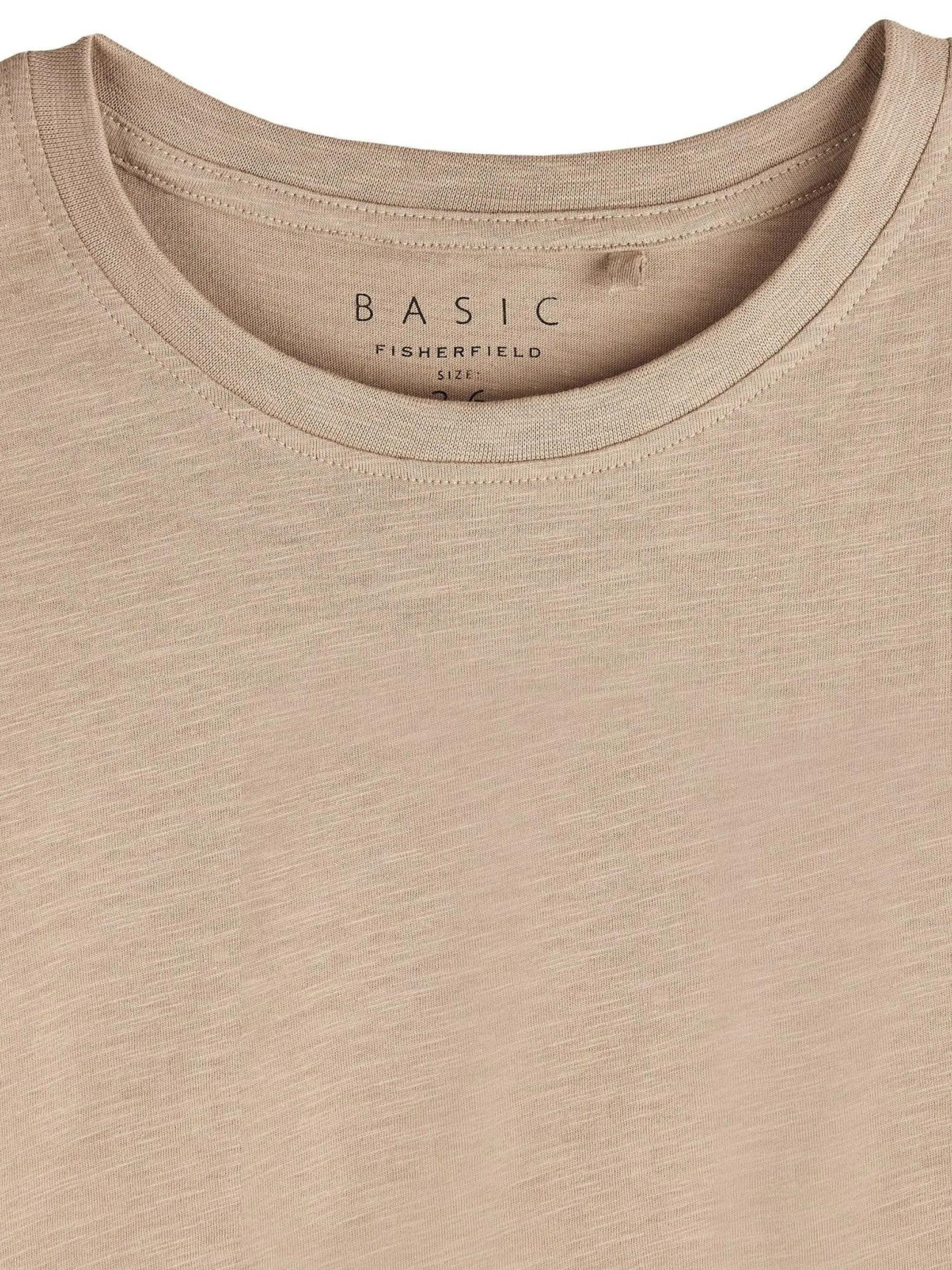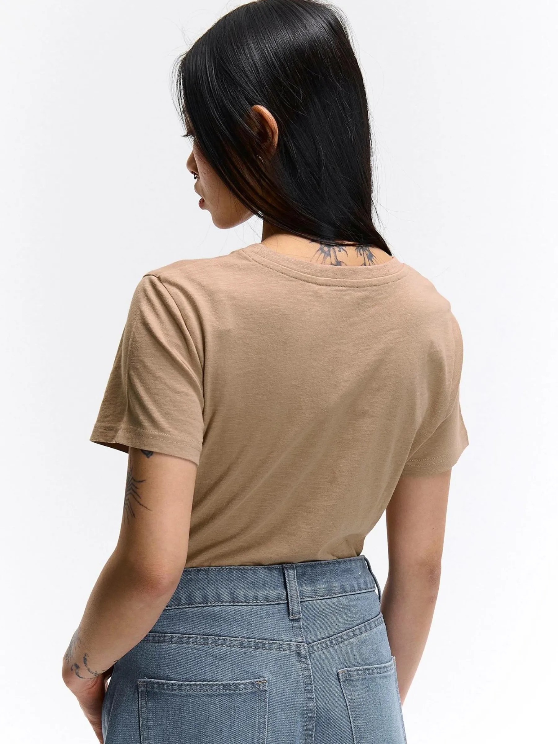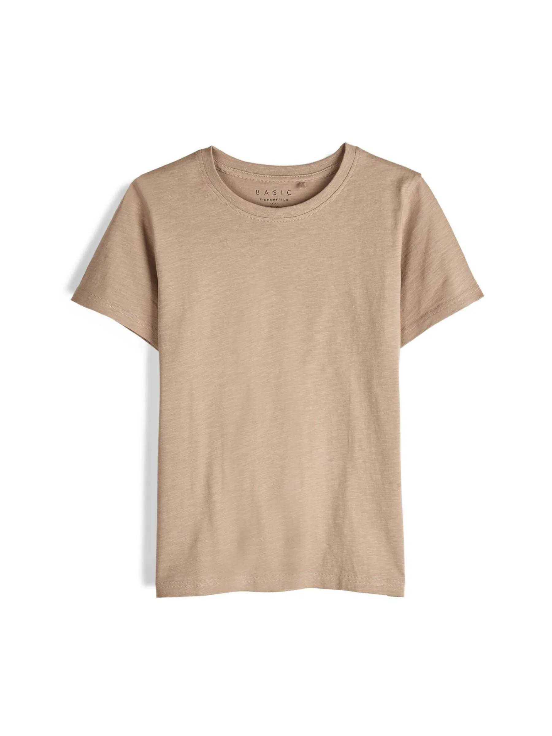 Kolor: beżowyKrój: regularTyp: koszulkaRekaw: krótki rękawDługość: krótkiPattern style: pojedynczy kolorDetal: n…