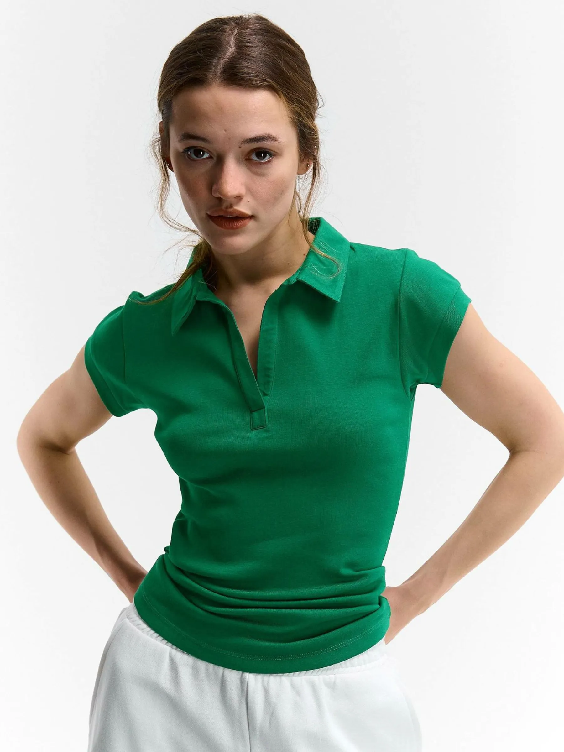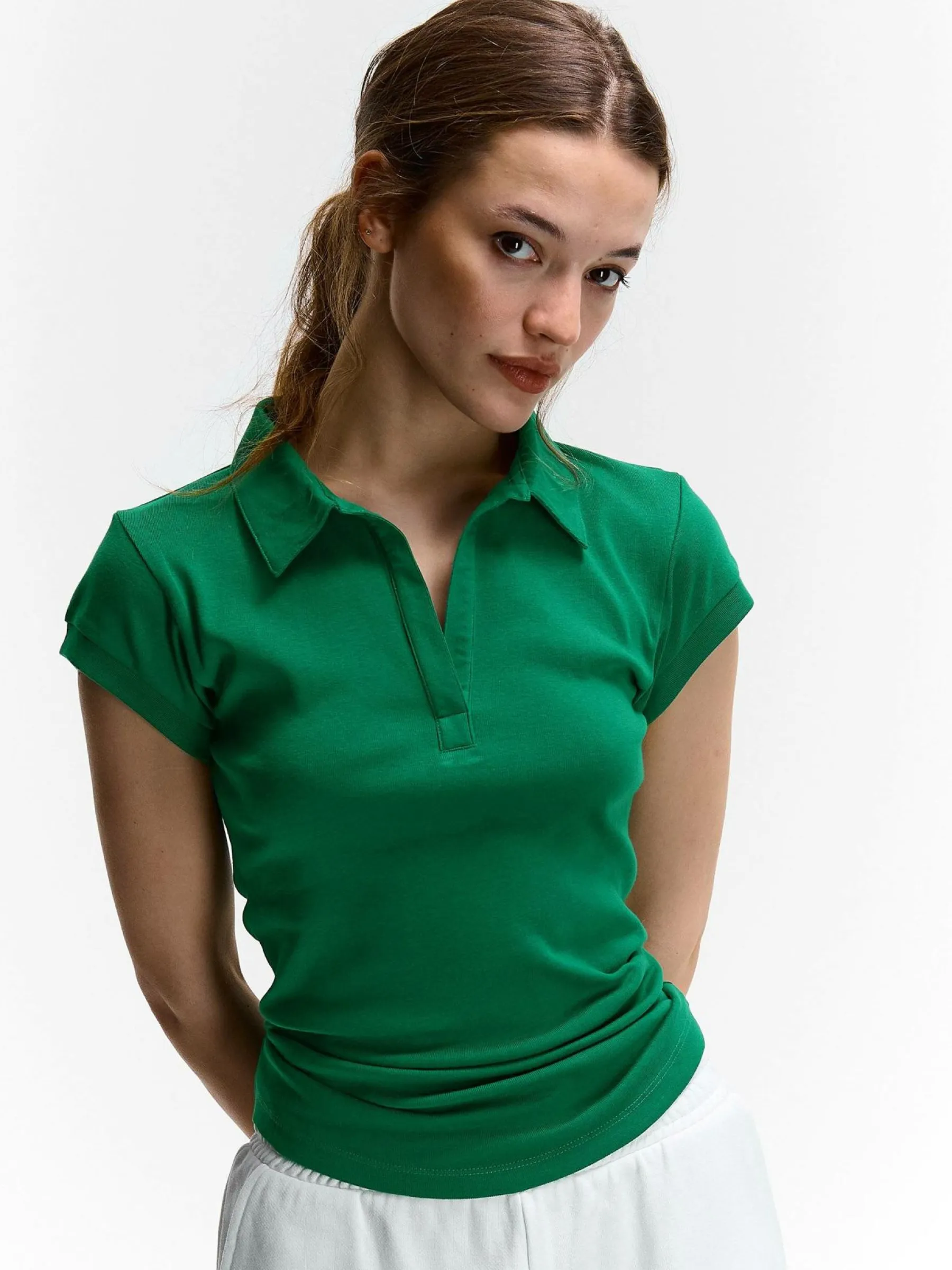 Kolor: zielonyKrój: poloTyp: koszulkaRekaw: krótki rękawDługość: krótkiPattern style: pojedynczy kolorDetal: nad …