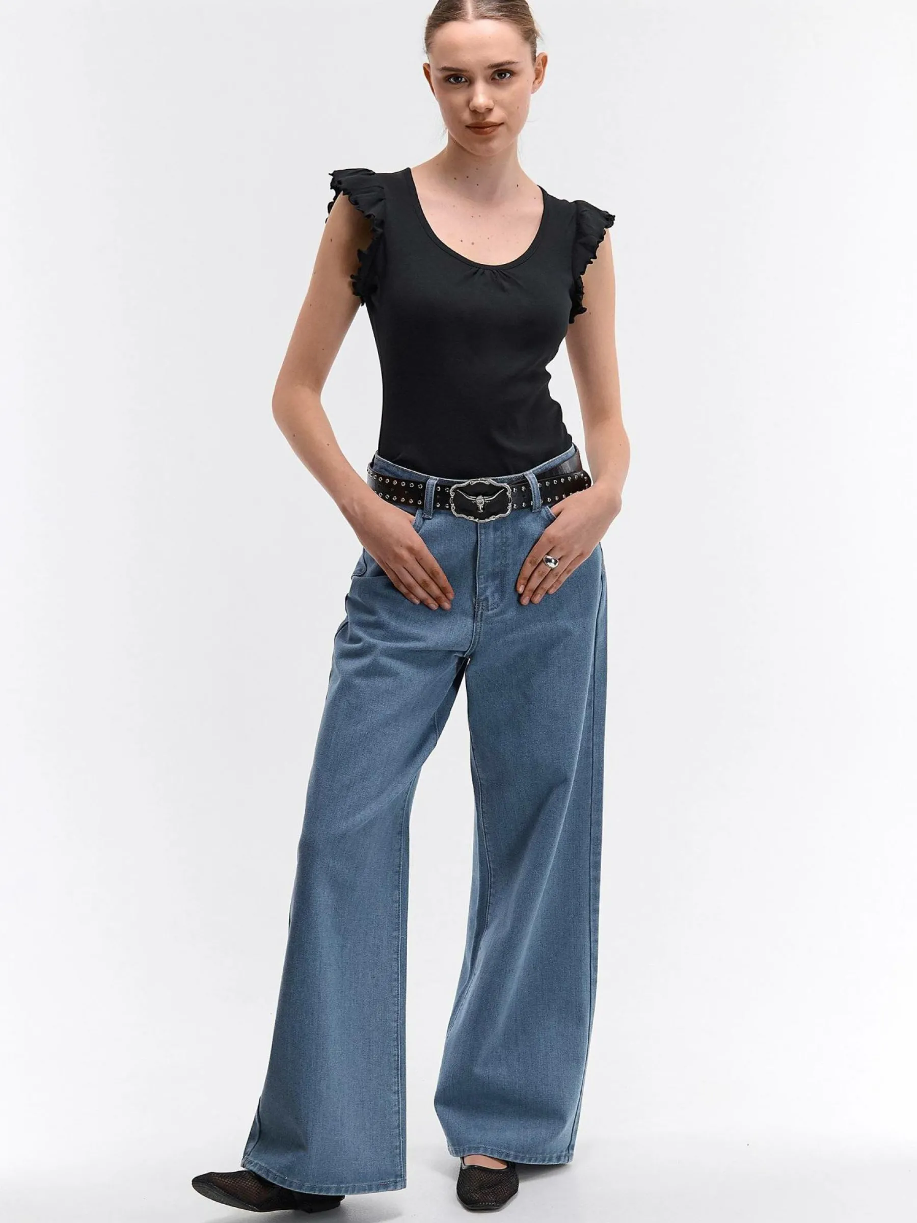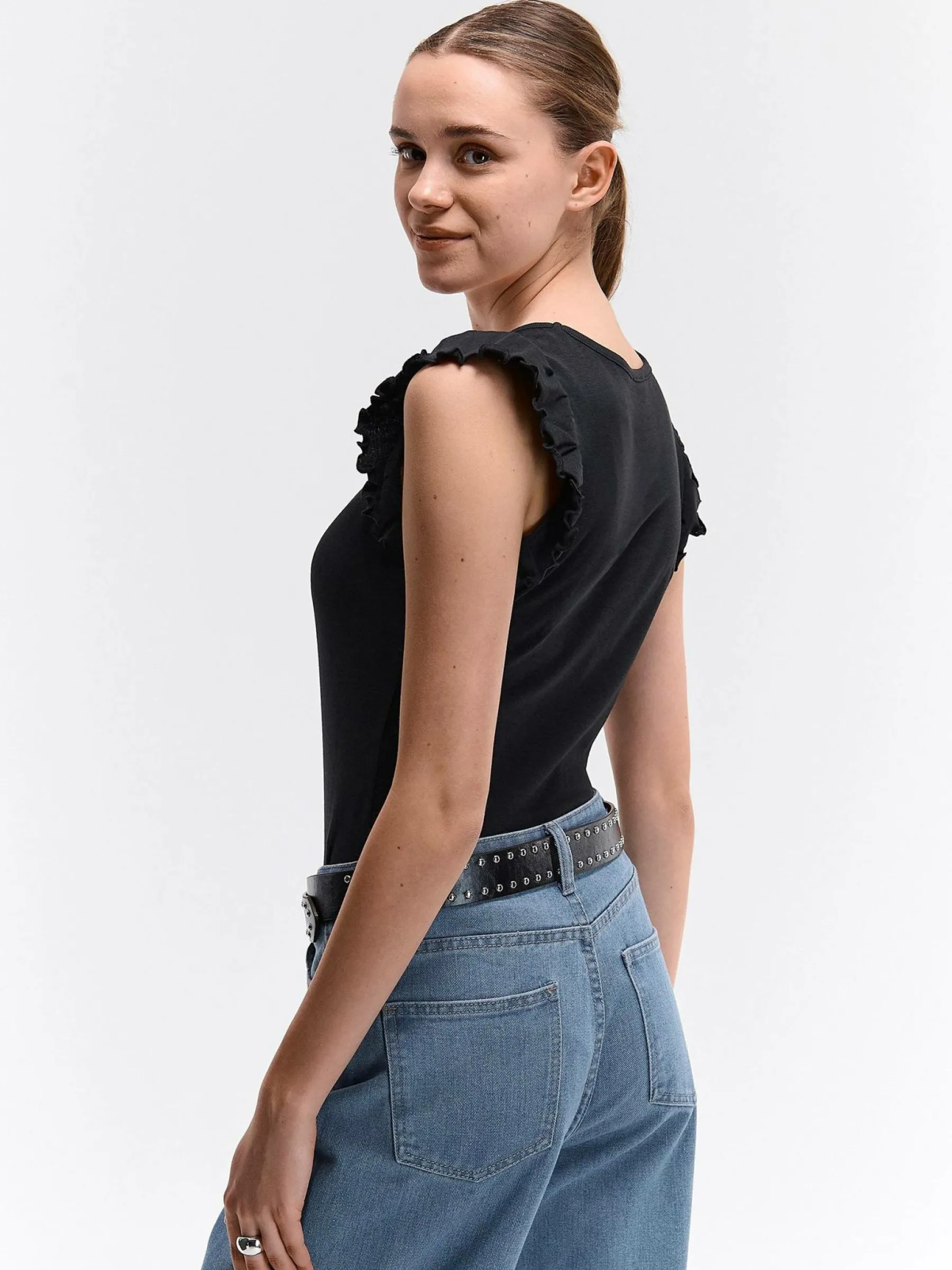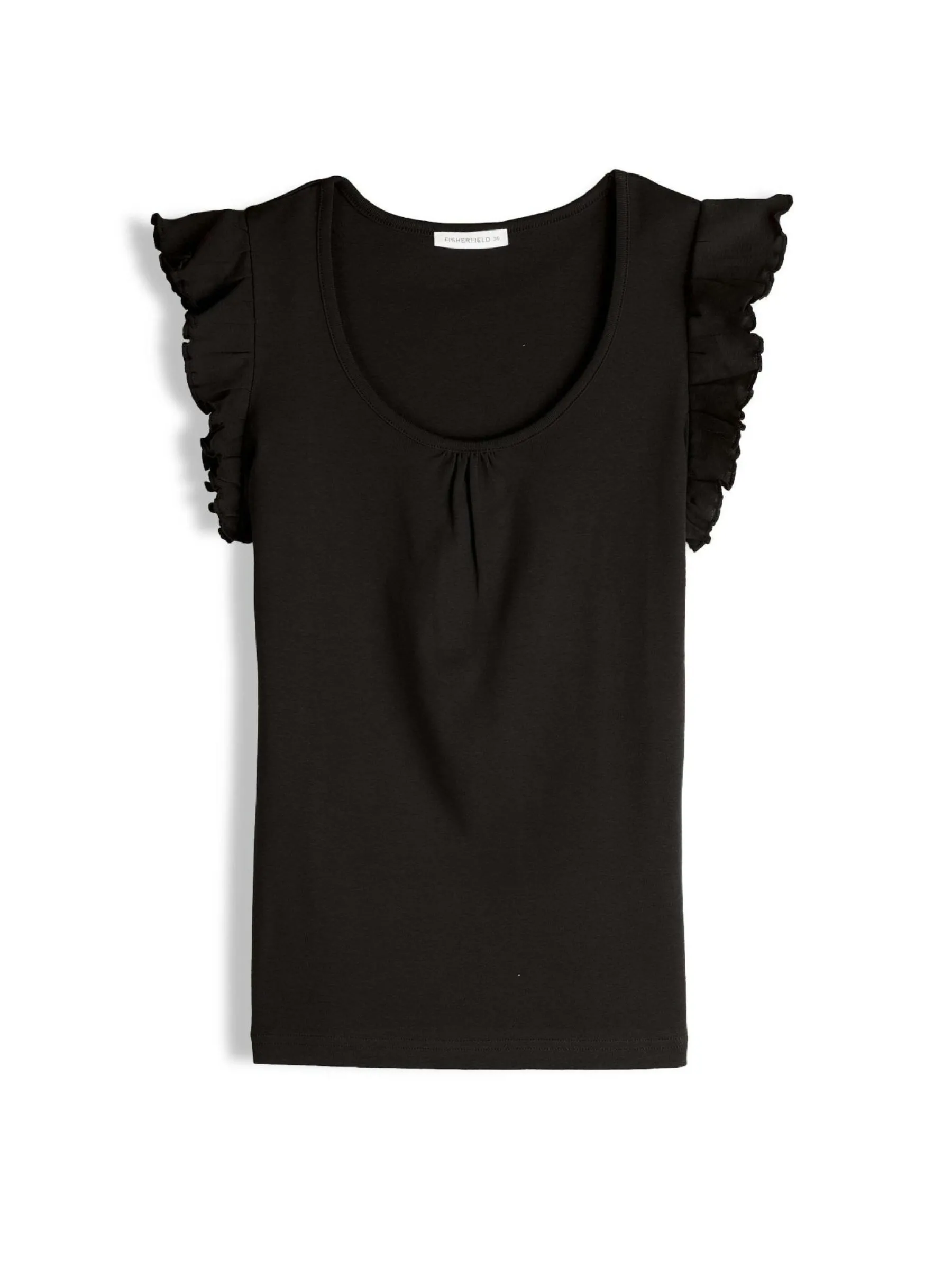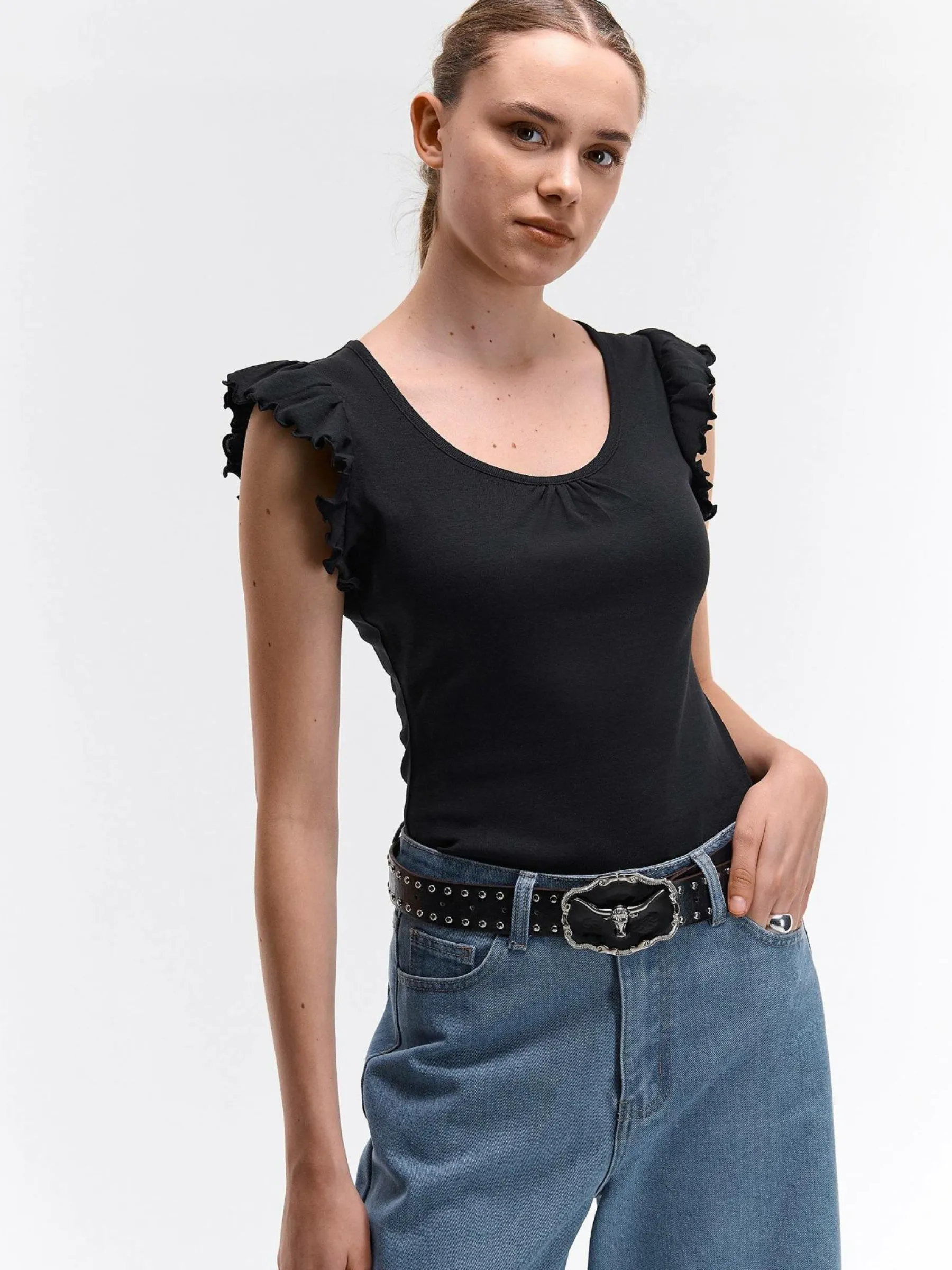 Kolor: czarnyKrój: z falbanąTyp: koszulkaRekaw: krótki rękawDługość: krótkiPattern style: pojedynczy kolorDetal:…