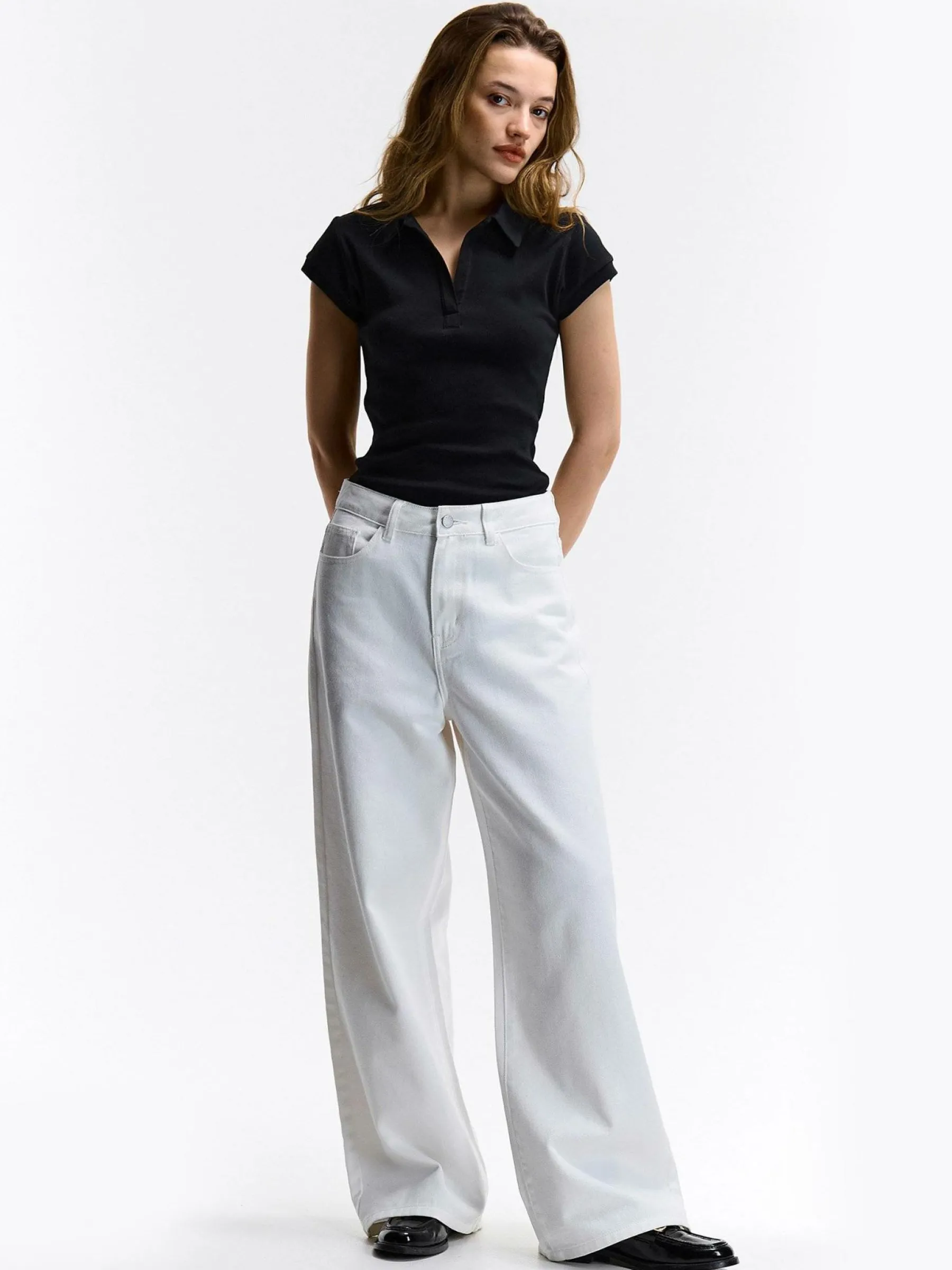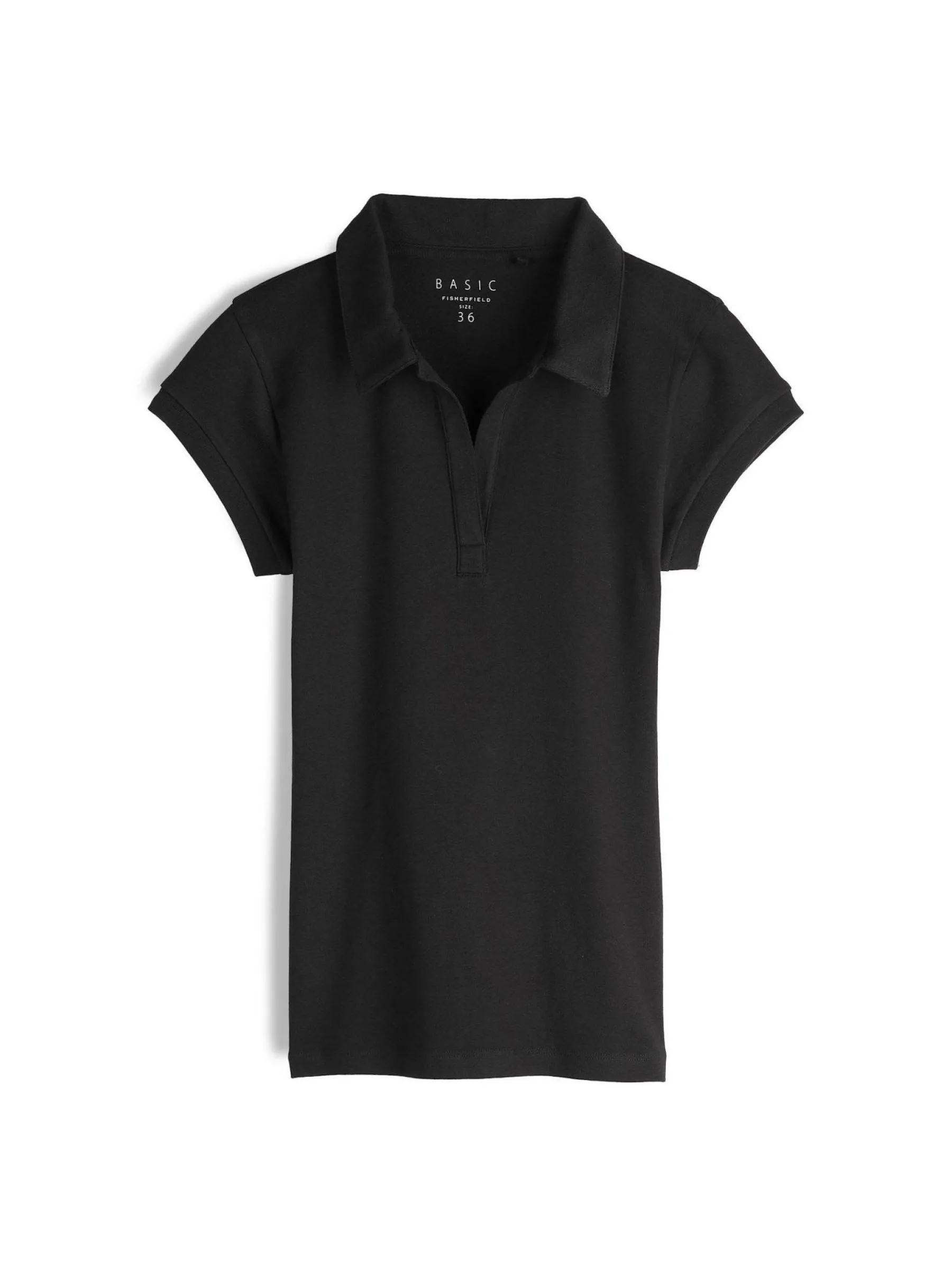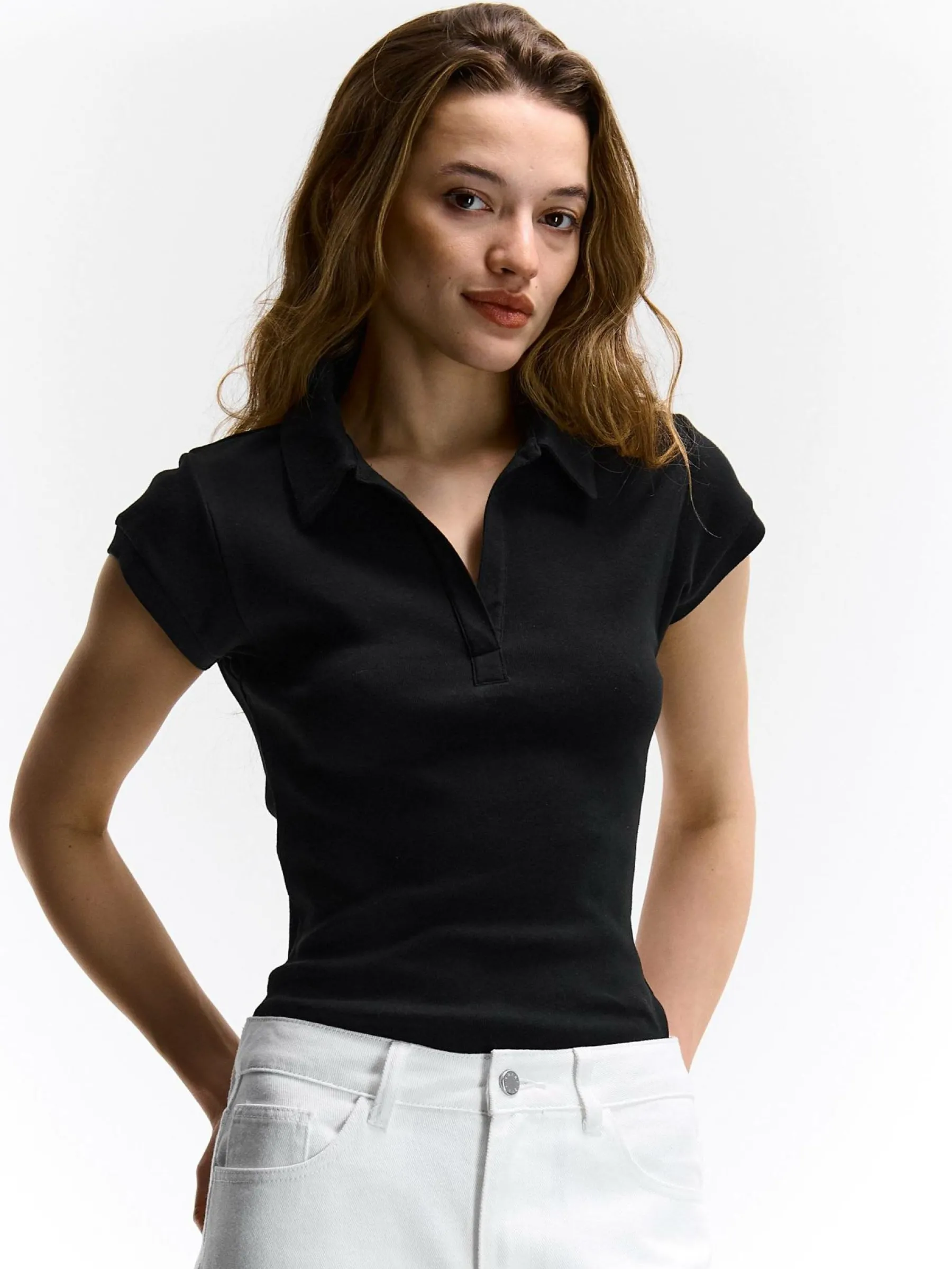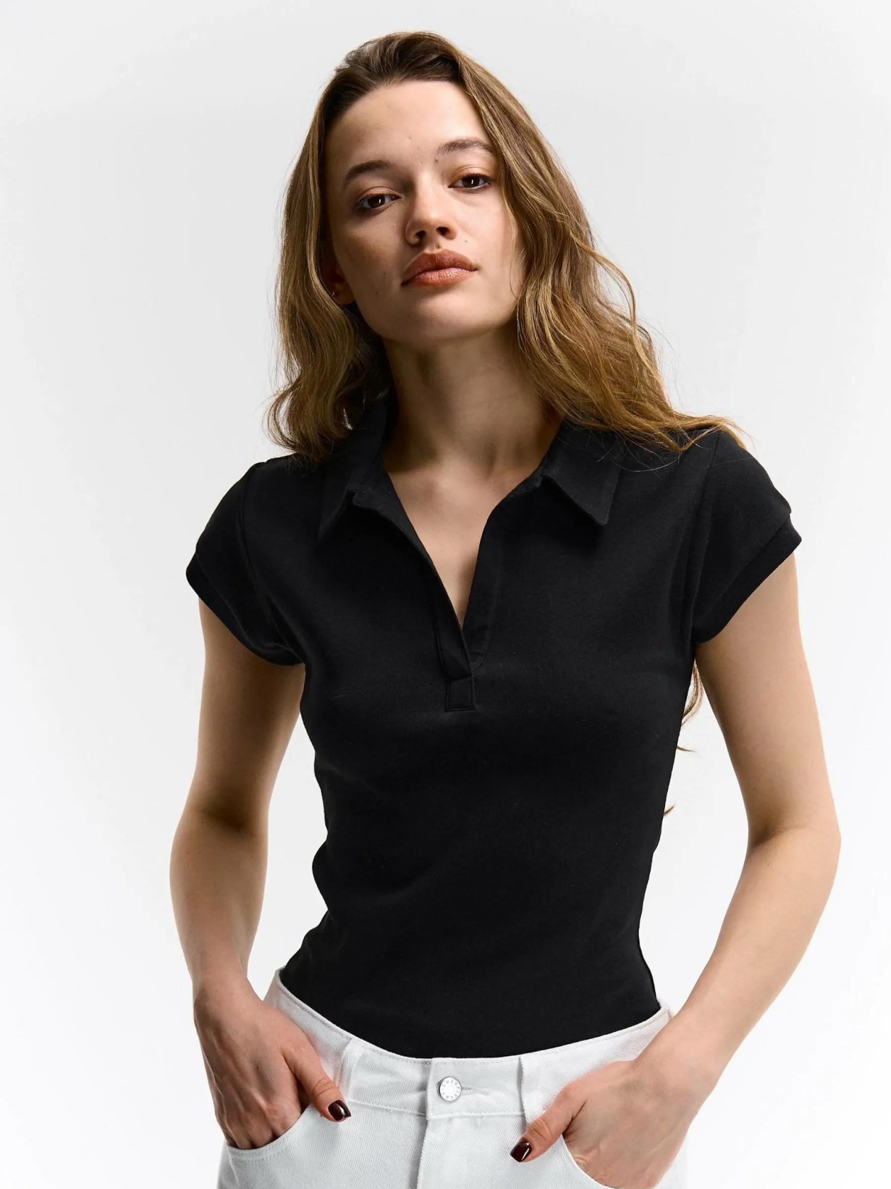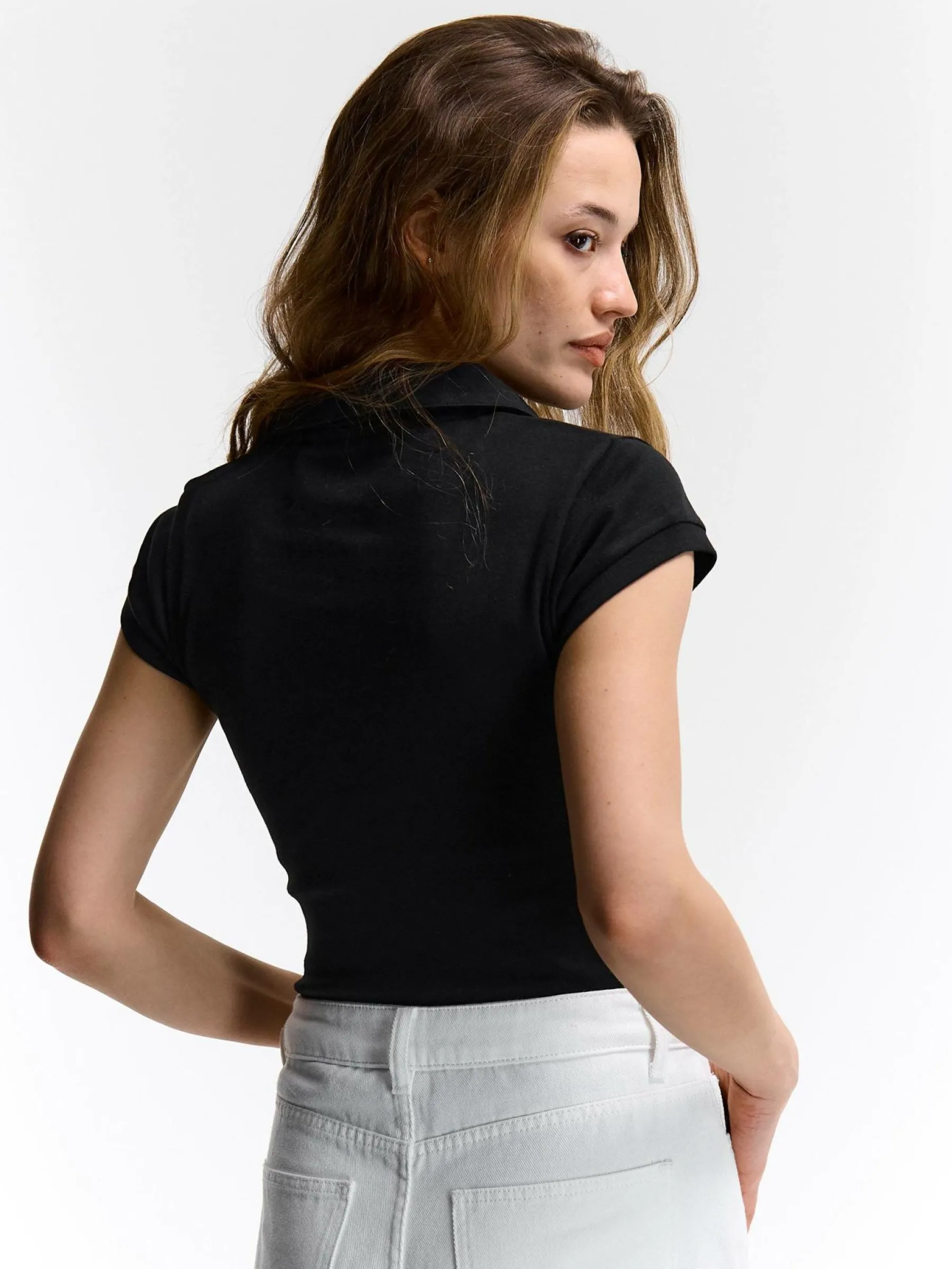 Kolor: czarnyKrój: poloTyp: koszulkaRekaw: krótki rękawDługość: krótkiPattern style: pojedynczy kolorDetal: nad g…