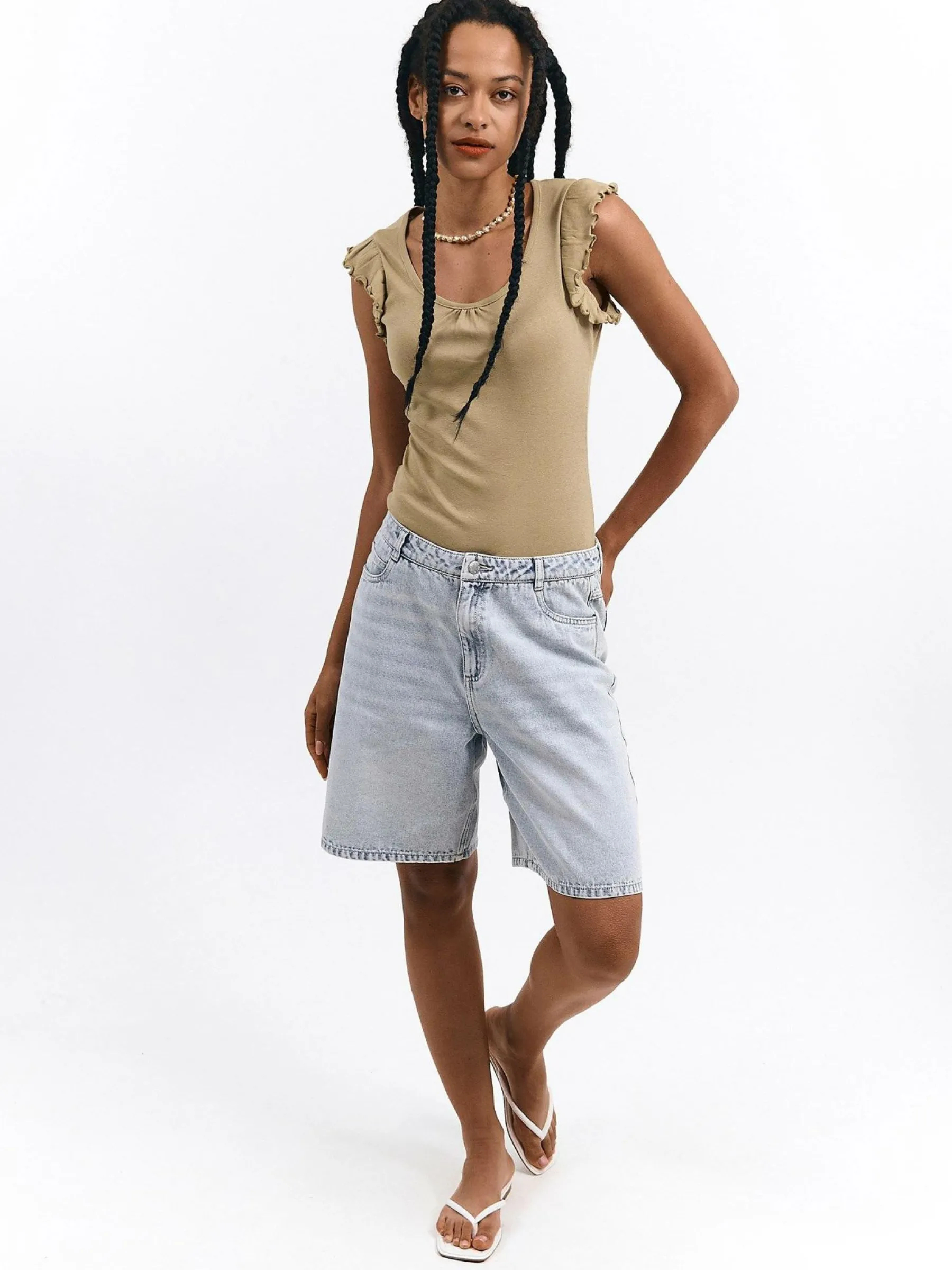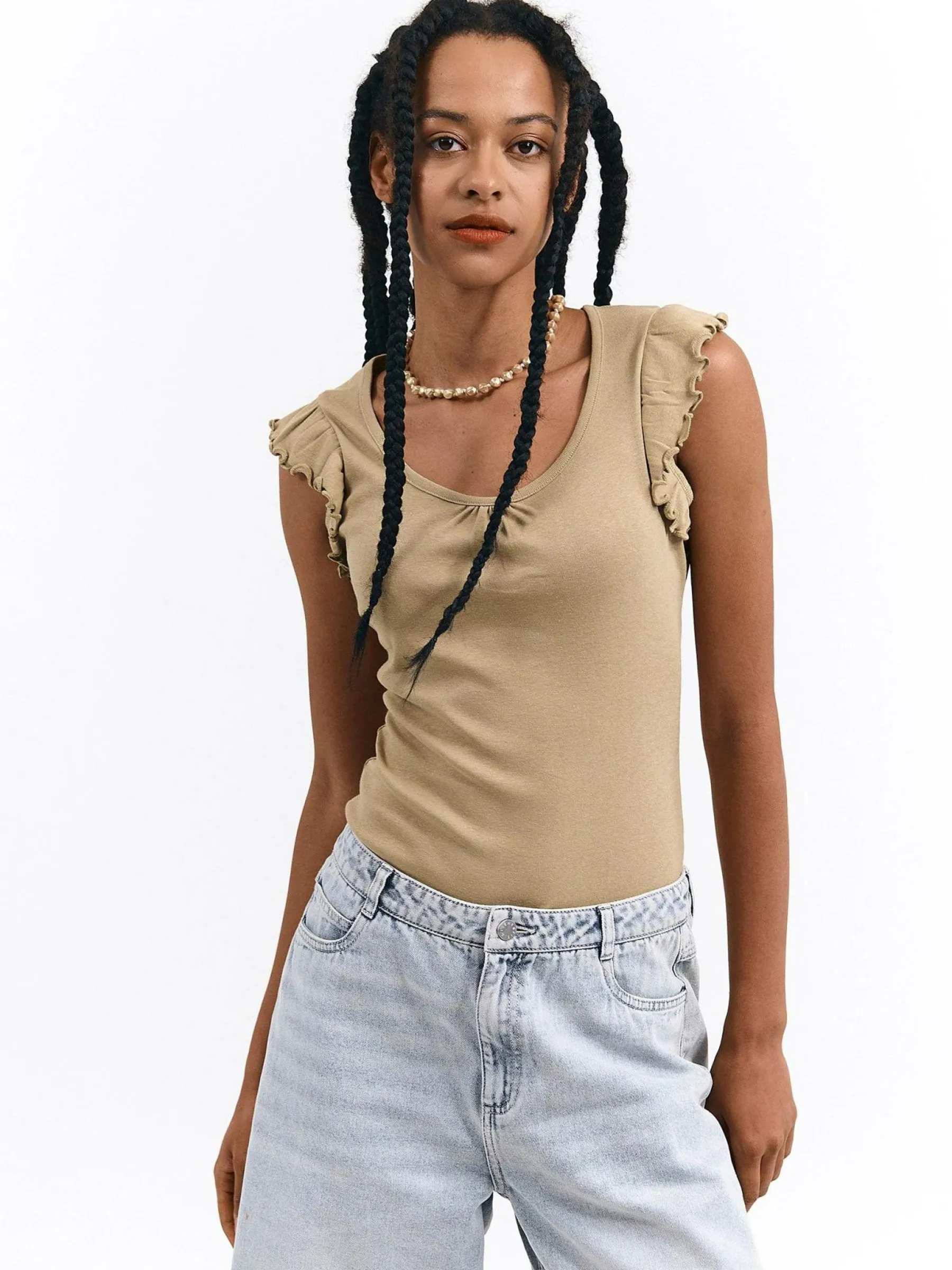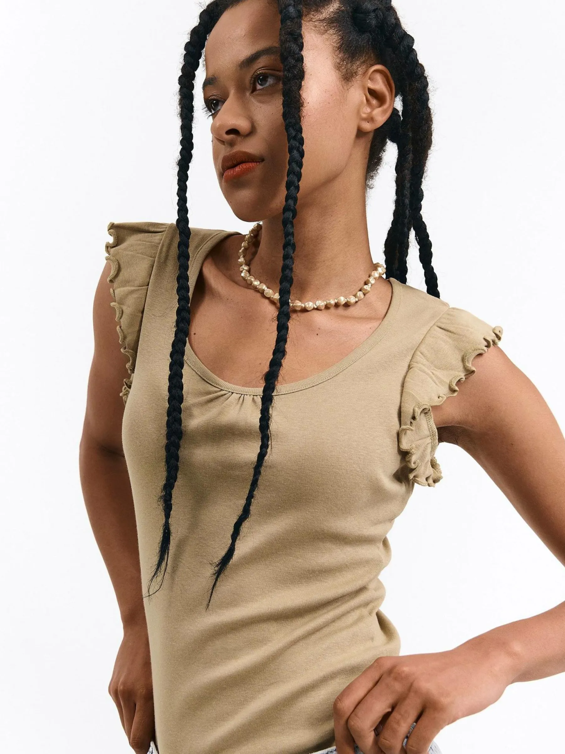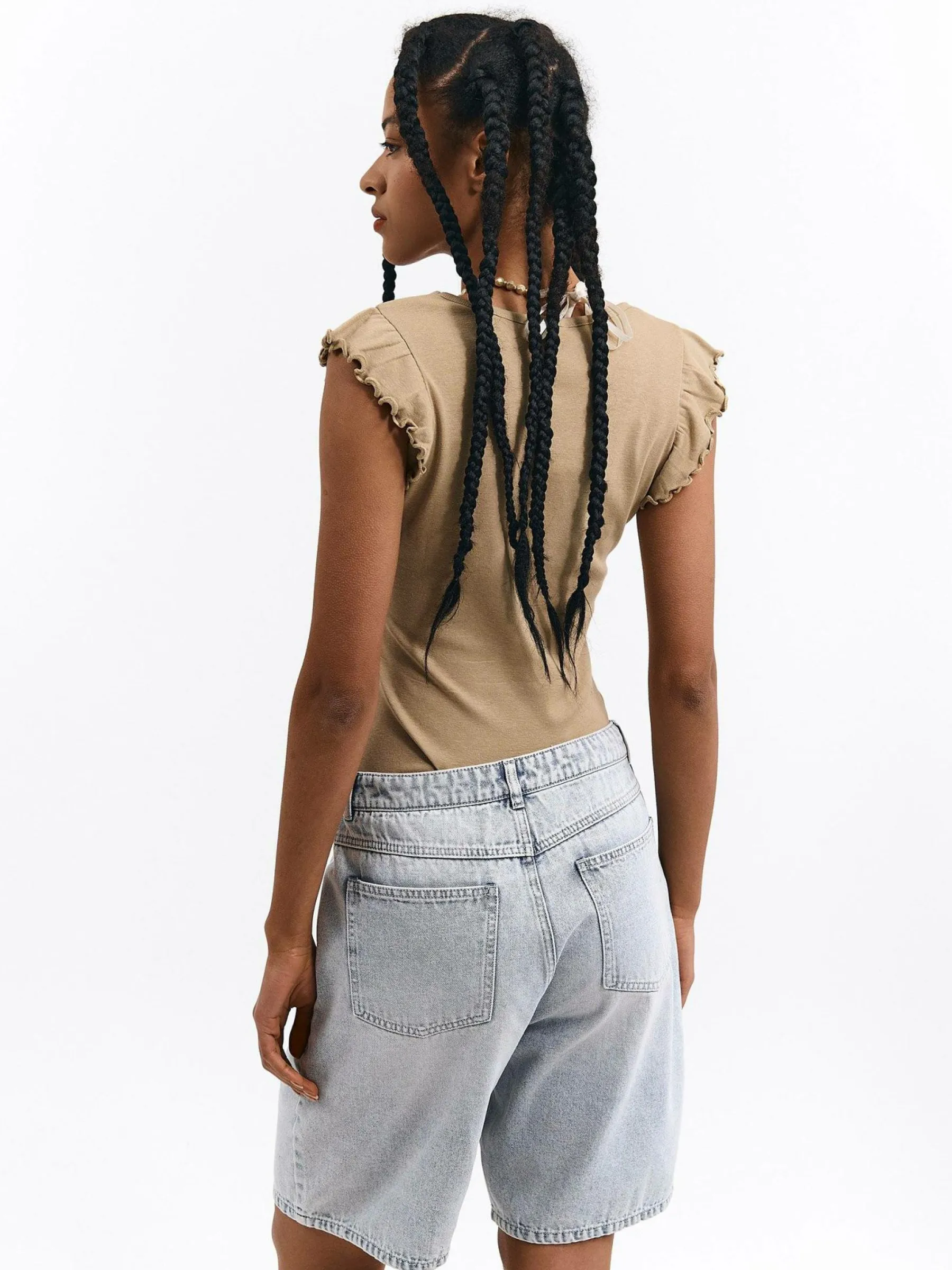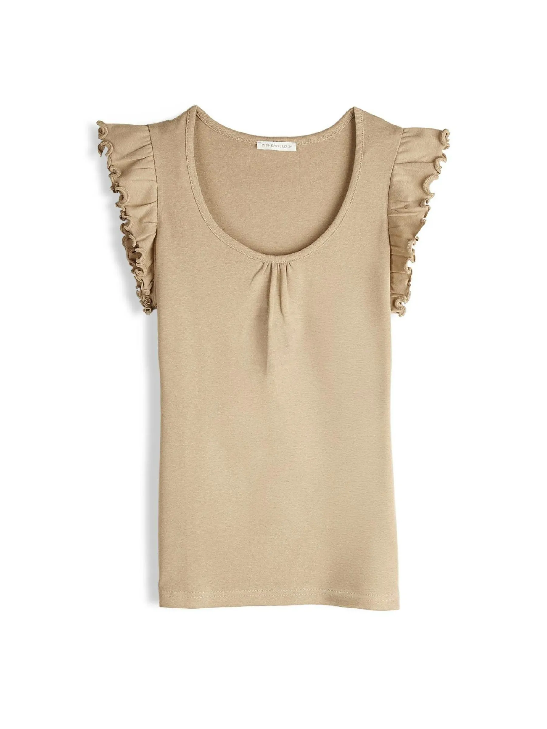 Kolor: beżowyKrój: z falbanąTyp: koszulkaRekaw: krótki rękawDługość: krótkiPattern style: pojedynczy kolorDetal…
