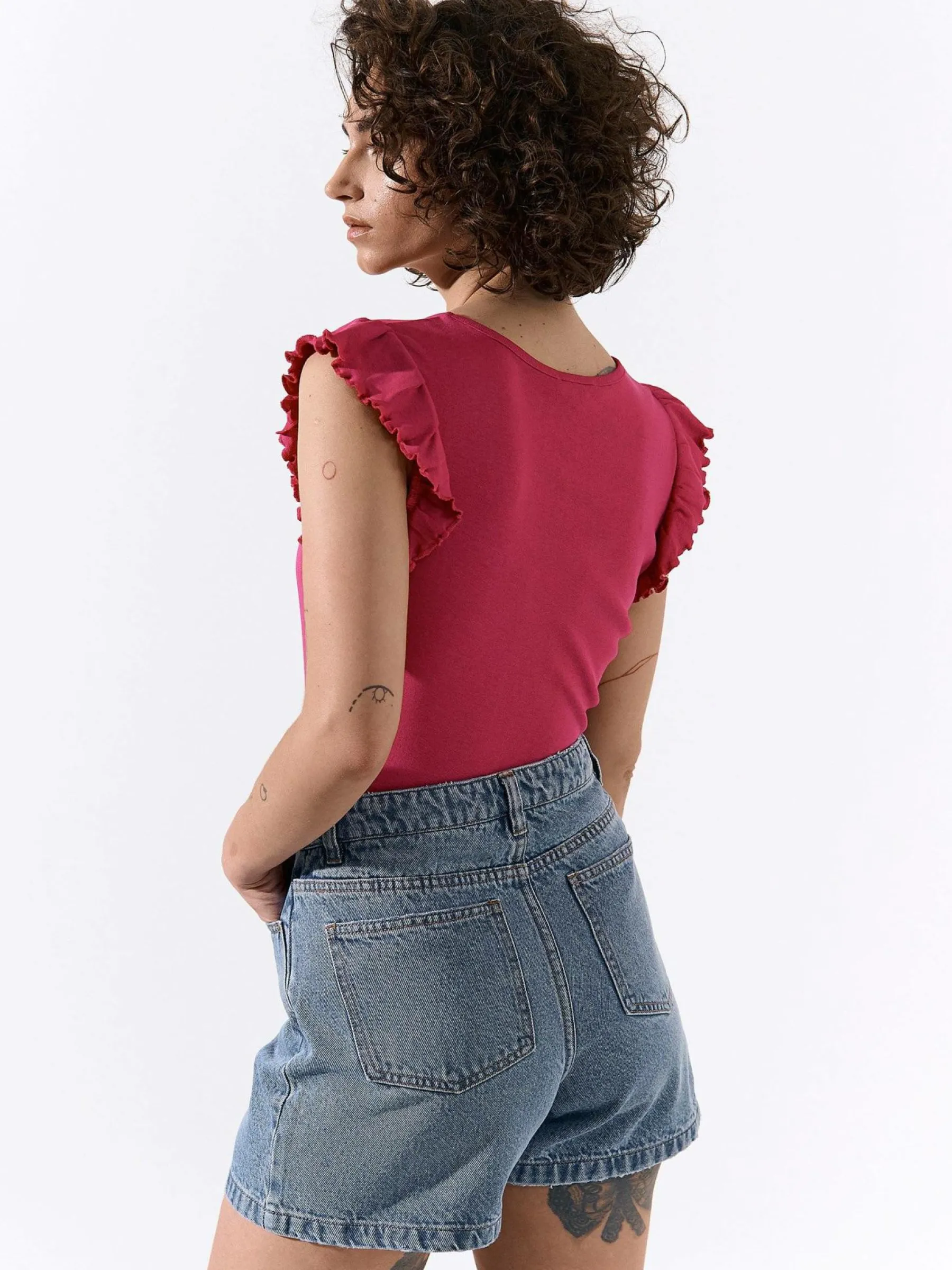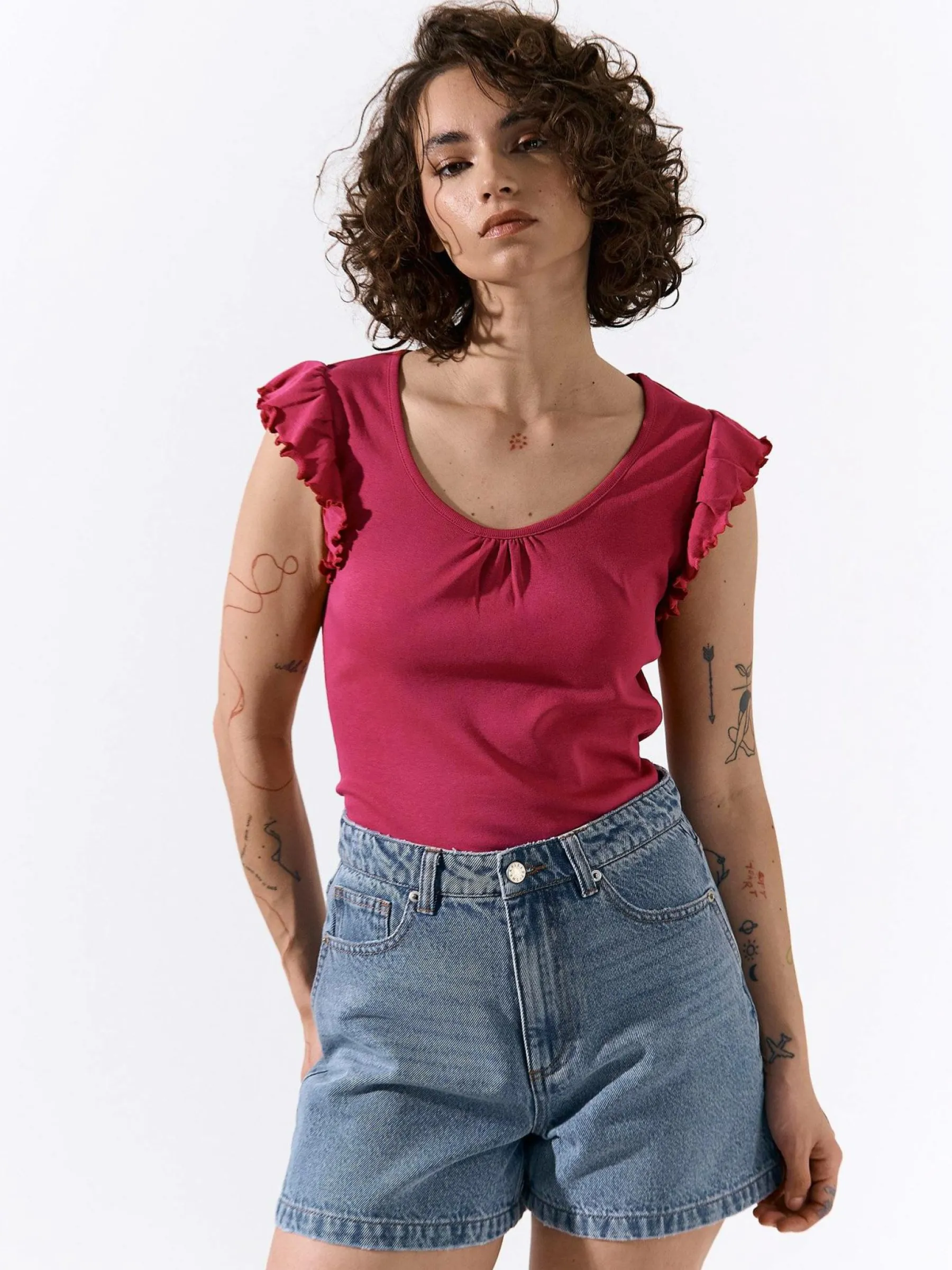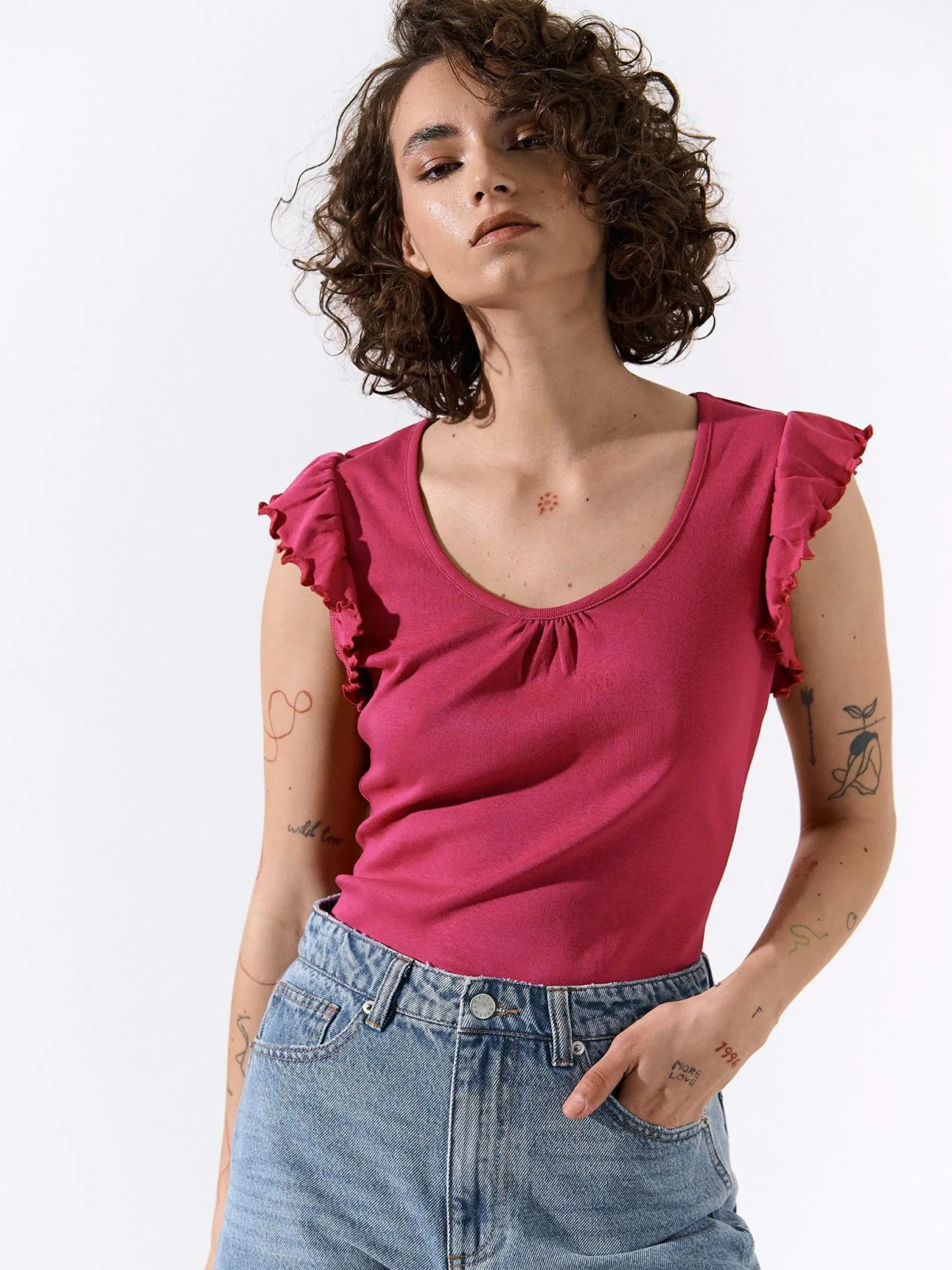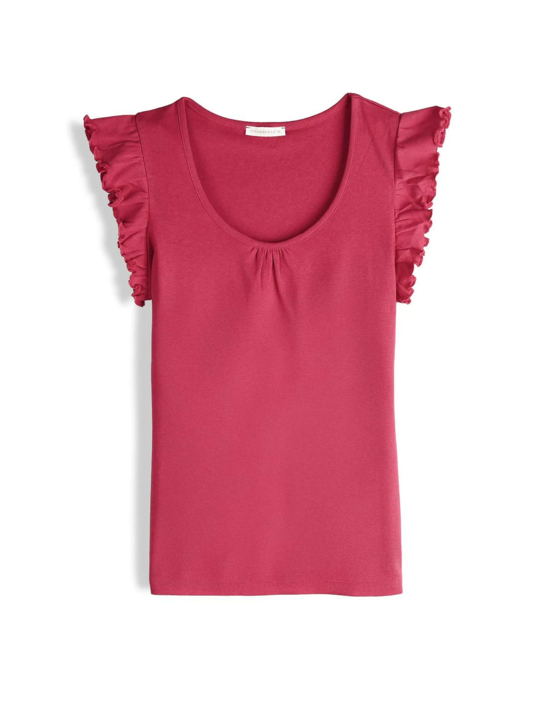 Kolor: różowyKrój: z falbanąTyp: koszulkaRekaw: krótki rękawDługość: krótkiPattern style: pojedynczy kolorDeta…