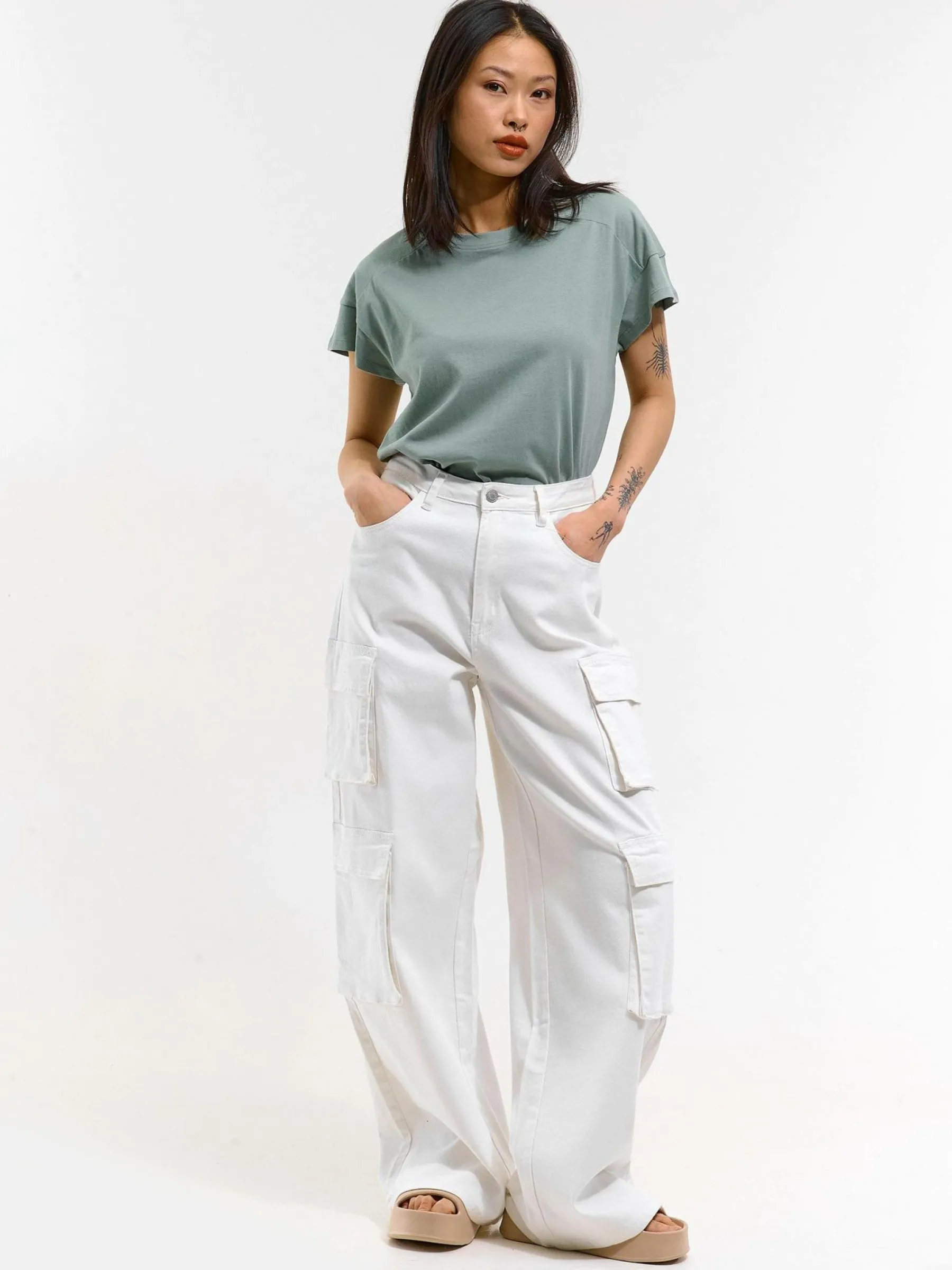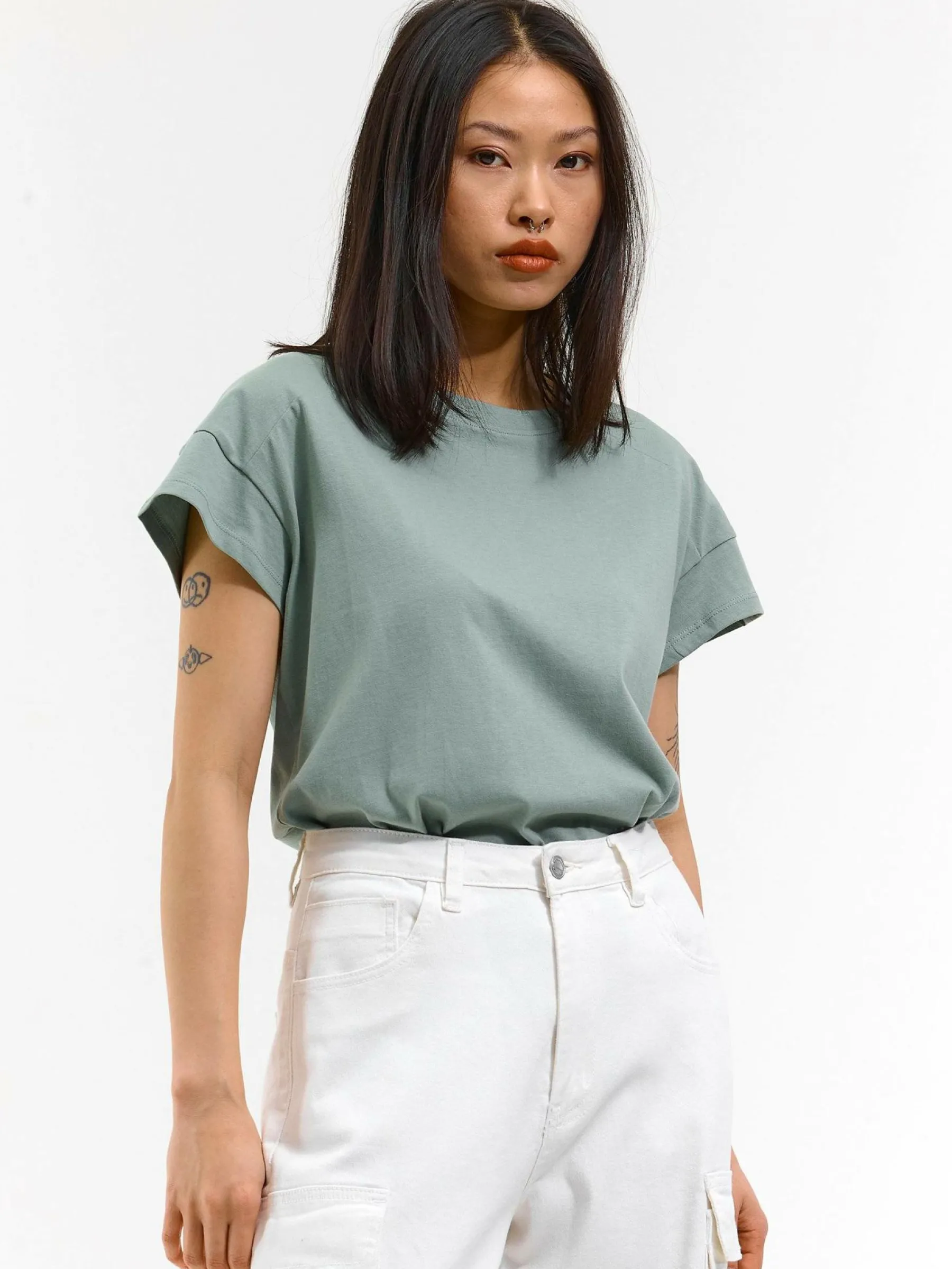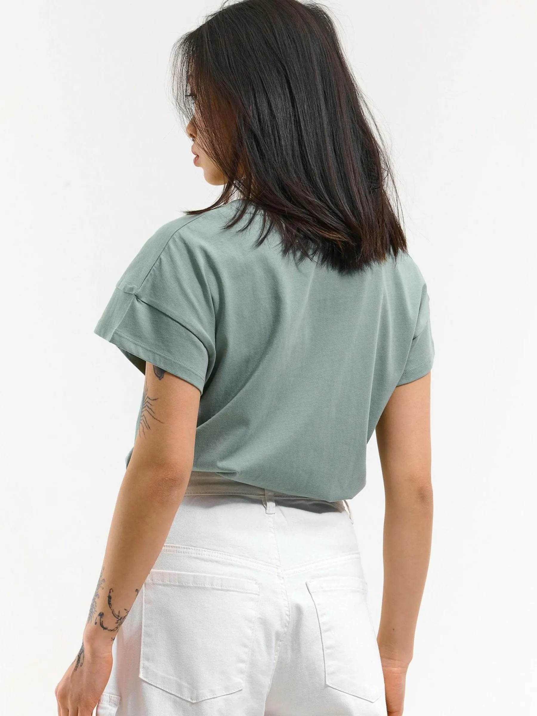 Kolor: zielonyKrój: regularTyp: koszulkaRekaw: krótki rękawDługość: krótkiPattern style: pojedynczy kolorDetal: n…