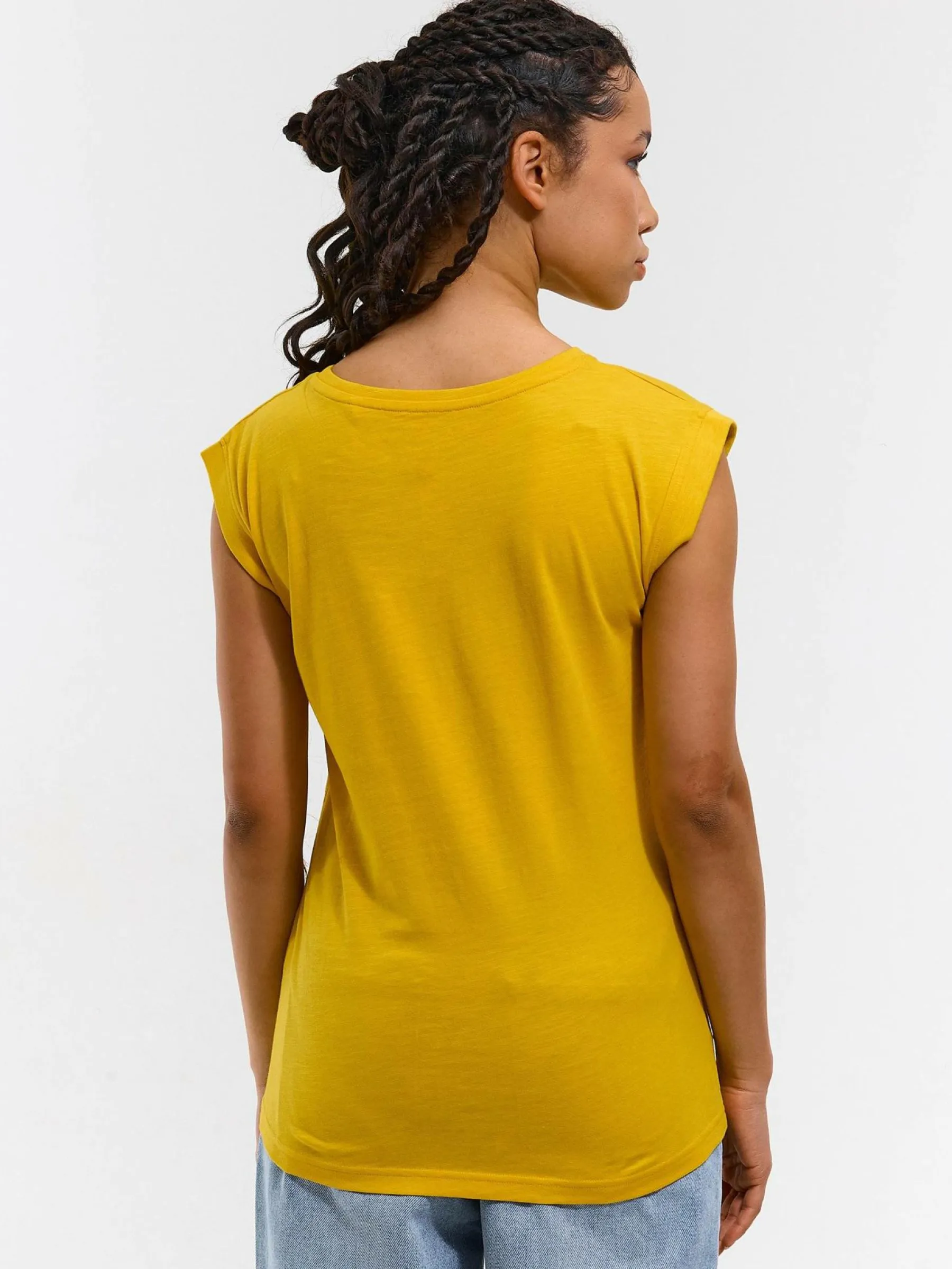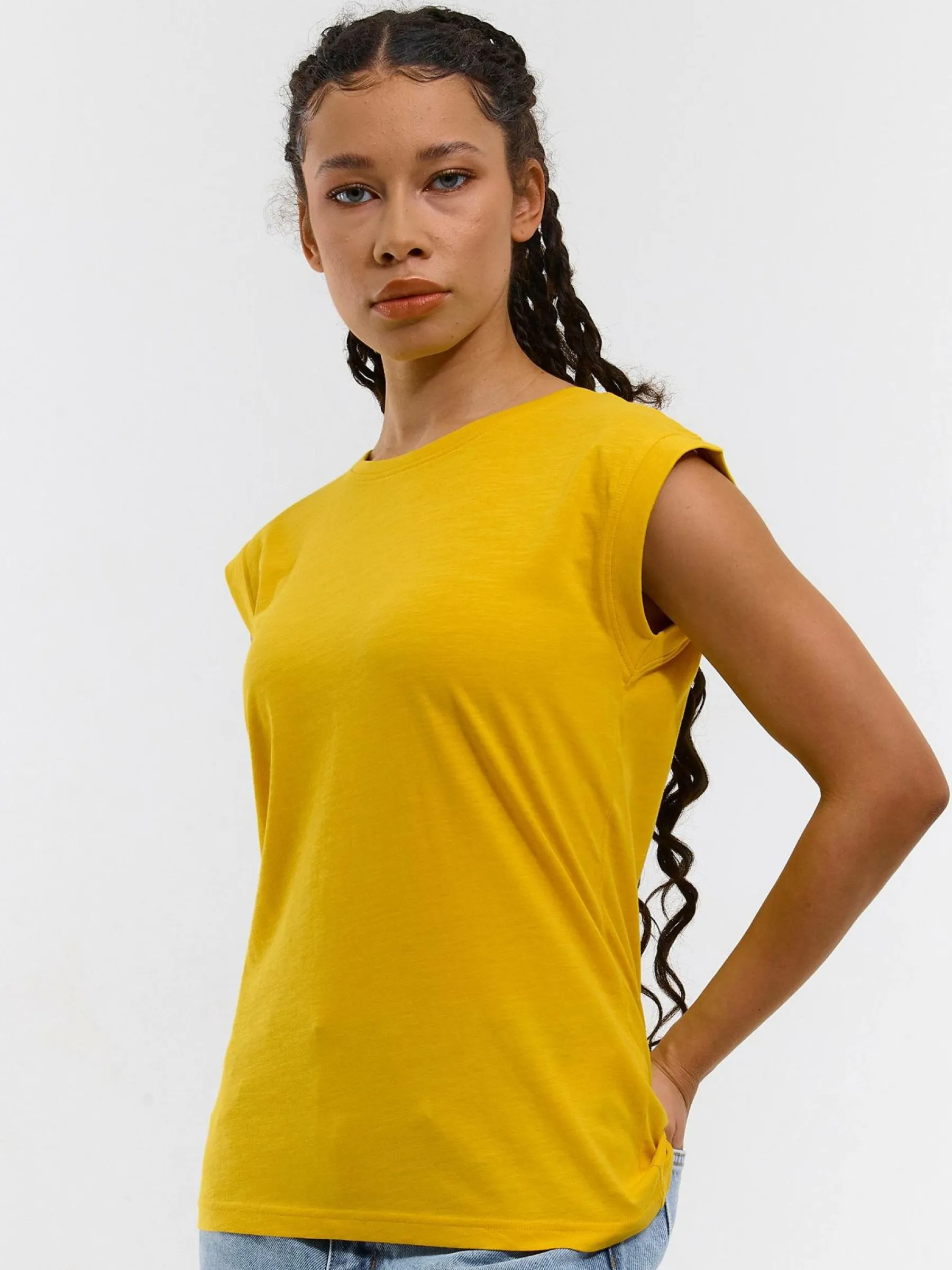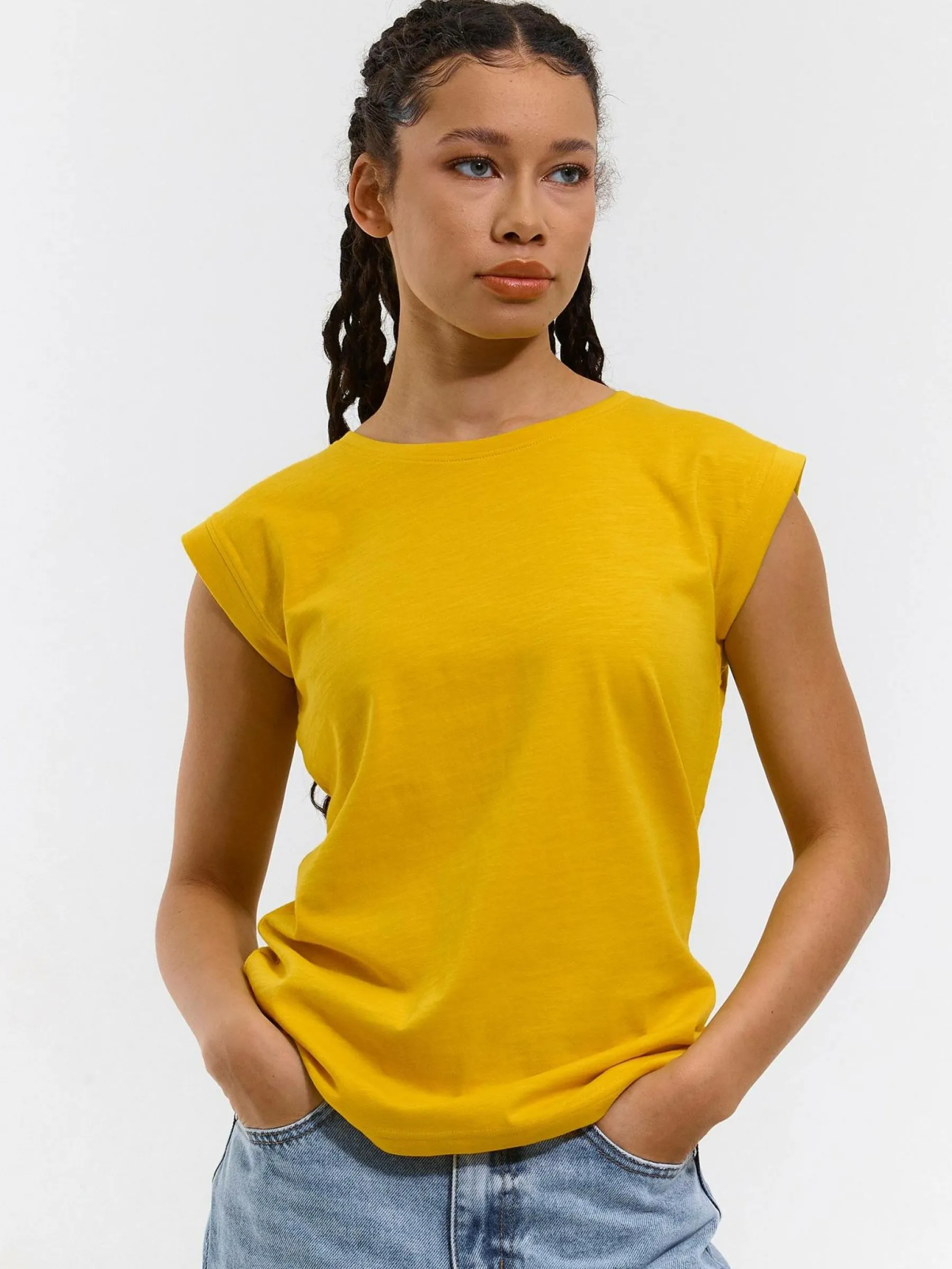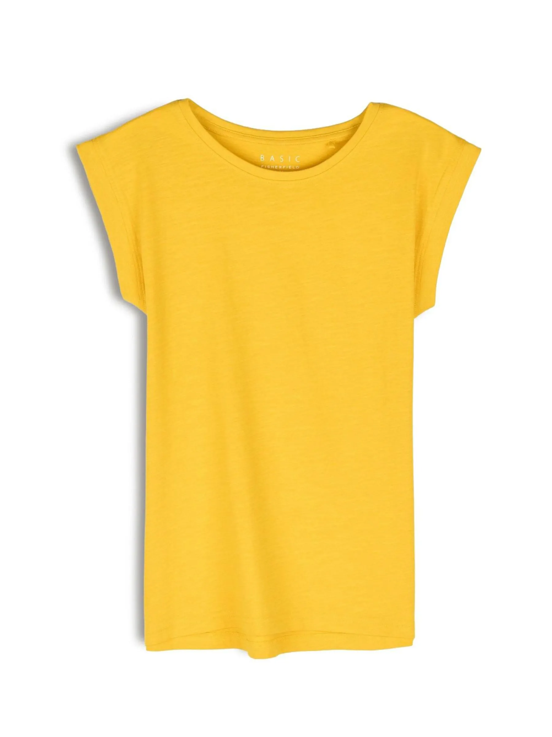 Kolor: żółtyKrój: podstawowyTyp: koszulkaRekaw: krótki rękawDługość: krótkiPattern style: pojedynczy kolorDeta…
