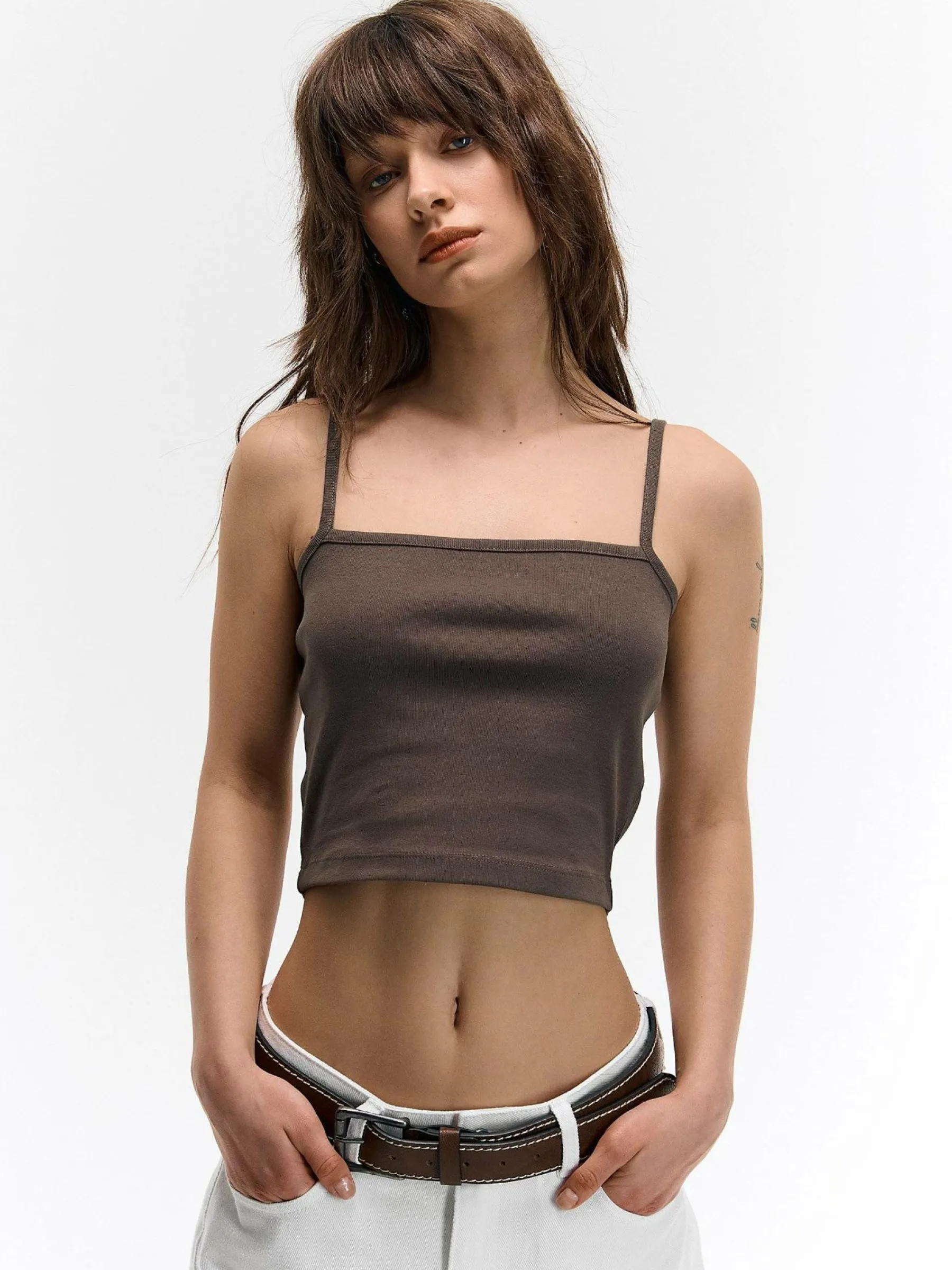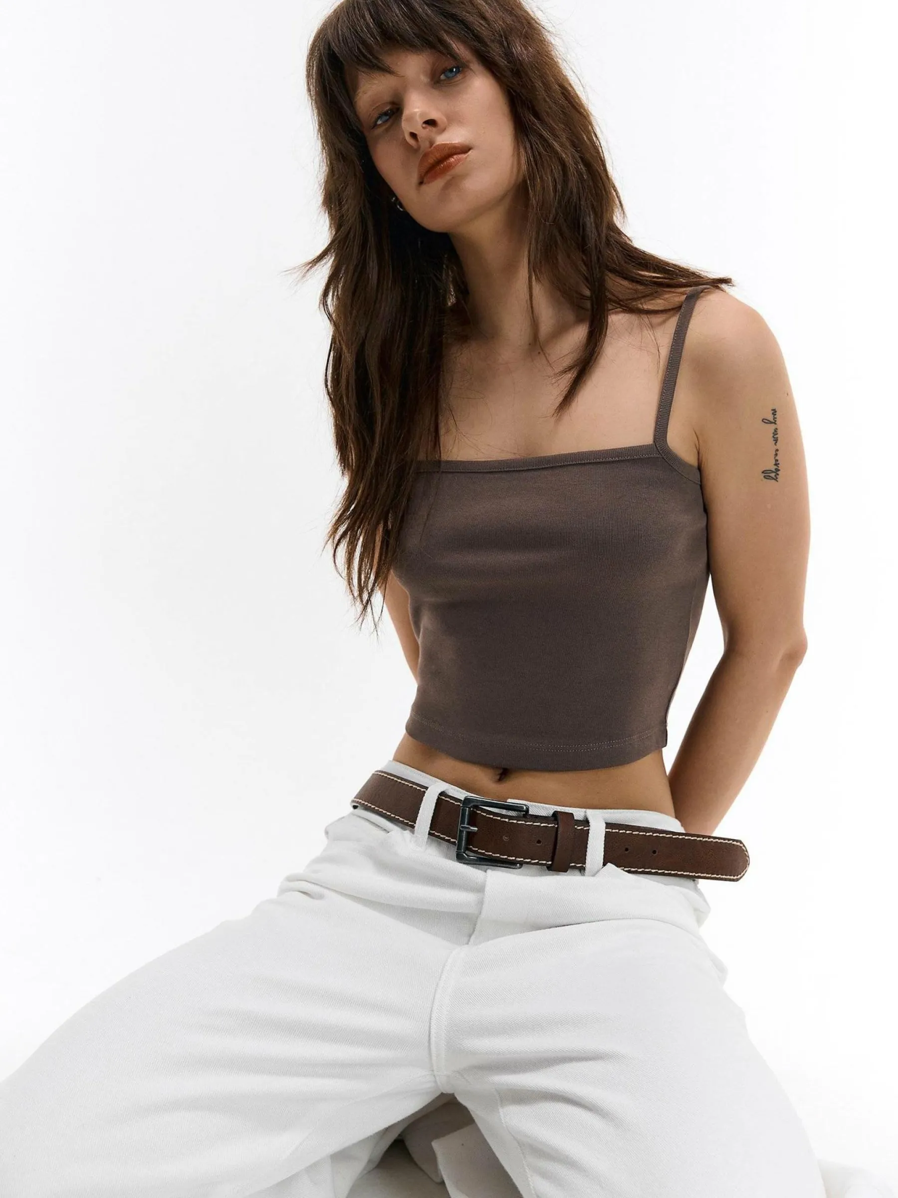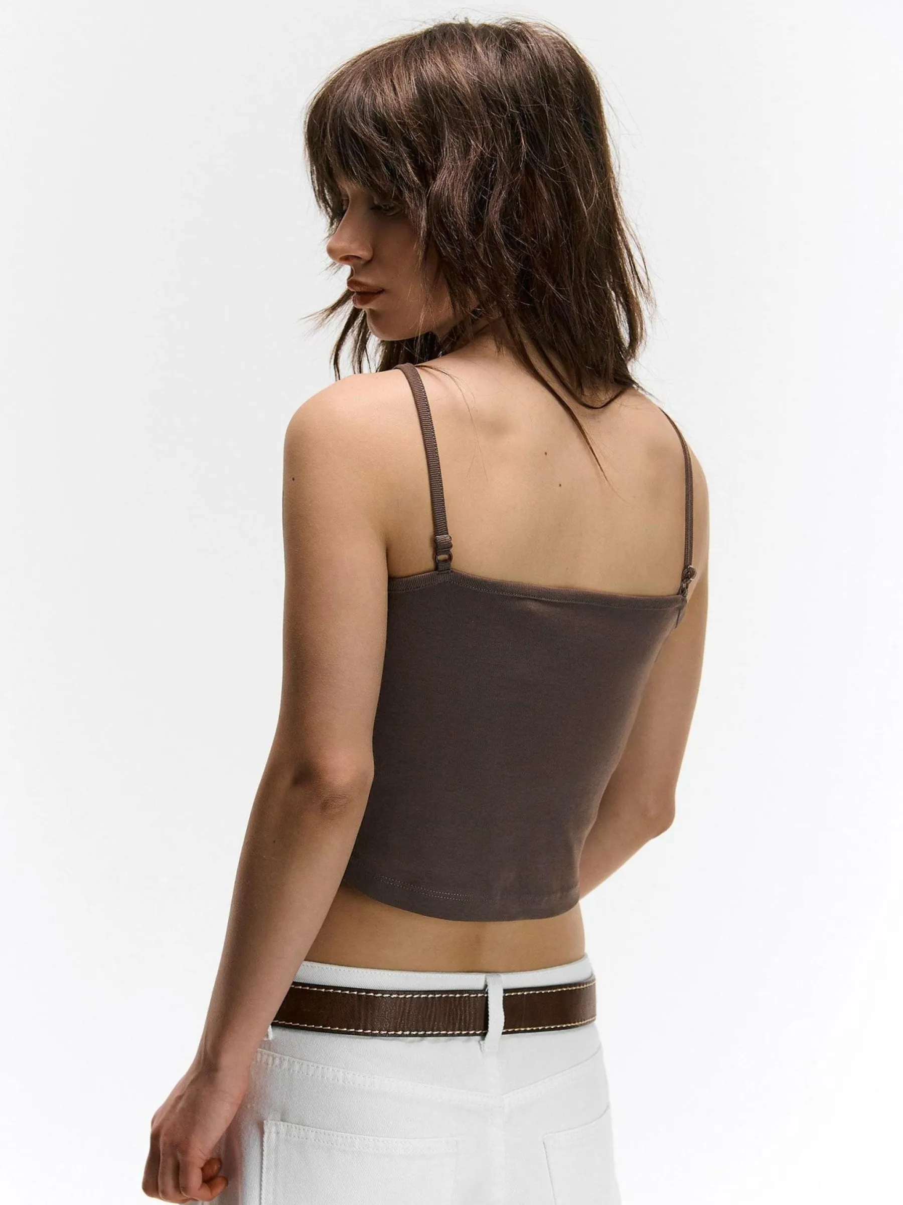 Kolor: brązowyKrój: regularTyp: podkoszulekRekaw: bez rękawówDługość: krótki topPattern style: pojedynczy kolorD…