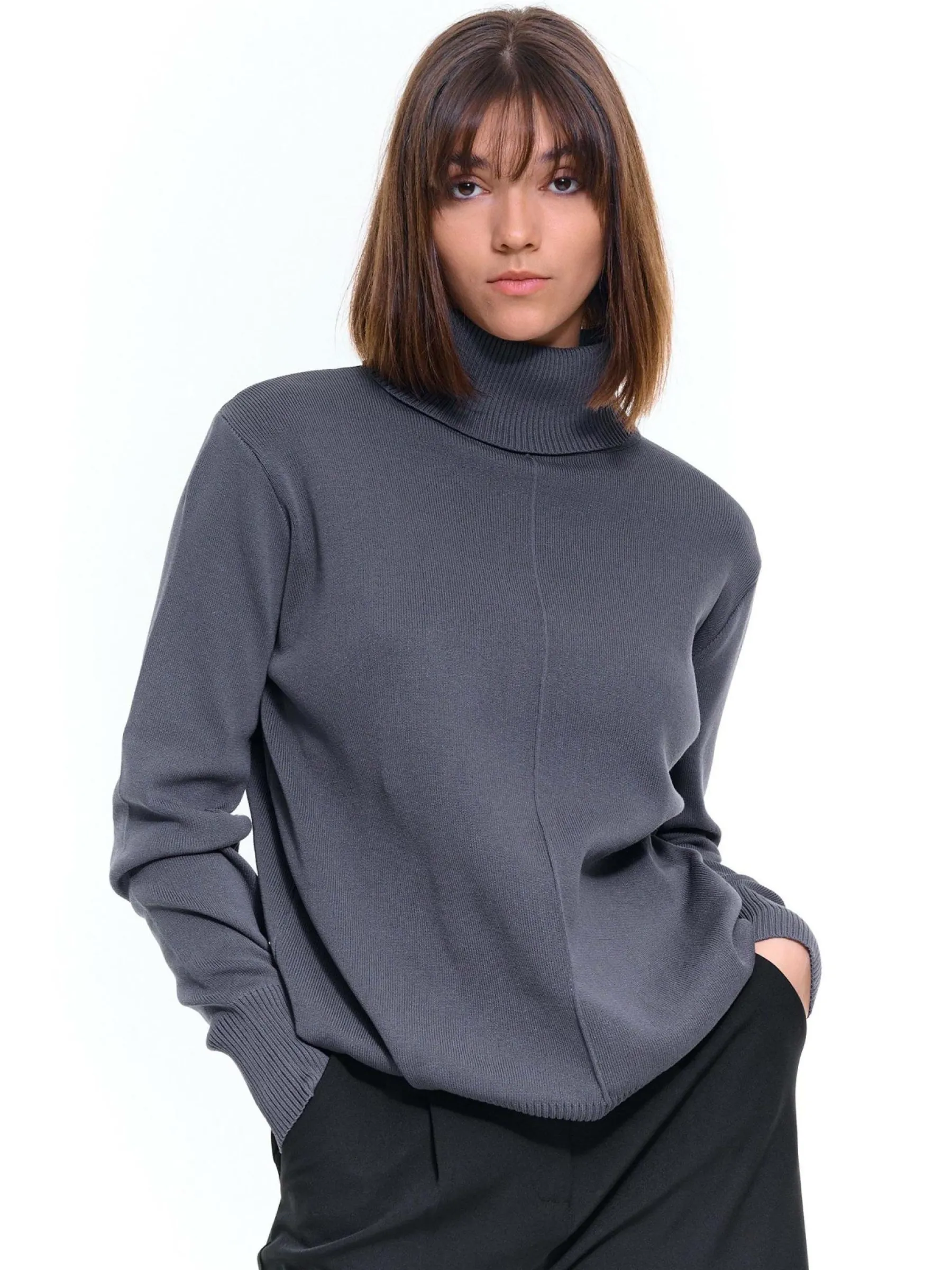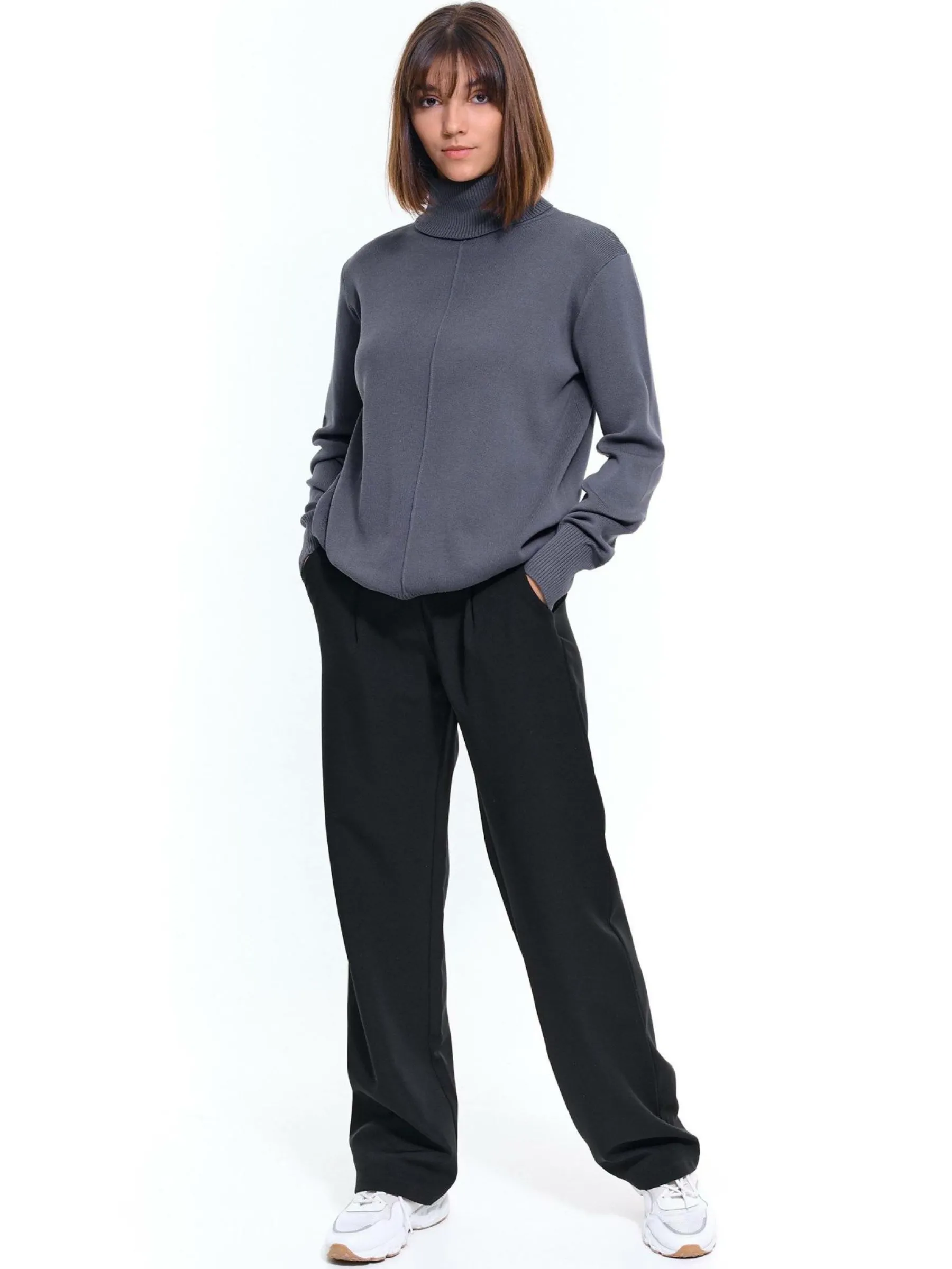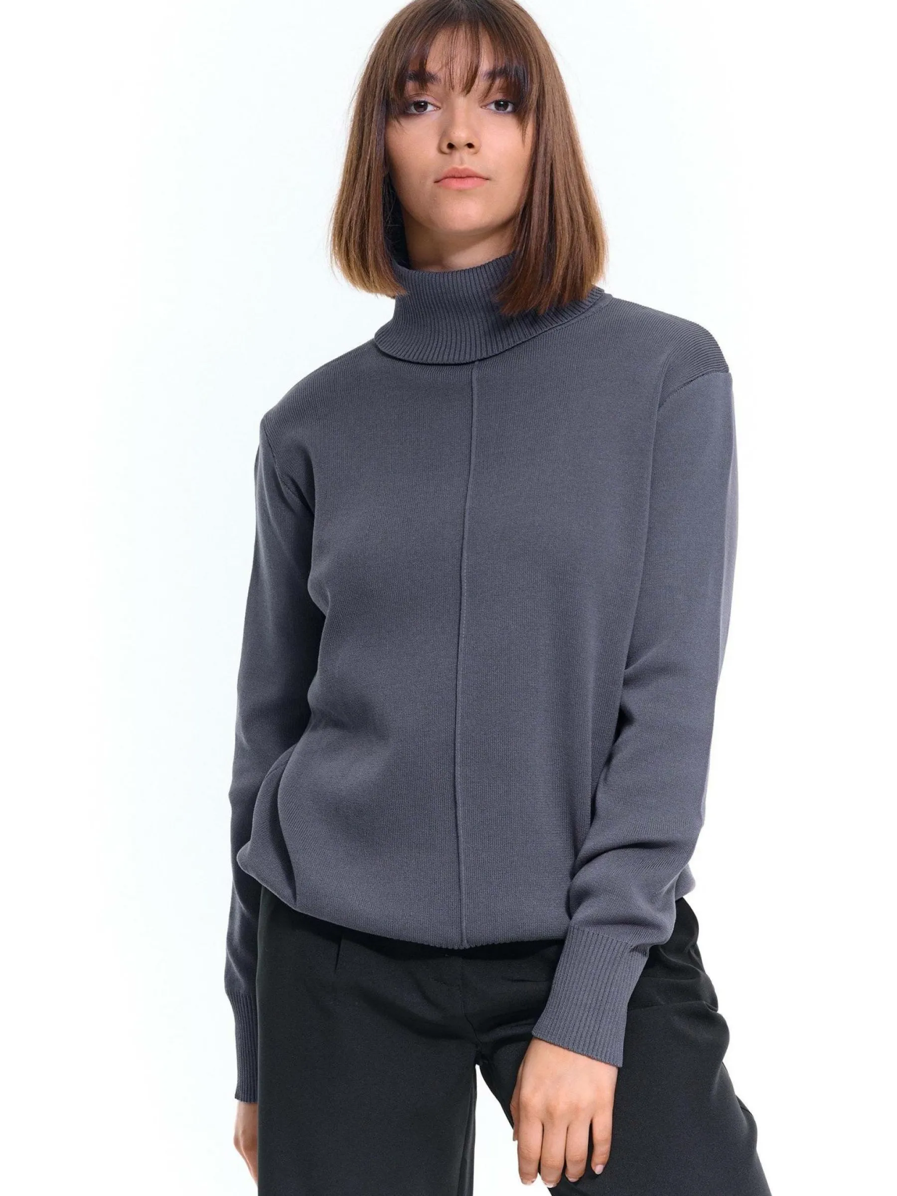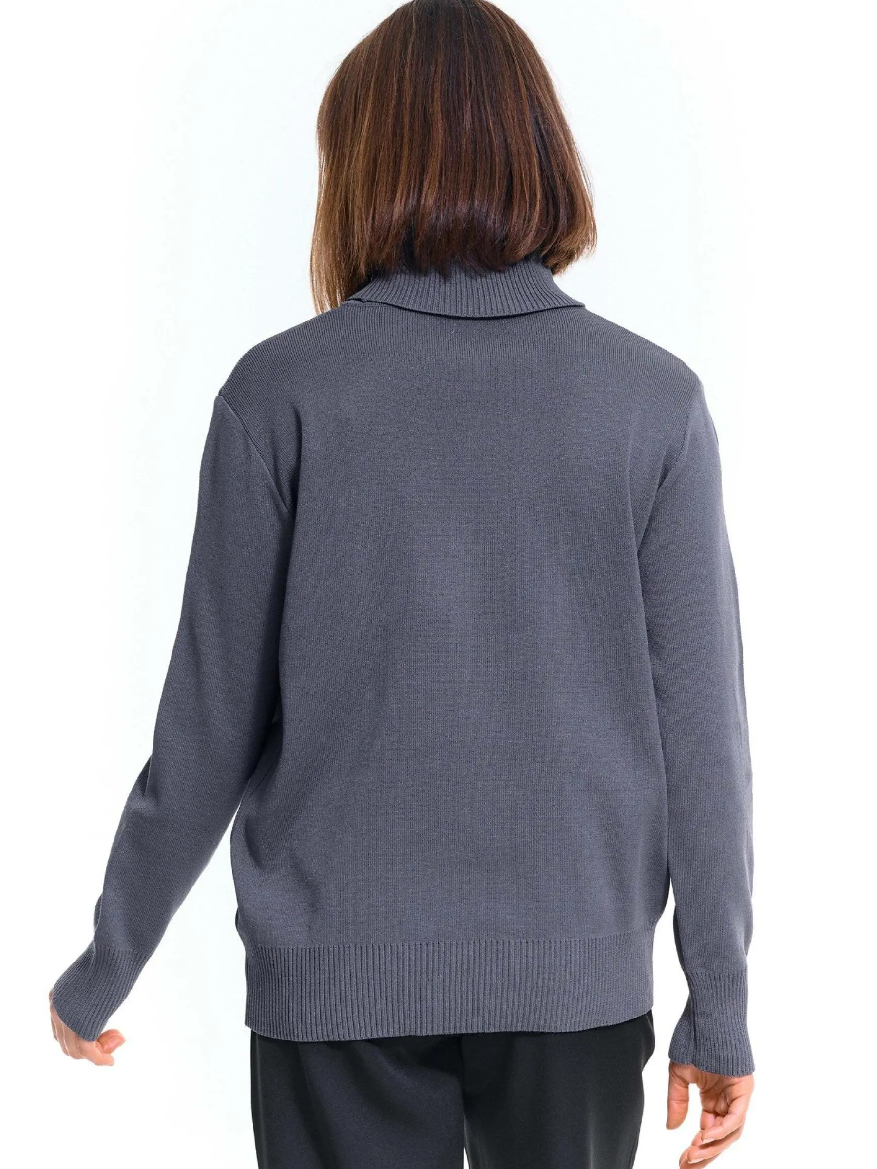 Kolor: szaryKrój: regularTyp: golfRekaw: długi rękawDługość: krótkiPattern style: żebrowanyDetal: nad głowąMat…