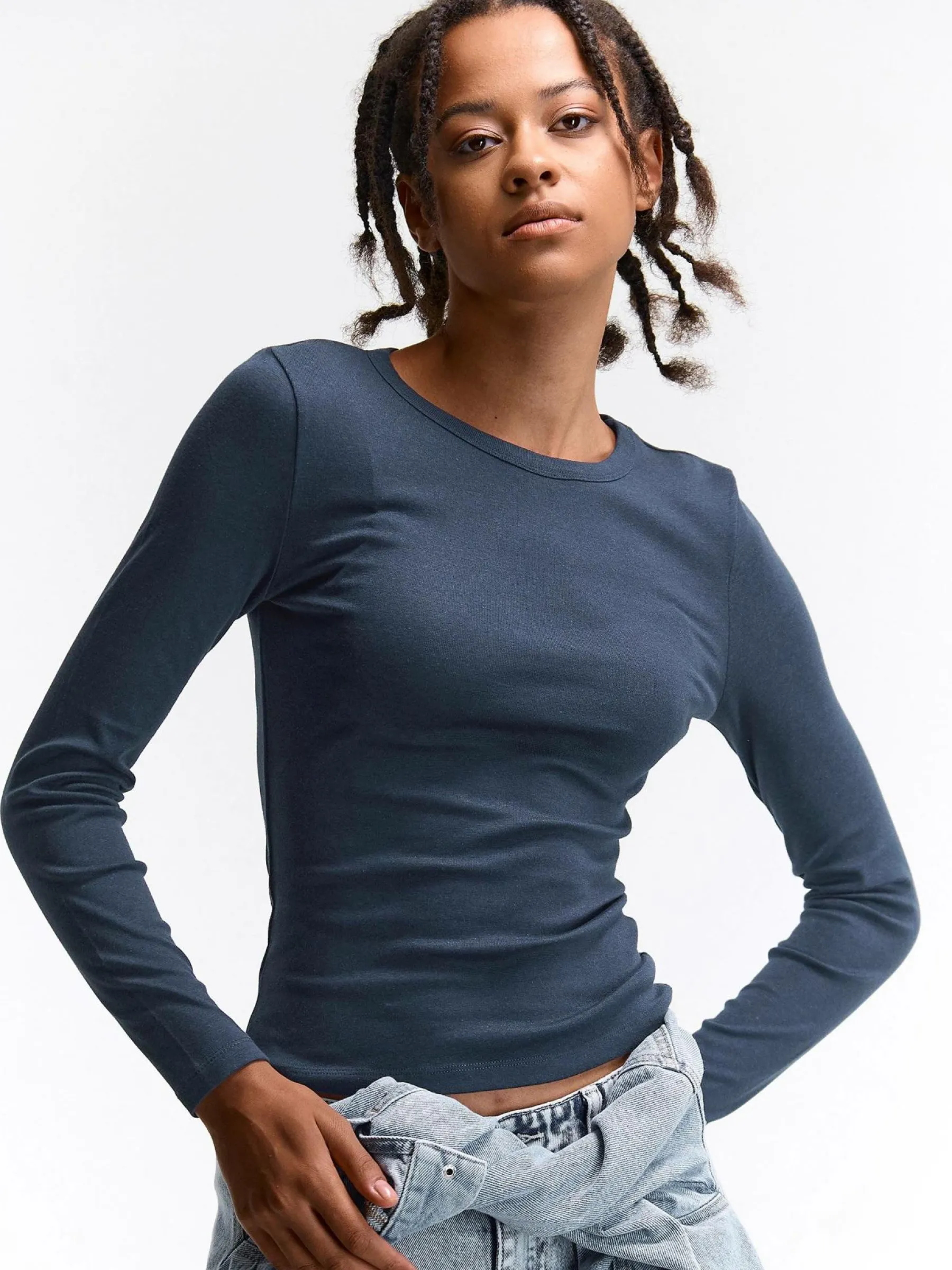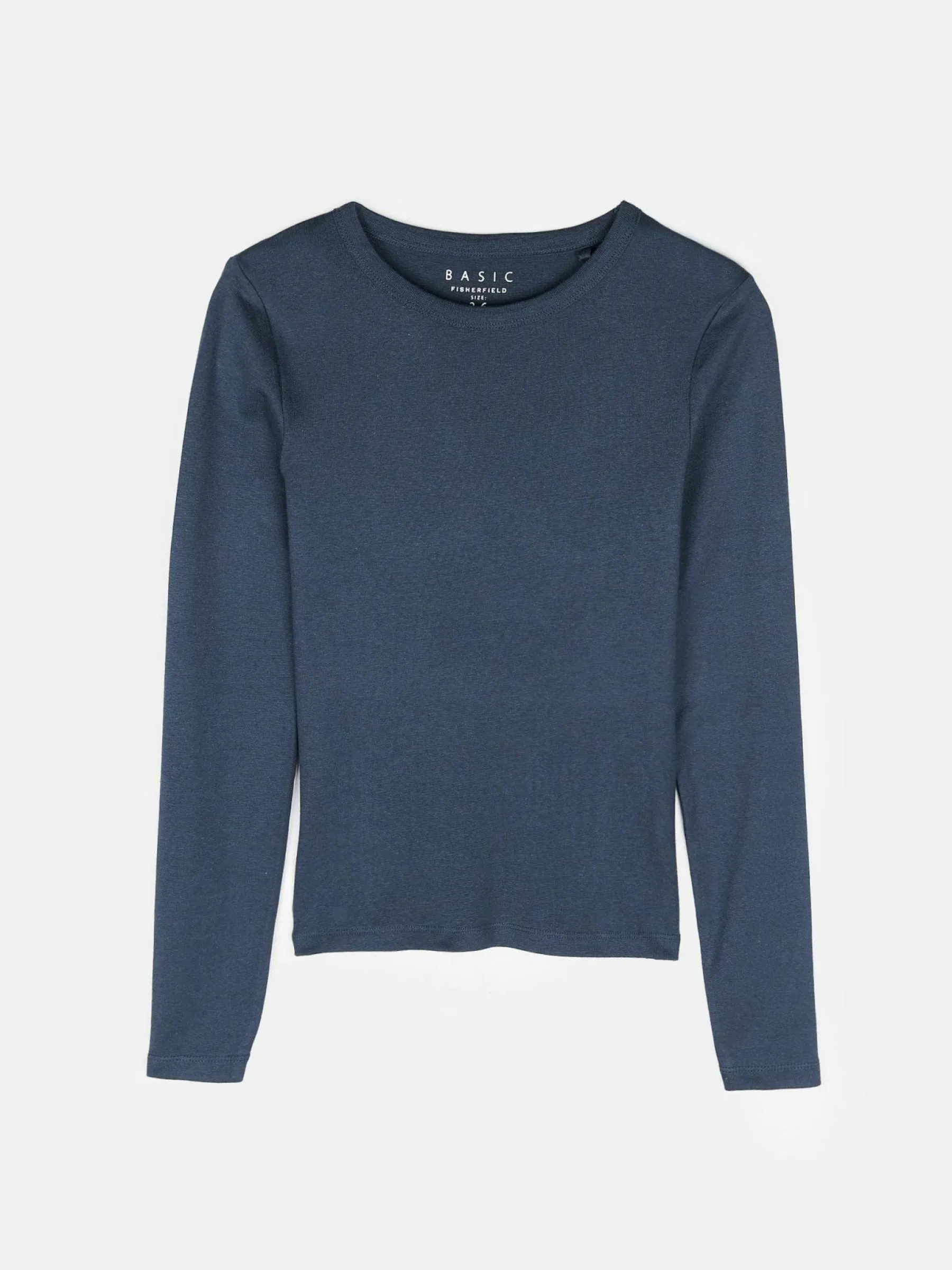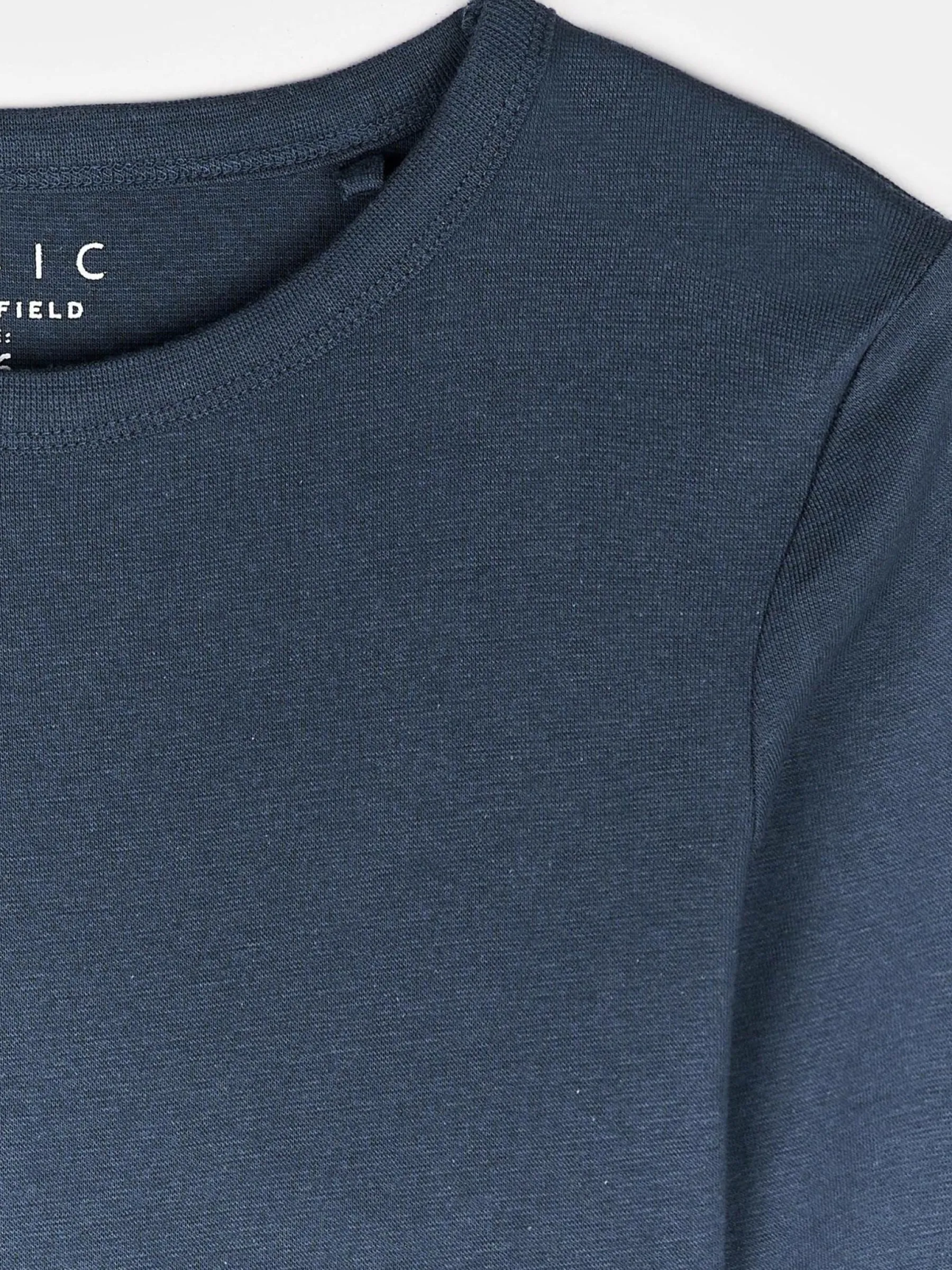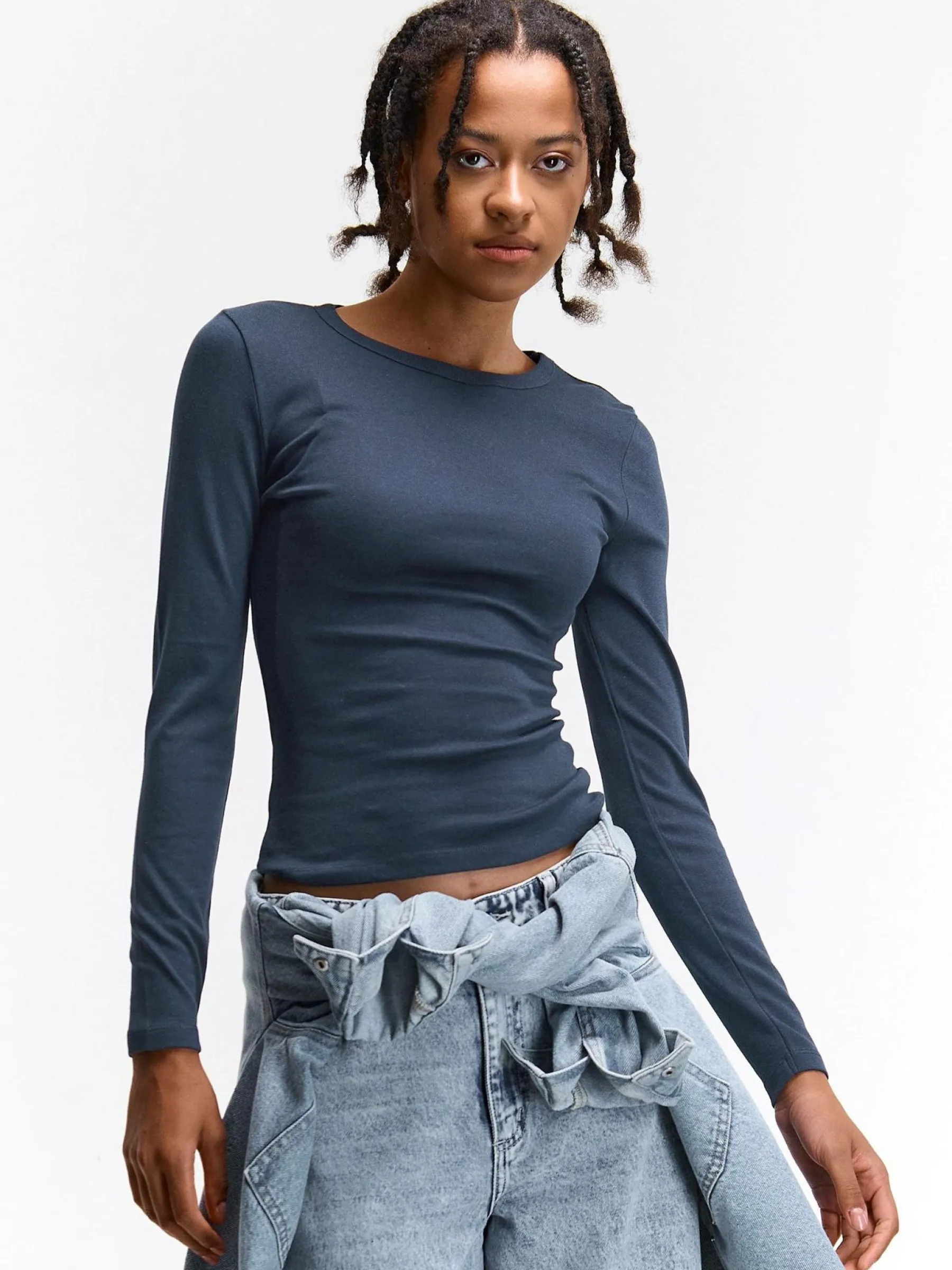 Kolor: granatowyKrój: podstawowyTyp: koszulkaRekaw: długi rękawDługość: krótkiPattern style: pojedynczy kolorDeta…