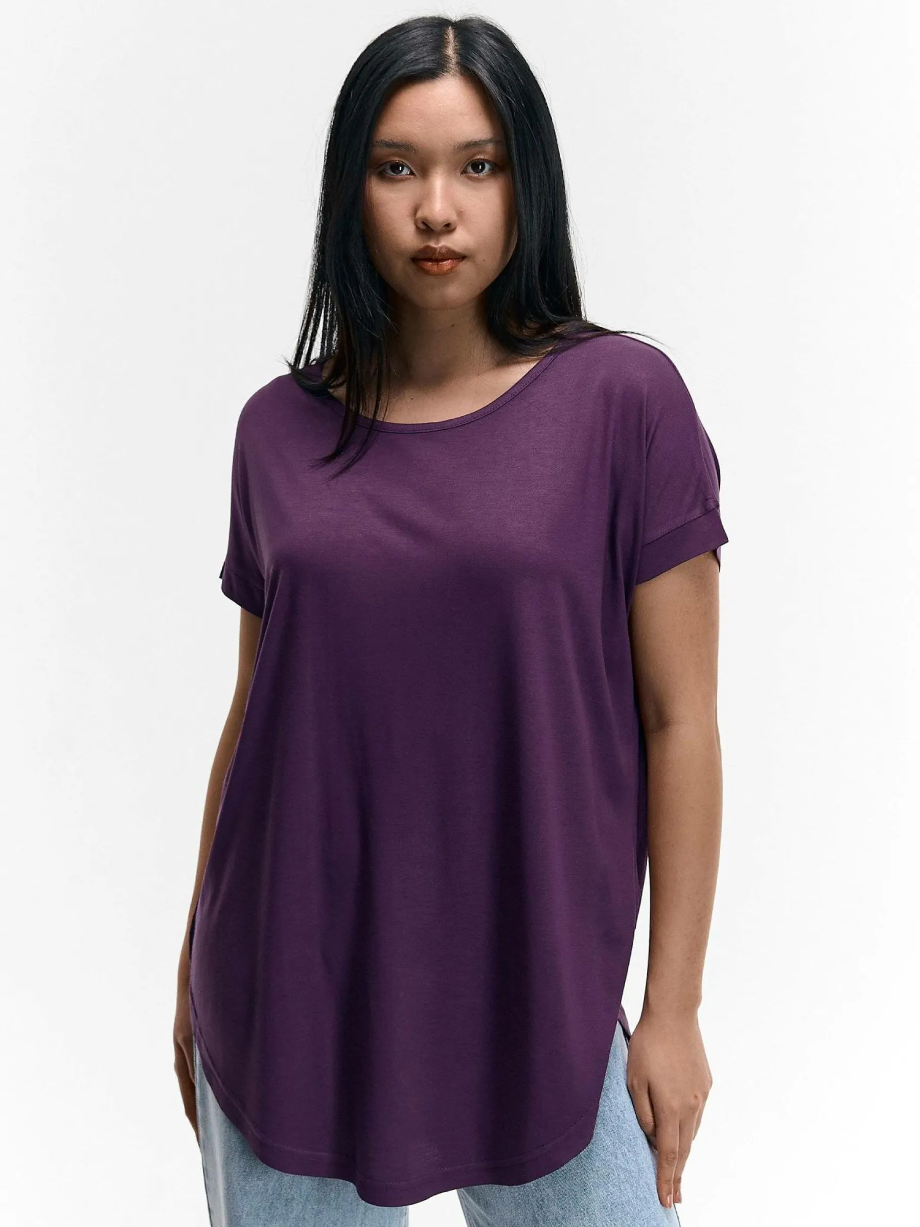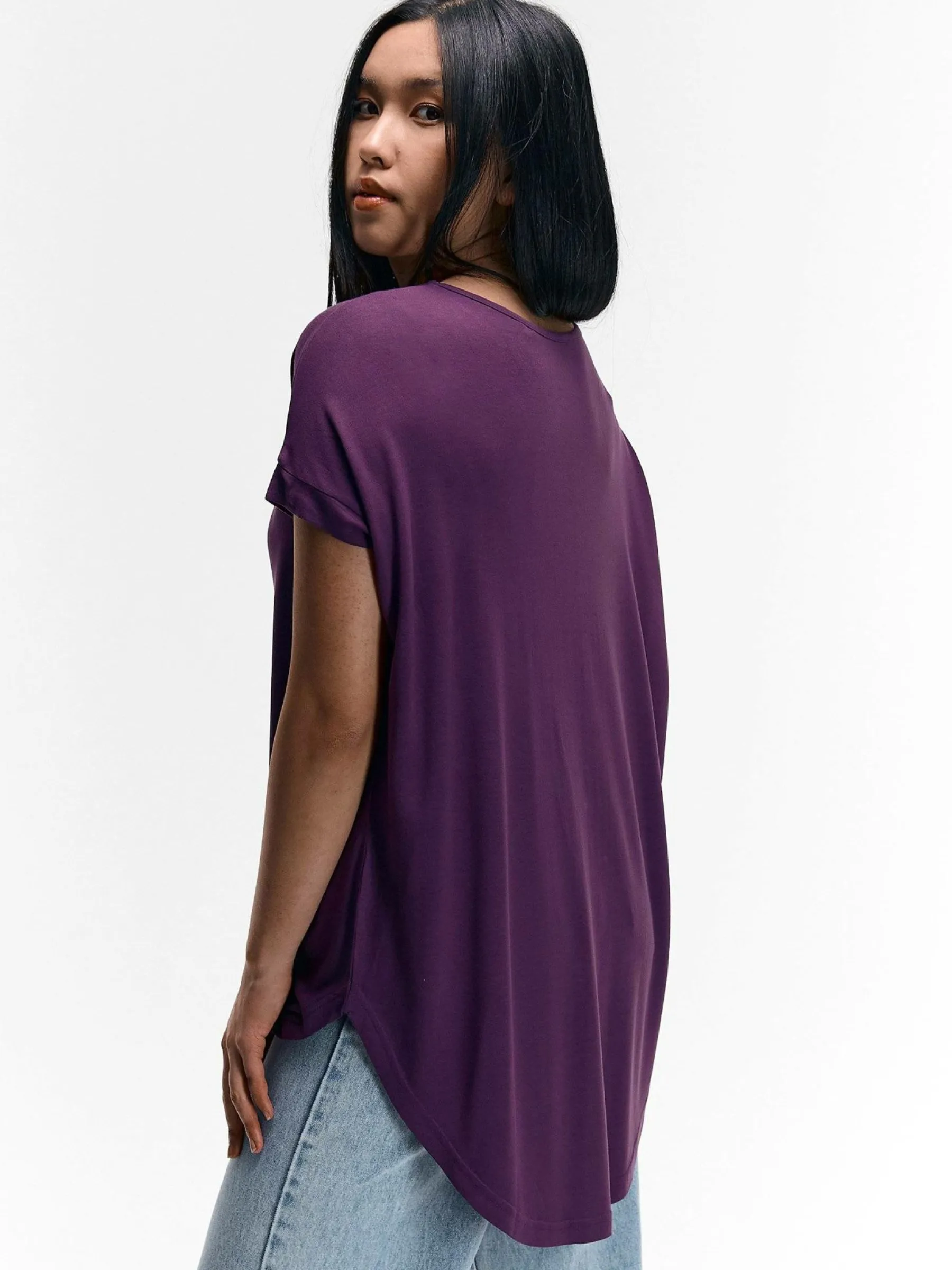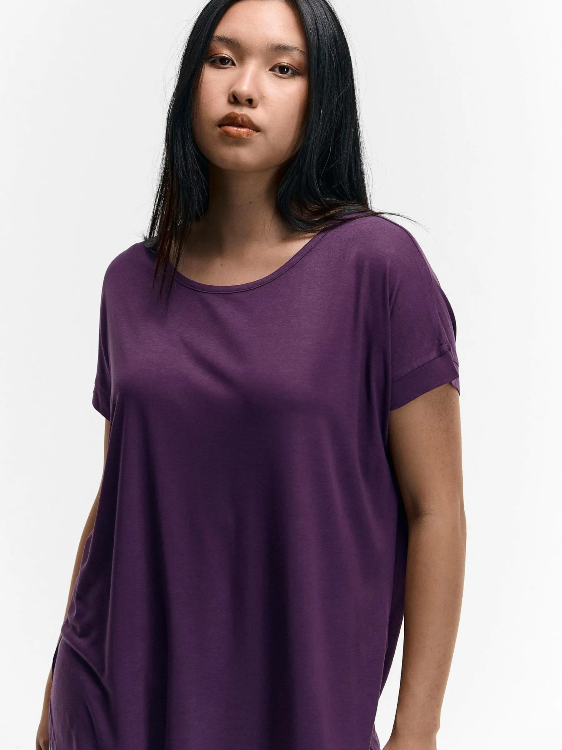 Kolor: purpurowyKrój: asymetryczneTyp: koszulkaRekaw: krótki rękawDługość: dlugiePattern style: pojedynczy kolorDe…