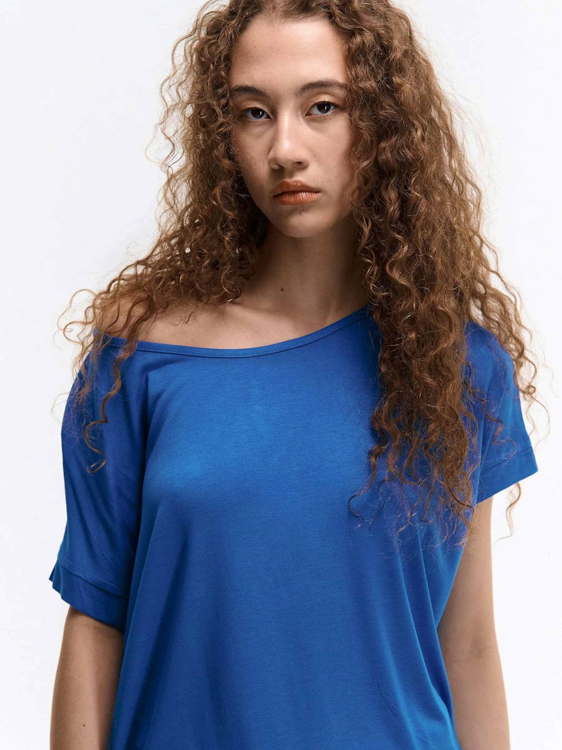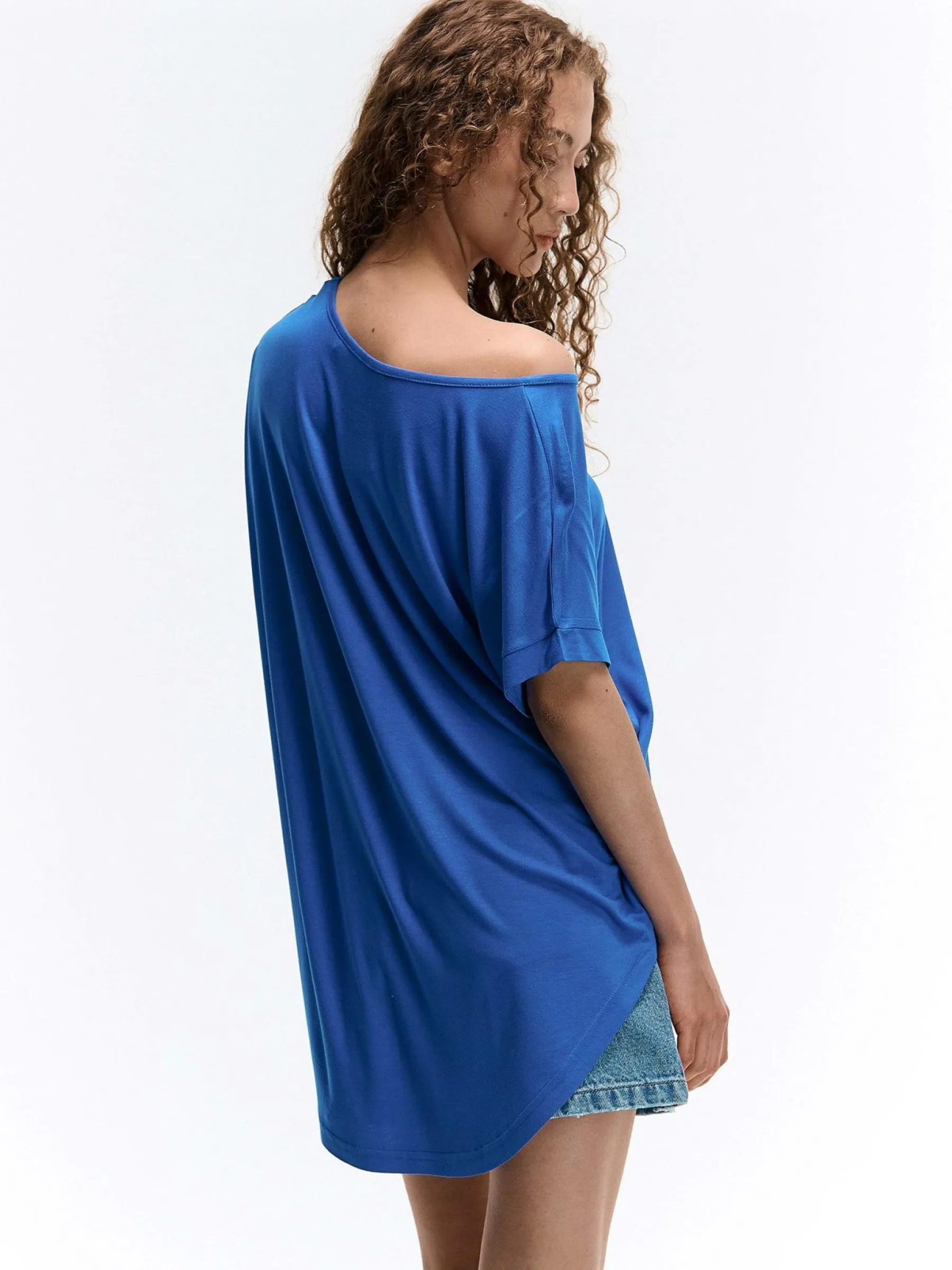 Kolor: niebieskiKrój: asymetryczneTyp: koszulkaRekaw: krótki rękawDługość: dlugiePattern style: pojedynczy kolorDe…