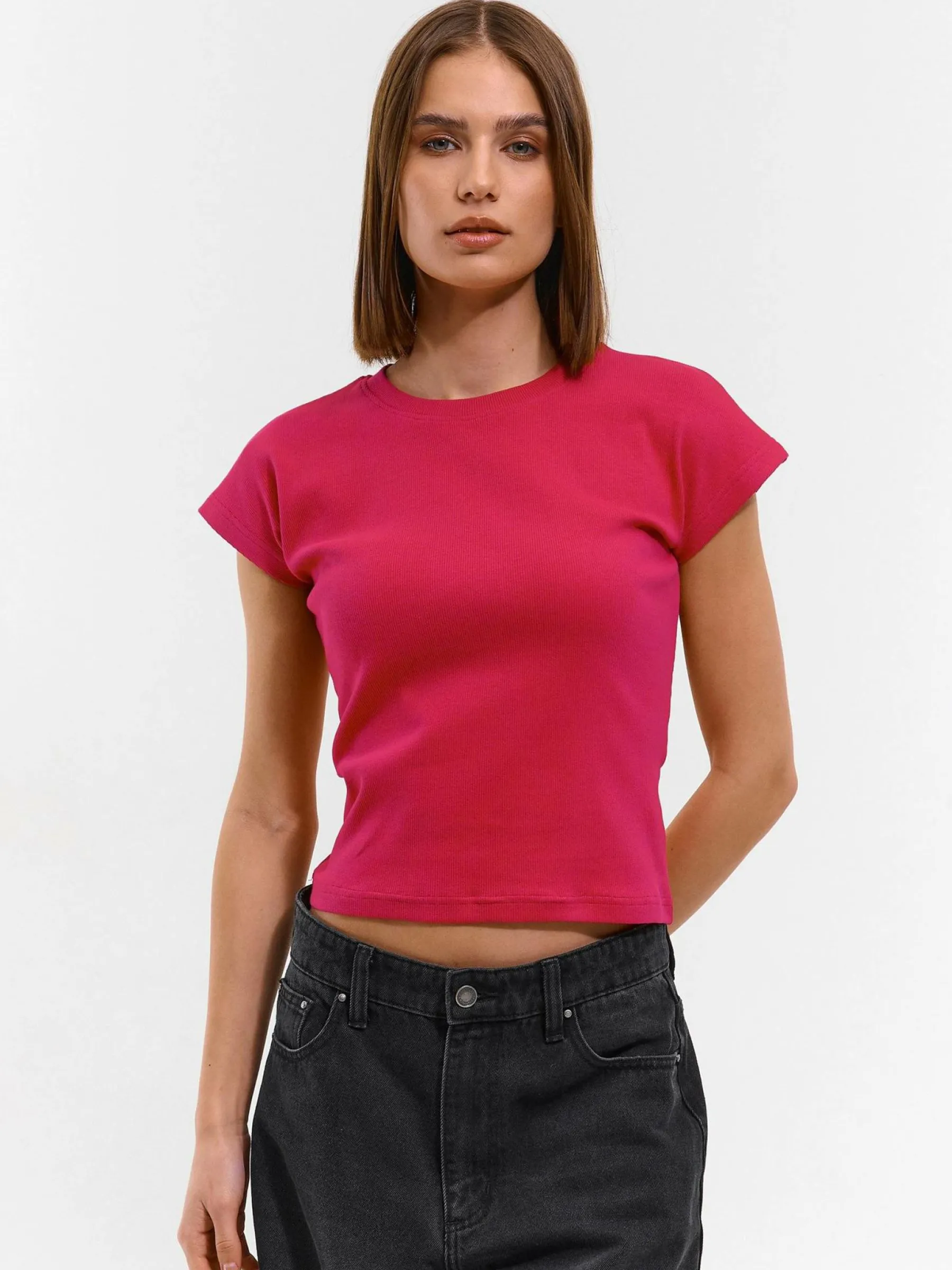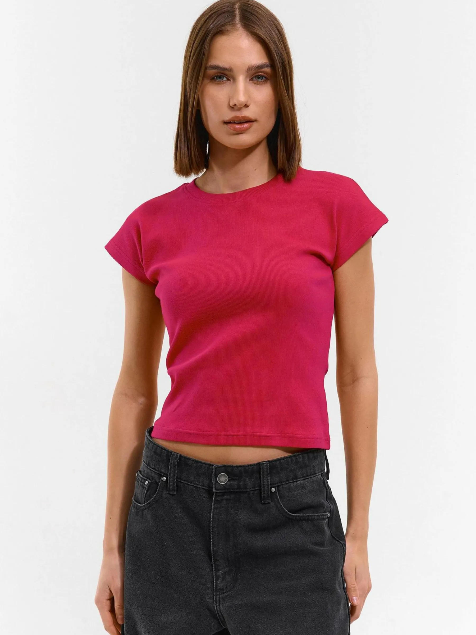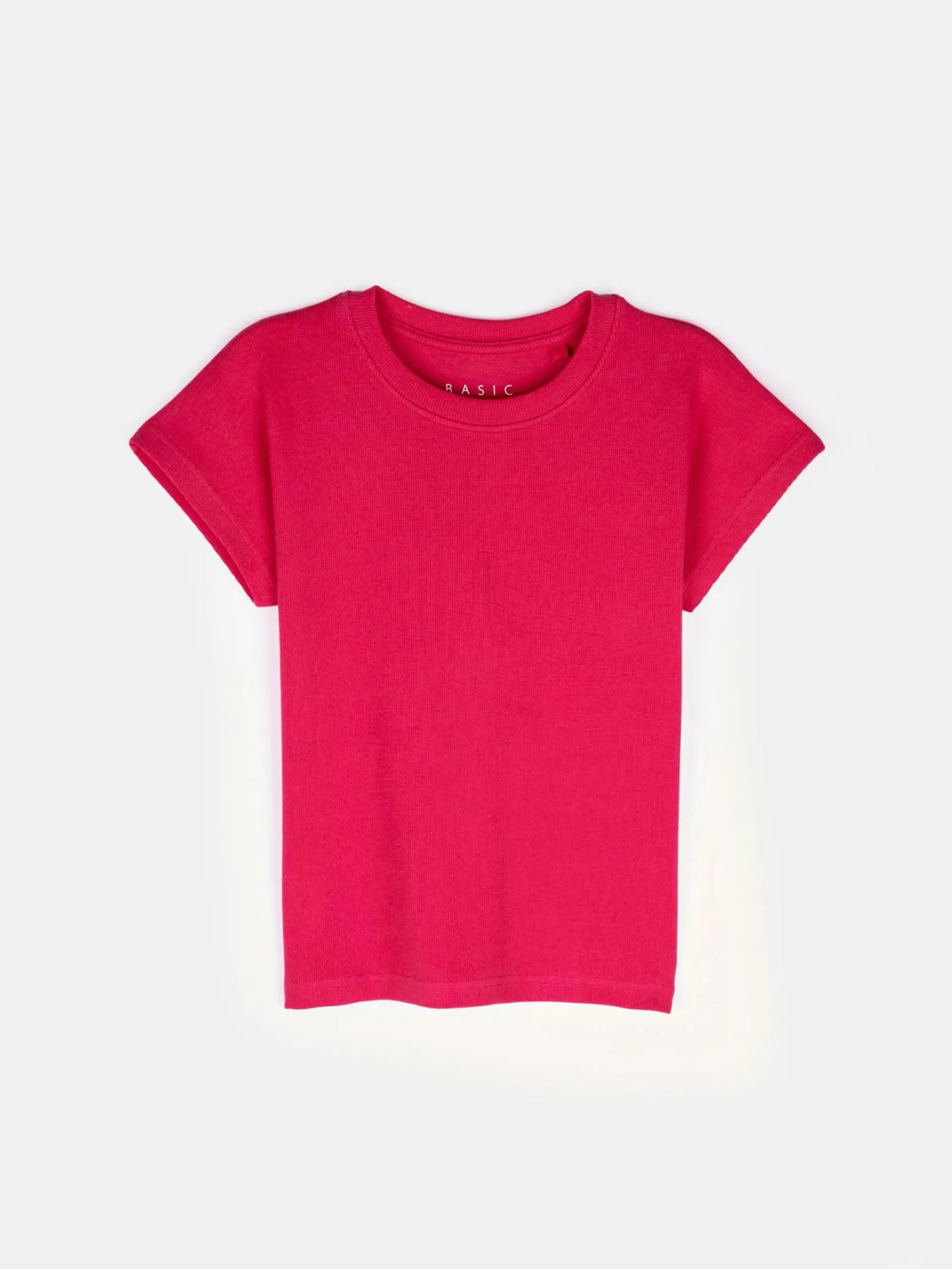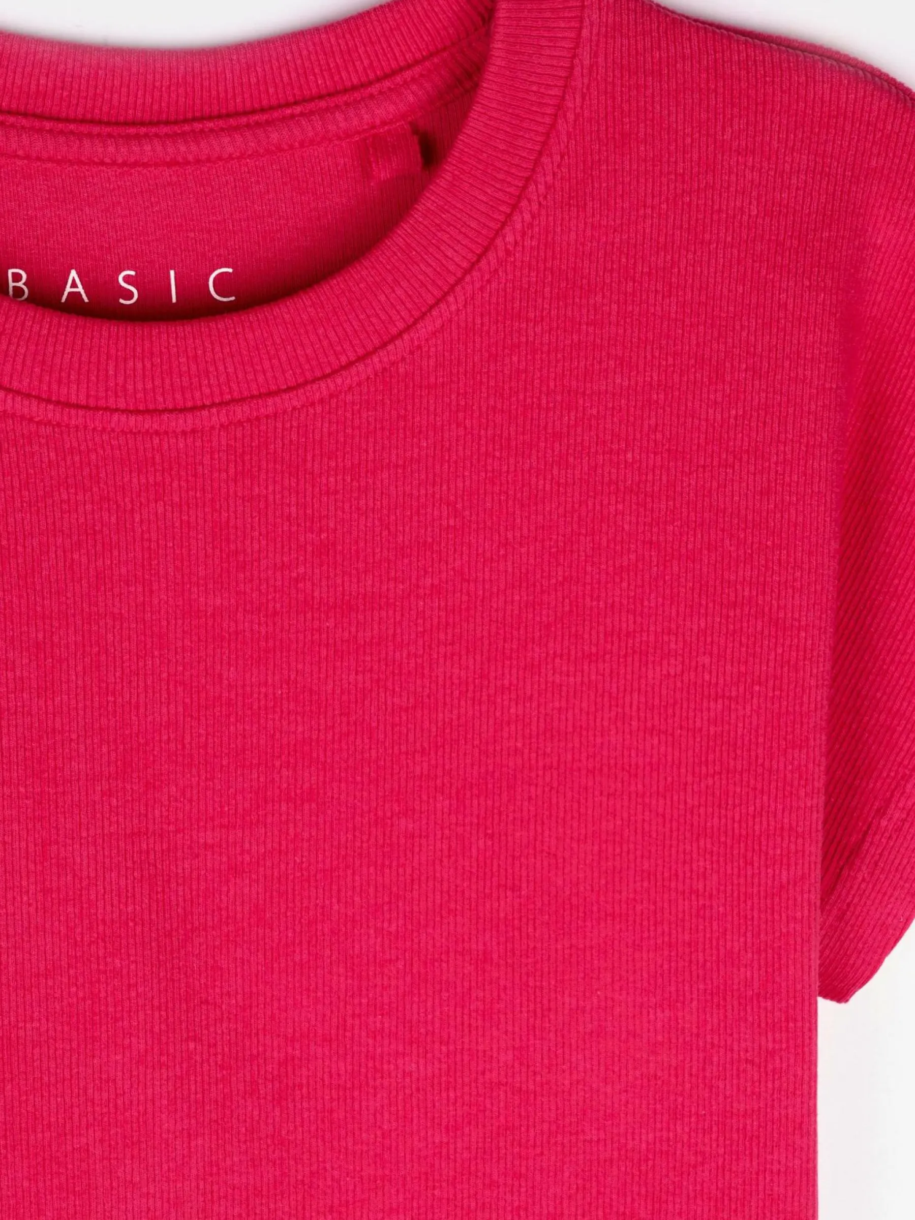 Kolor: różowyKrój: regularTyp: koszulkaRekaw: krótki rękawDługość: krótkiPattern style: pojedynczy kolor, żebr…