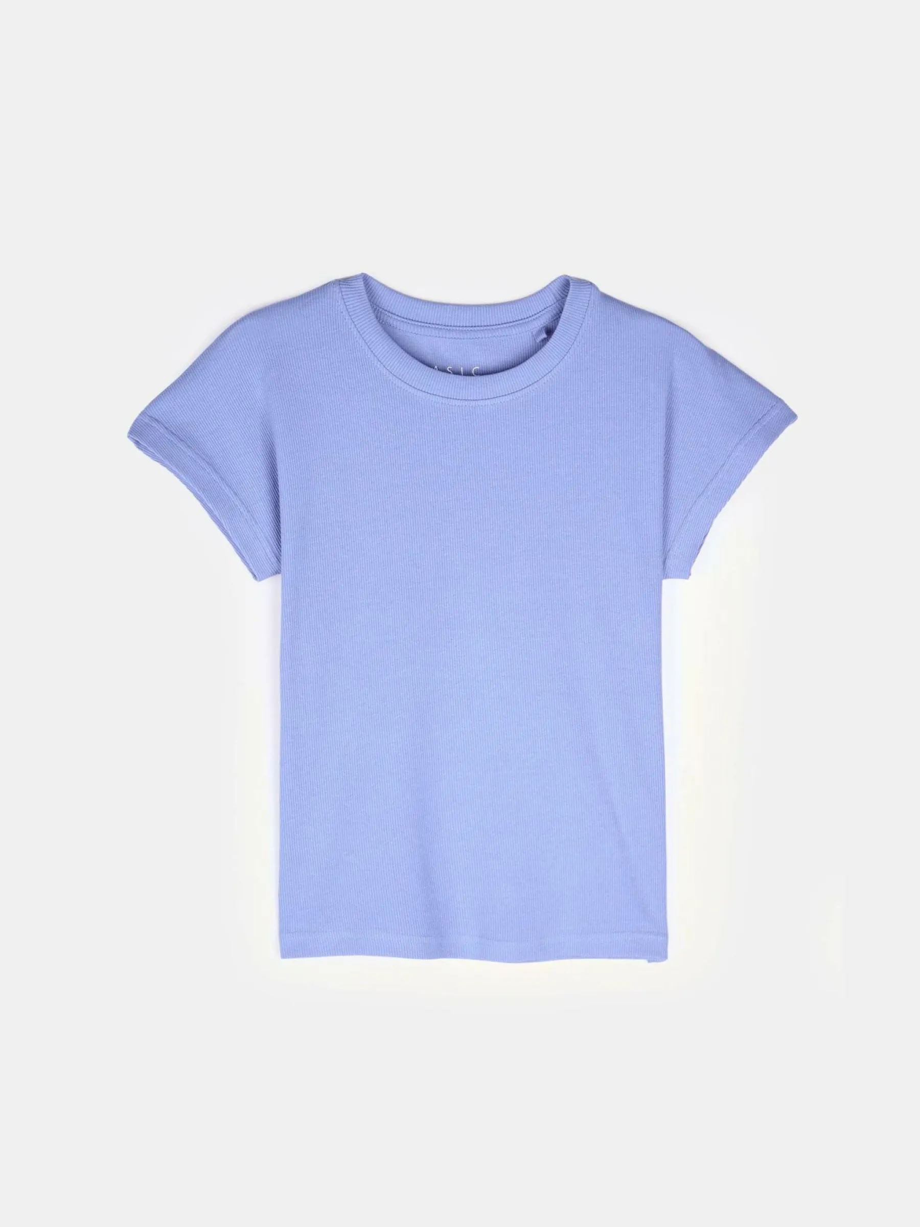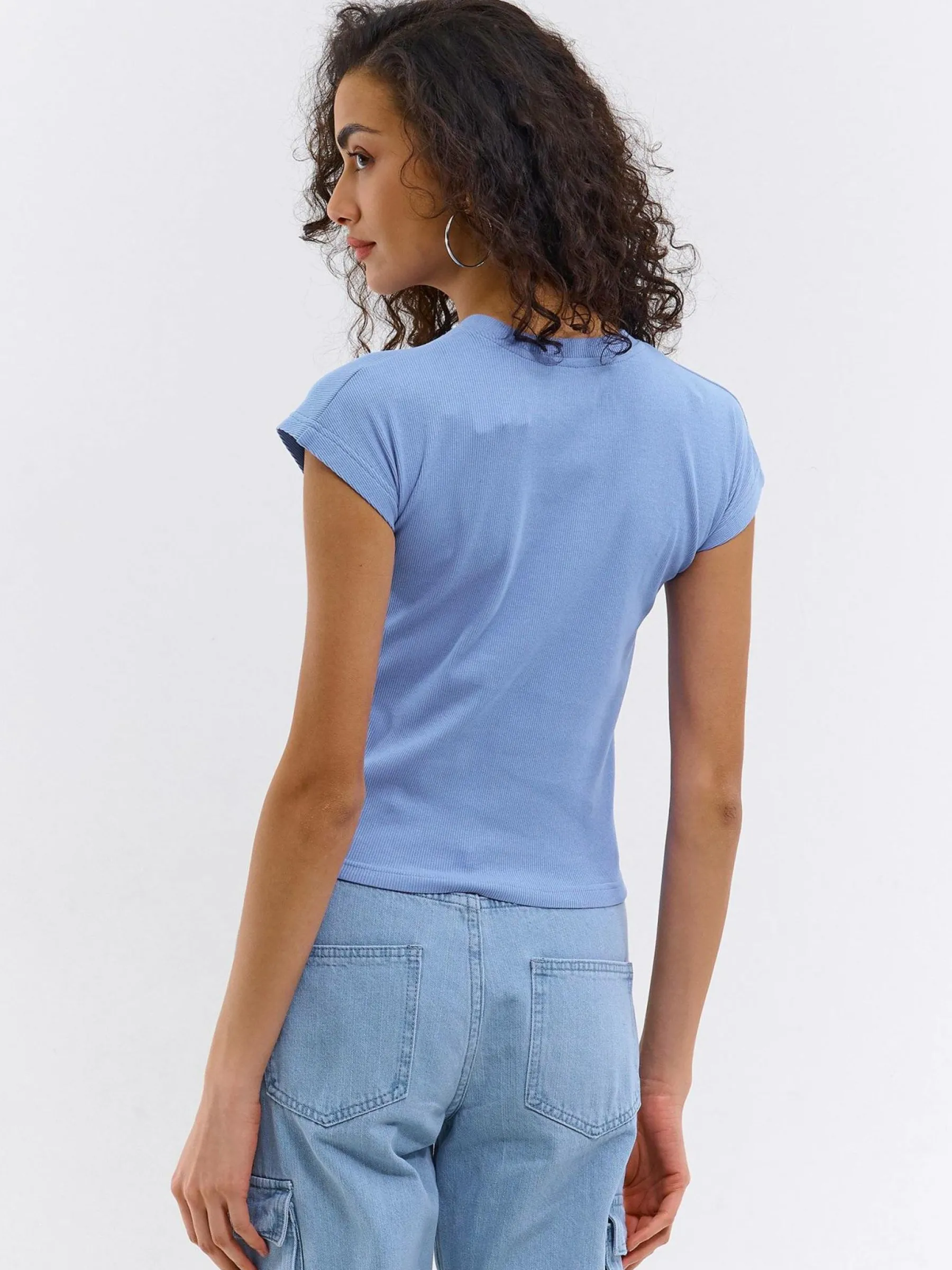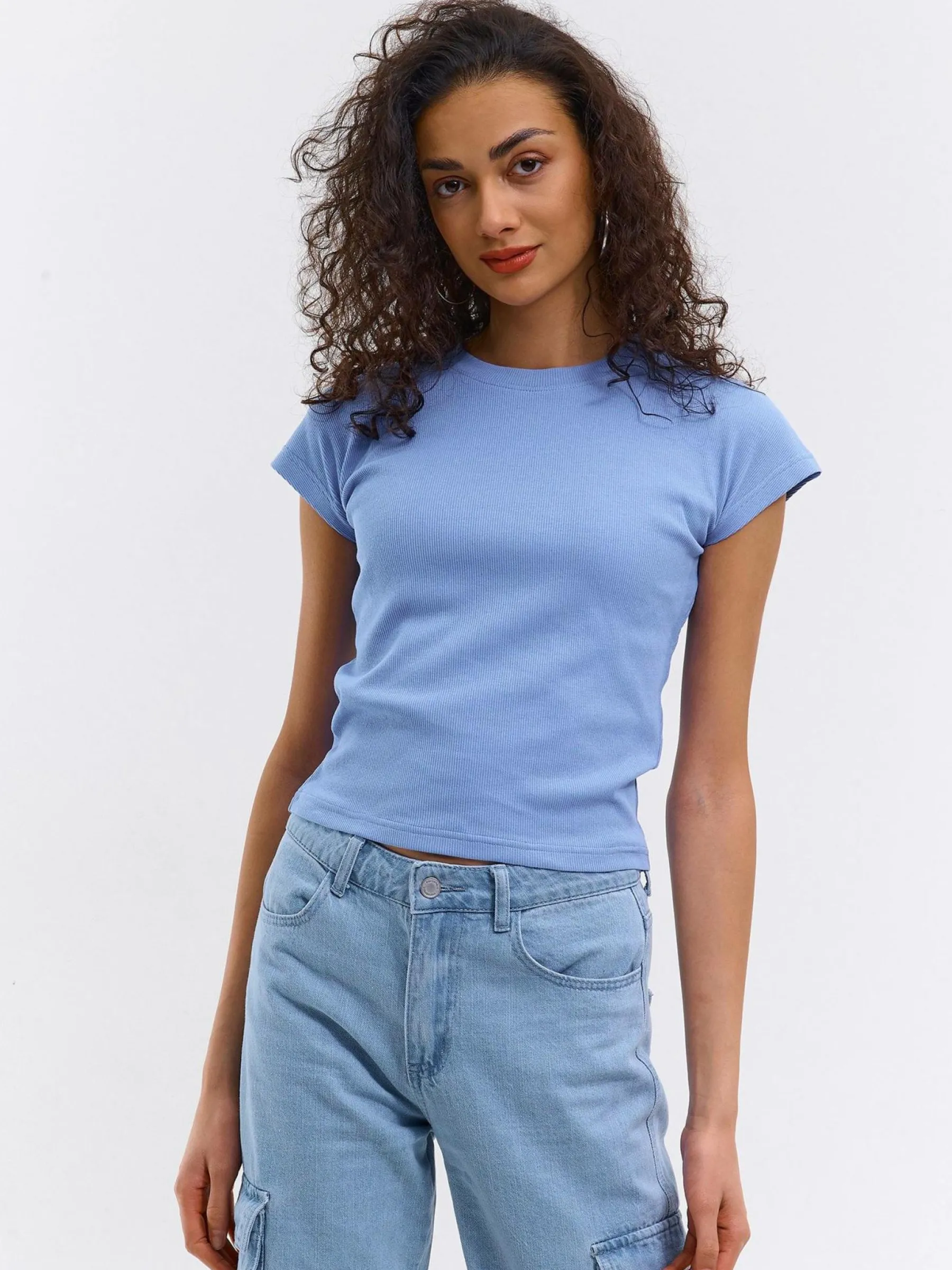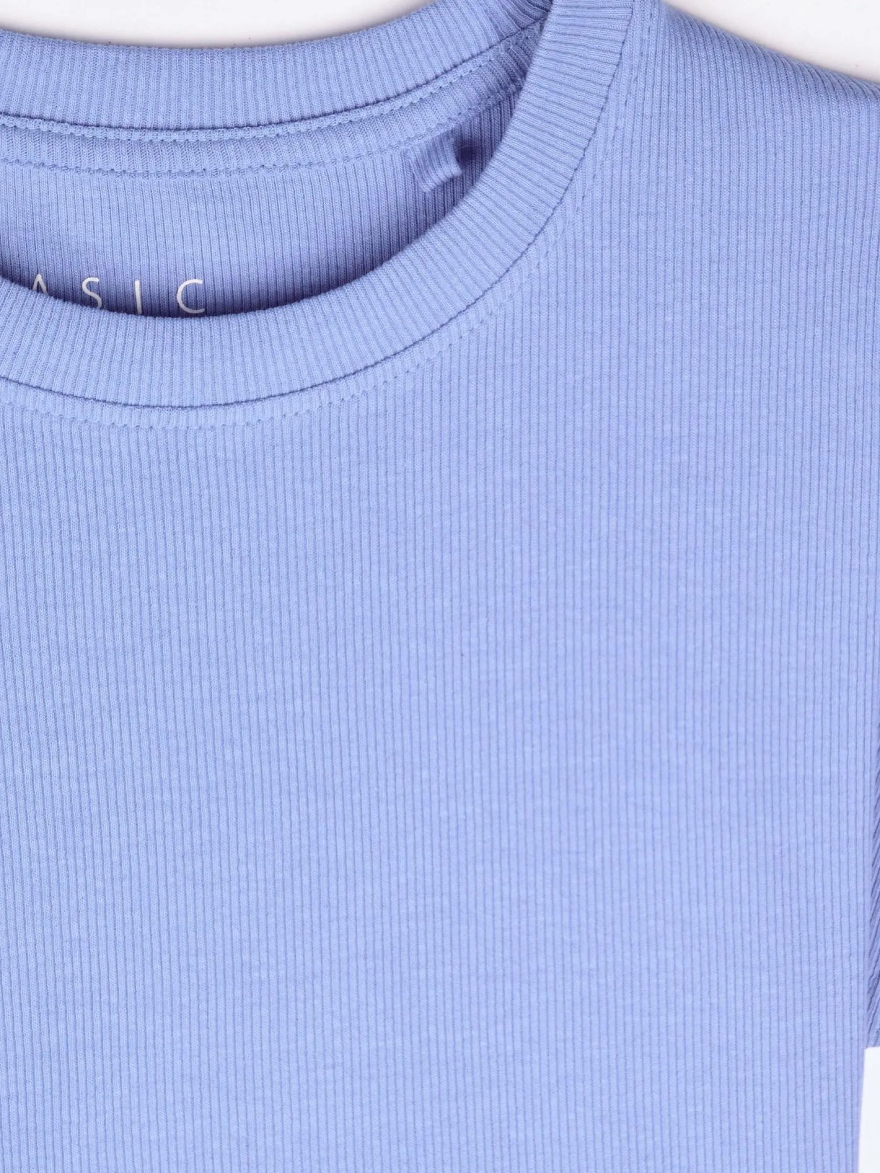 Kolor: niebieskiKrój: regularTyp: koszulkaRekaw: krótki rękawDługość: krótkiPattern style: pojedynczy kolor, żeb…