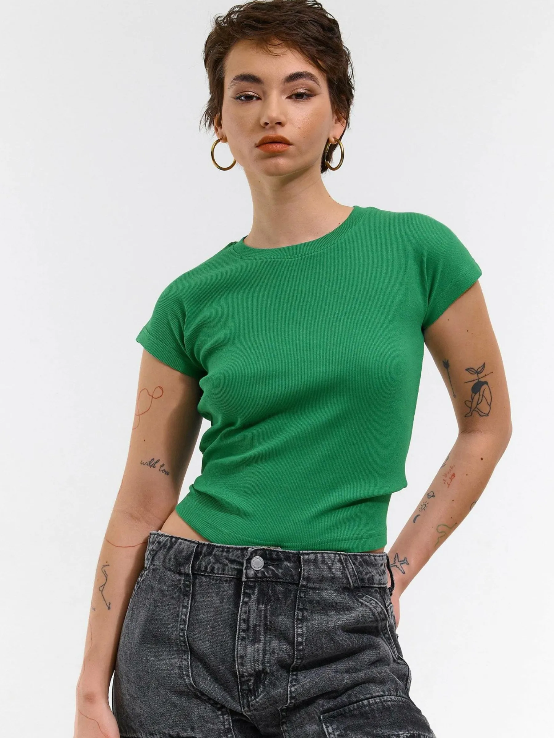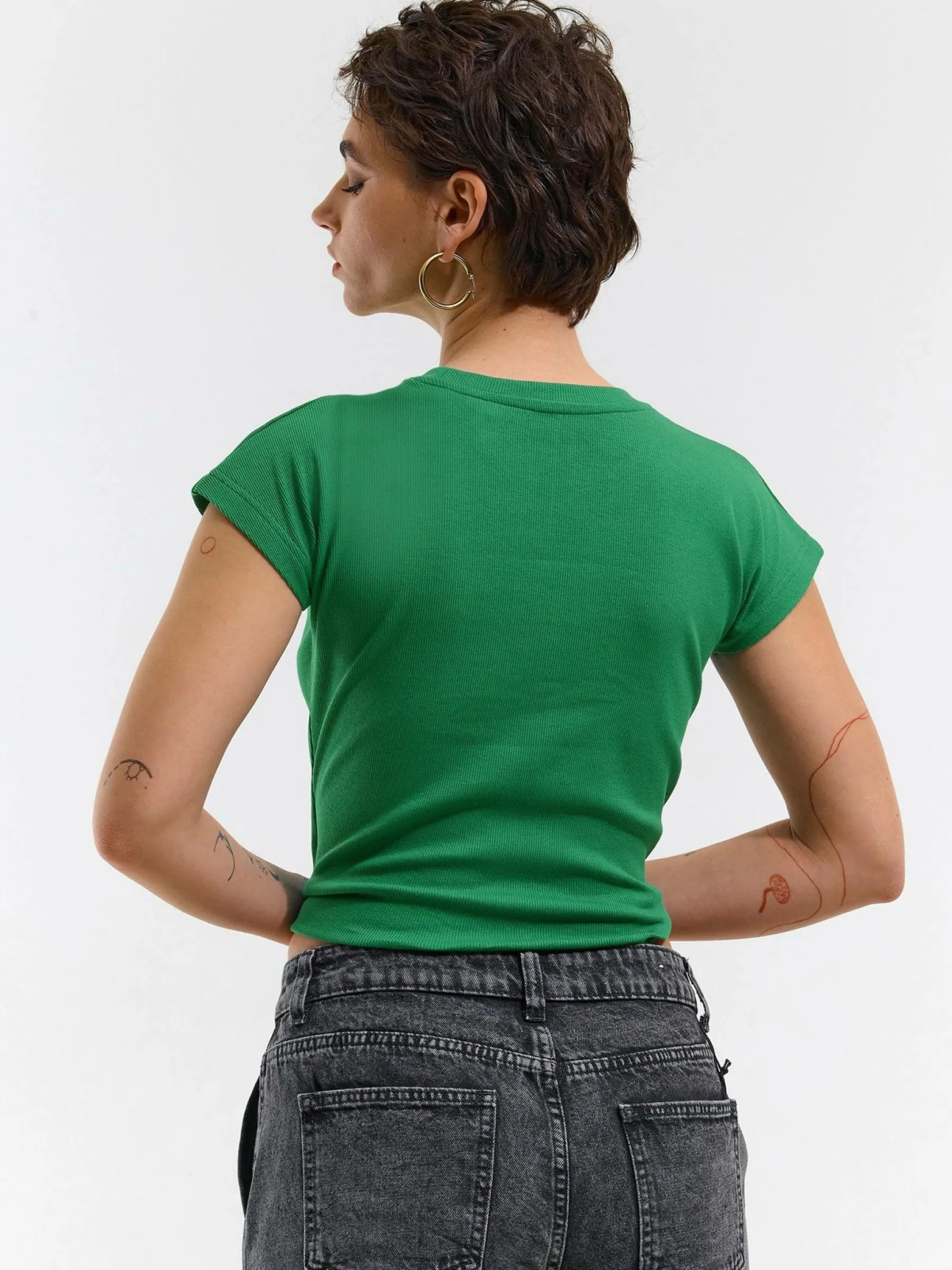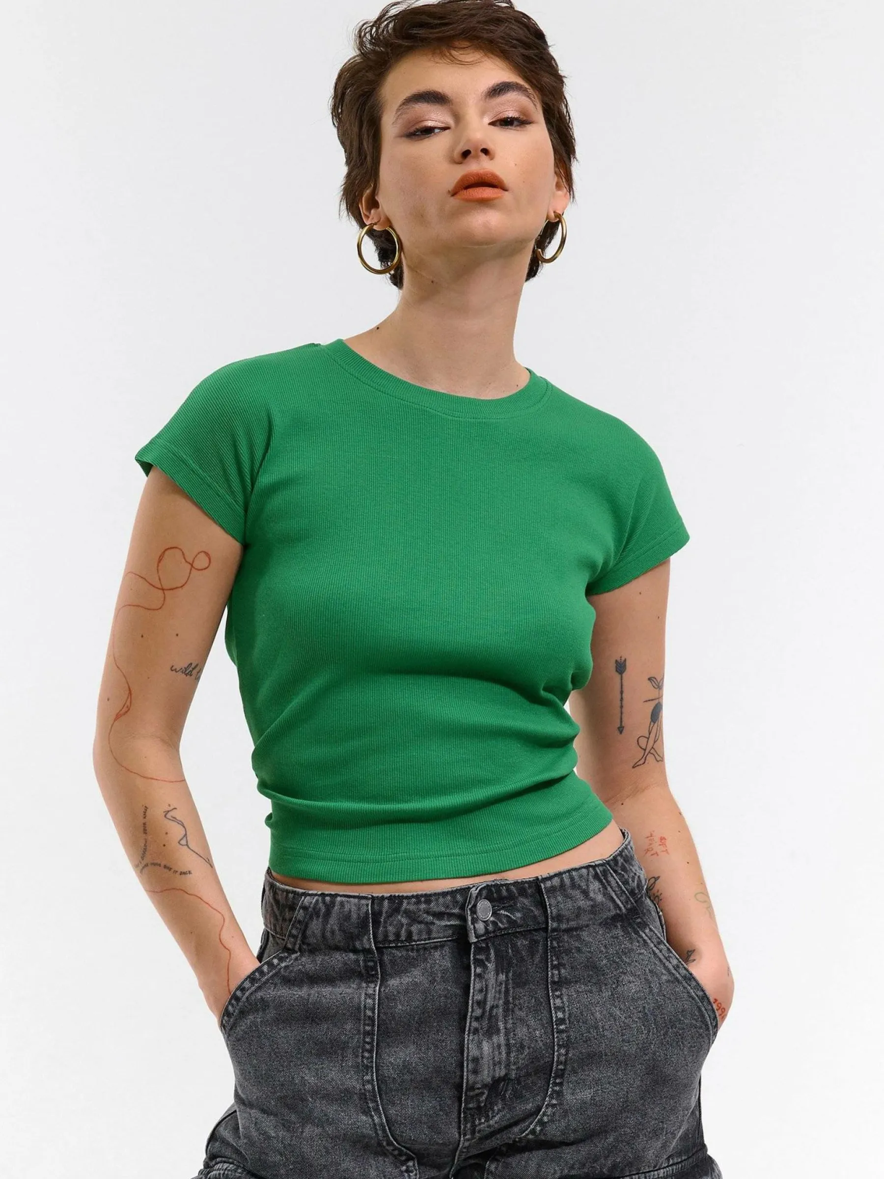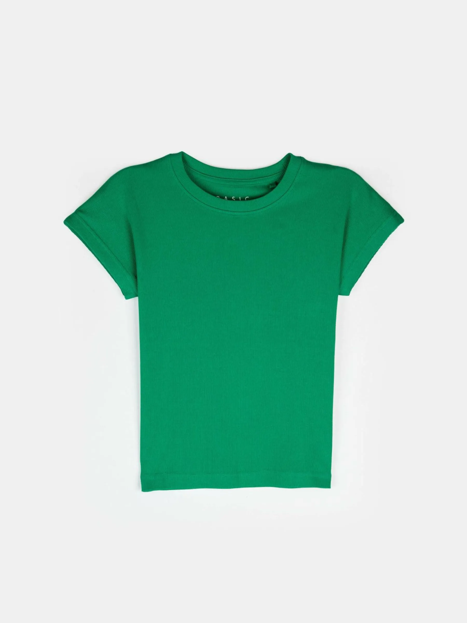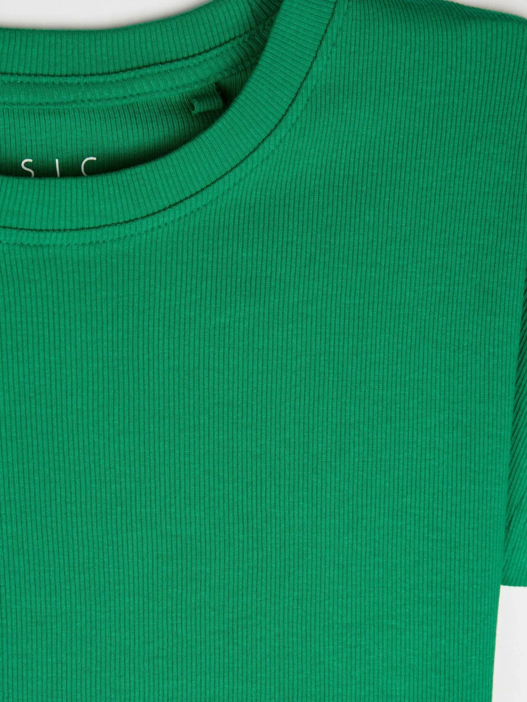 Kolor: zielonyKrój: regularTyp: koszulkaRekaw: krótki rękawDługość: krótkiPattern style: pojedynczy kolor, żebro…