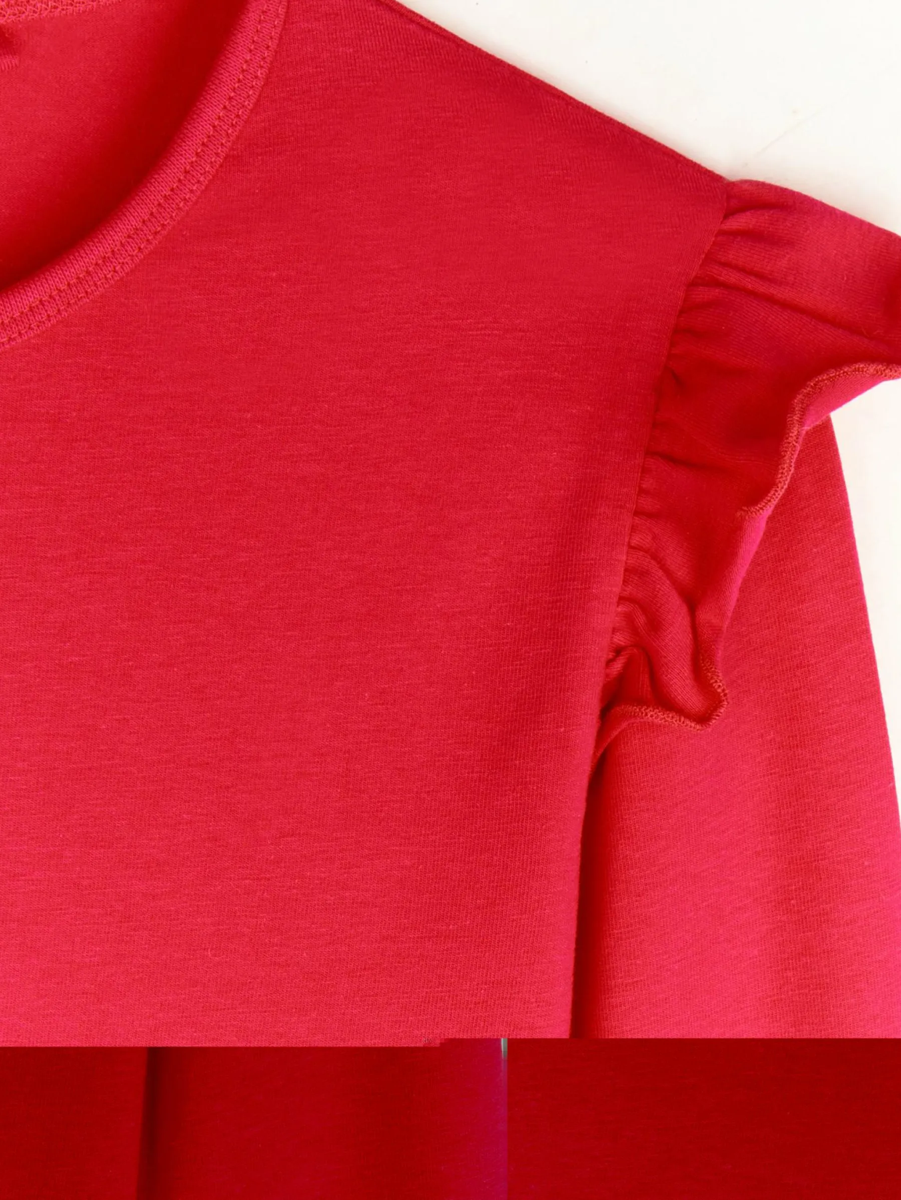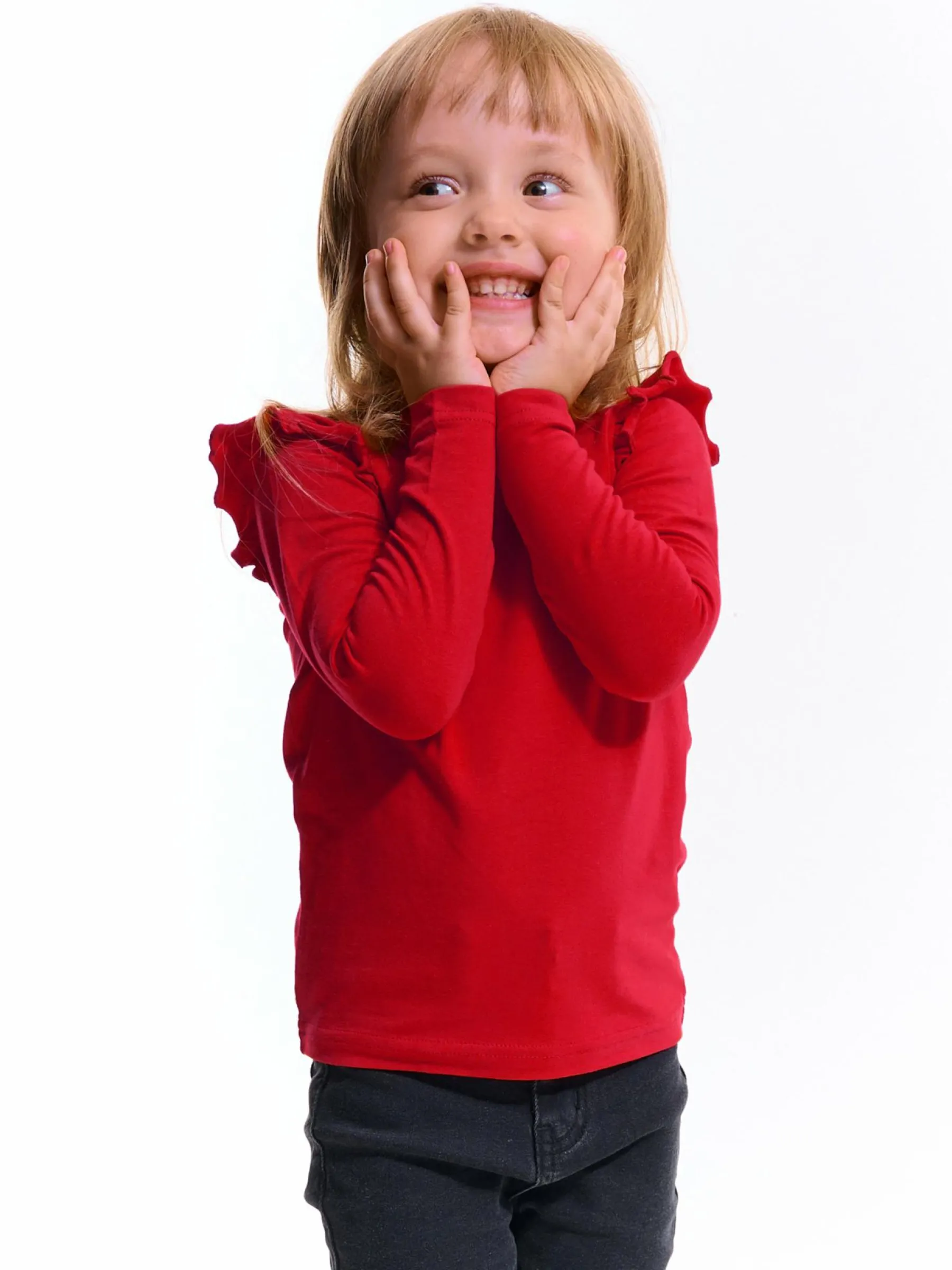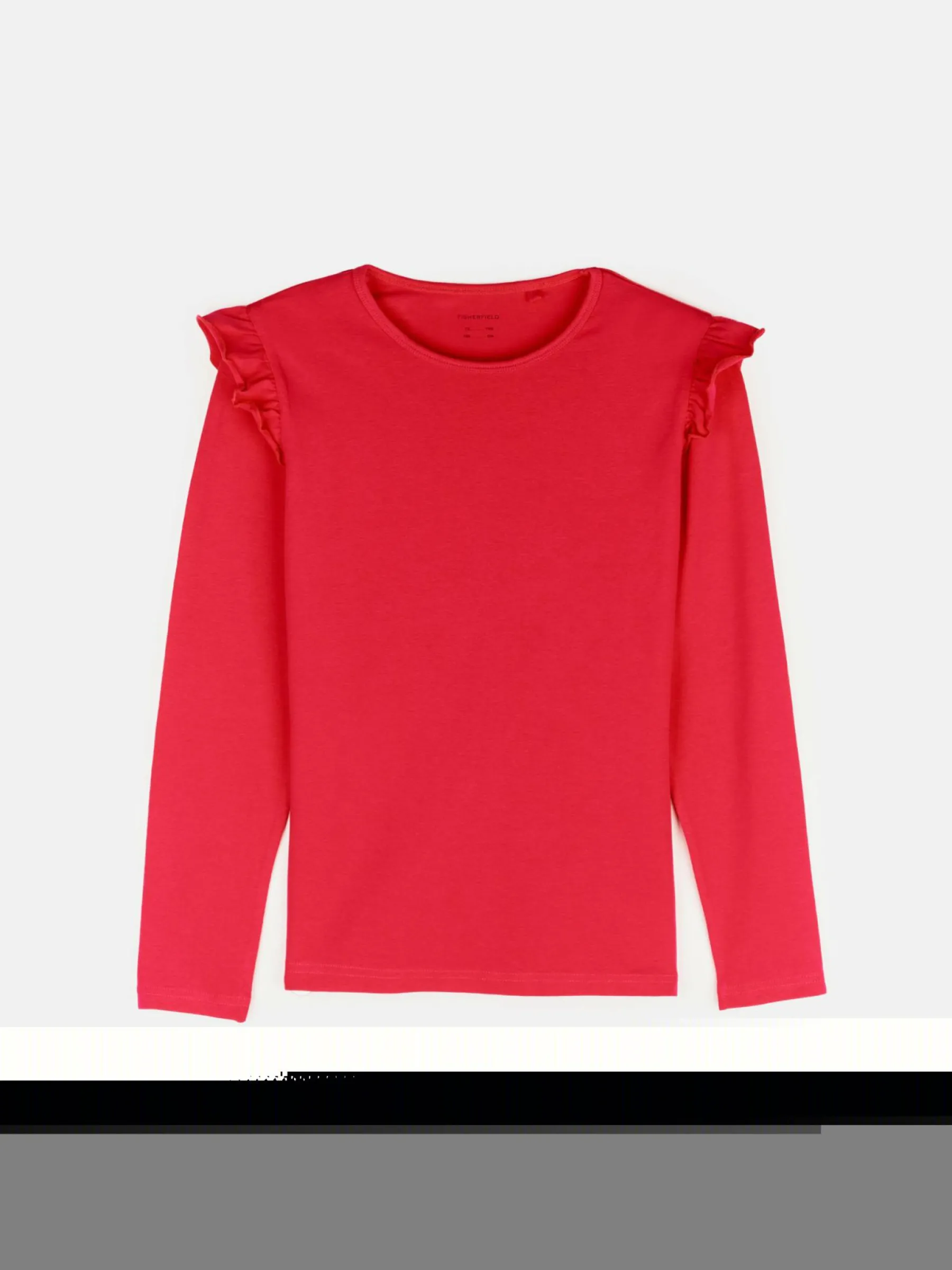Kolor: czerwonyKrój: z falbanąTyp: koszulkaRekaw: długi rękawDługość: krótkiPattern style: pojedynczy kolorDetal…