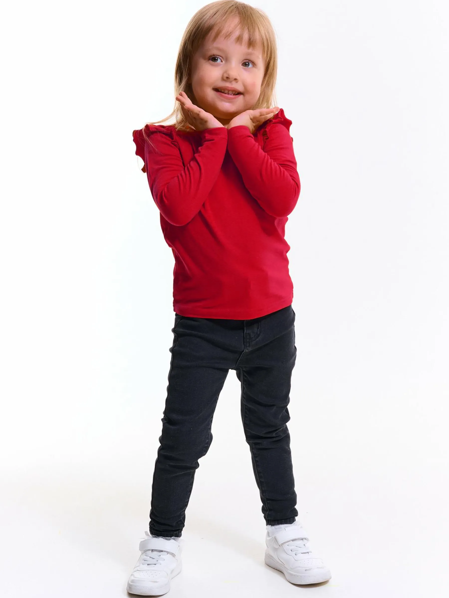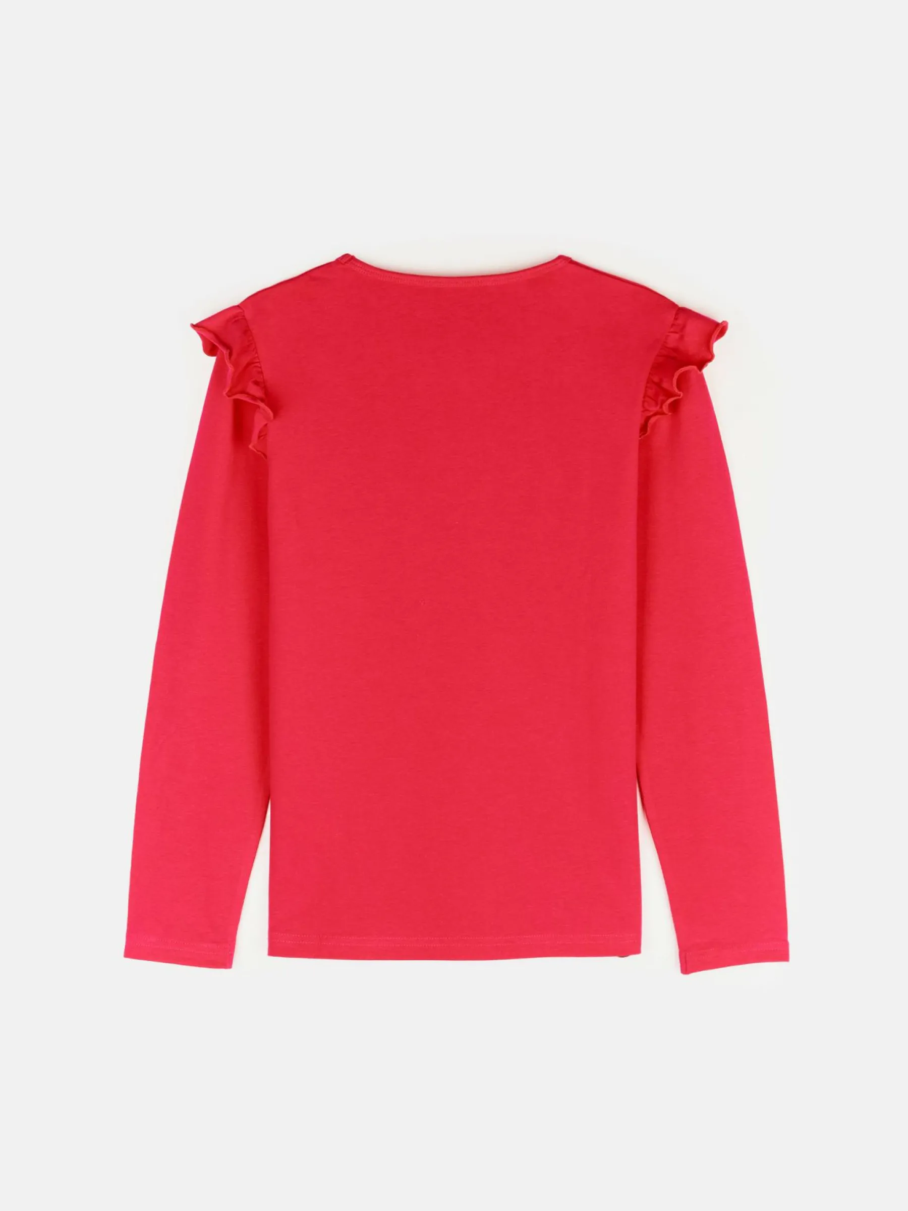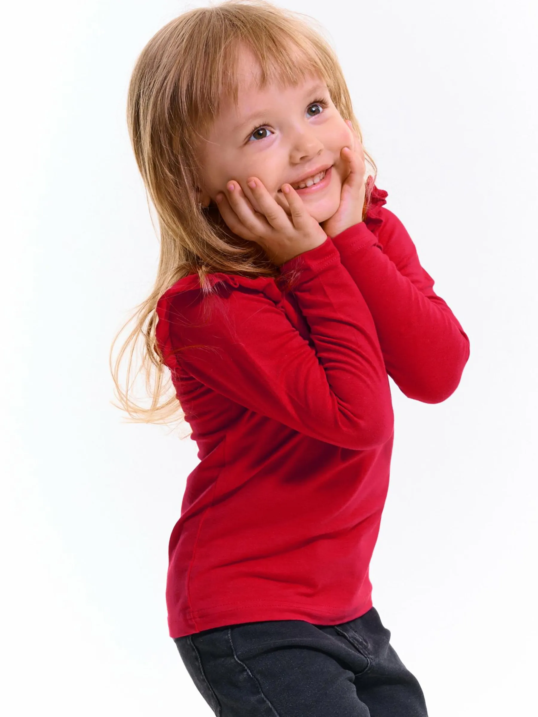 Kolor: czerwonyKrój: z falbanąTyp: koszulkaRekaw: długi rękawDługość: krótkiPattern style: pojedynczy kolorDetal…