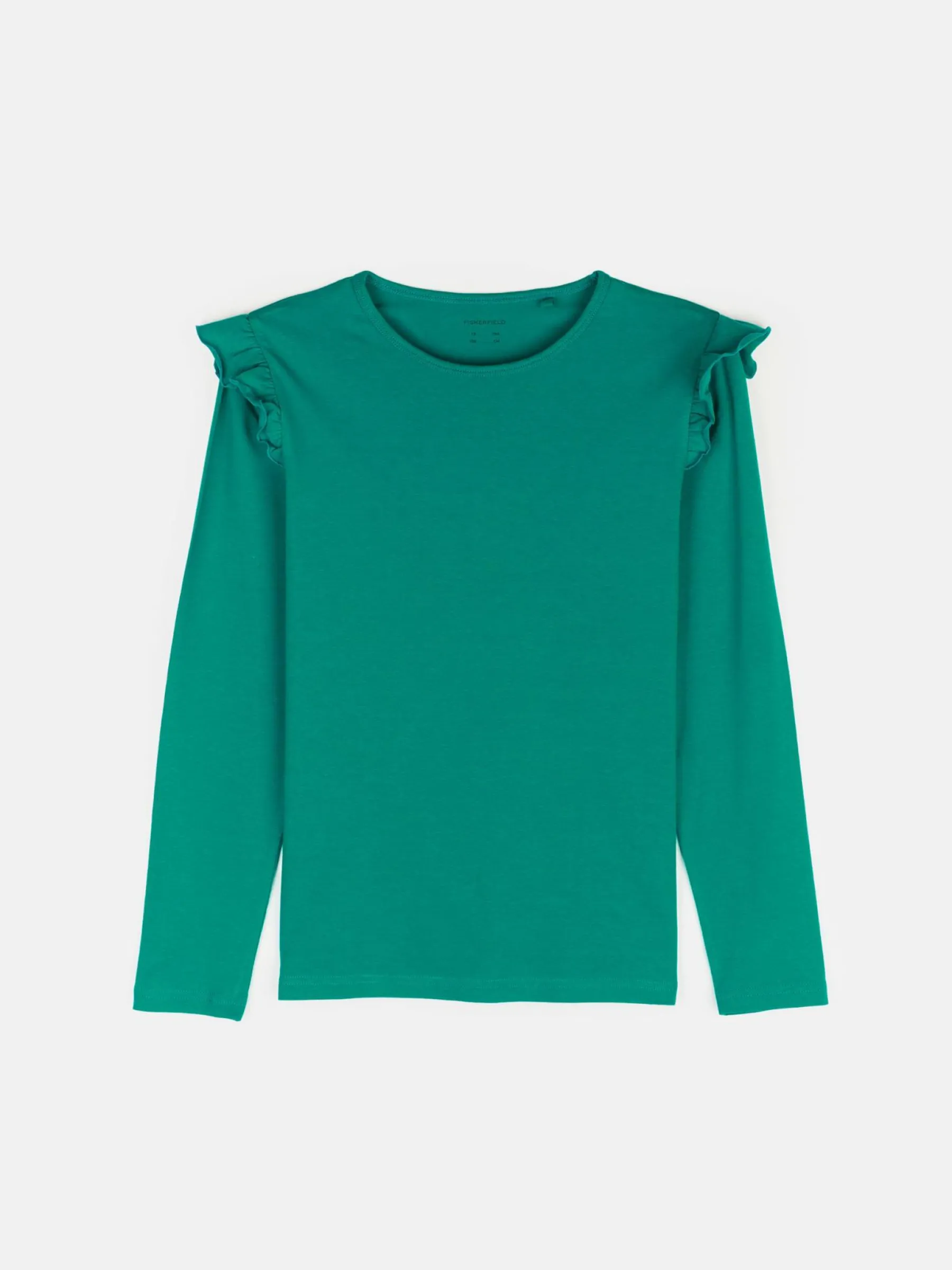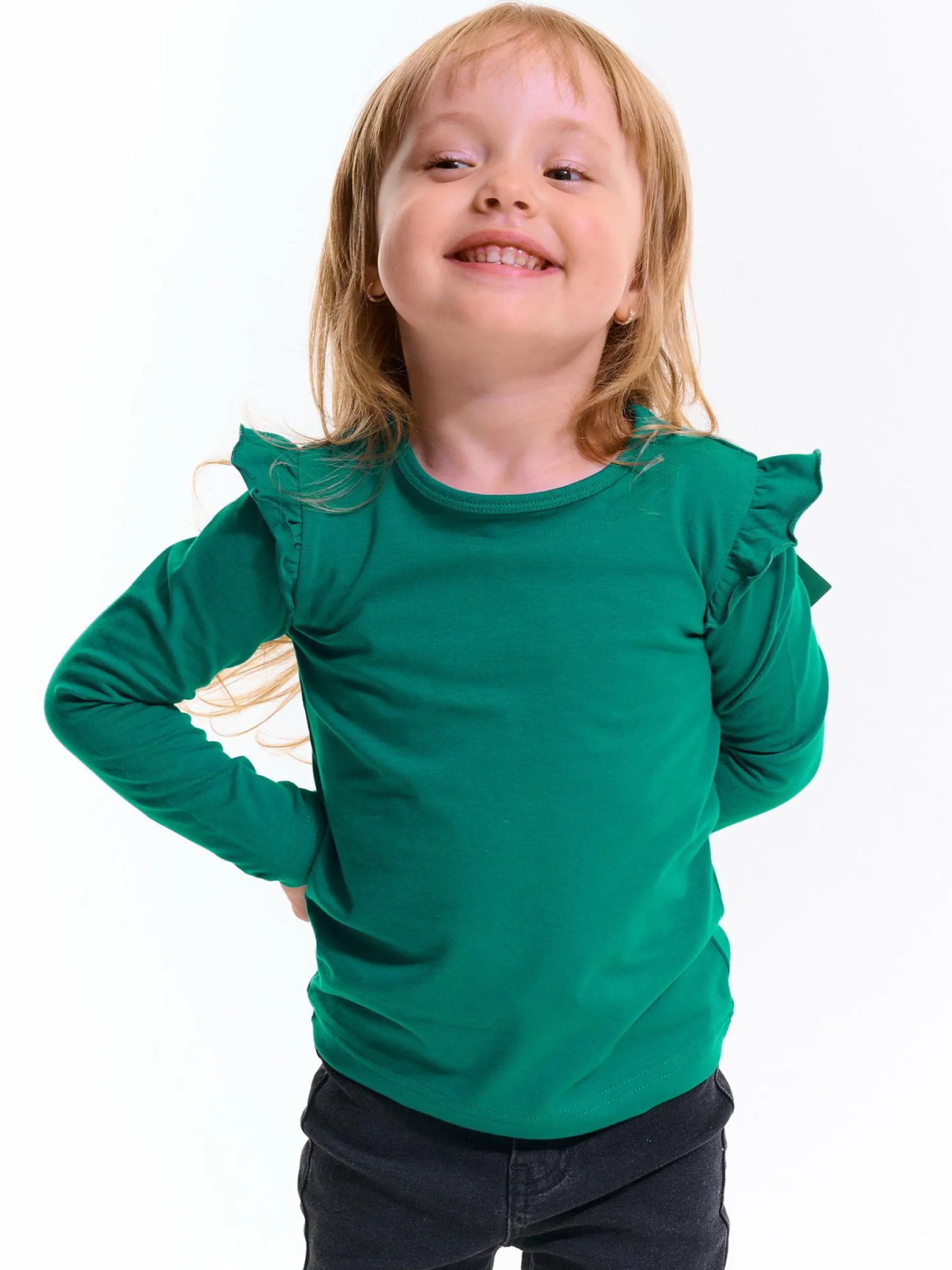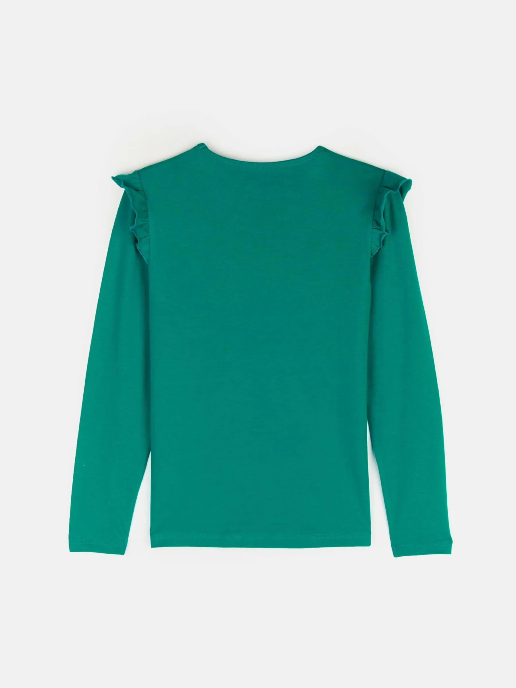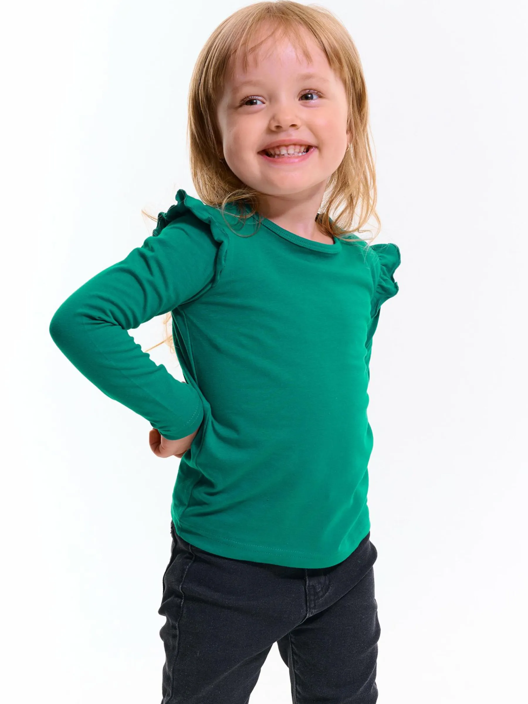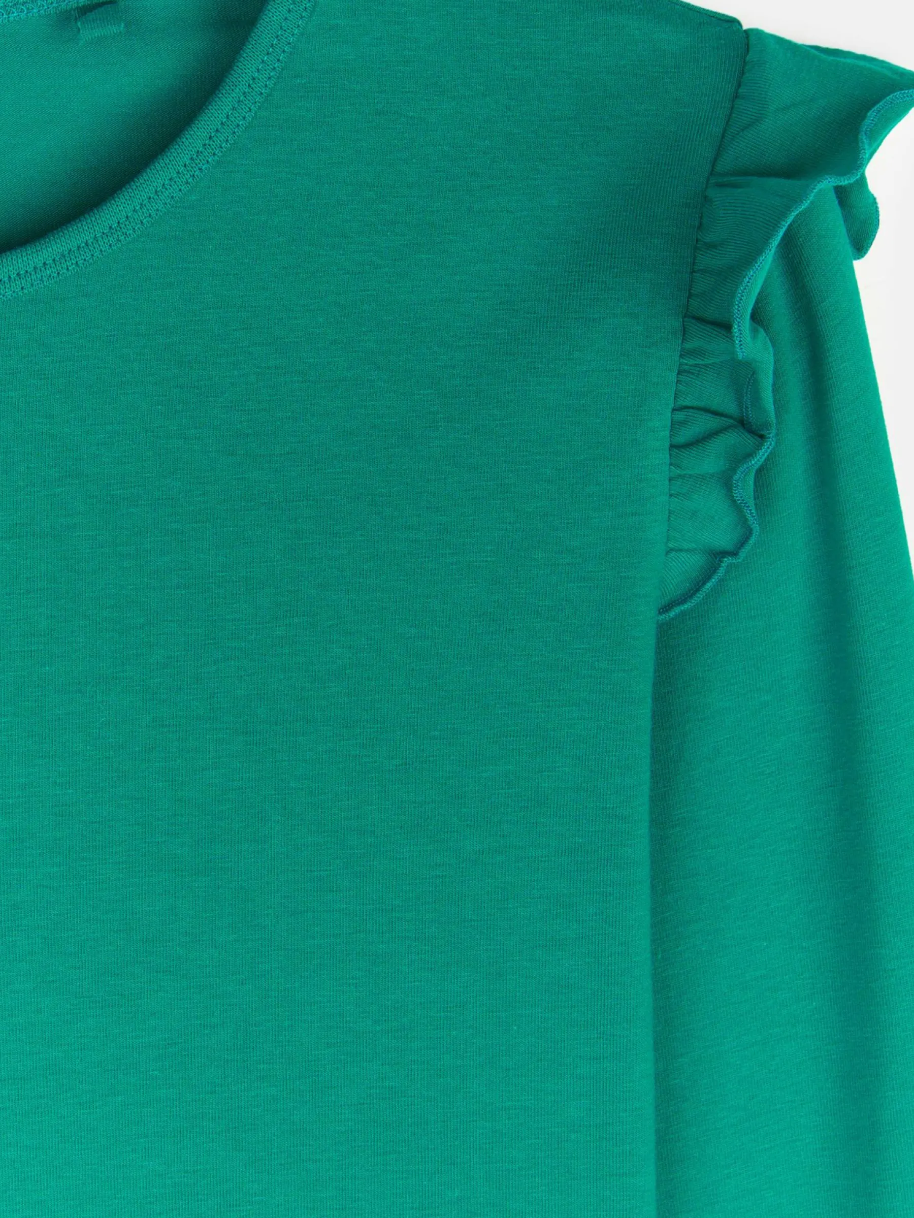 Kolor: zielonyKrój: z falbanąTyp: koszulkaRekaw: długi rękawDługość: krótkiPattern style: pojedynczy kolorDetal:…