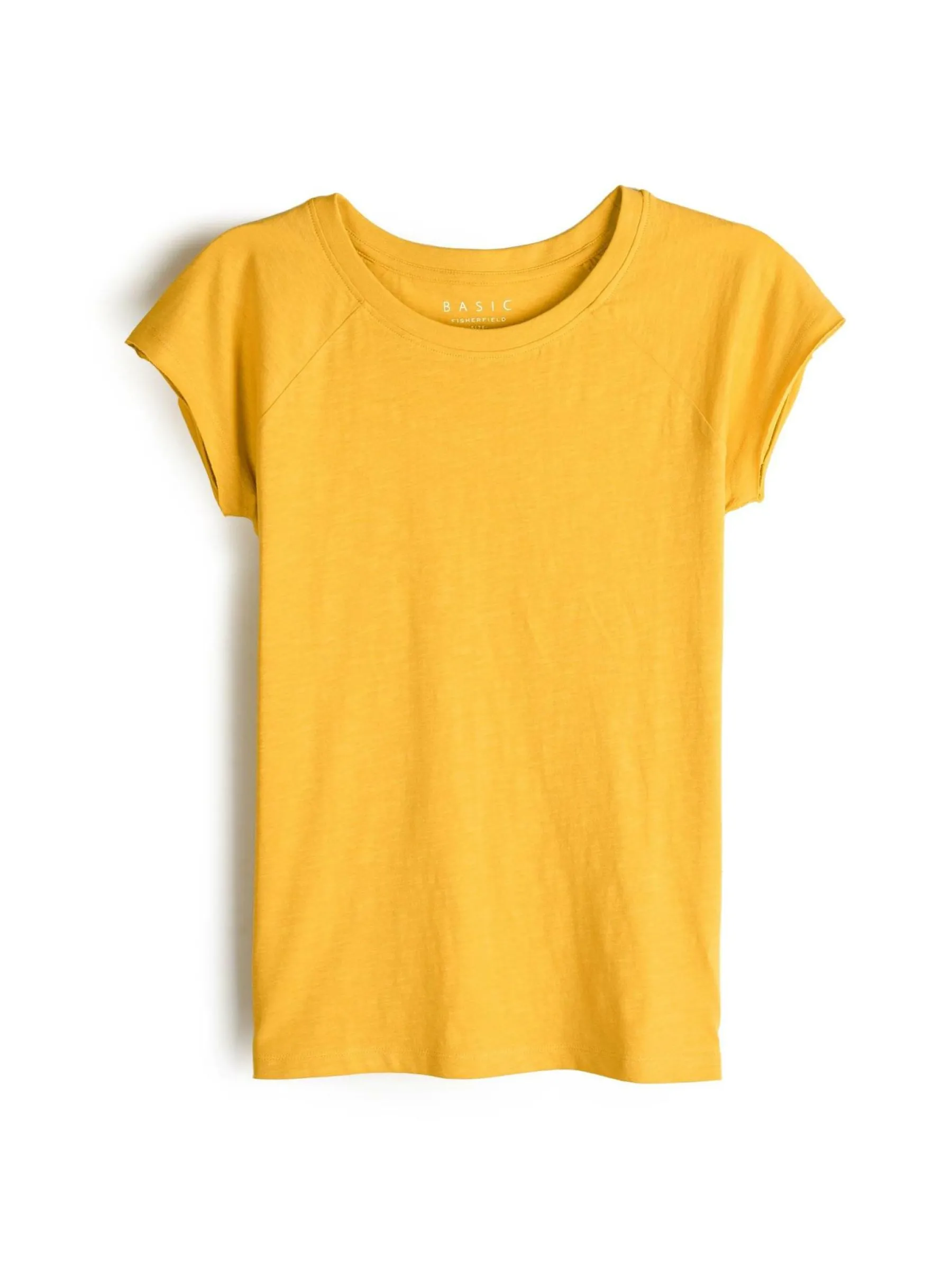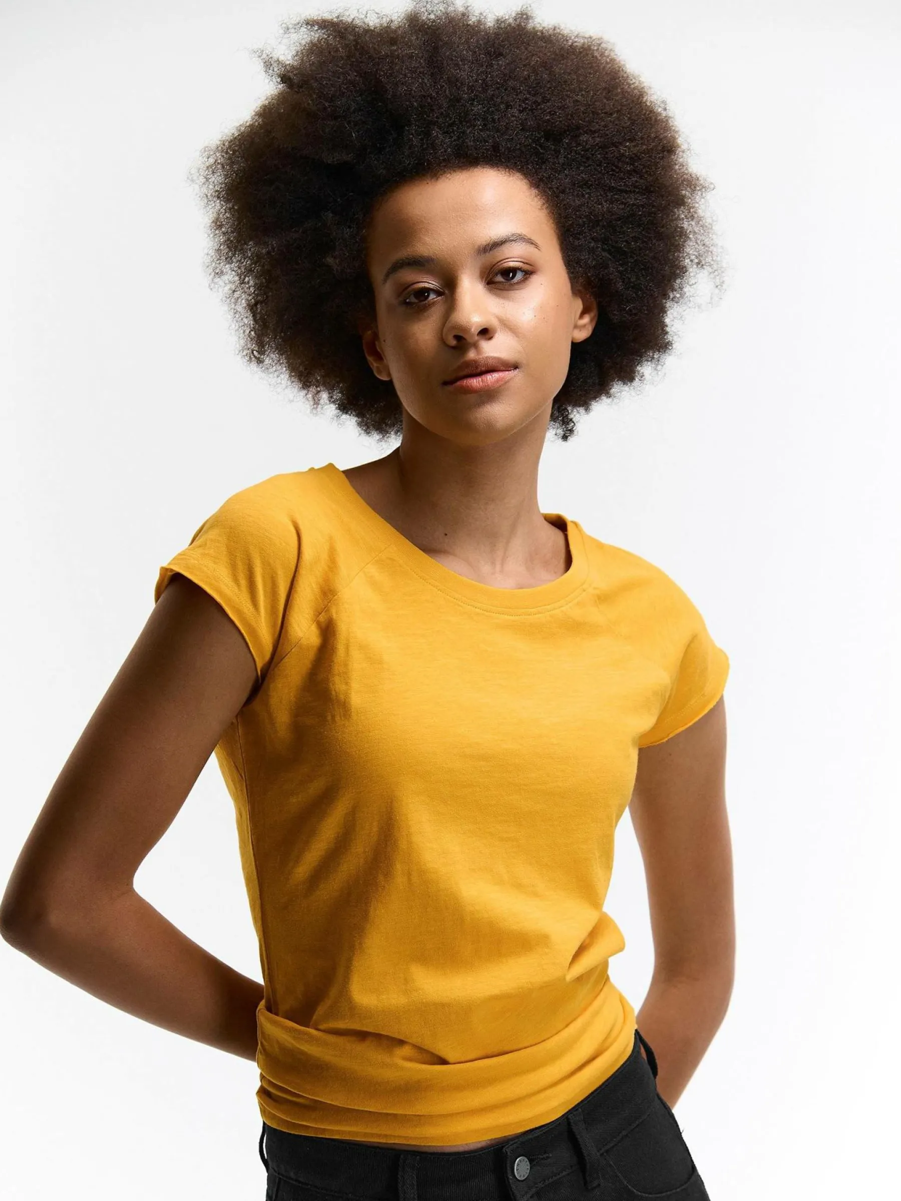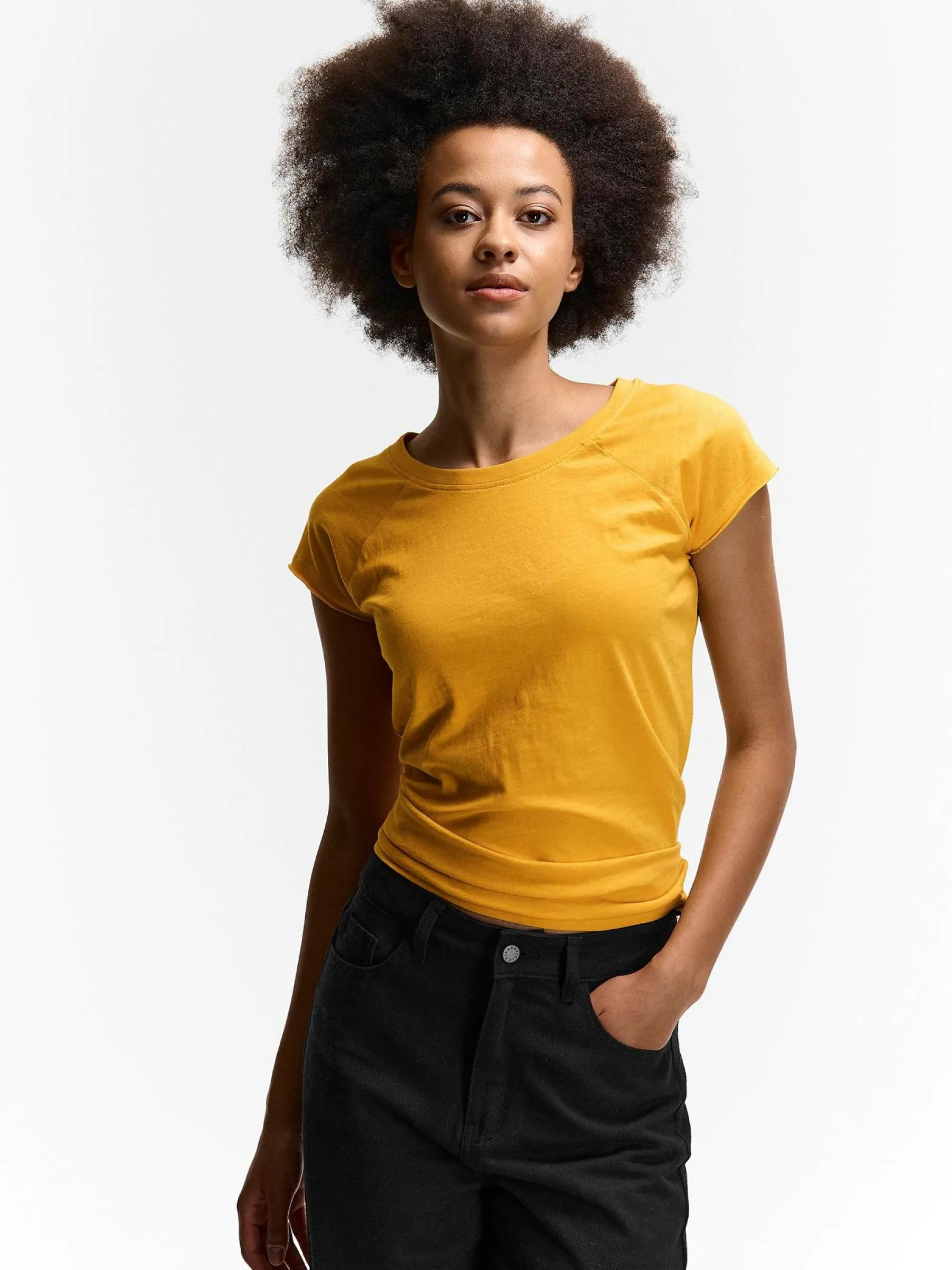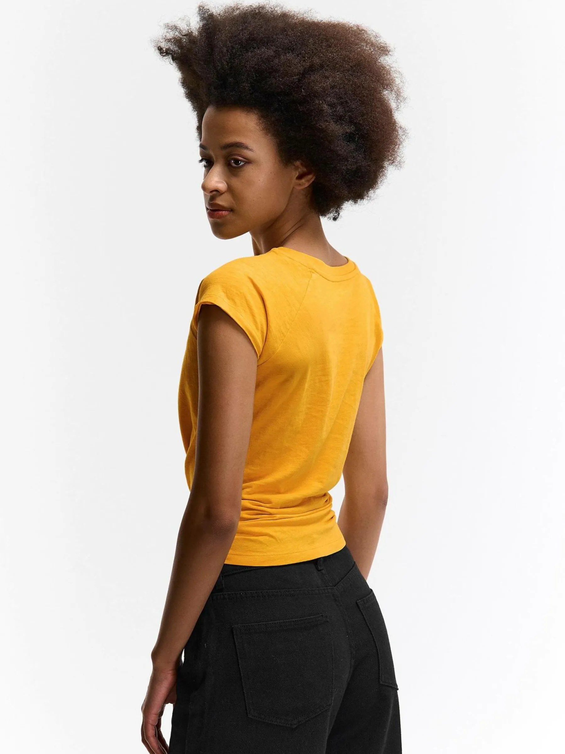 Kolor: żółtyKrój: regularTyp: koszulkaRekaw: krótki rękawDługość: krótkiPattern style: pojedynczy kolorDetal: …