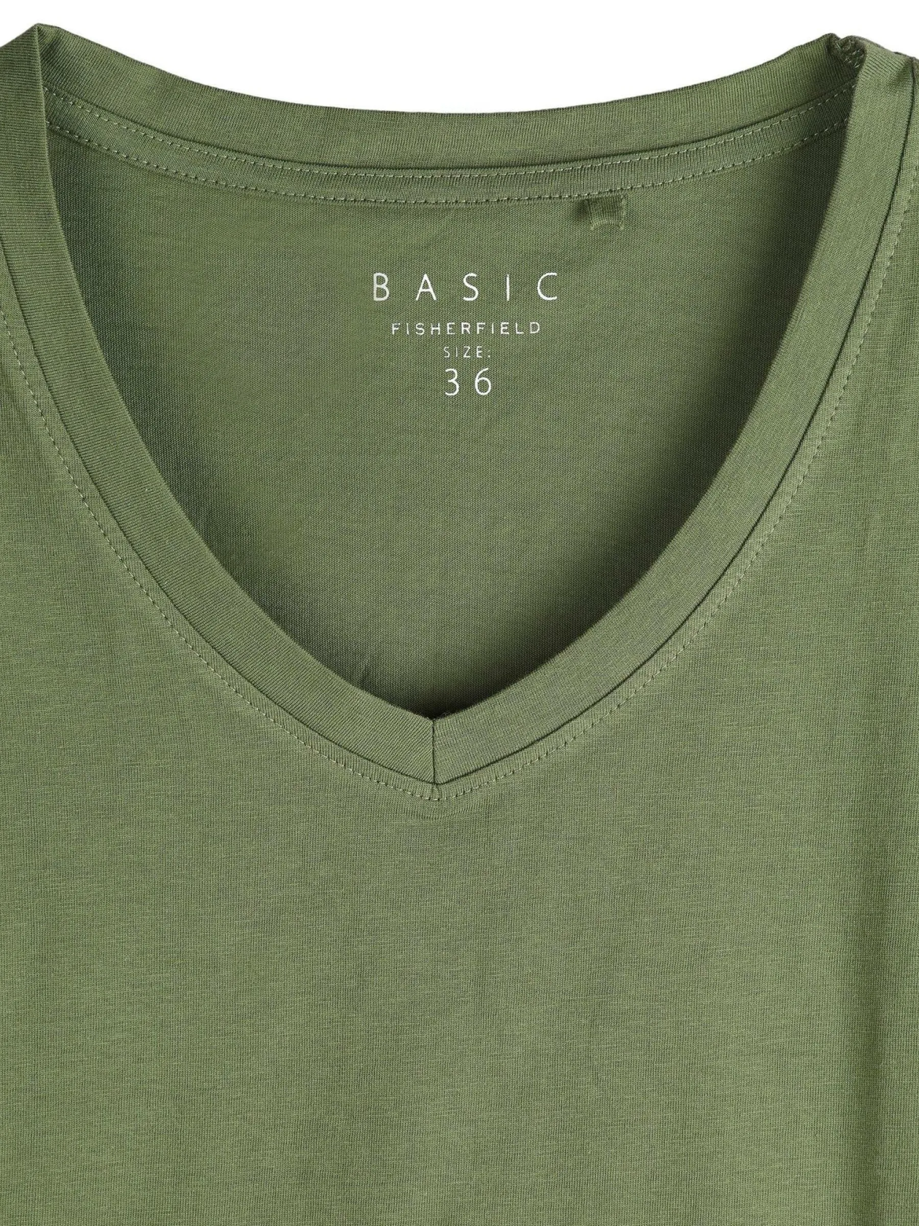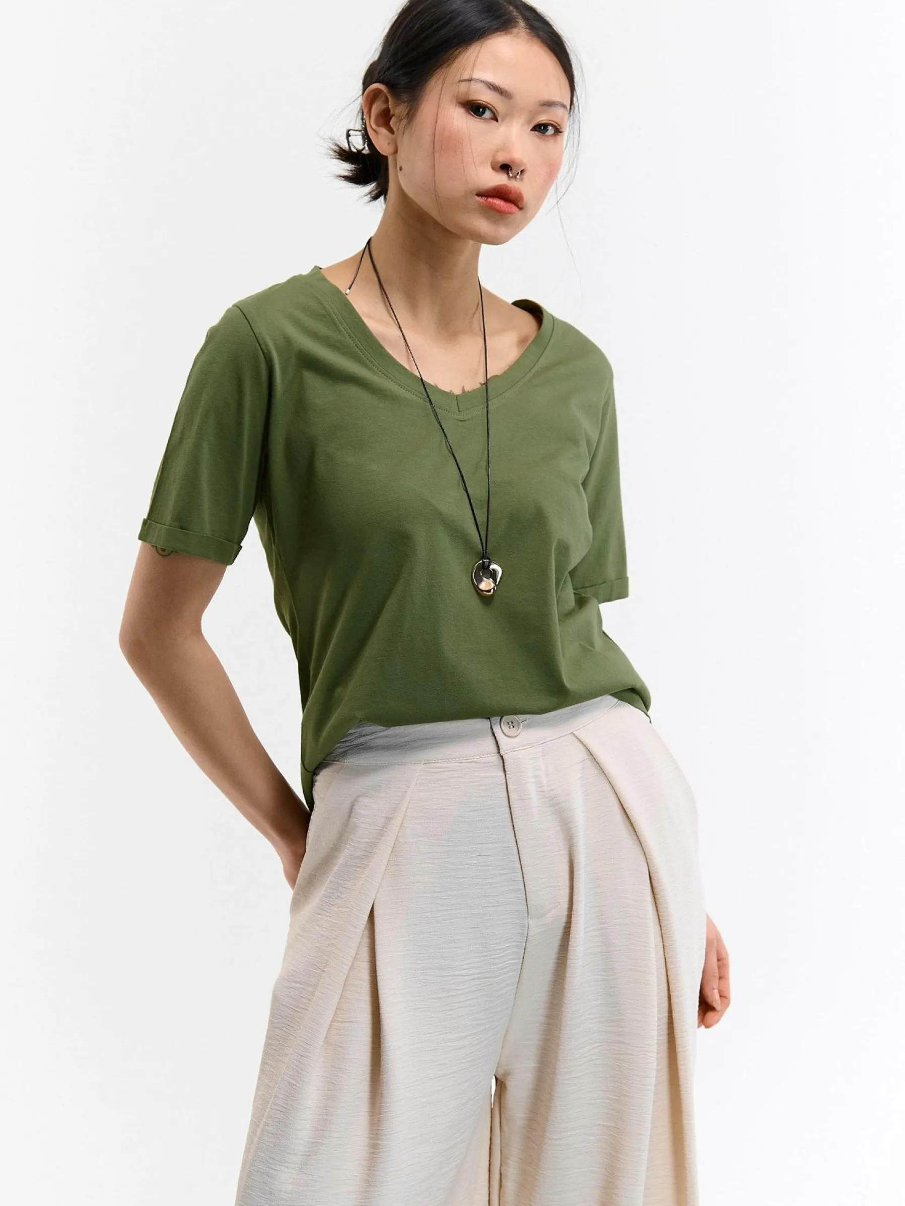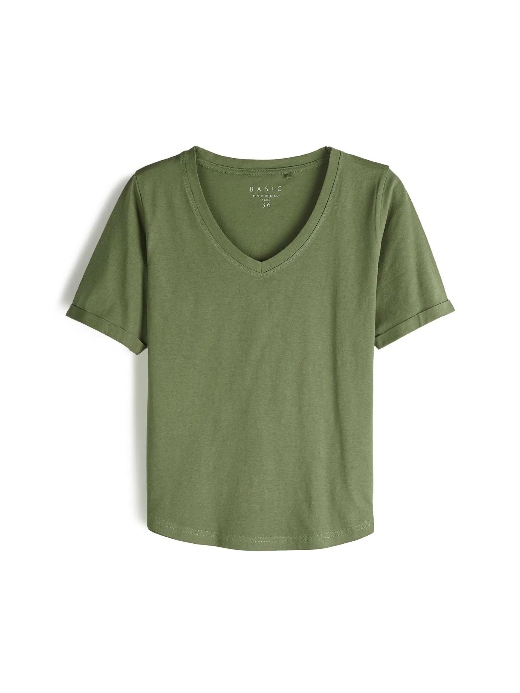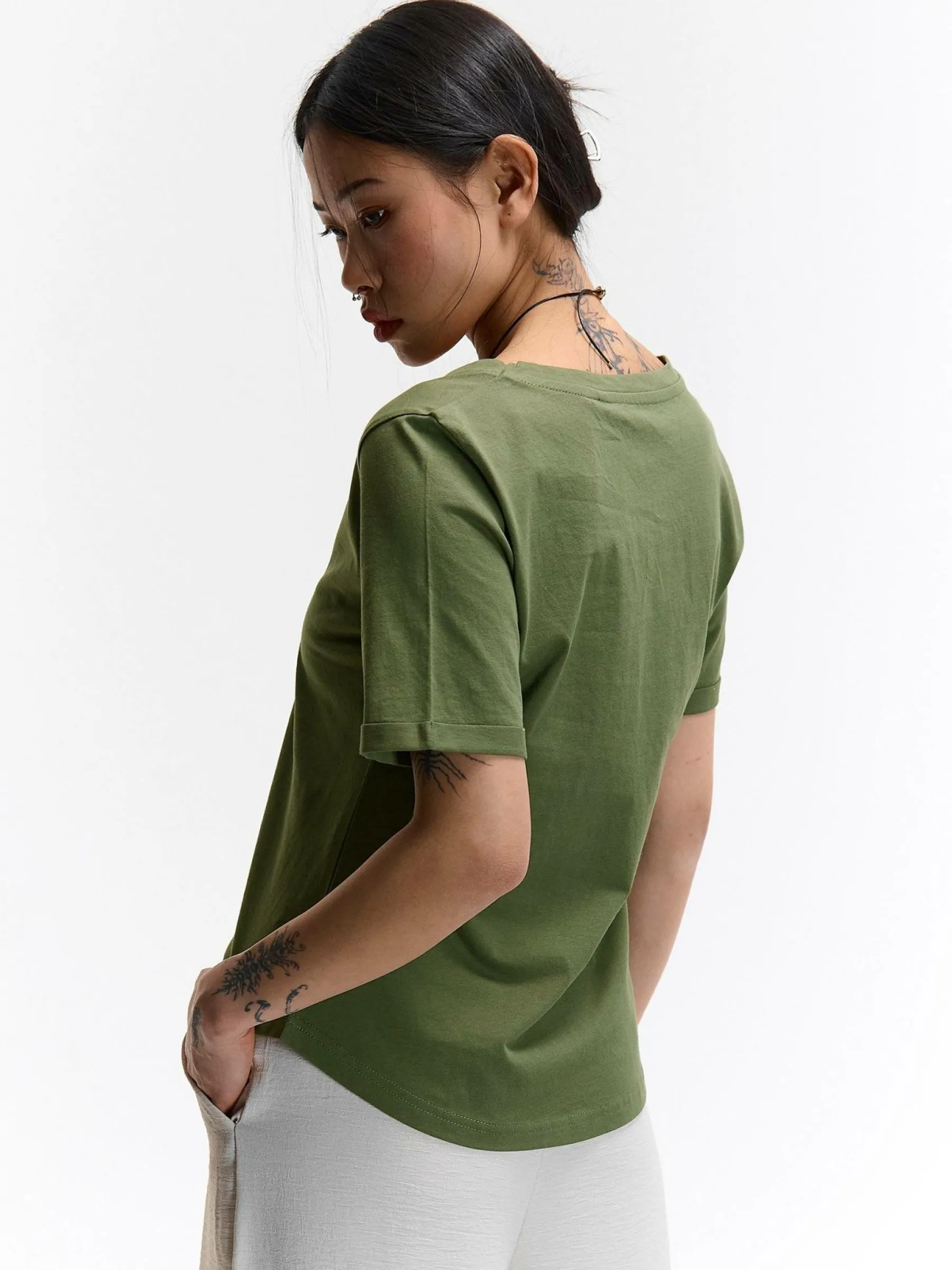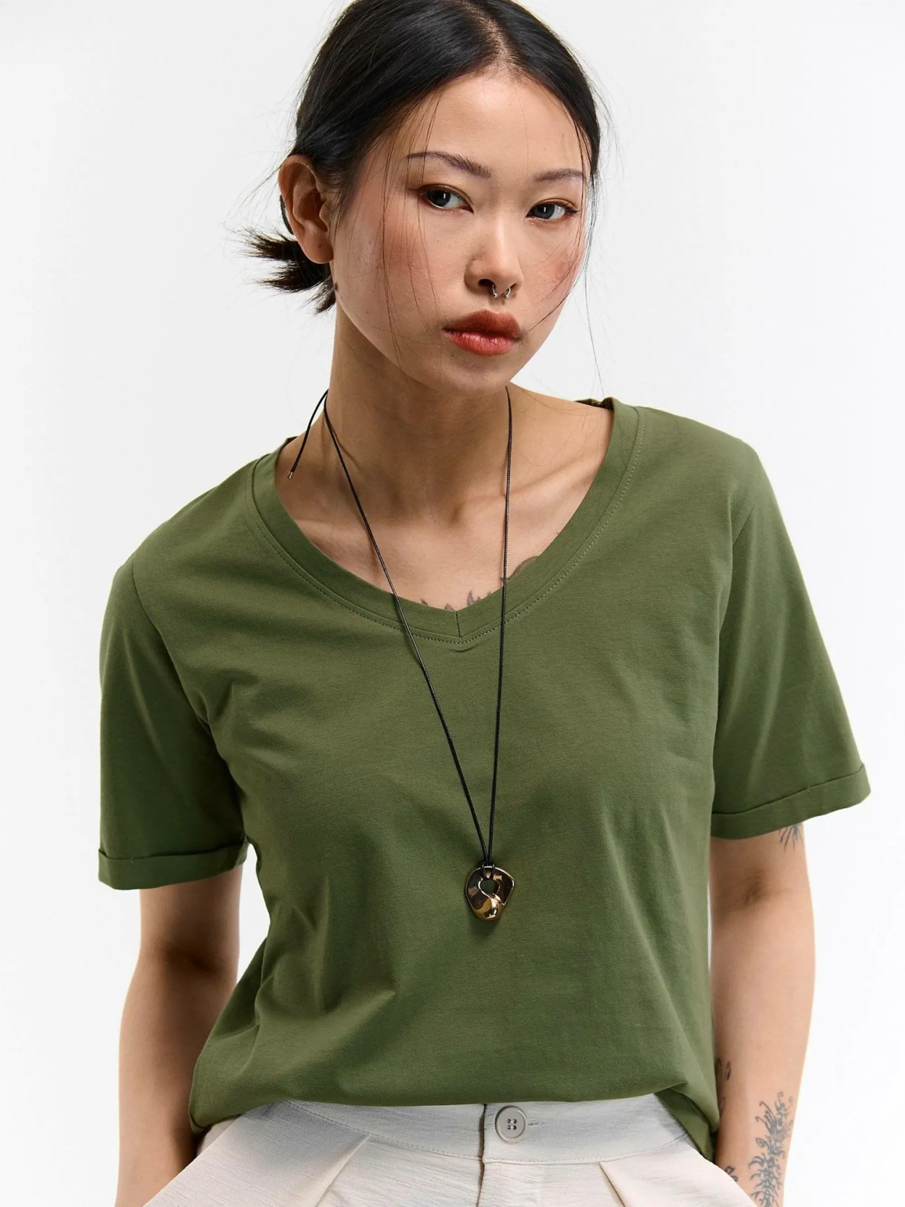 Kolor: khakiKrój: regularTyp: koszulkaRekaw: krótki rękawDługość: krótkiPattern style: pojedynczy kolorDetal: v-n…
