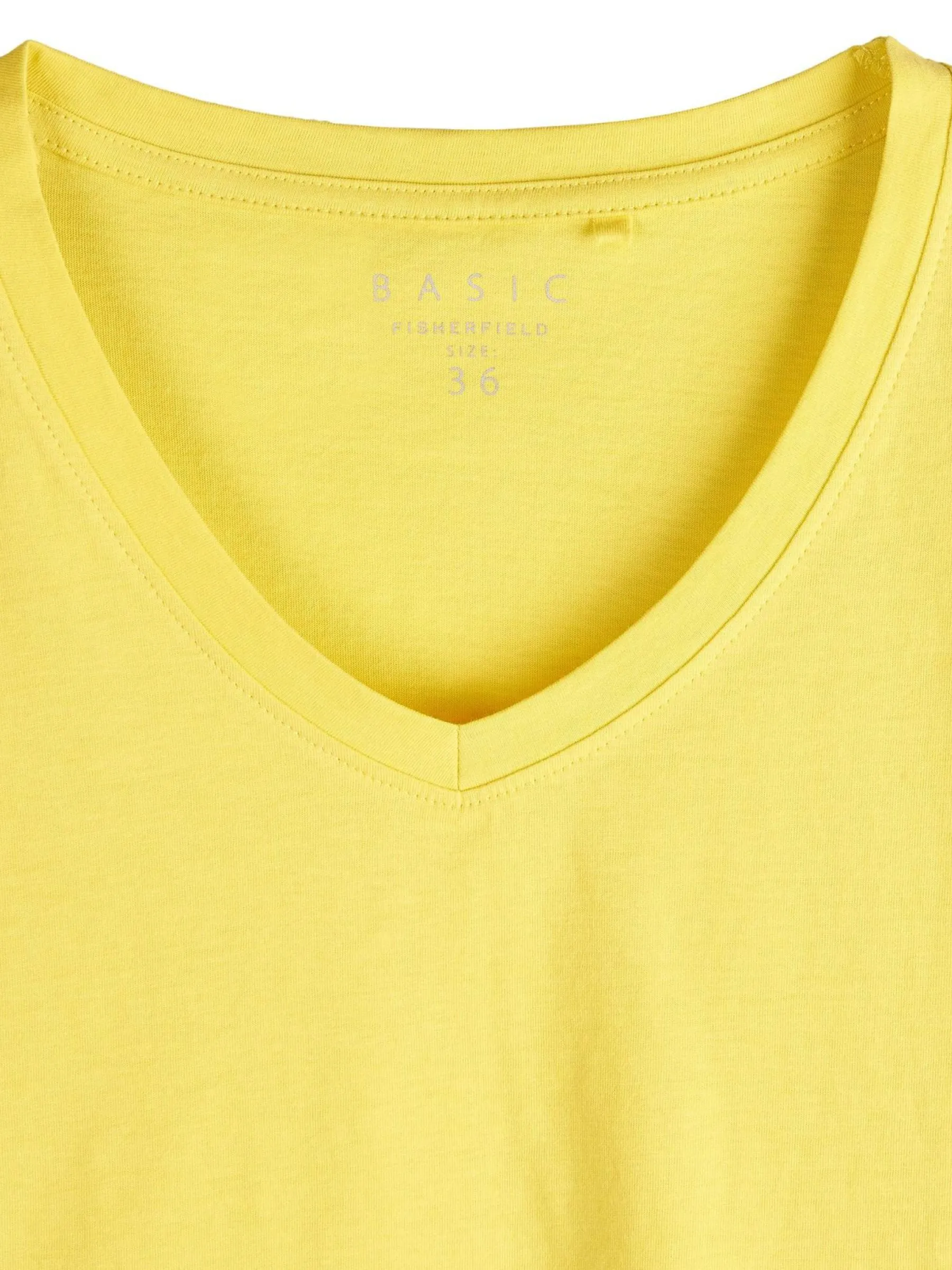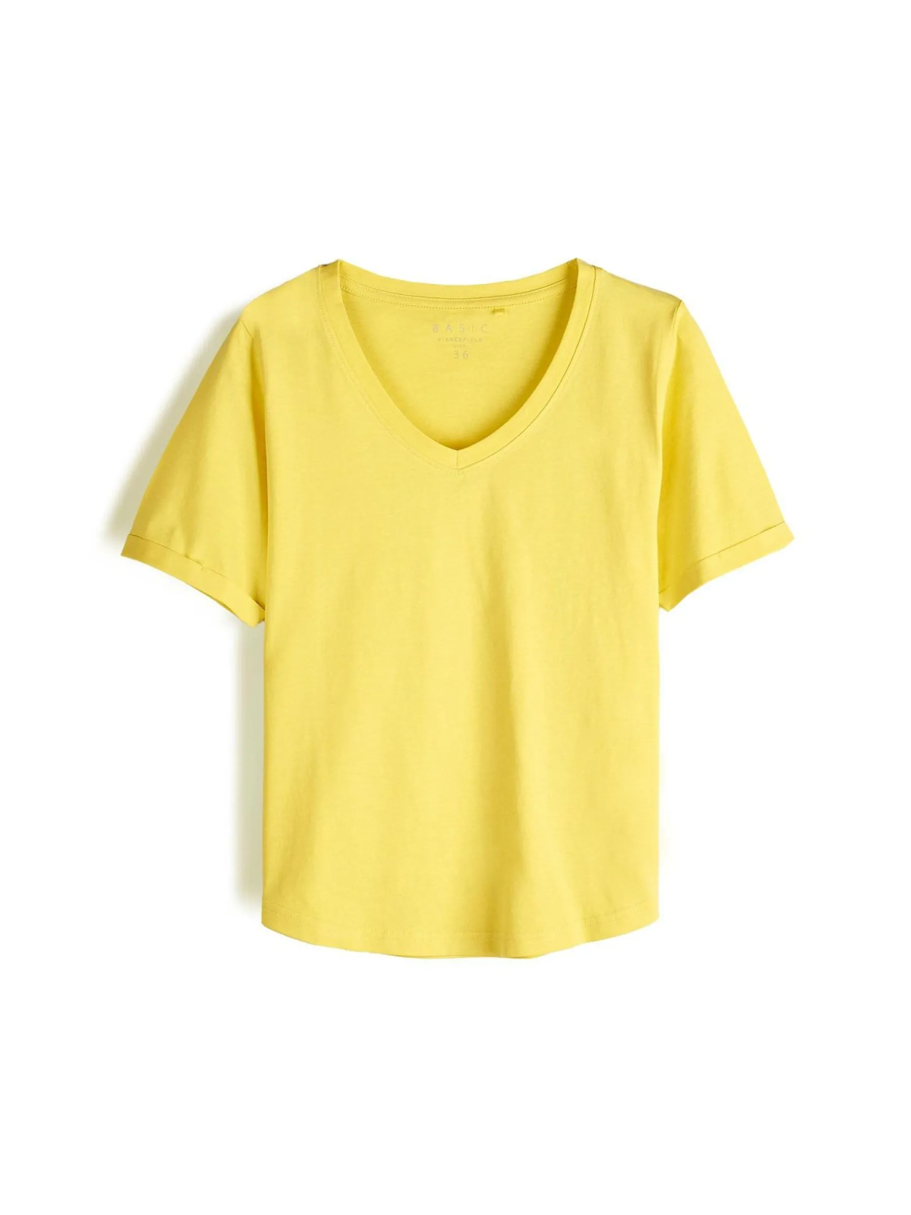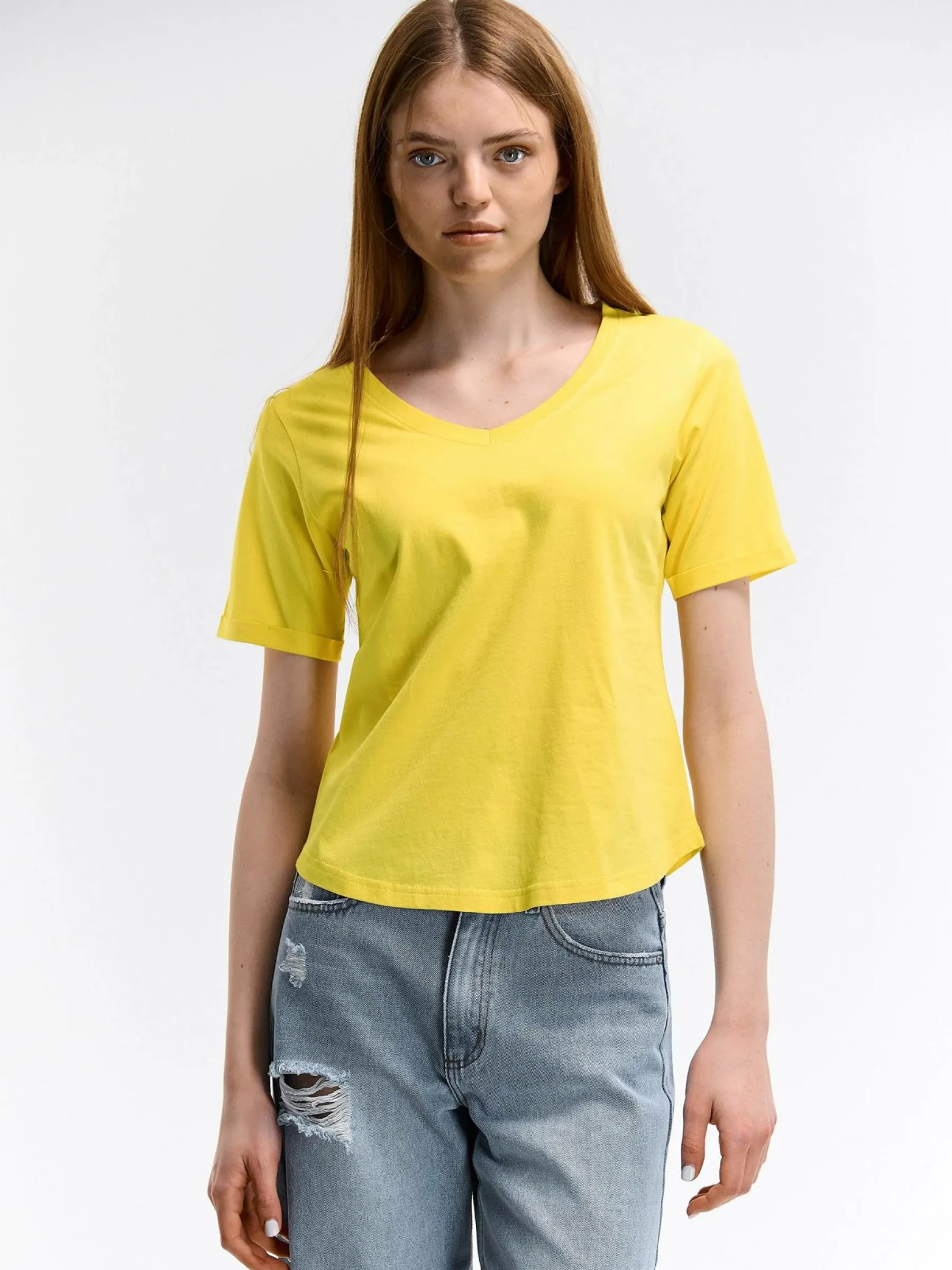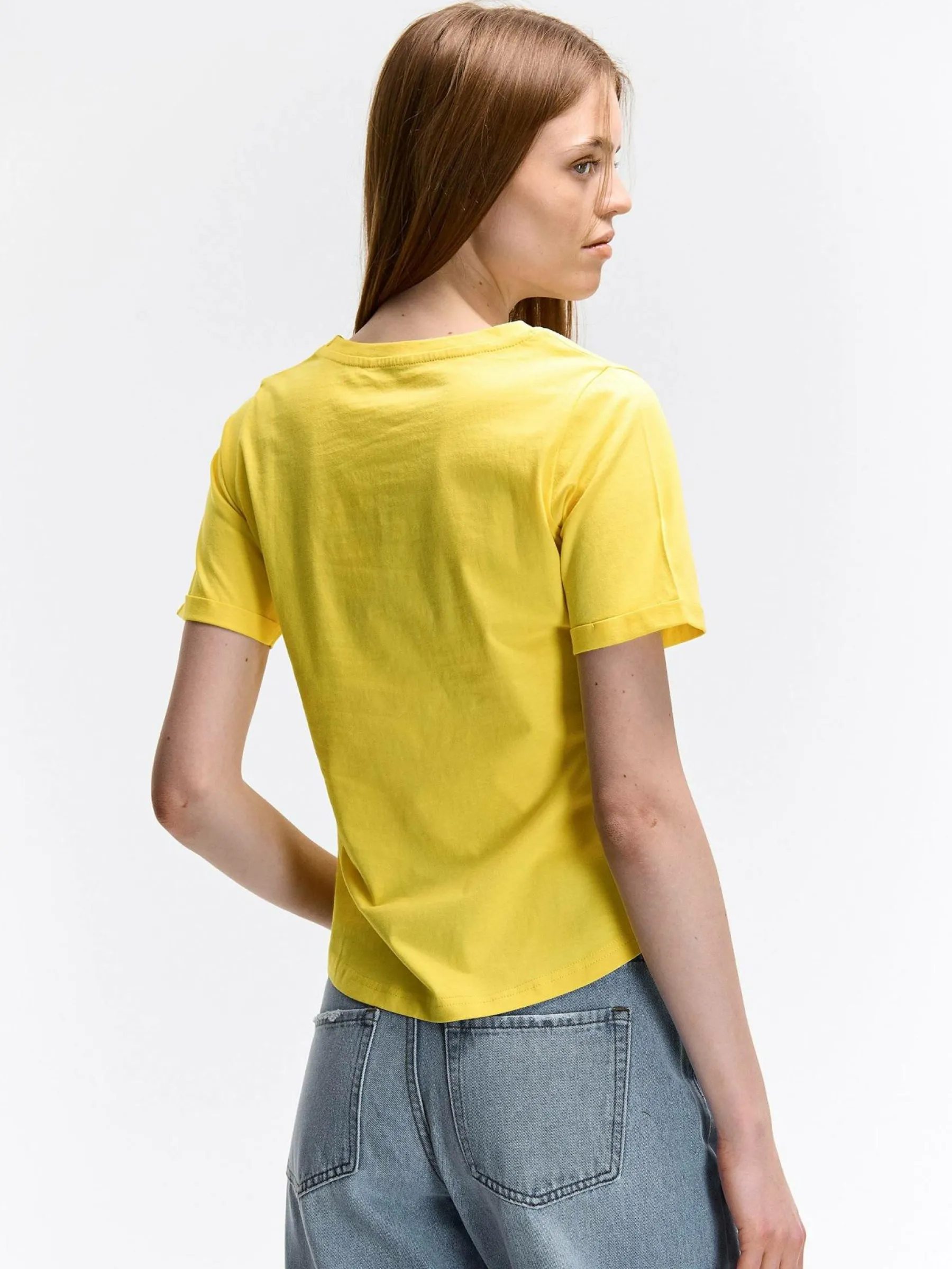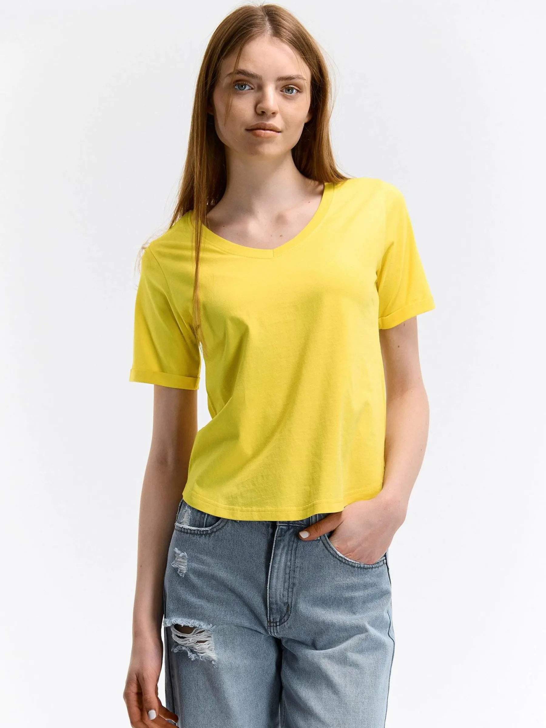 Kolor: żółtyKrój: regularTyp: koszulkaRekaw: krótki rękawDługość: krótkiPattern style: pojedynczy kolorDetal: …