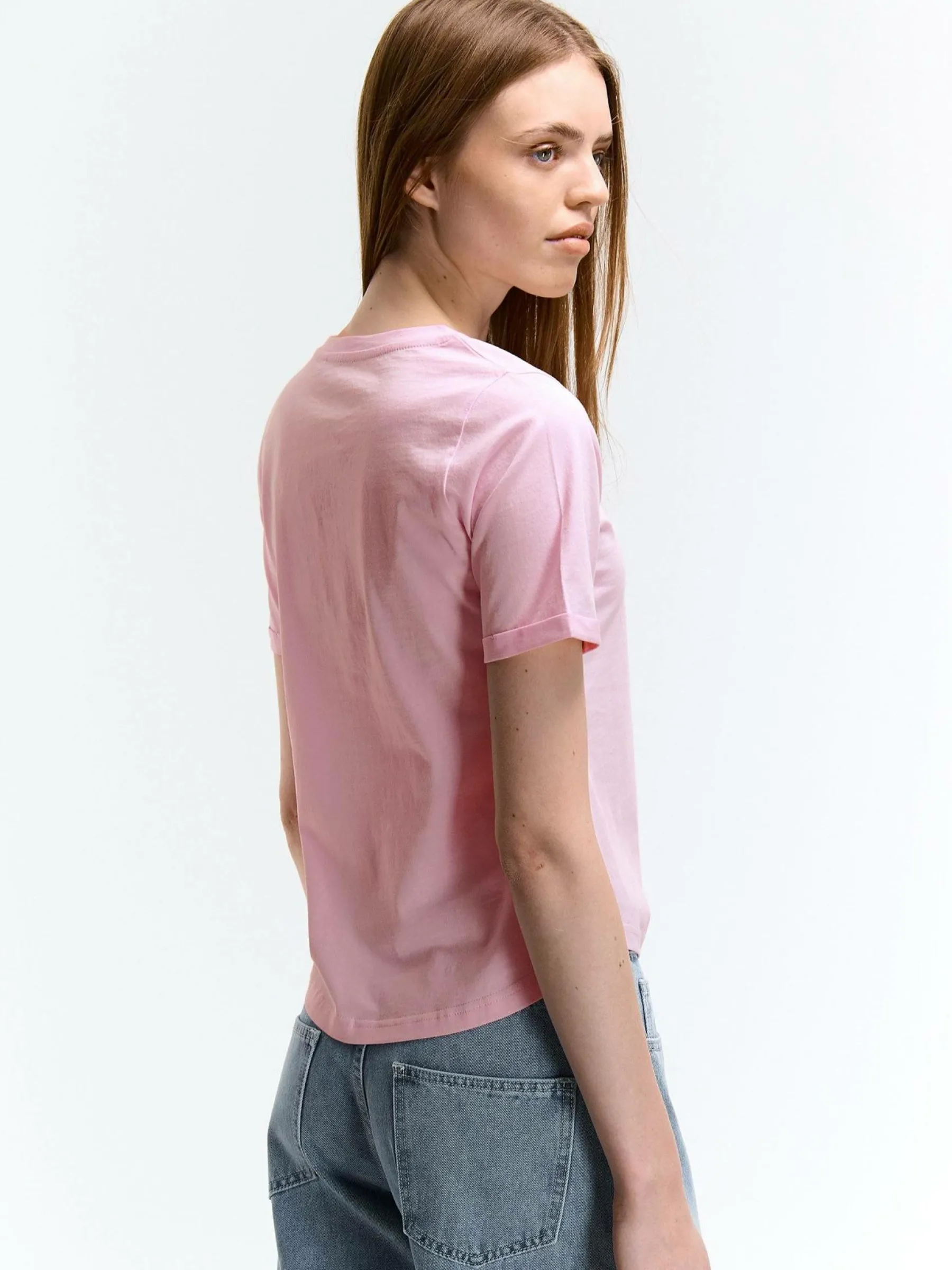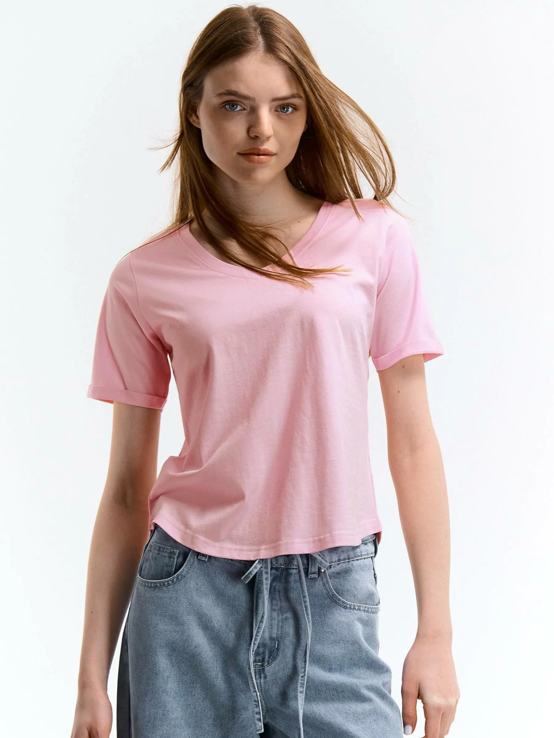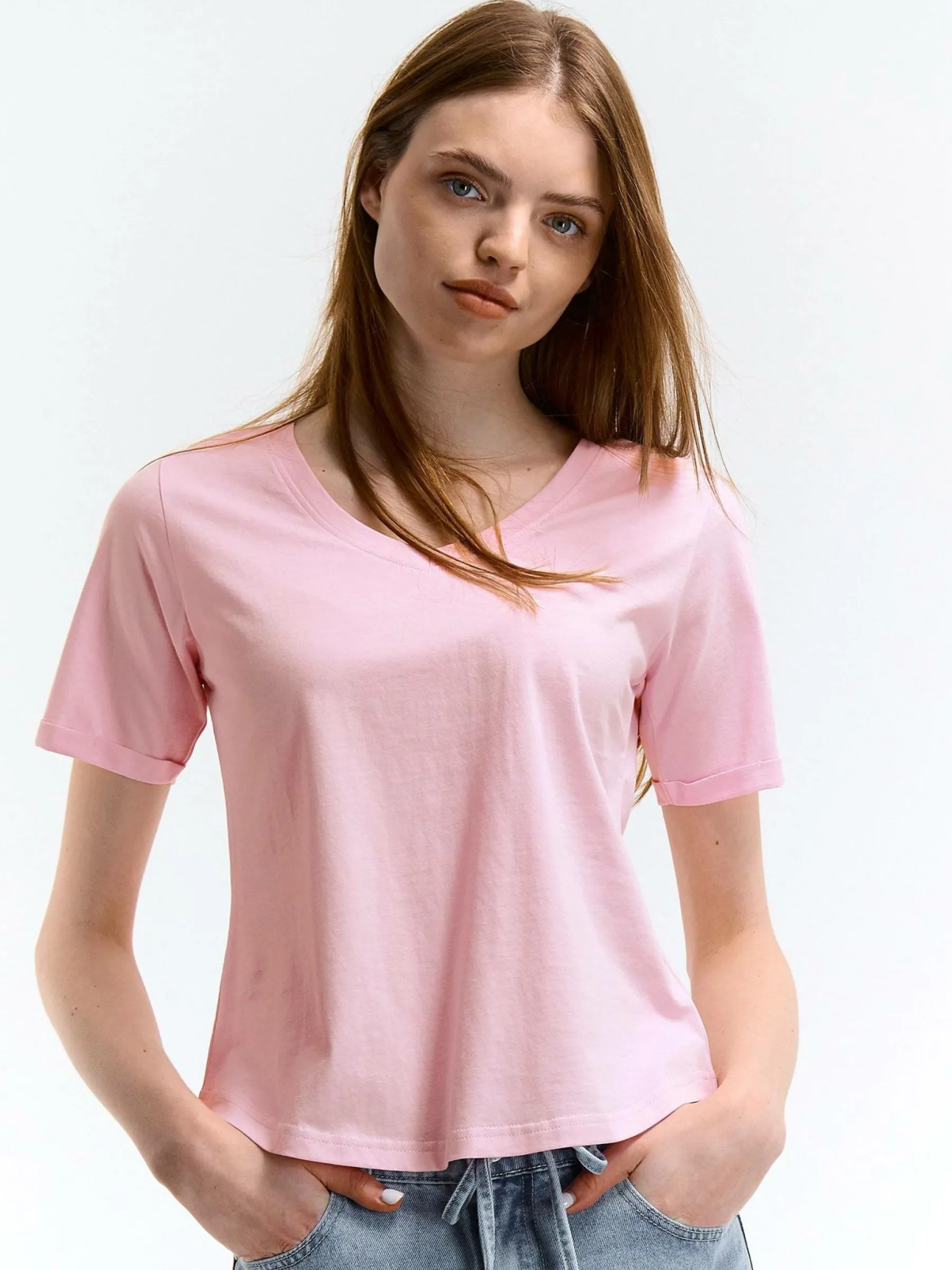 Kolor: różowyKrój: regularTyp: koszulkaRekaw: krótki rękawDługość: krótkiPattern style: pojedynczy kolorDetal: …