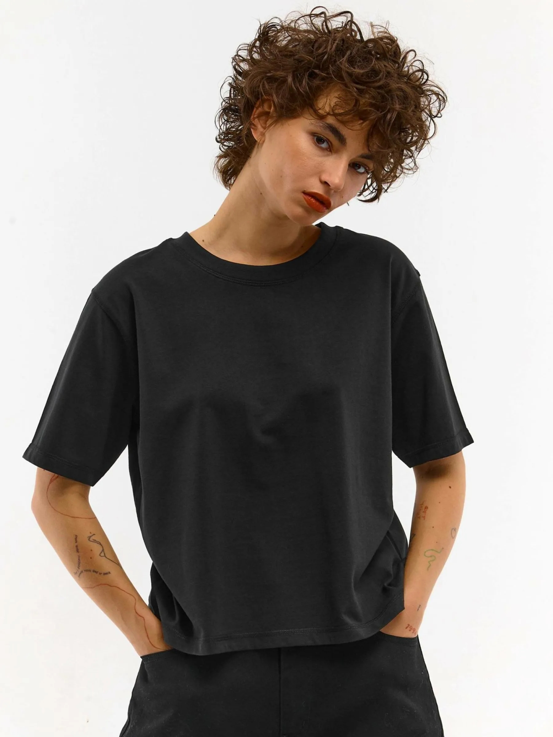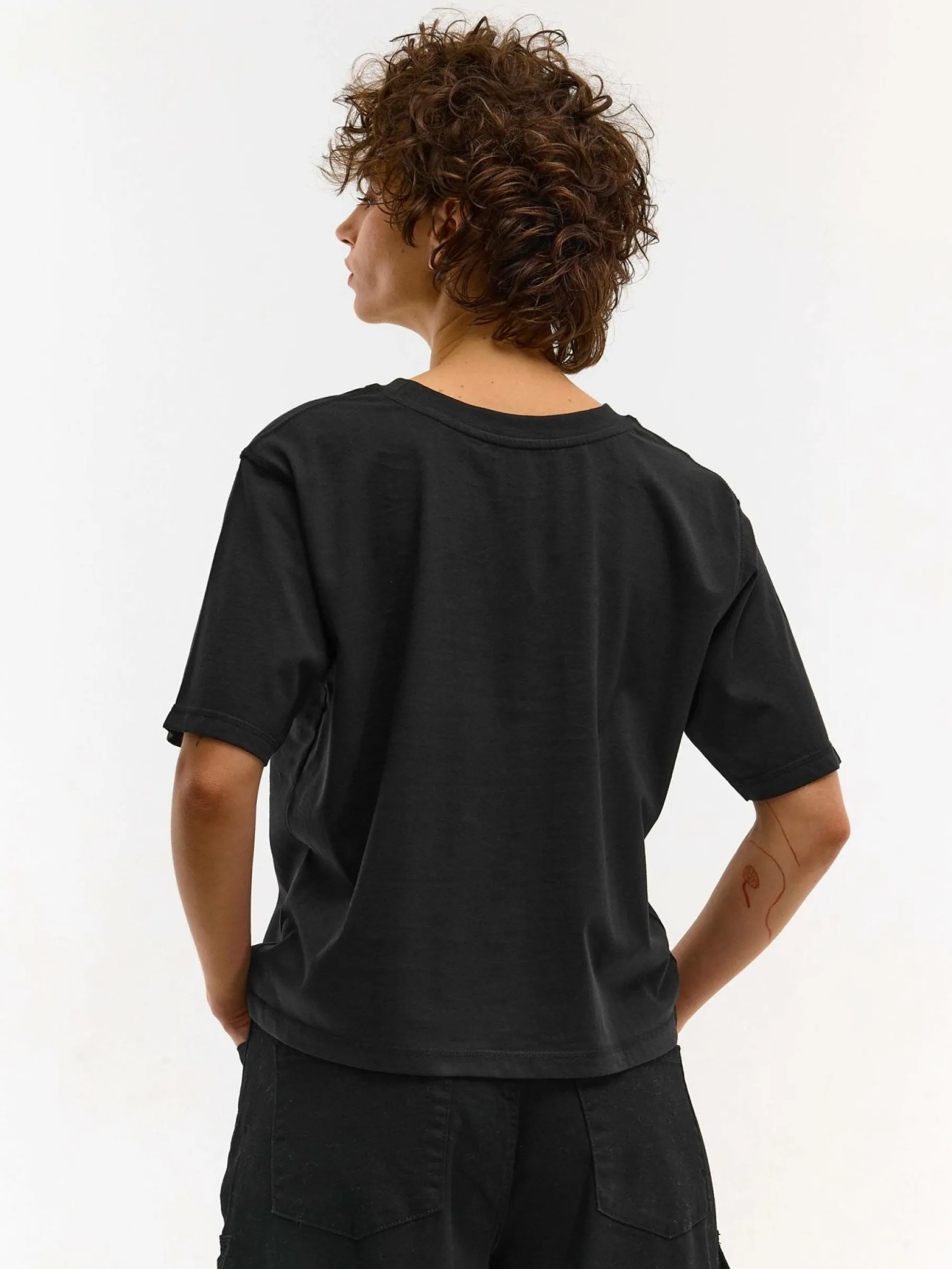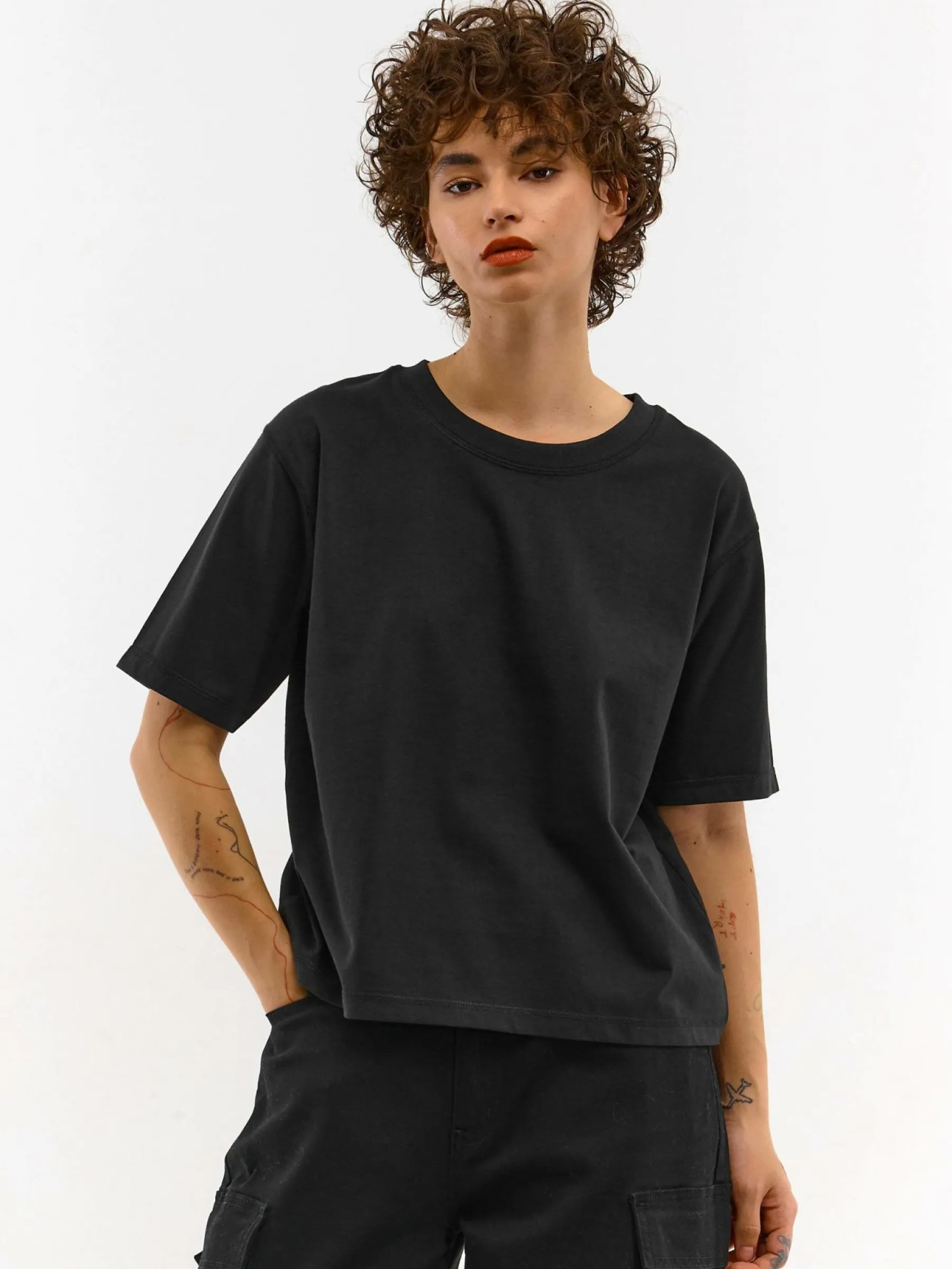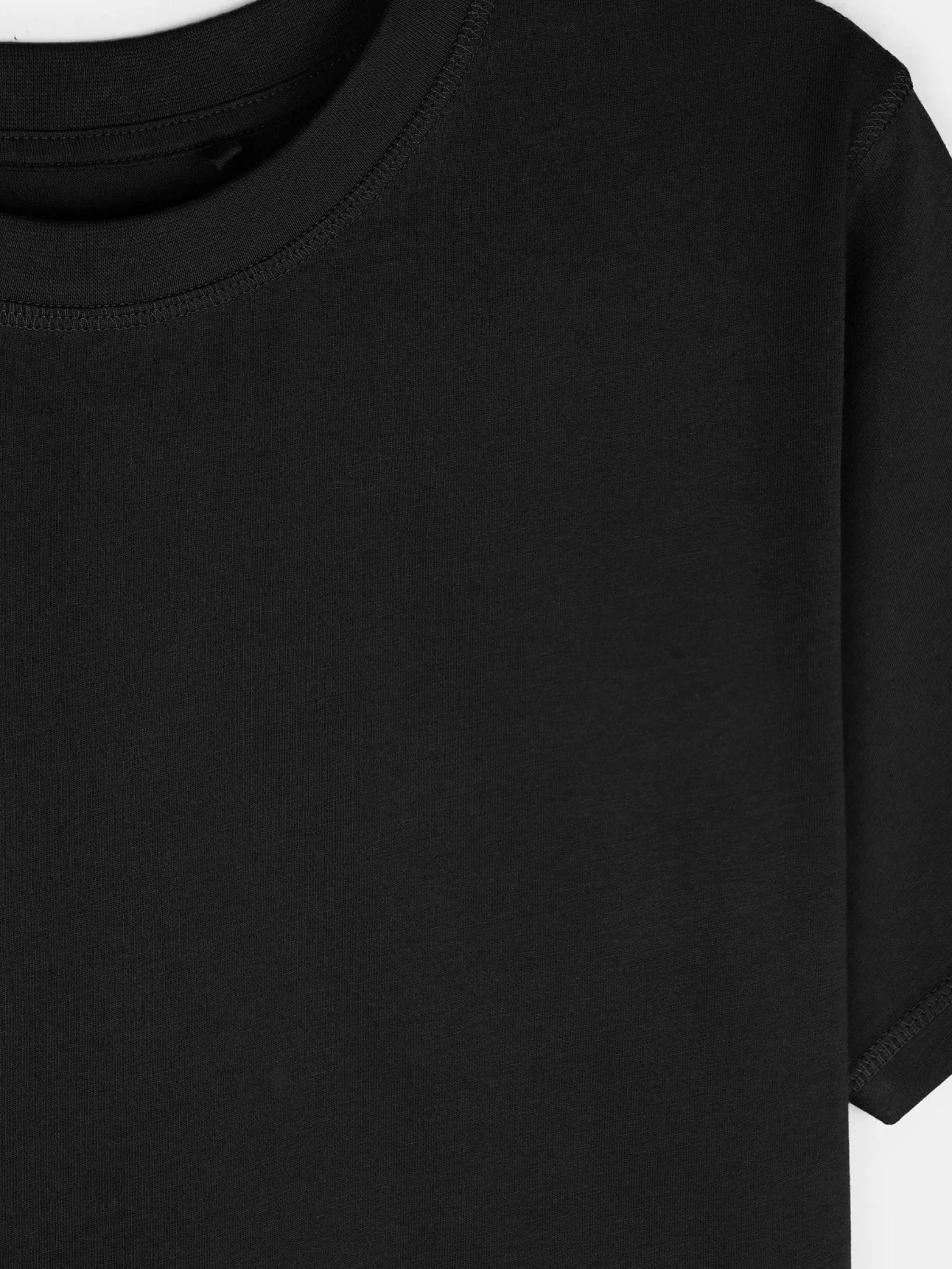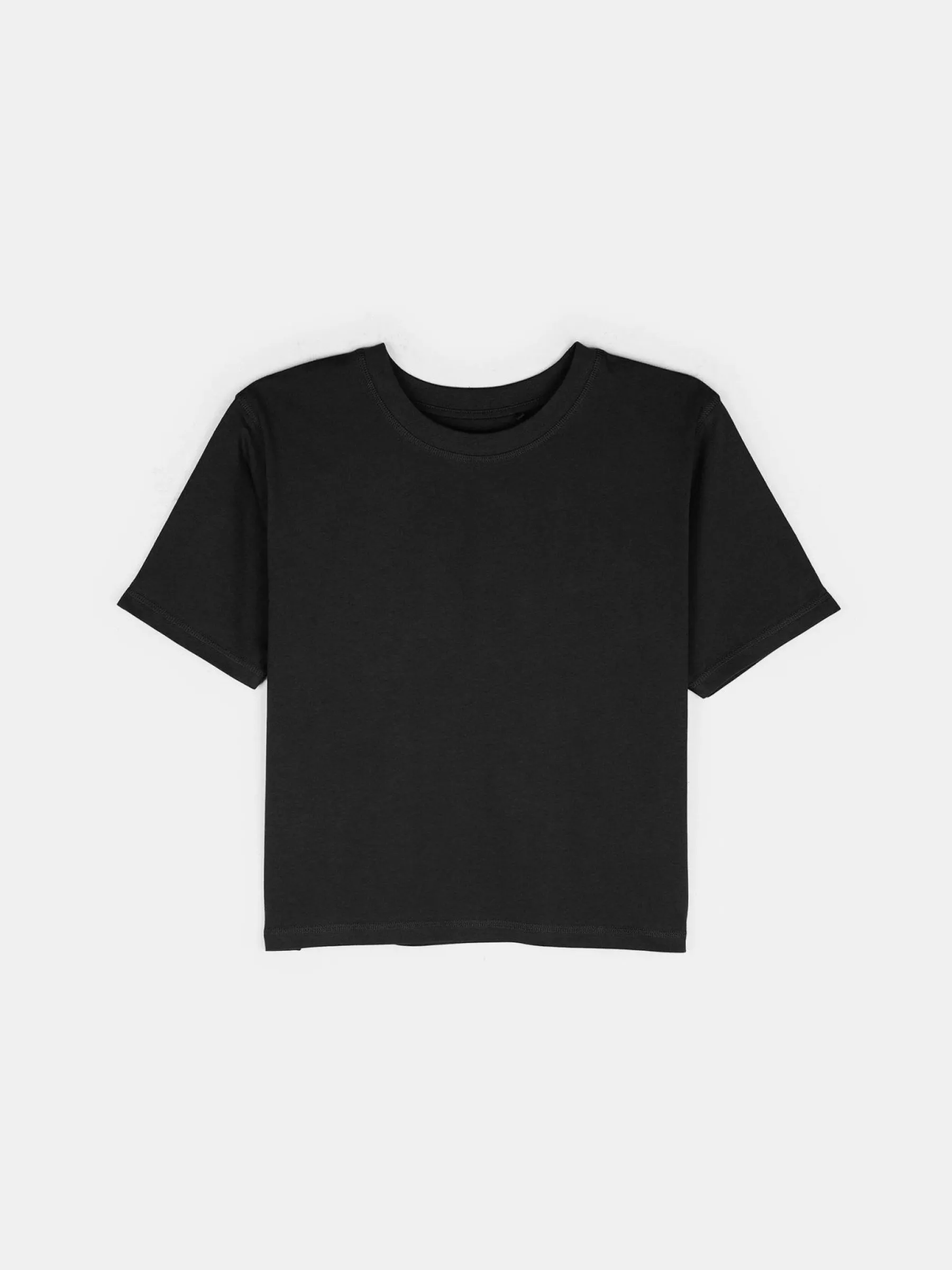 Kolor: czarnyKrój: oversizedTyp: koszulkaRekaw: krótki rękawDługość: krótkiPattern style: pojedynczy kolorDetal: …