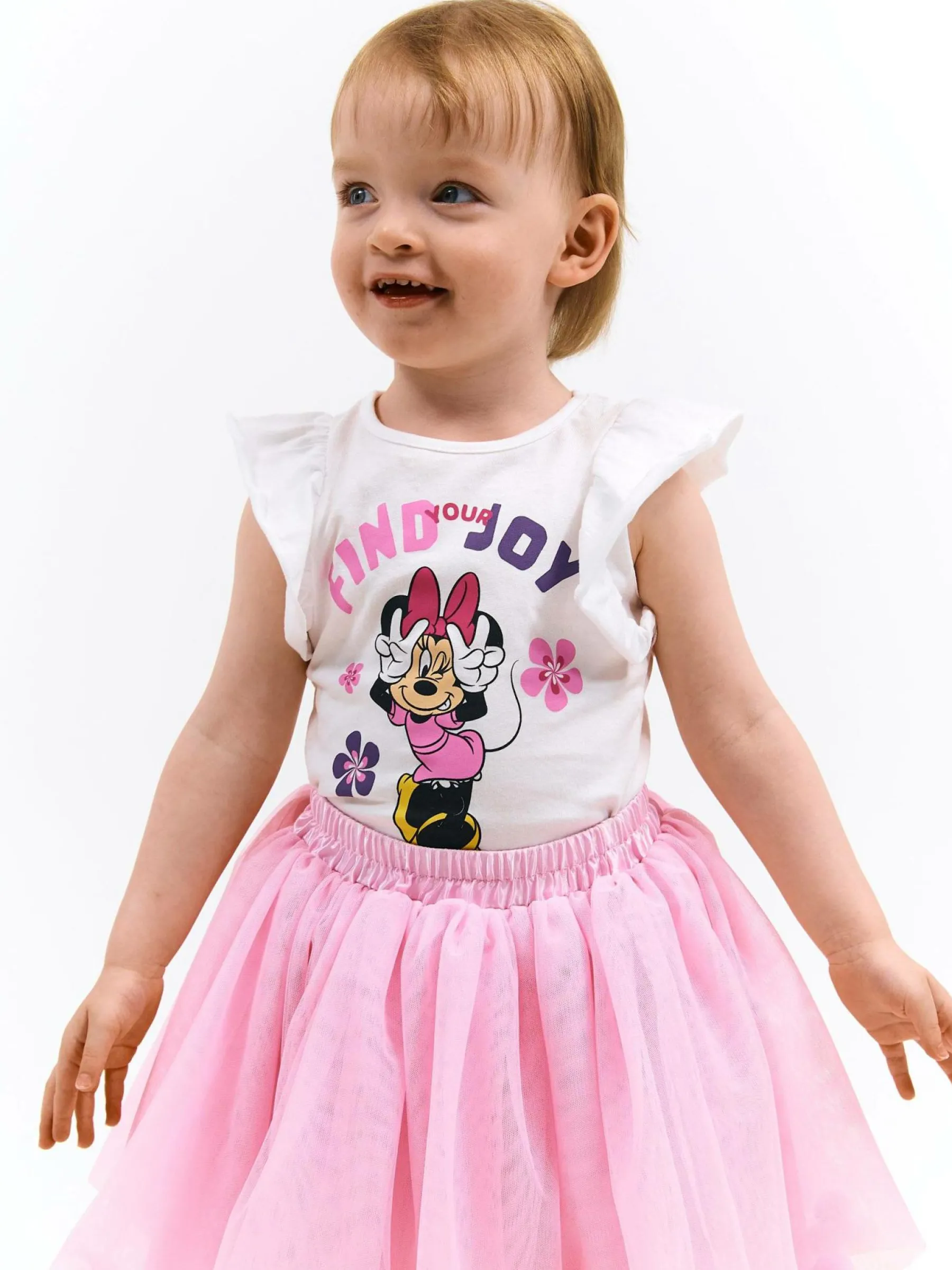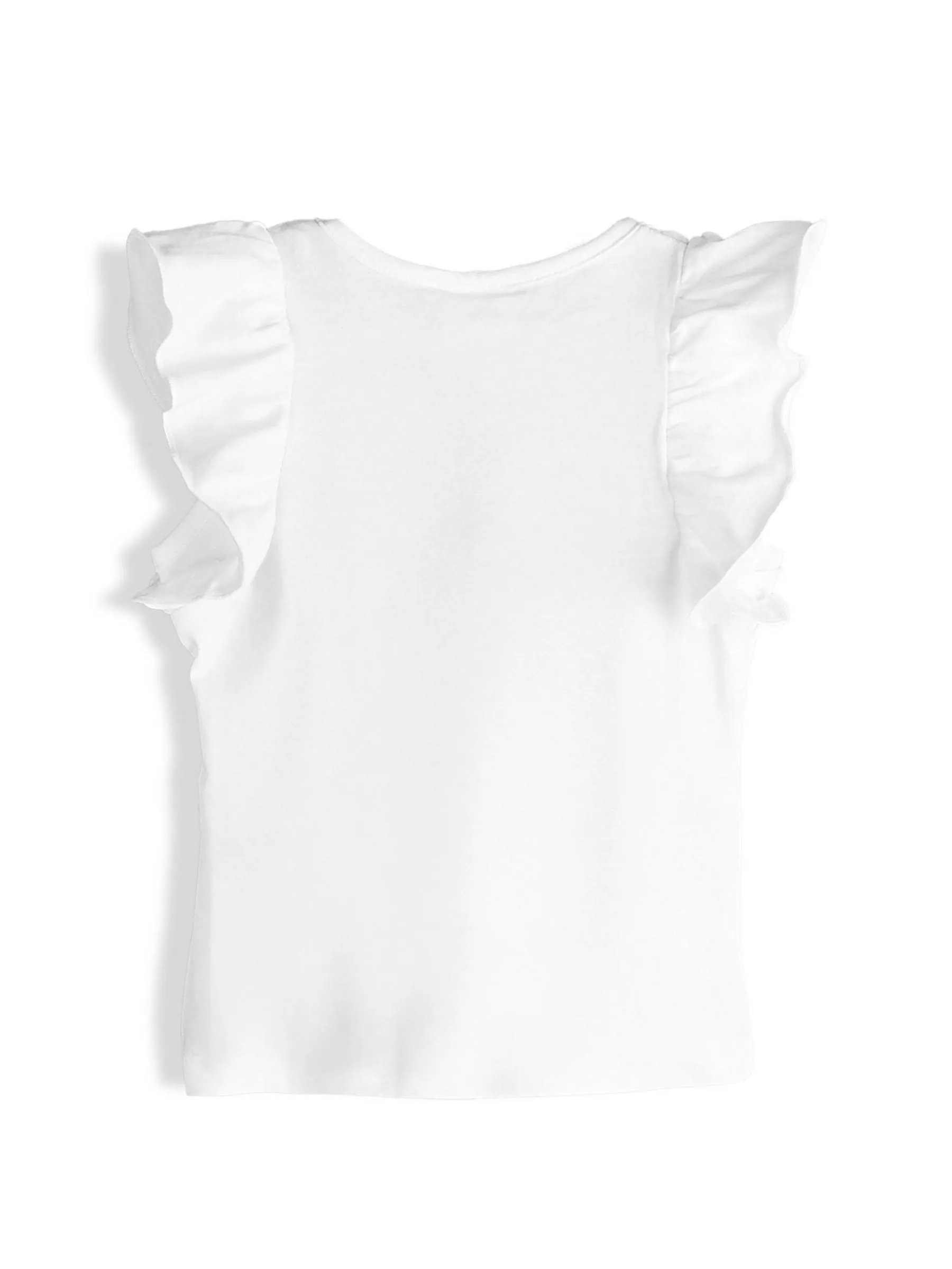 Kolor: białyKrój: z falbanąTyp: koszulkaRekaw: krótki rękawDługość: krótkiPattern style: z nadrukiemDetal: nad …