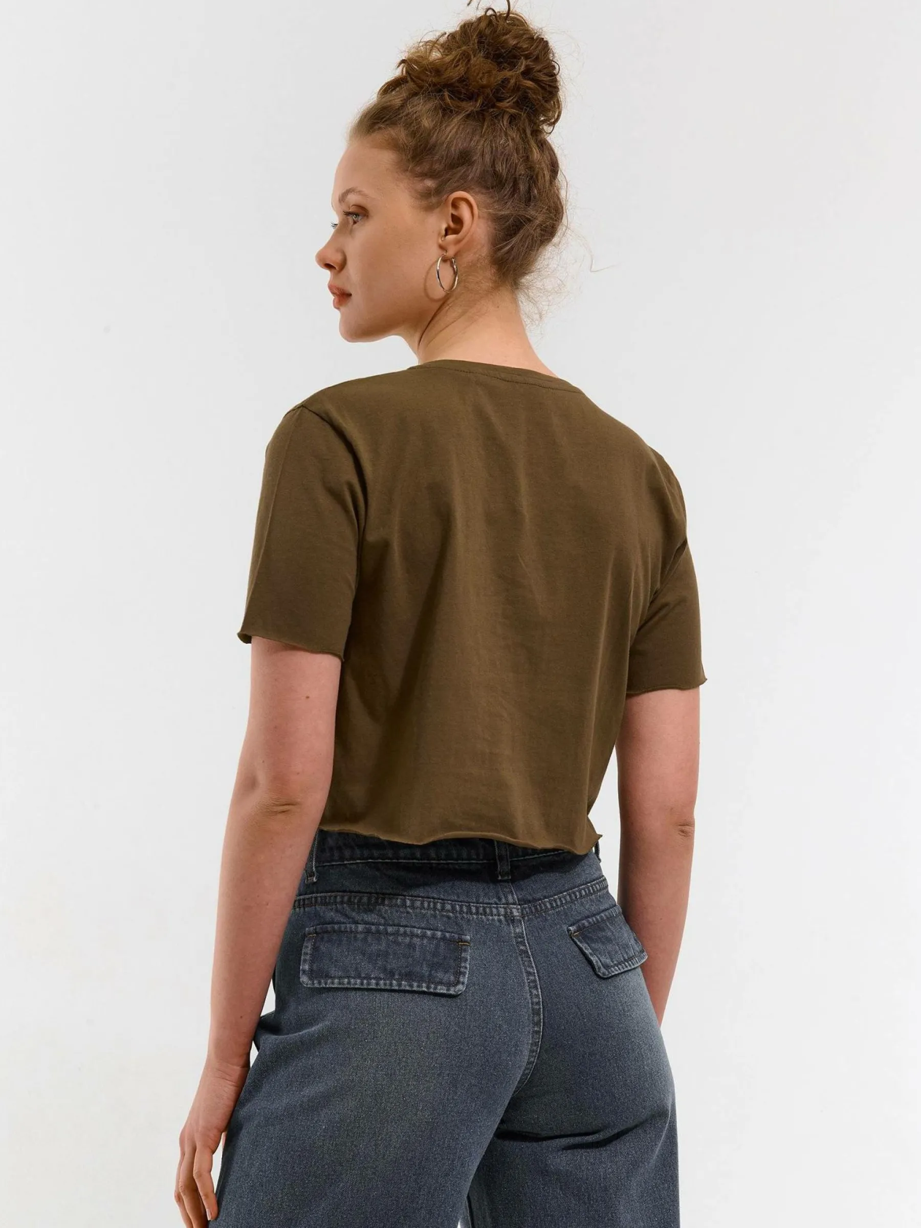 Kolor: brązowyKrój: regularTyp: koszulkaRekaw: krótki rękawDługość: krótki topPattern style: pojedynczy kolorDet…
