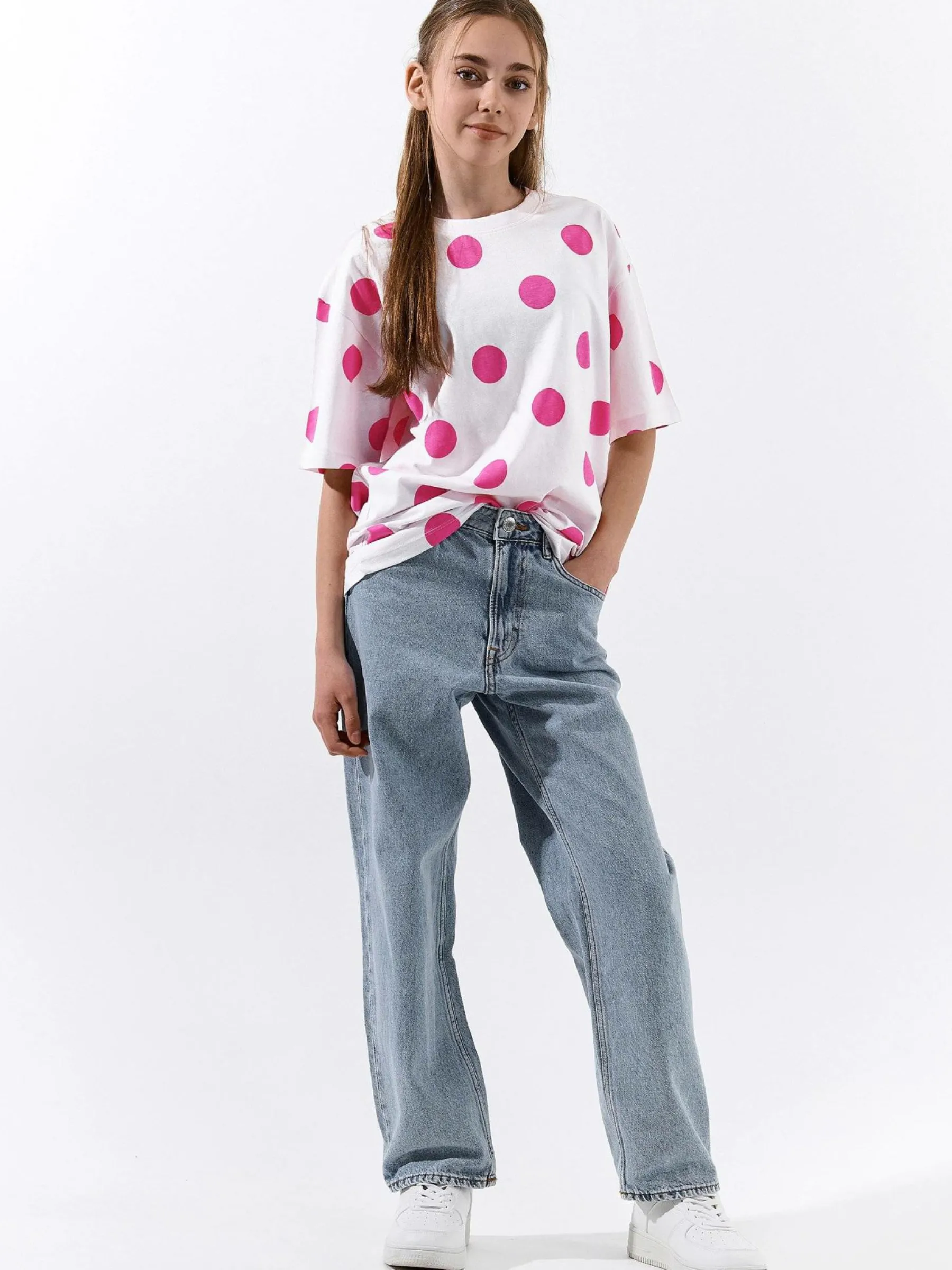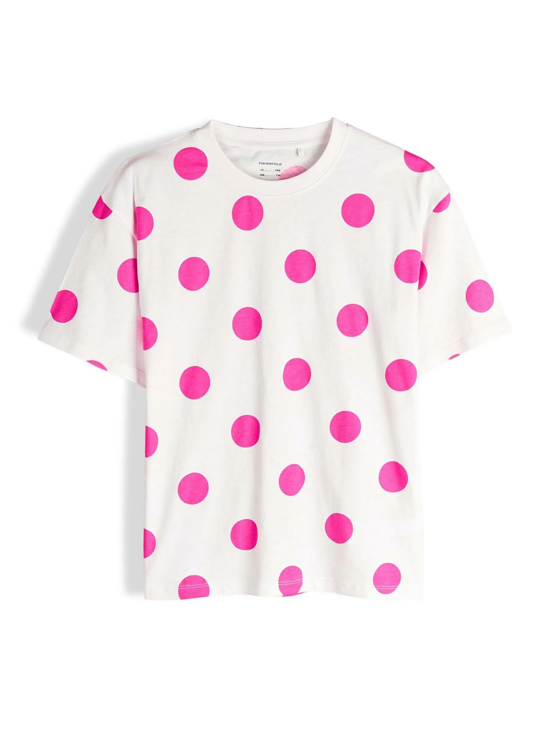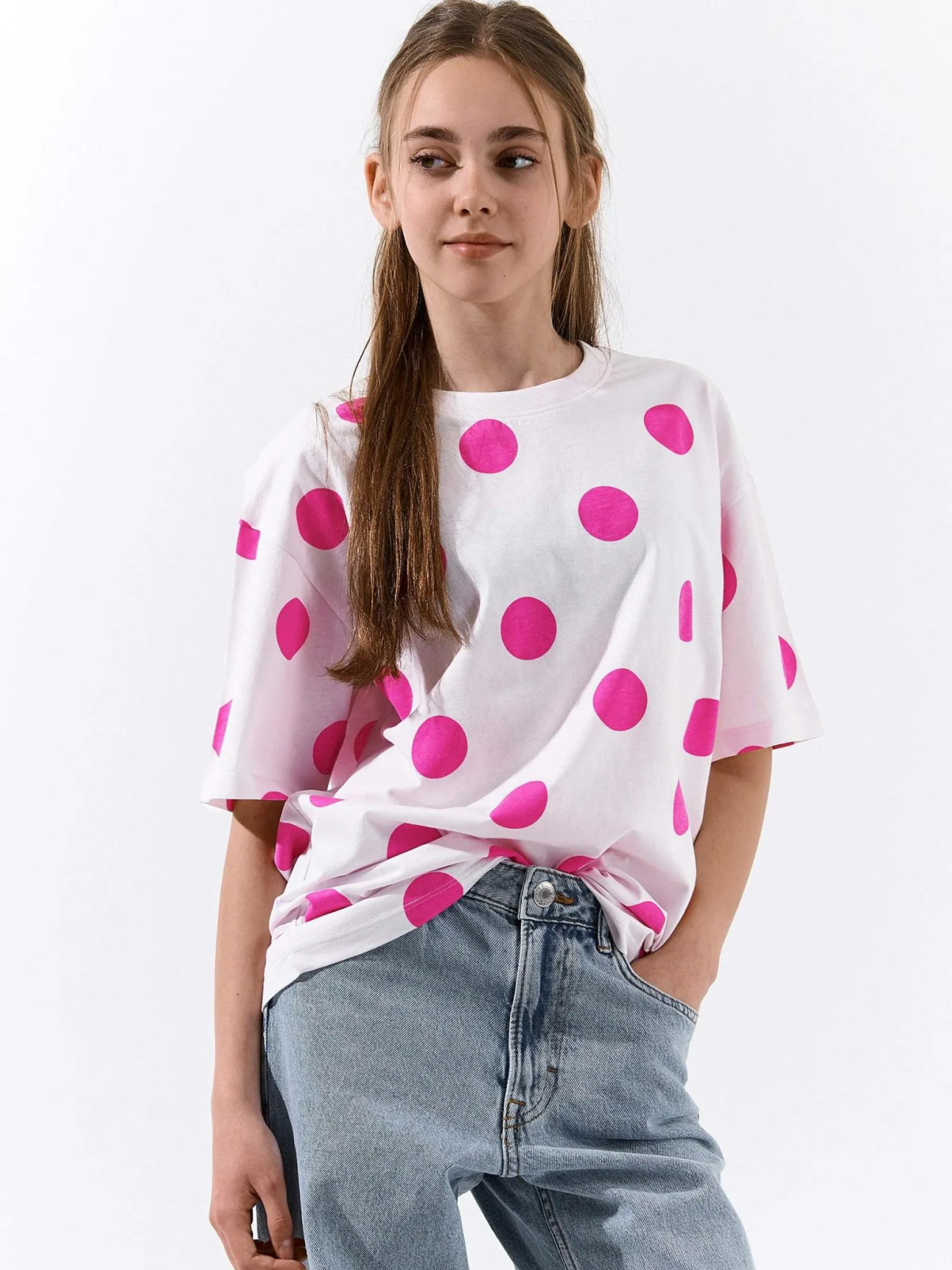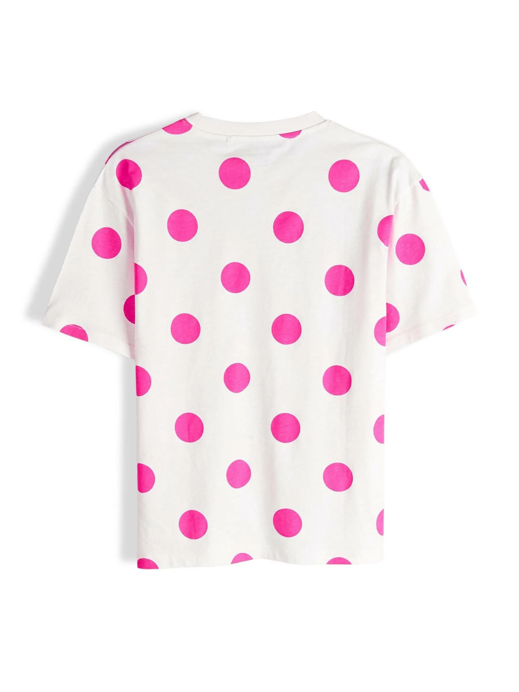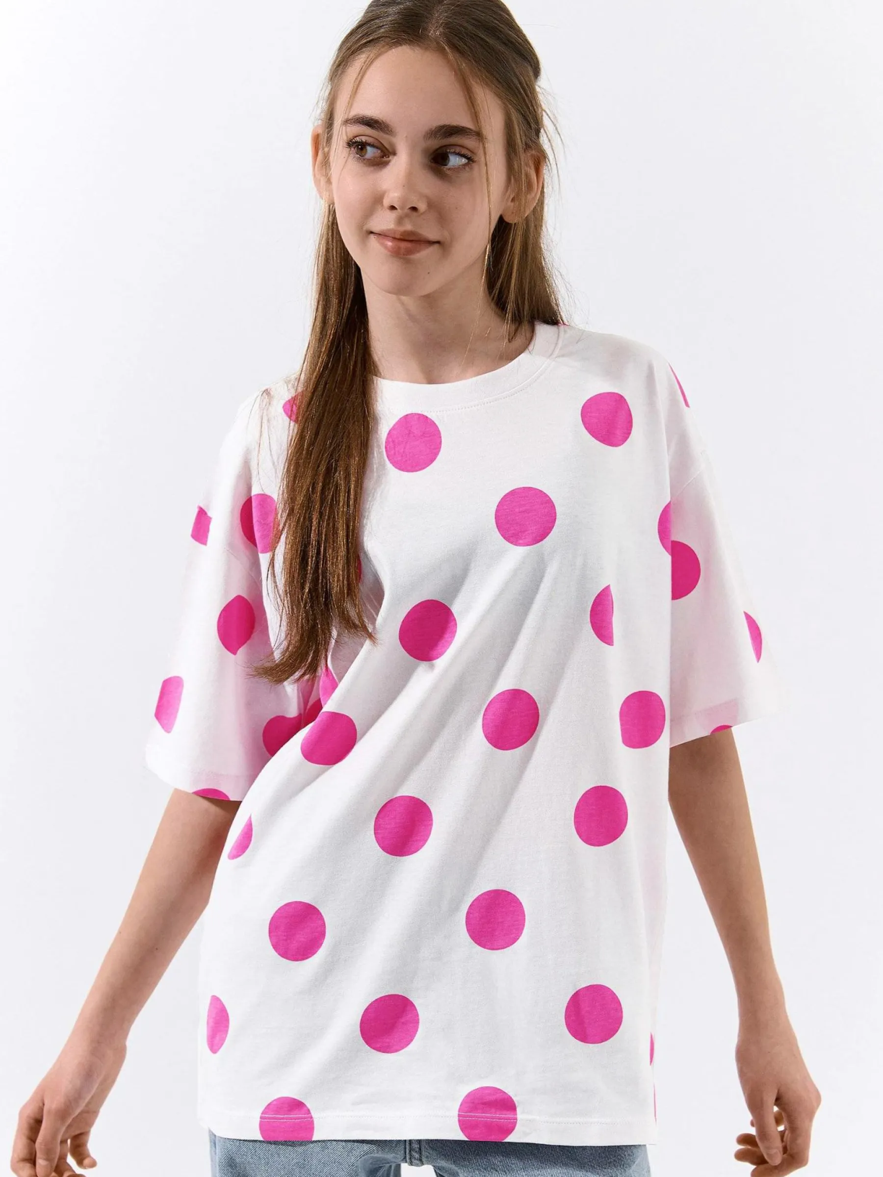 Kolor: różowyKrój: oversizedTyp: koszulkaRekaw: krótki rękawDługość: dlugiePattern style: w grochyDetal: nad gł…