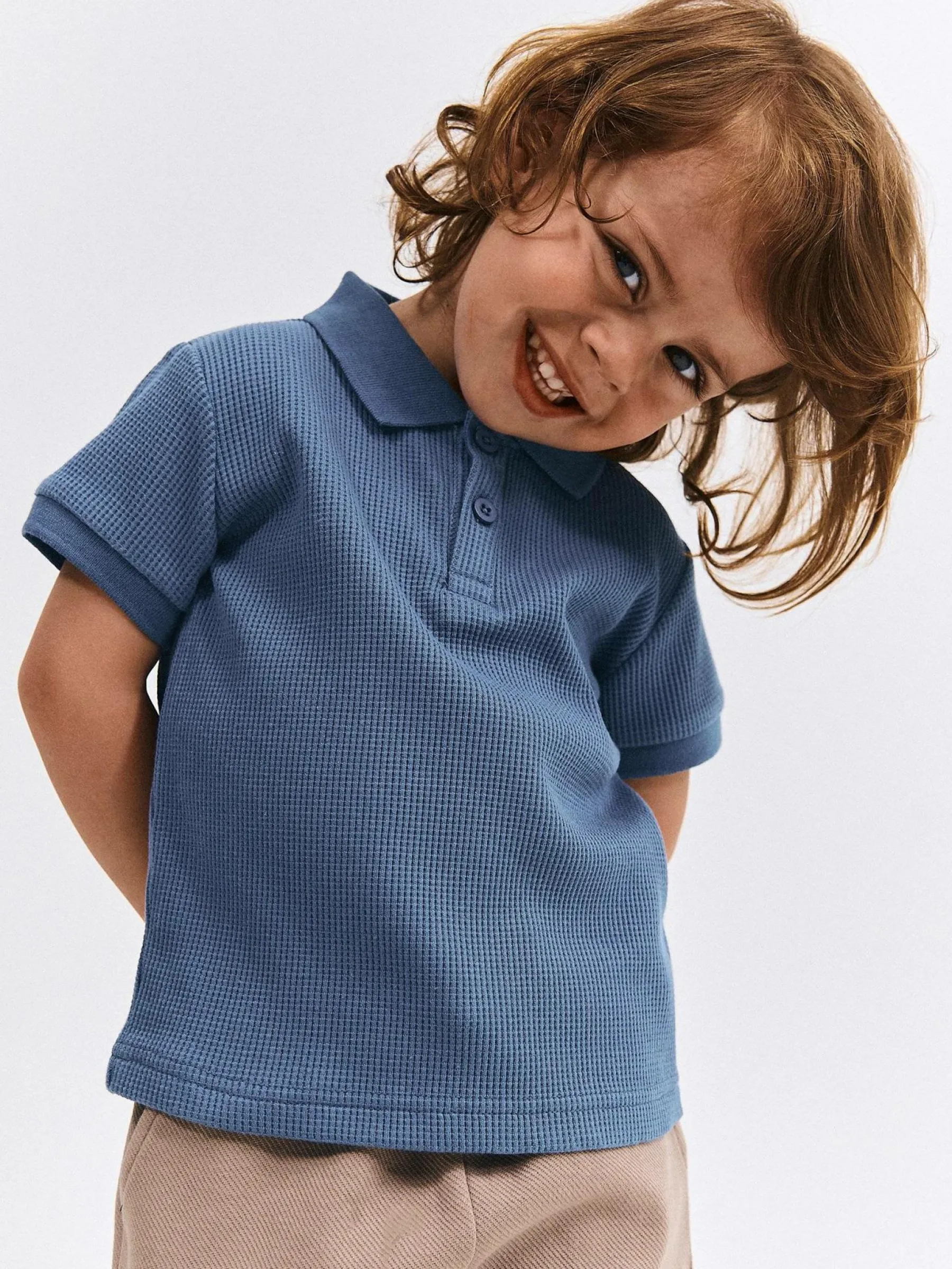 Kolor: niebieskiKrój: poloTyp: koszulkaRekaw: krótki rękawDługość: krótkiPattern style: pojedynczy kolor, struktu…