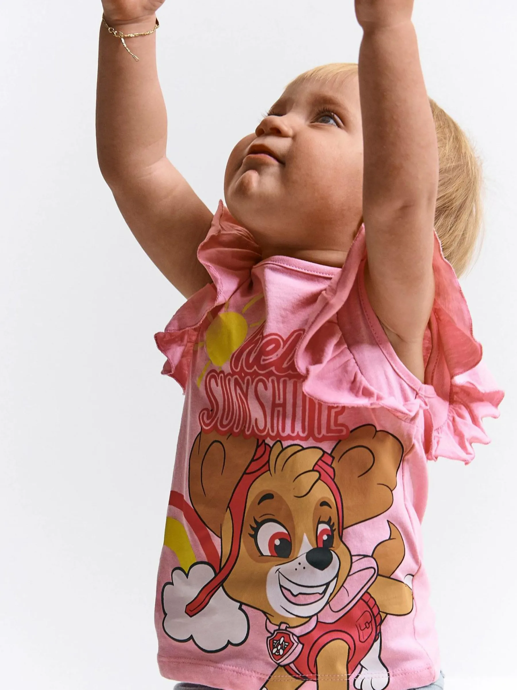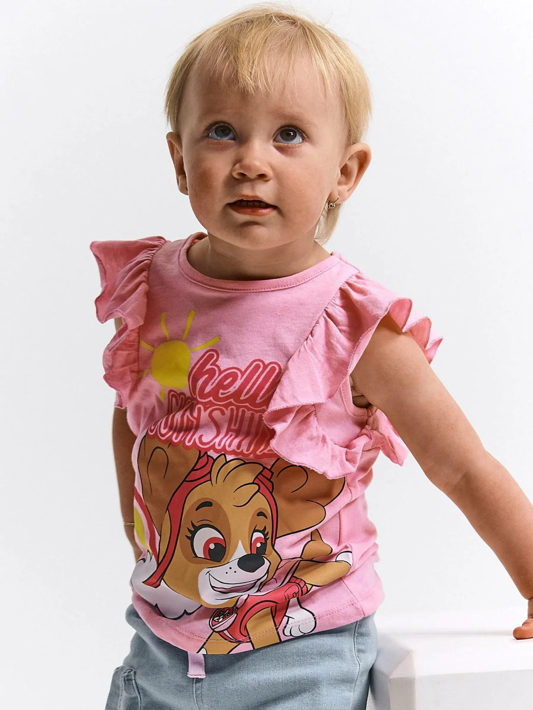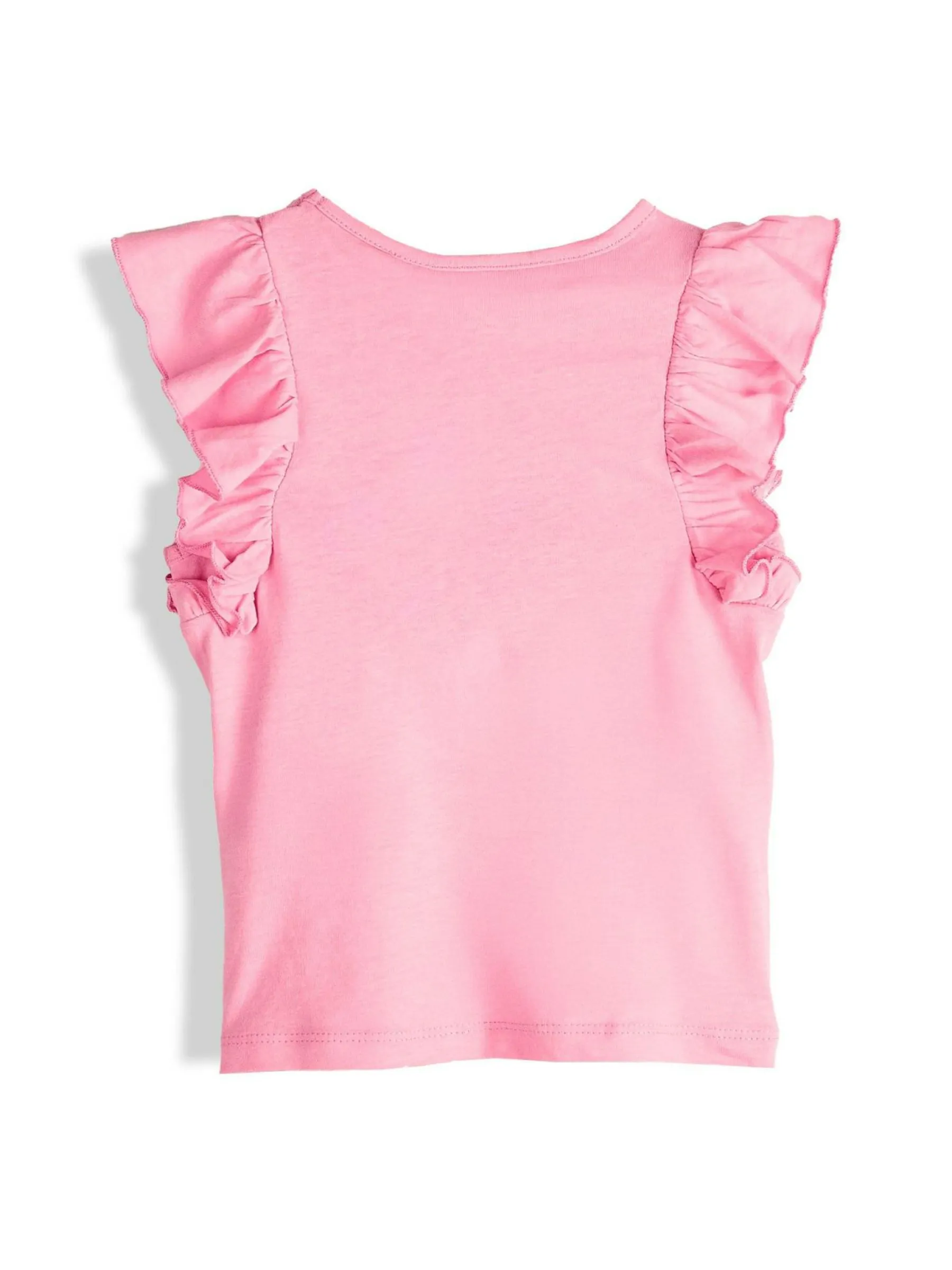 Kolor: różowyKrój: z falbanąTyp: koszulkaRekaw: krótki rękawDługość: krótkiPattern style: z nadrukiemDetal: na…
