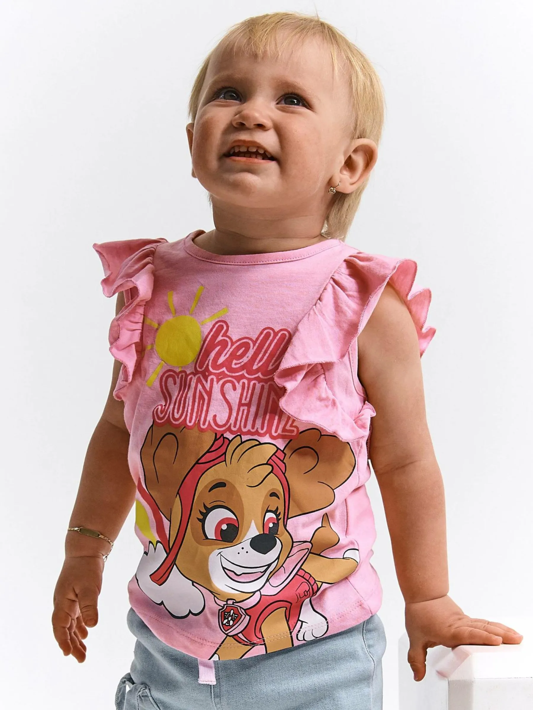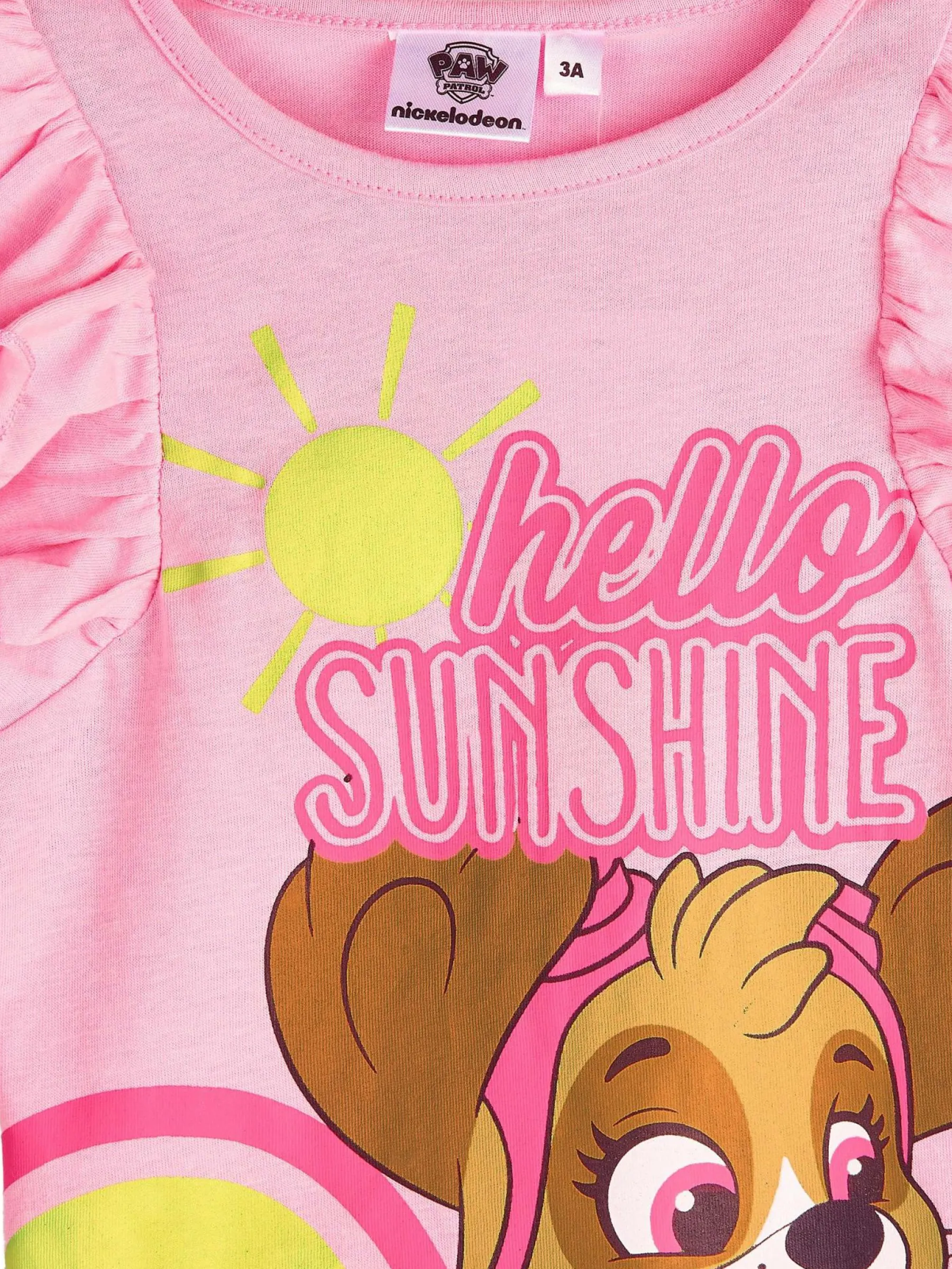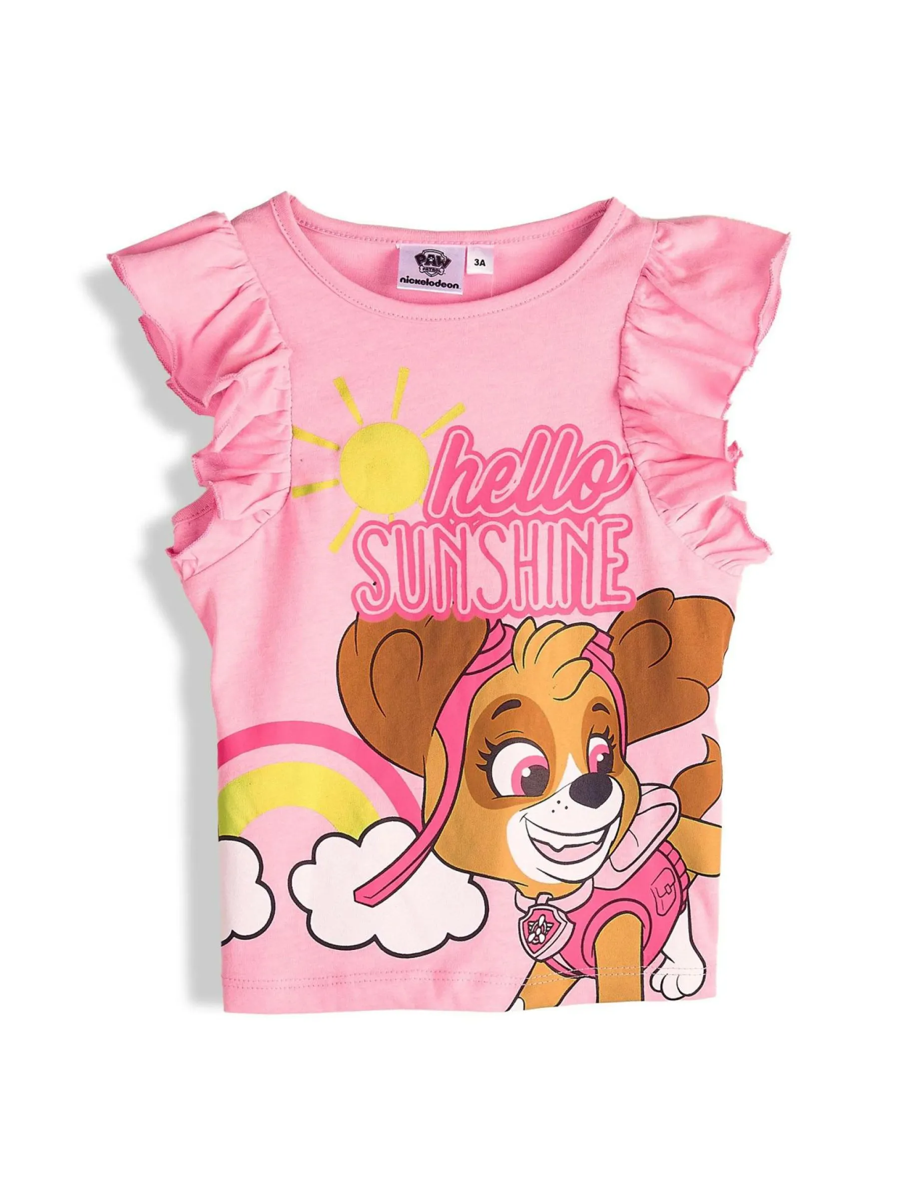 Kolor: różowyKrój: z falbanąTyp: koszulkaRekaw: krótki rękawDługość: krótkiPattern style: z nadrukiemDetal: na…