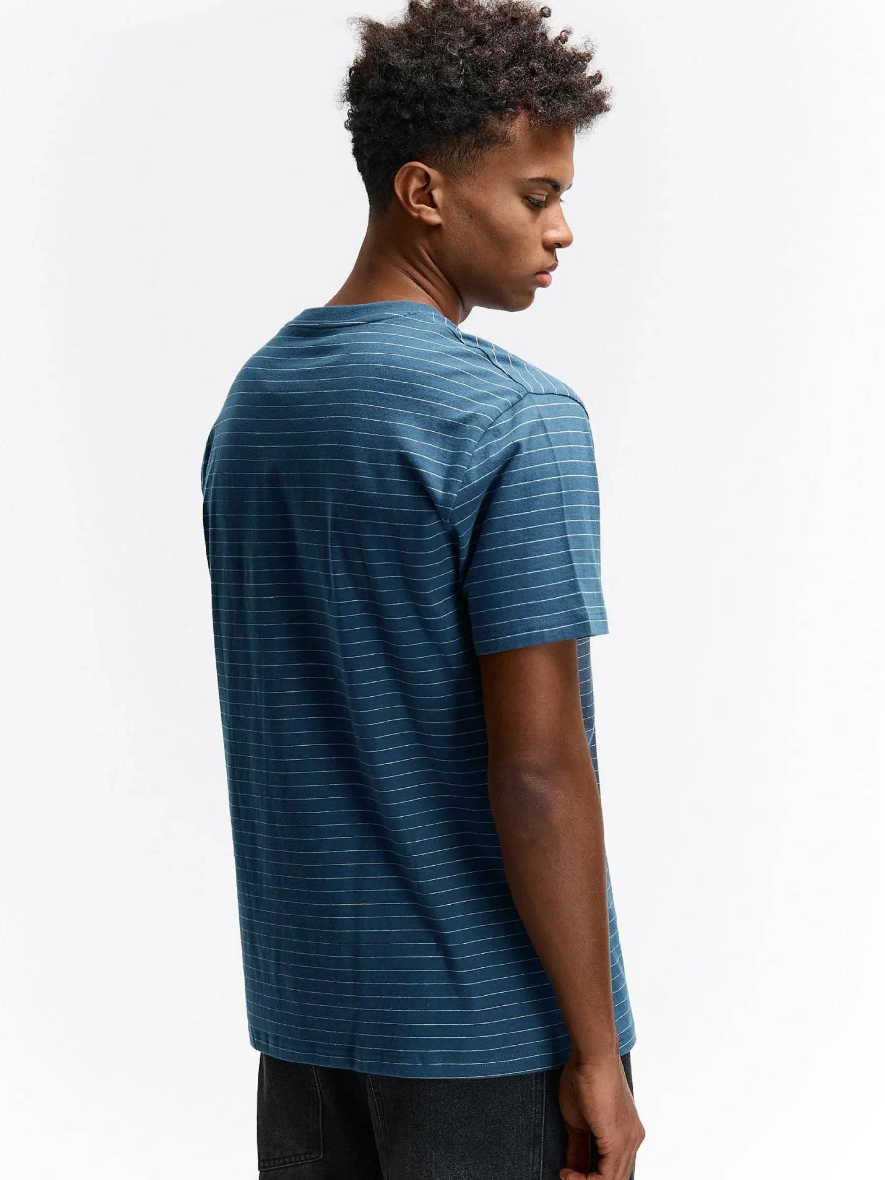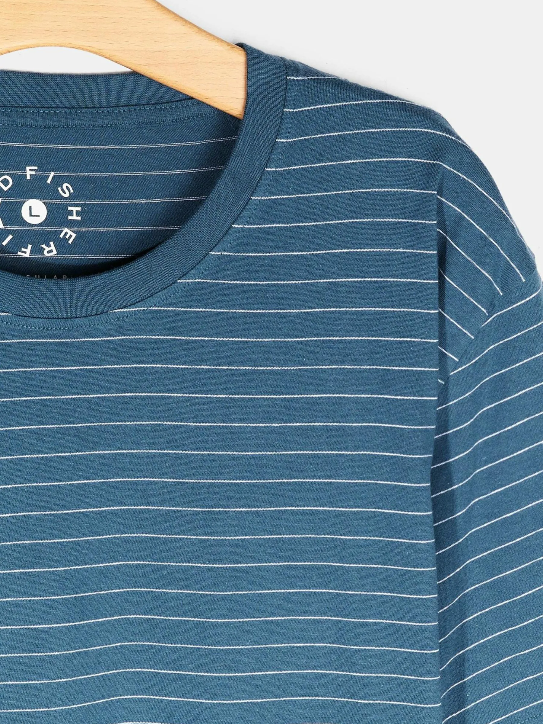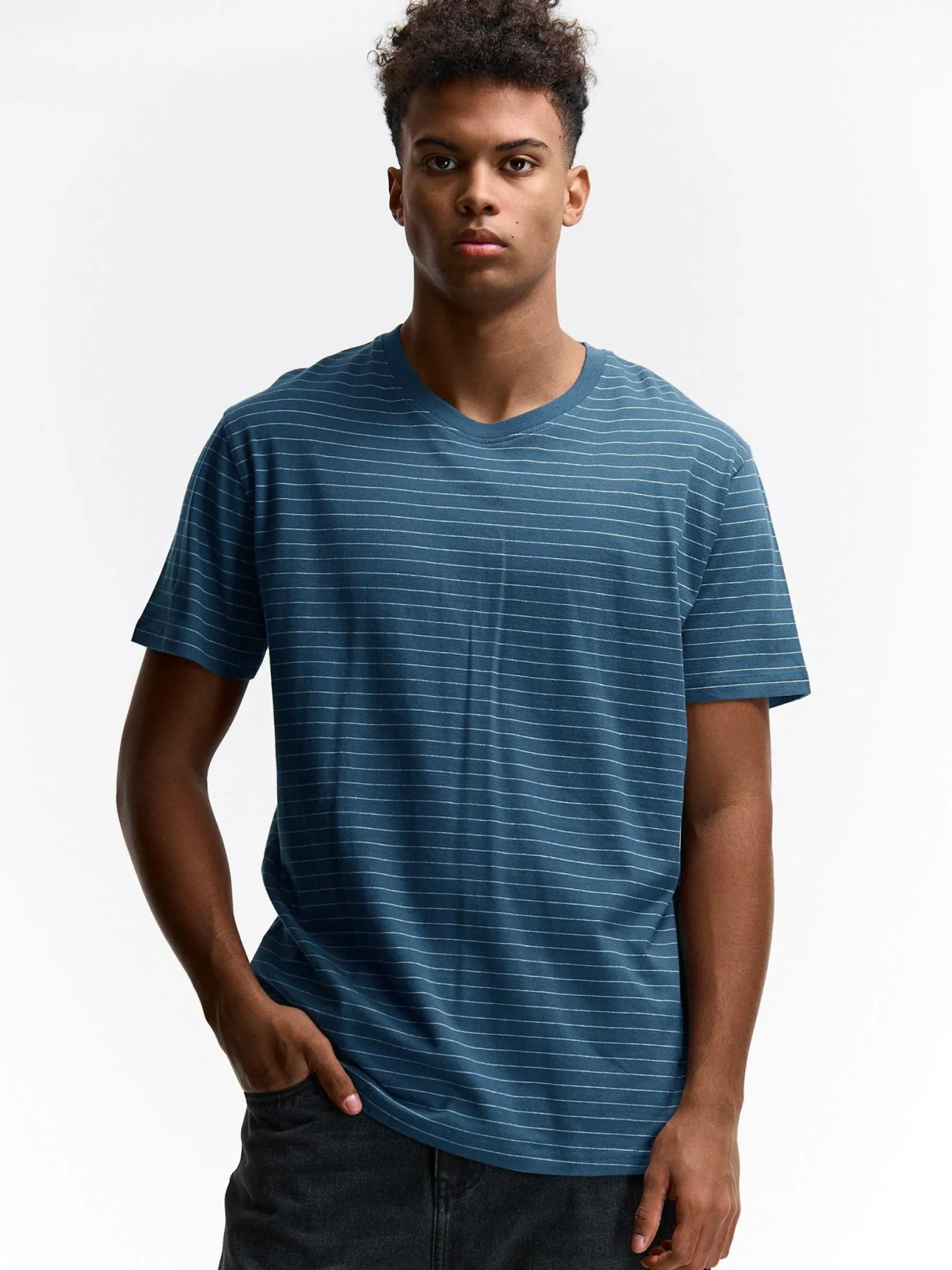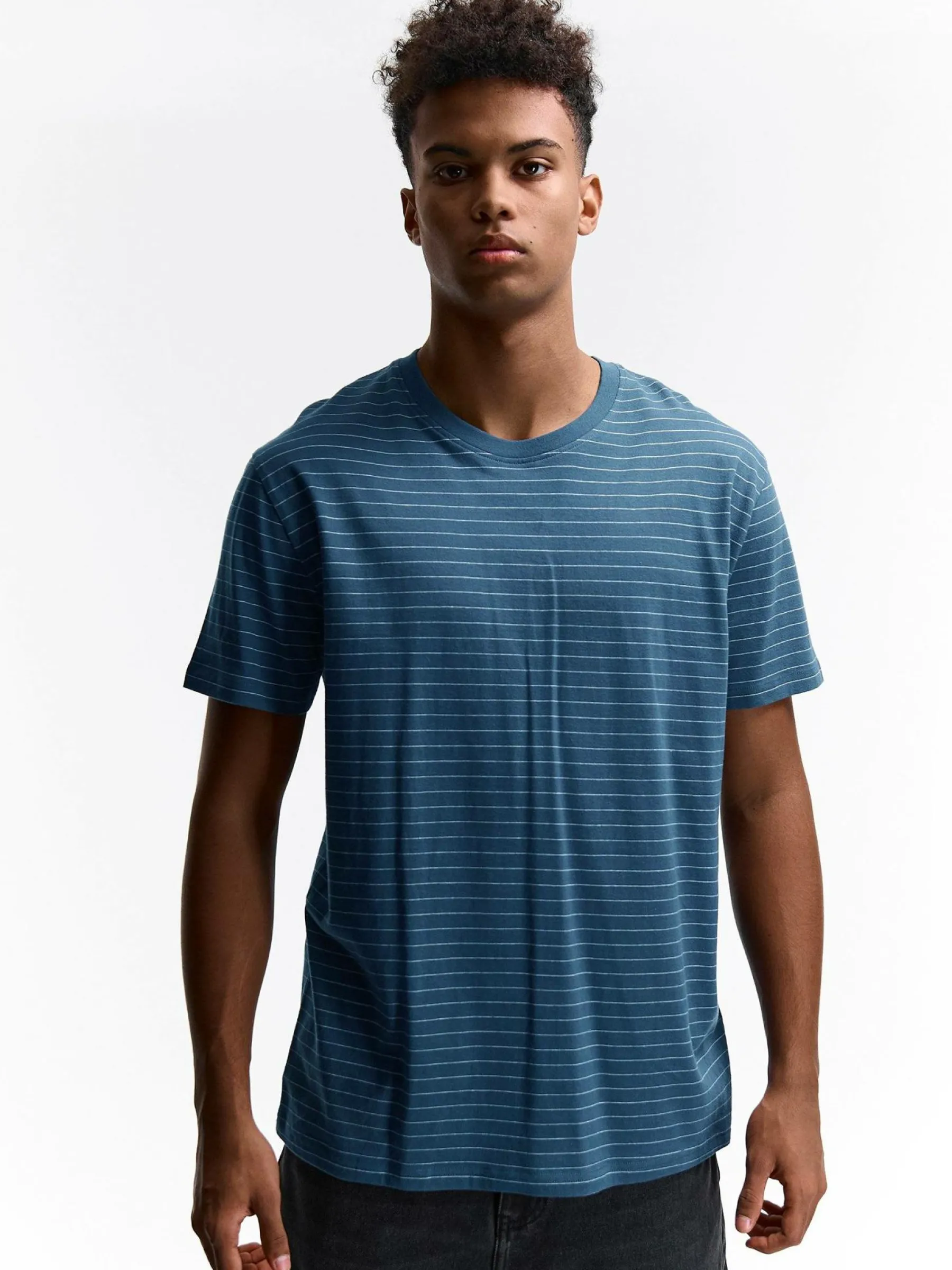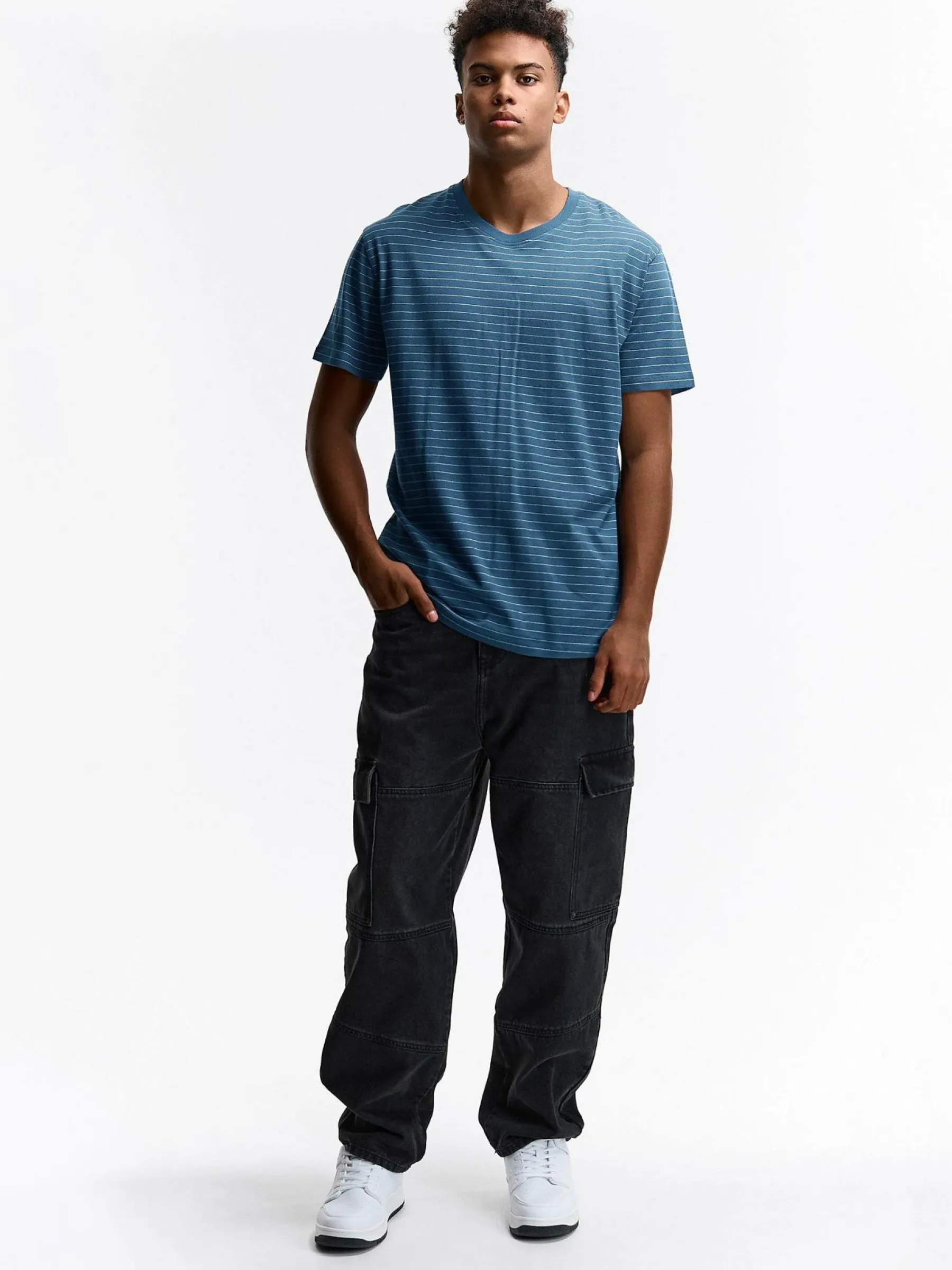 Kolor: granatowy, niebieskiKrój: regularTyp: koszulkaRekaw: krótki rękawPattern style: w prążkiDetal: nad głowąMa…