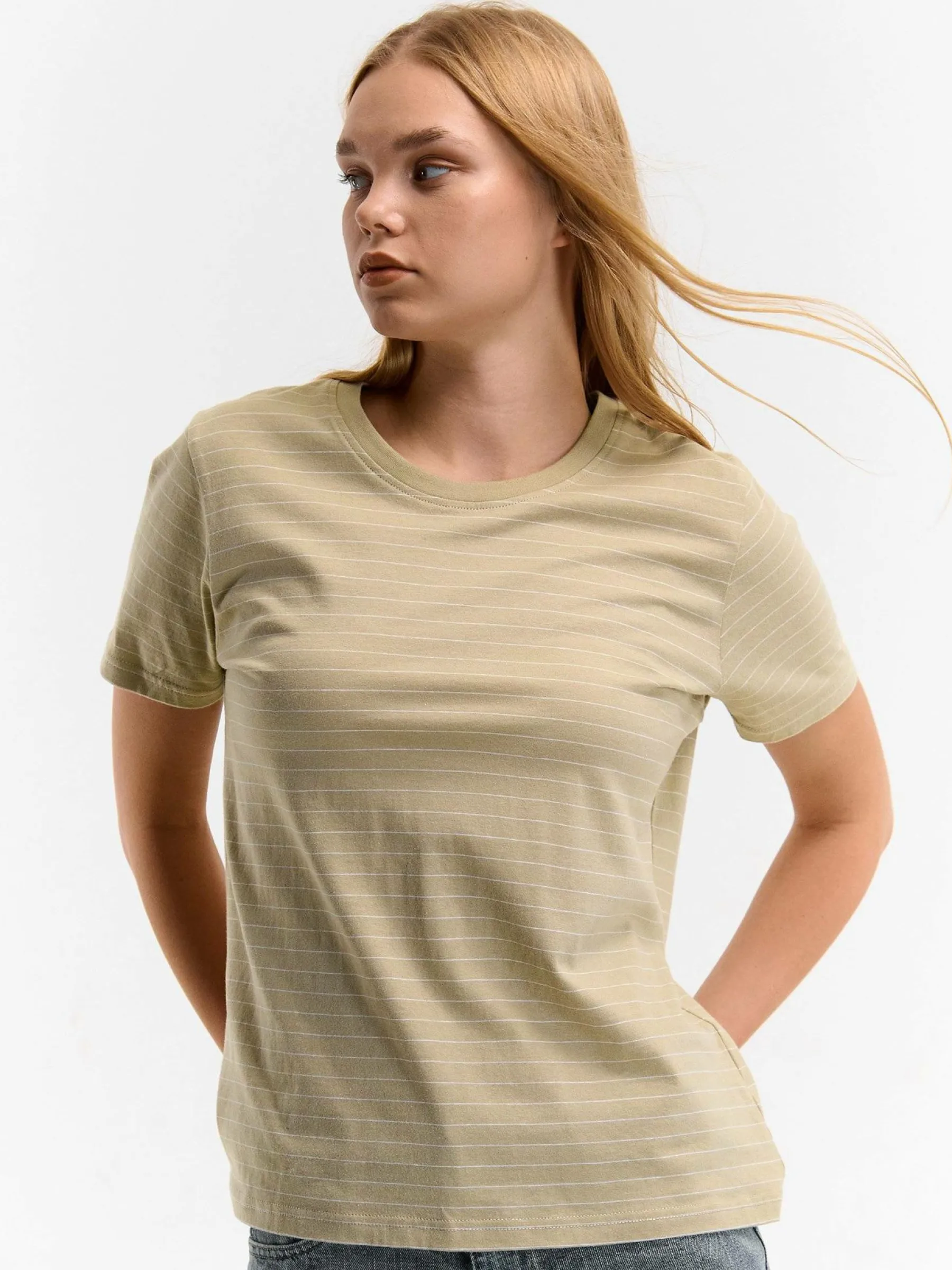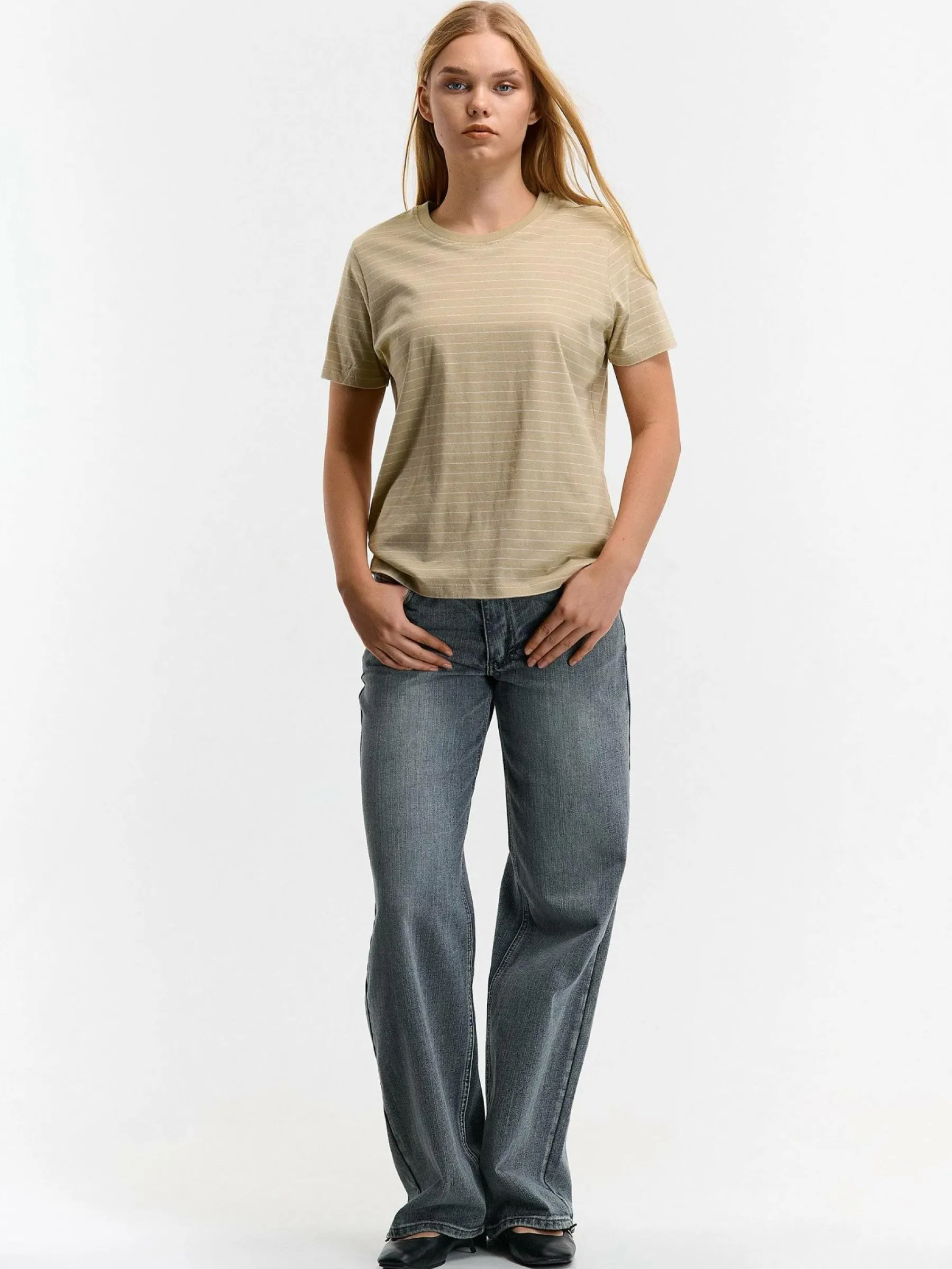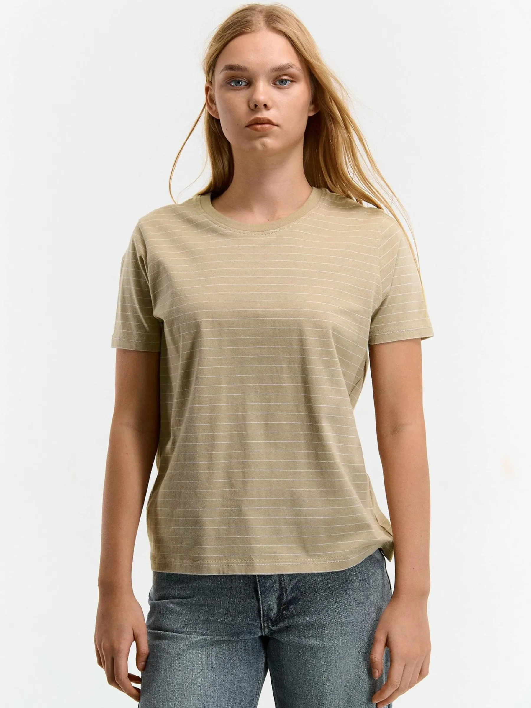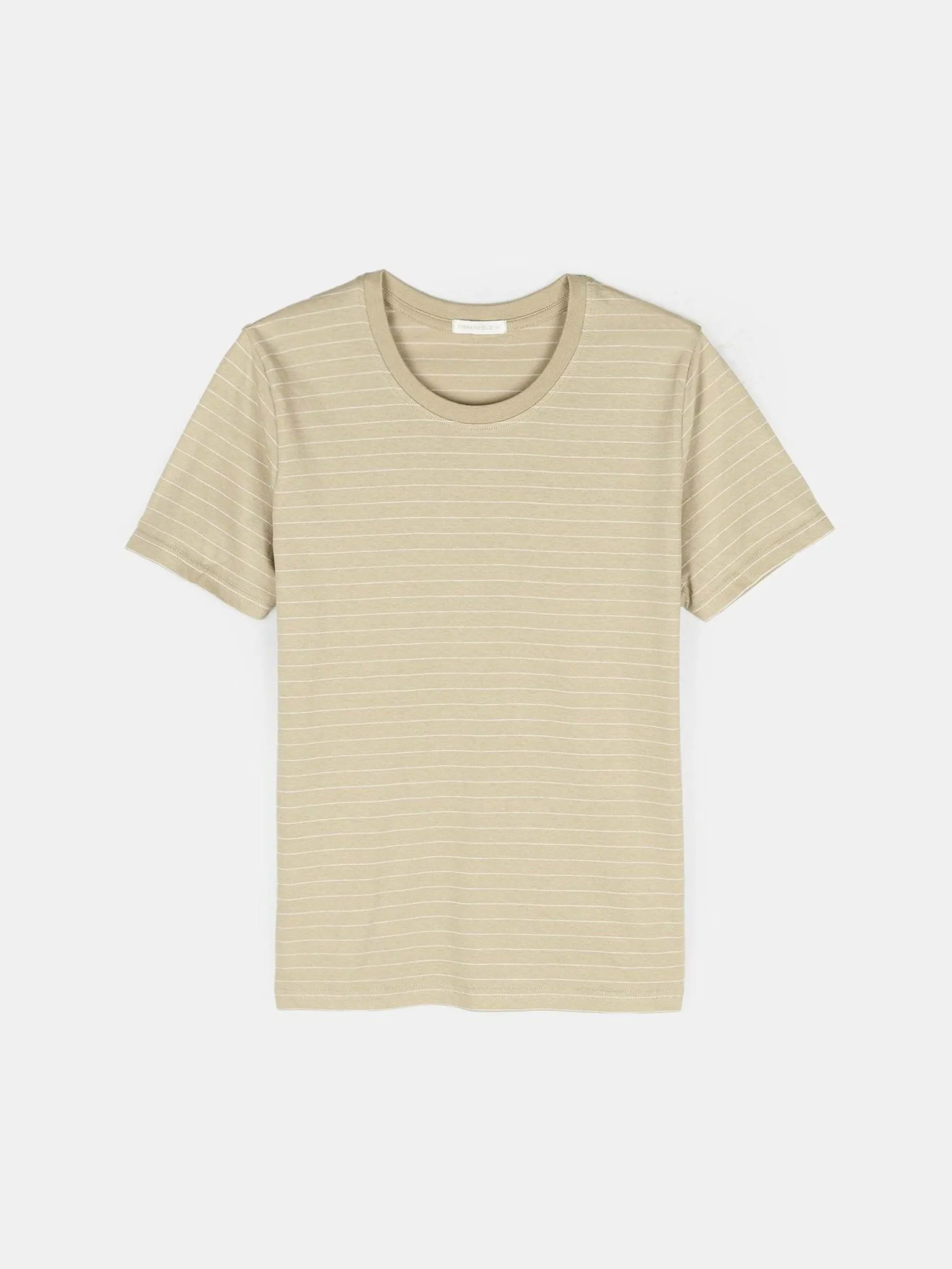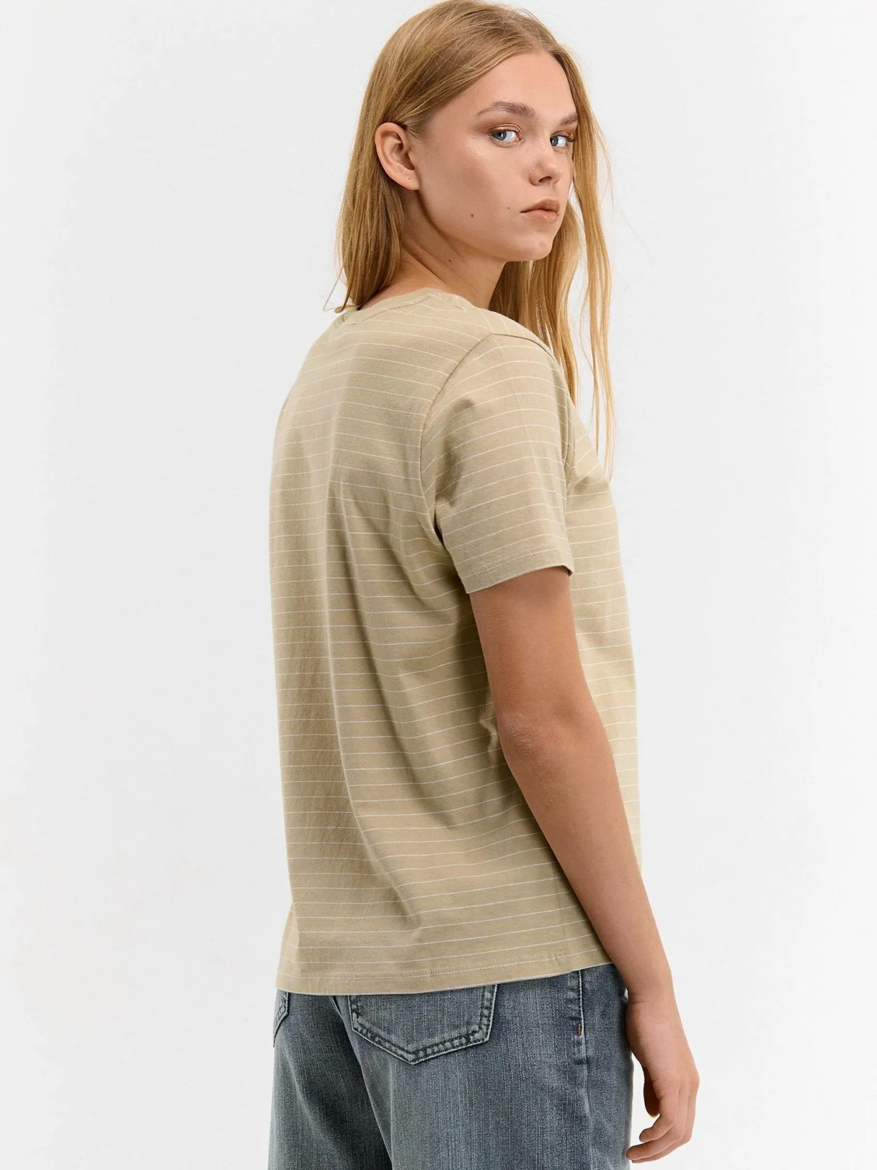 Kolor: beżowyKrój: regularTyp: koszulkaRekaw: krótki rękawDługość: krótkiPattern style: w prążkiDetal: nad gł…