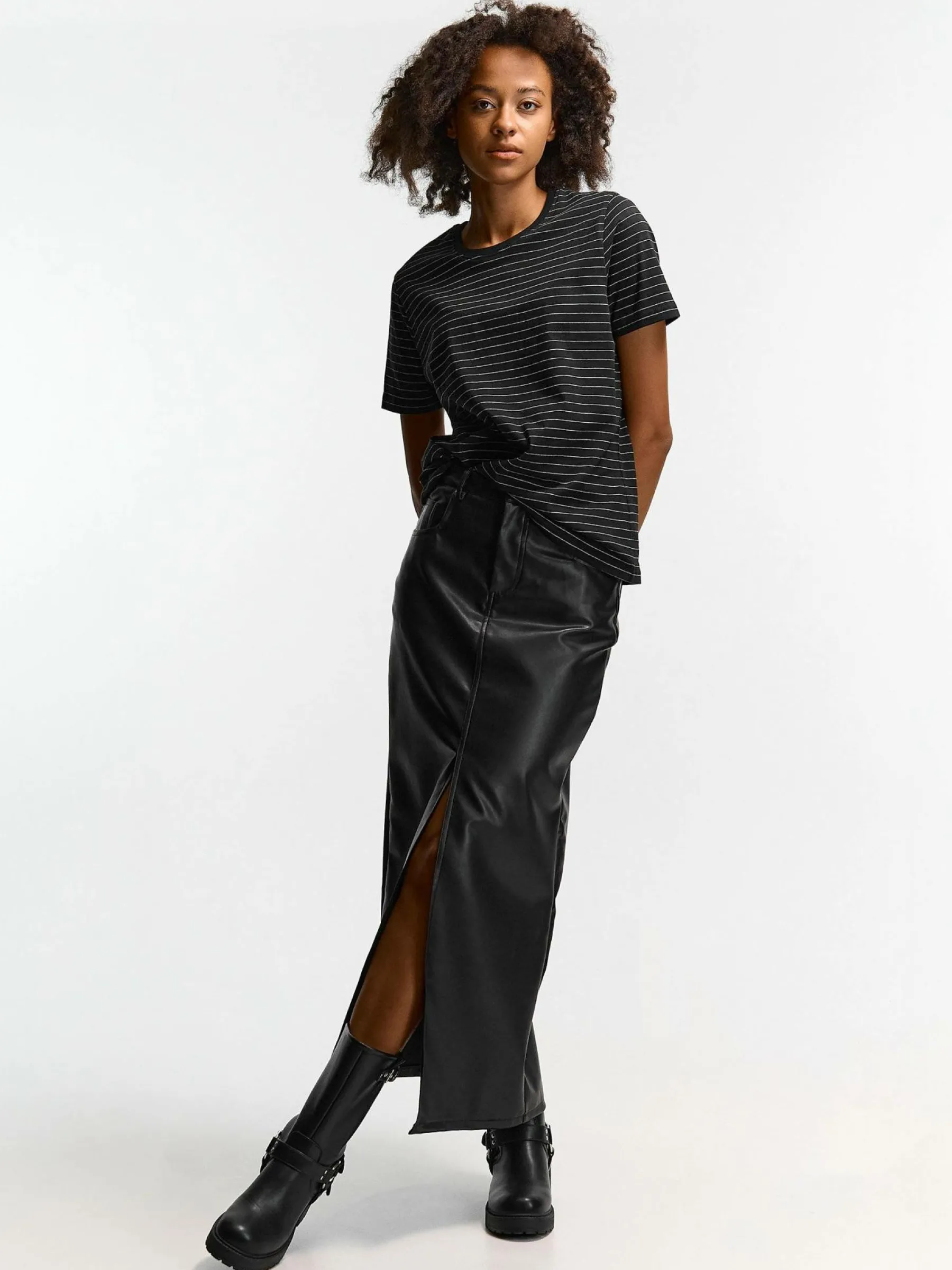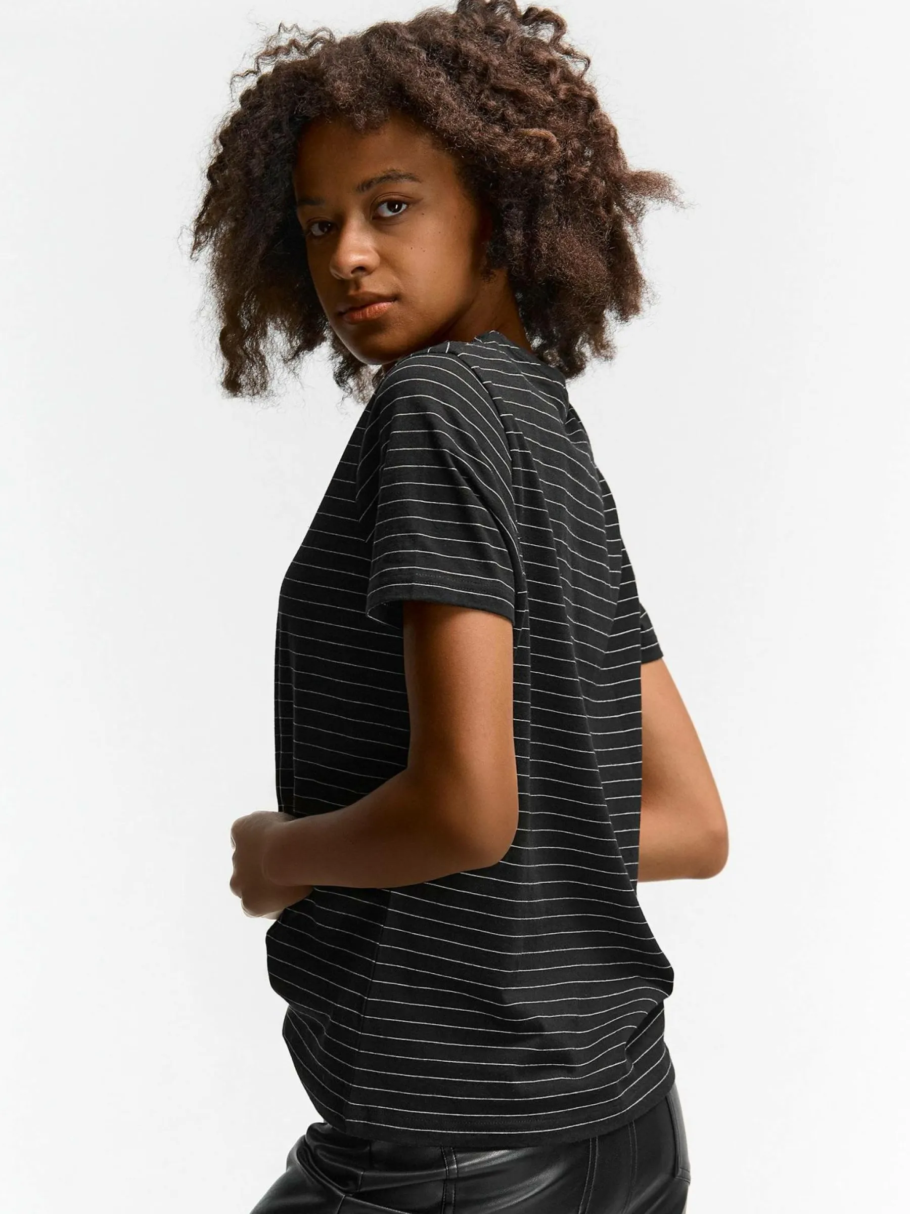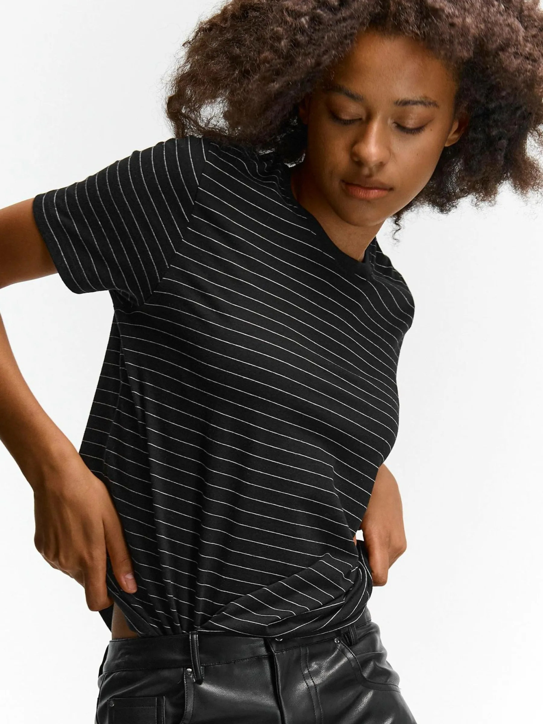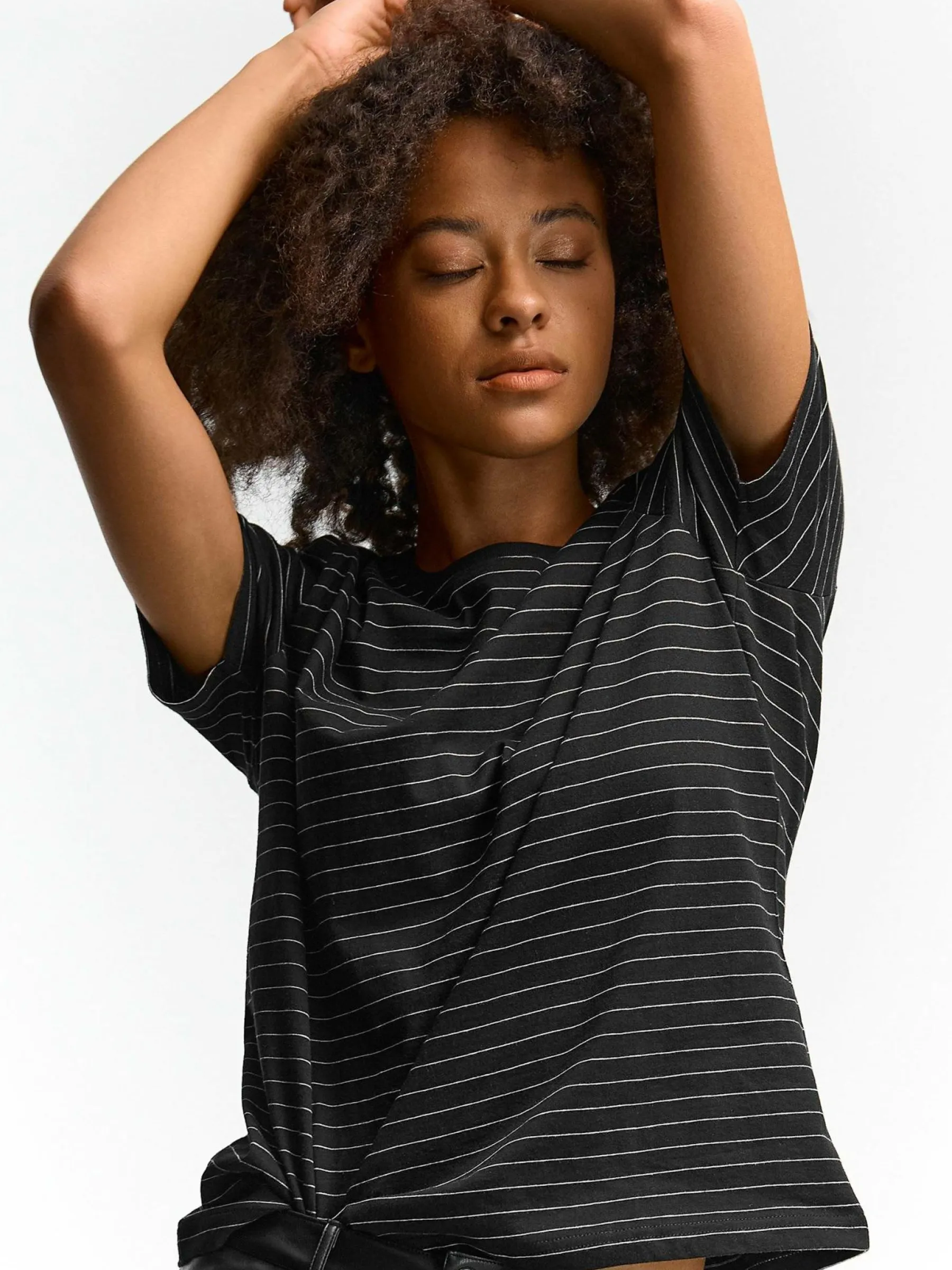 Kolor: czarnyKrój: regularTyp: koszulkaRekaw: krótki rękawDługość: krótkiPattern style: w prążkiDetal: nad gło…