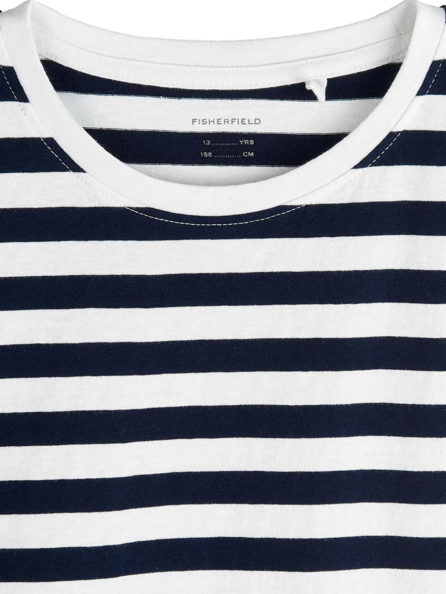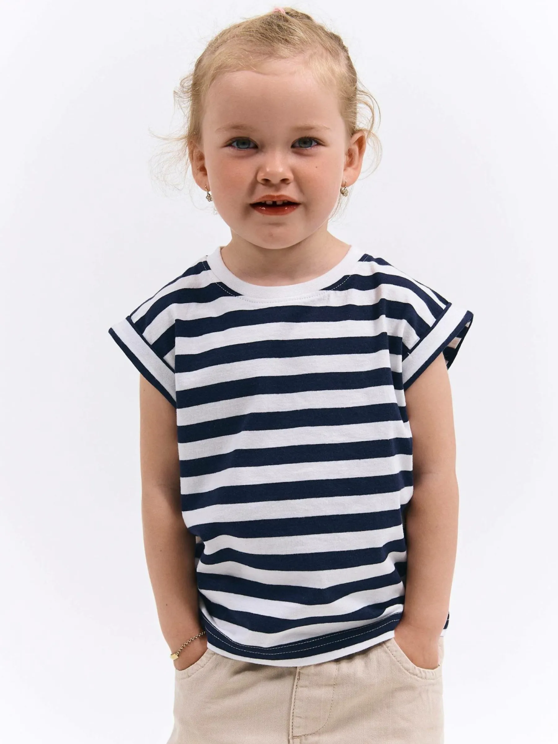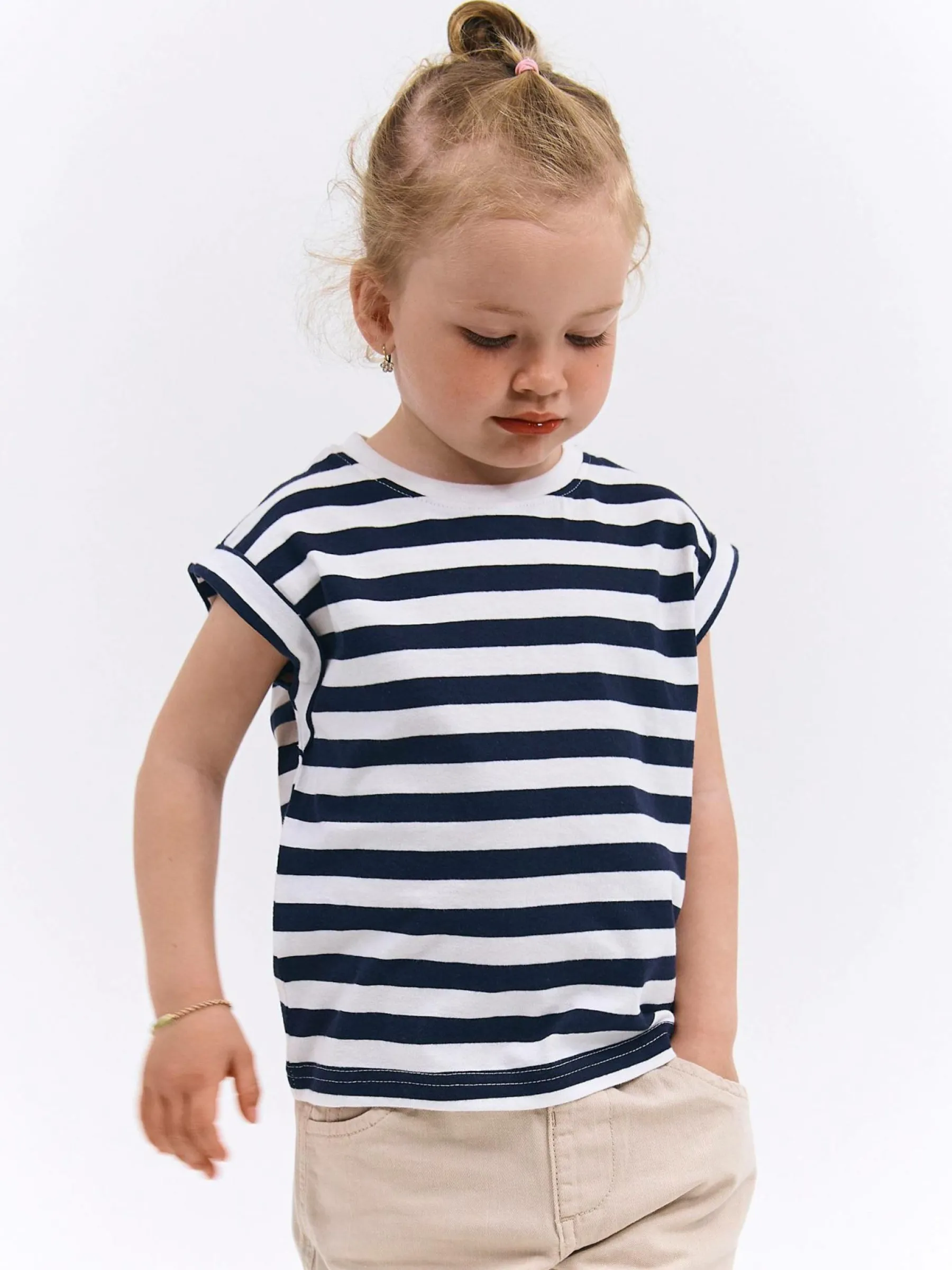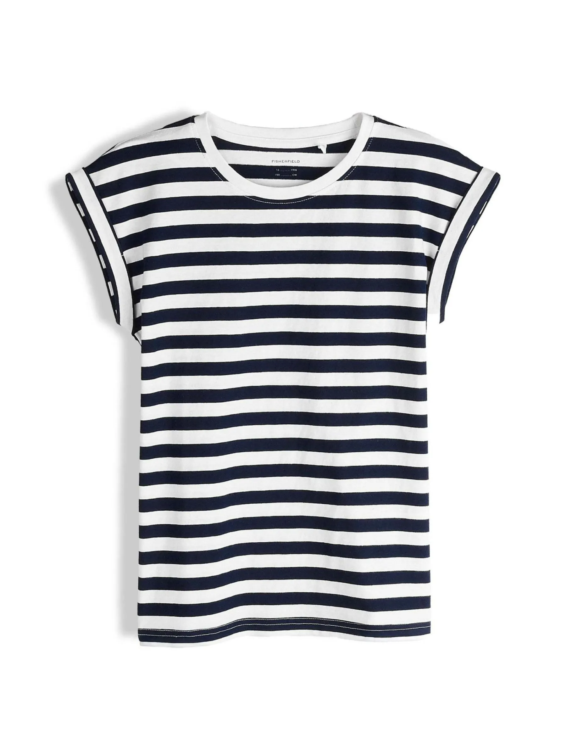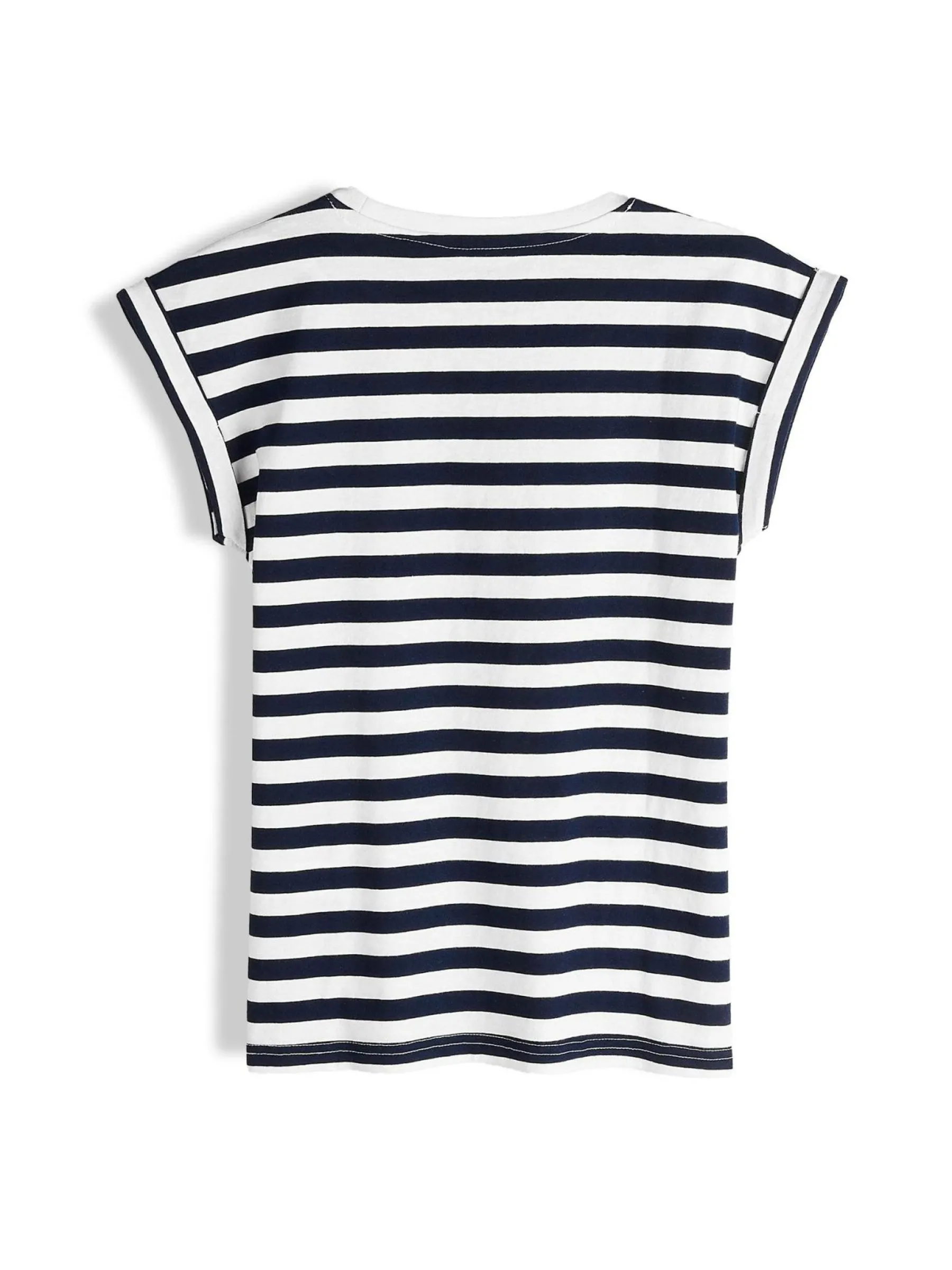 Kolor: granatowyKrój: regularTyp: koszulkaRekaw: krótki rękawDługość: krótkiPattern style: w prążkiDetal: nad g…