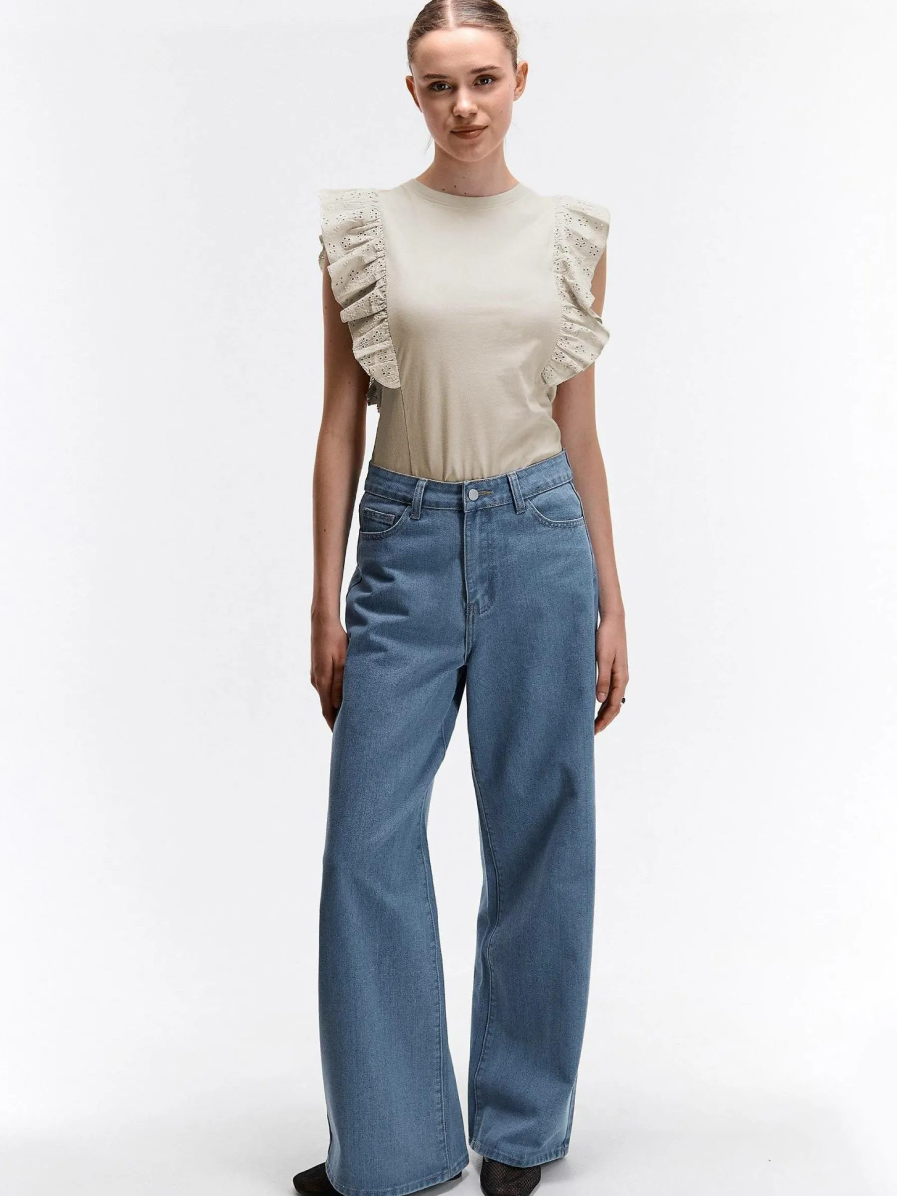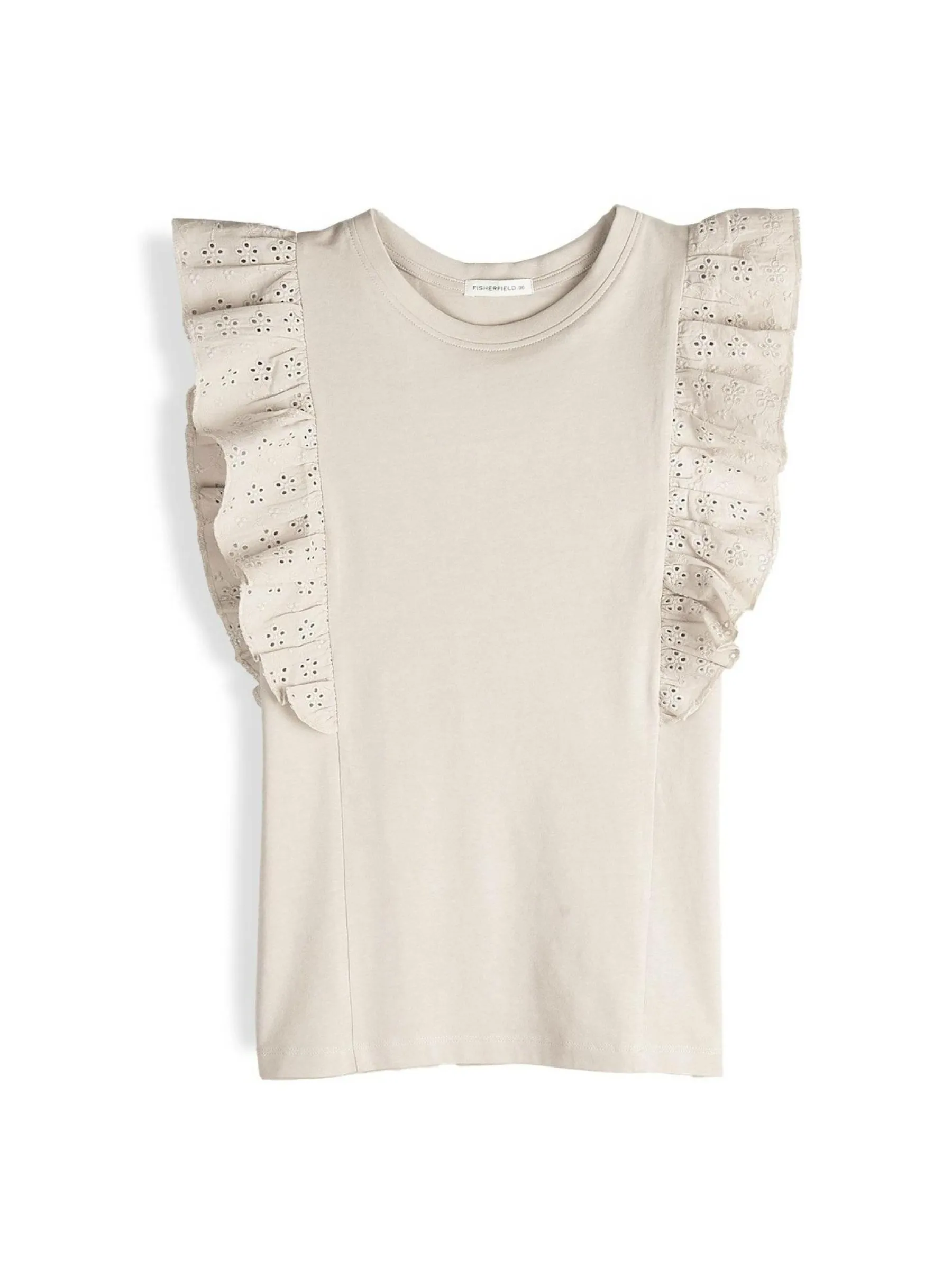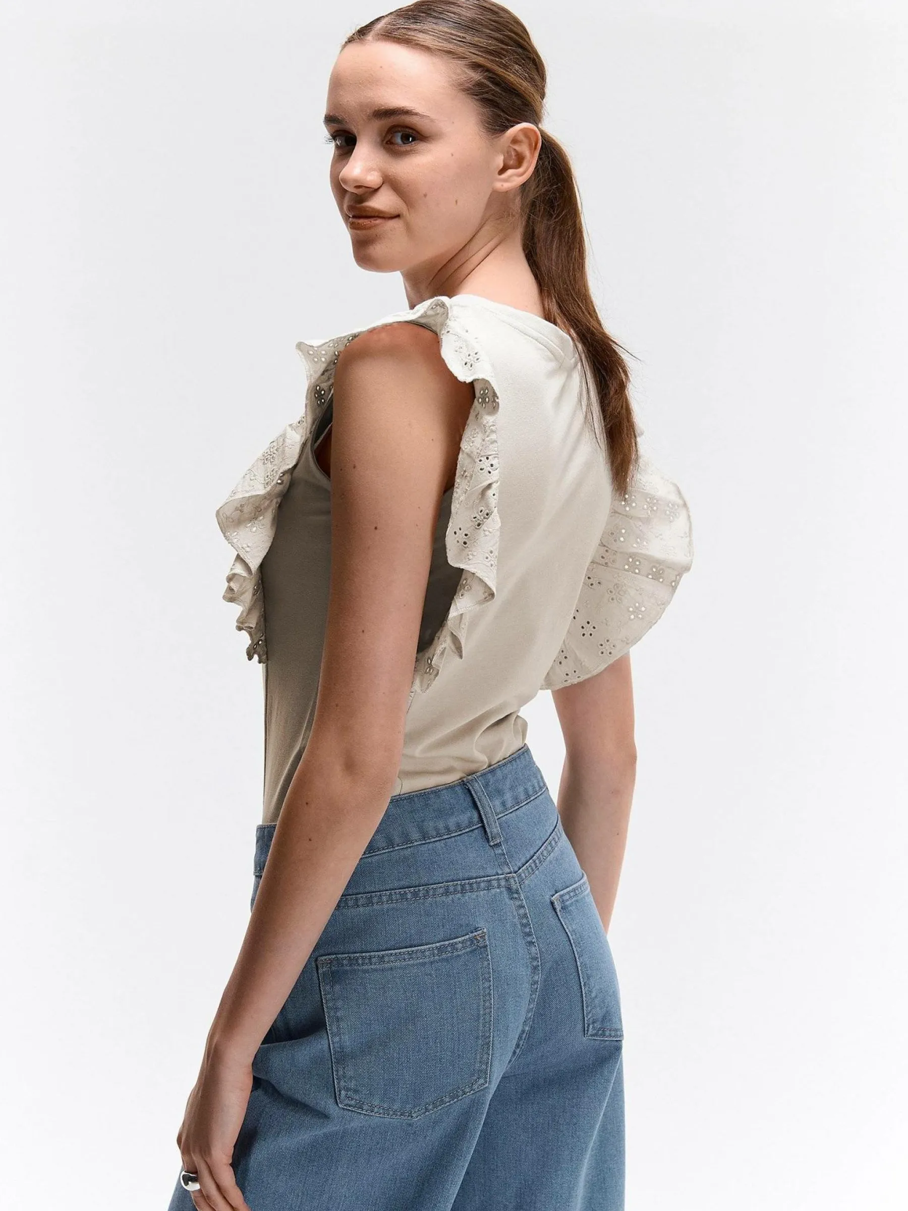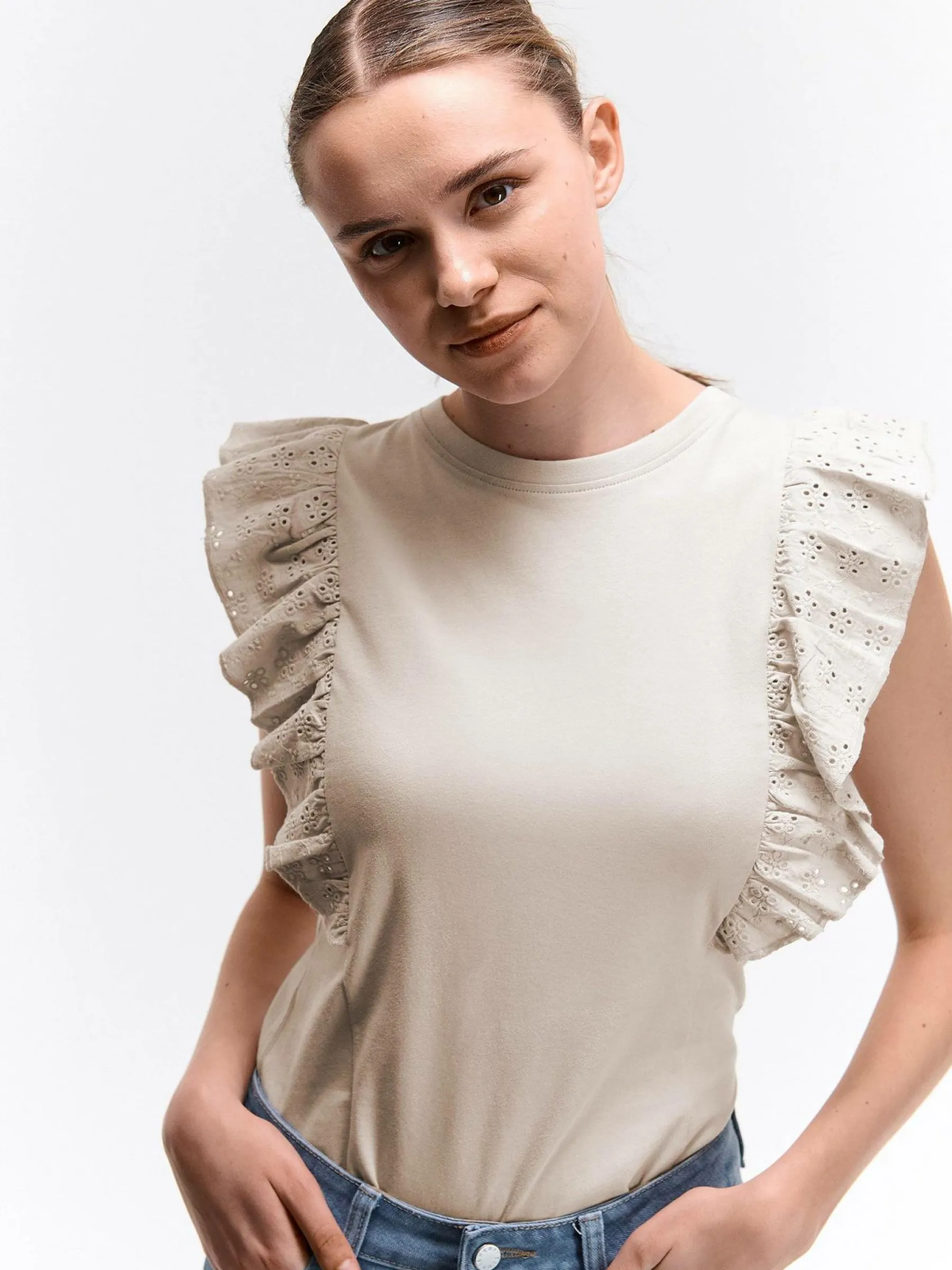 Kolor: beżowyKrój: z falbanąTyp: koszulkaRekaw: krótki rękawDługość: krótkiPattern style: pojedynczy kolorDetal…